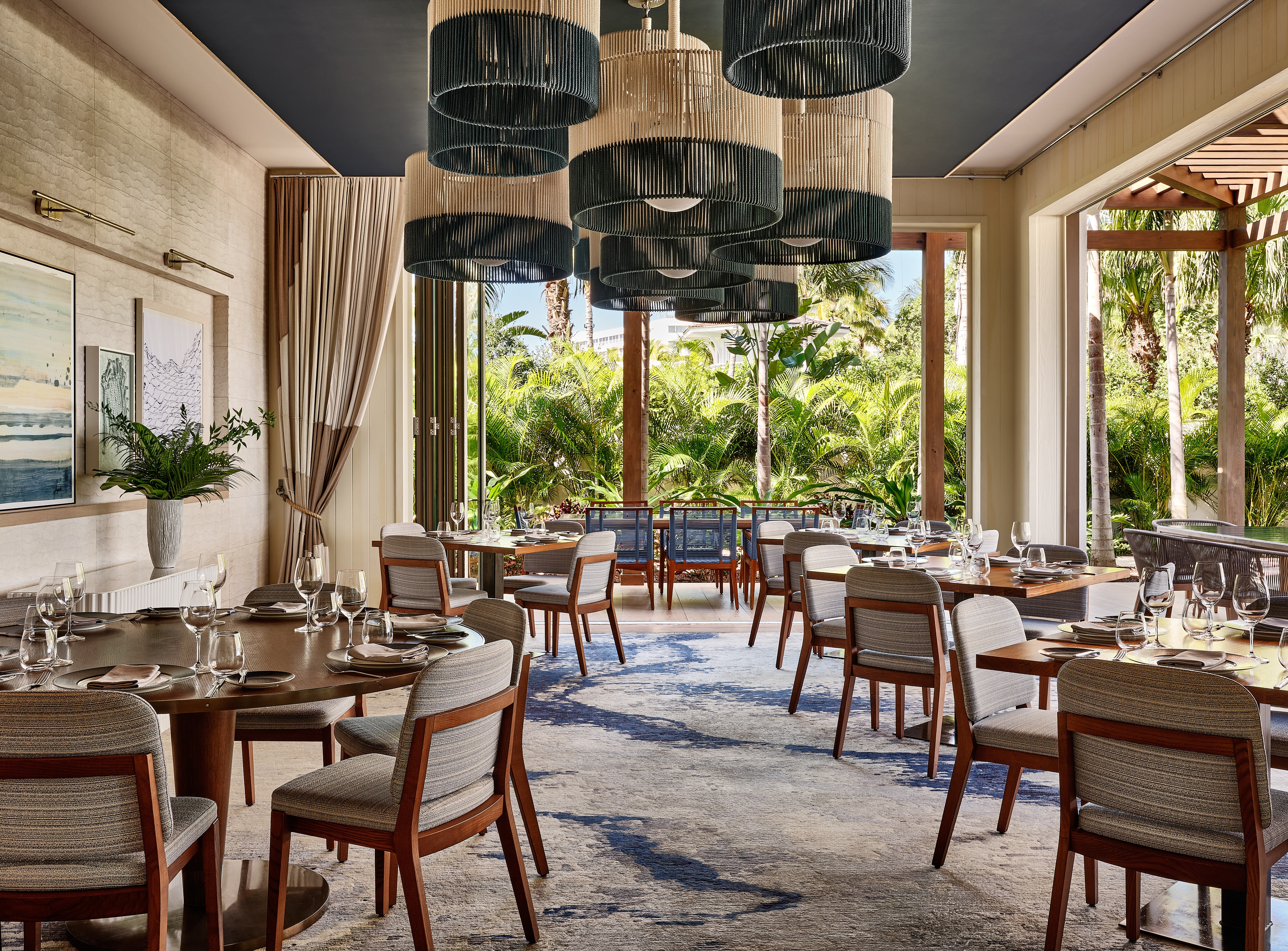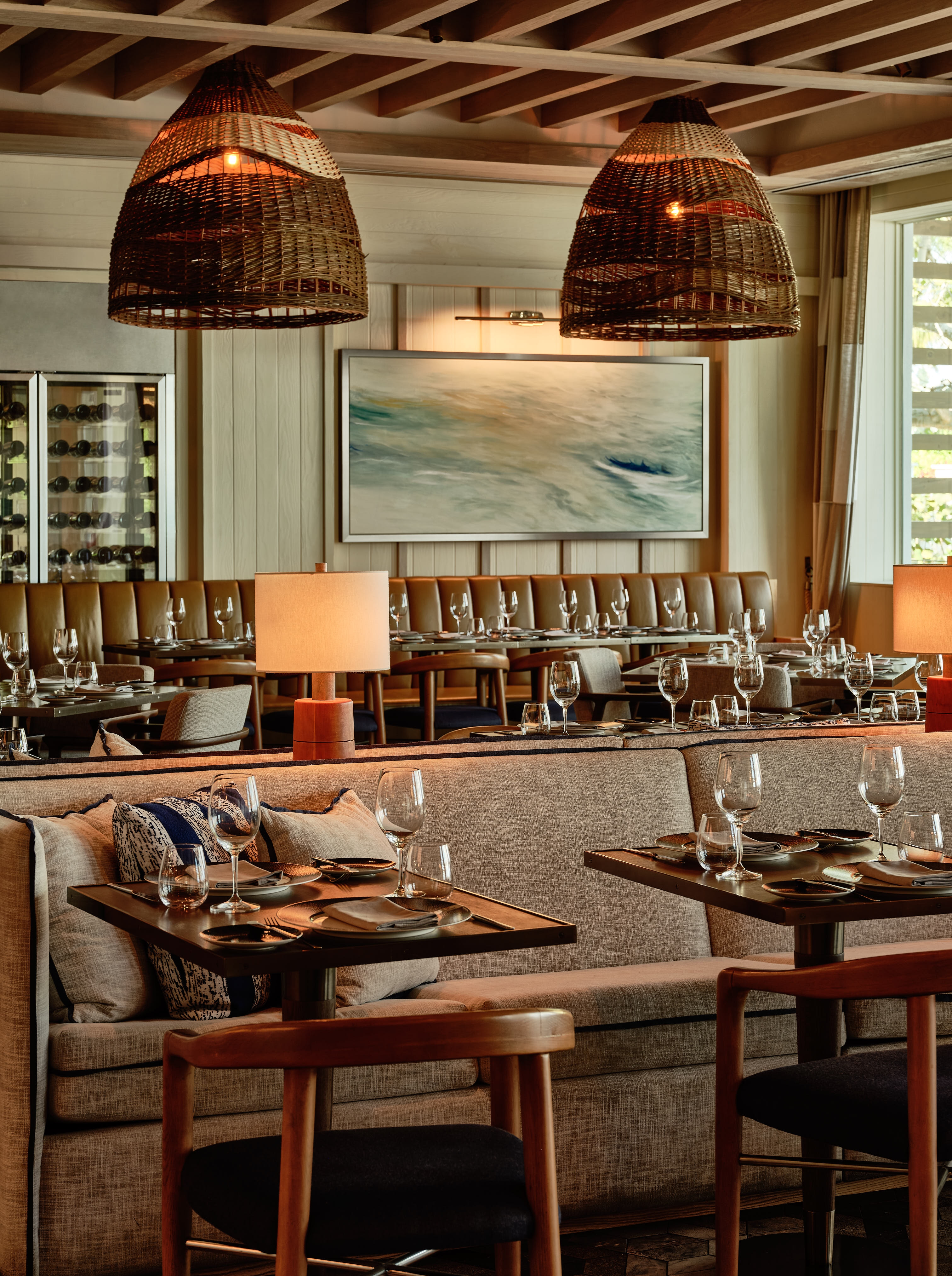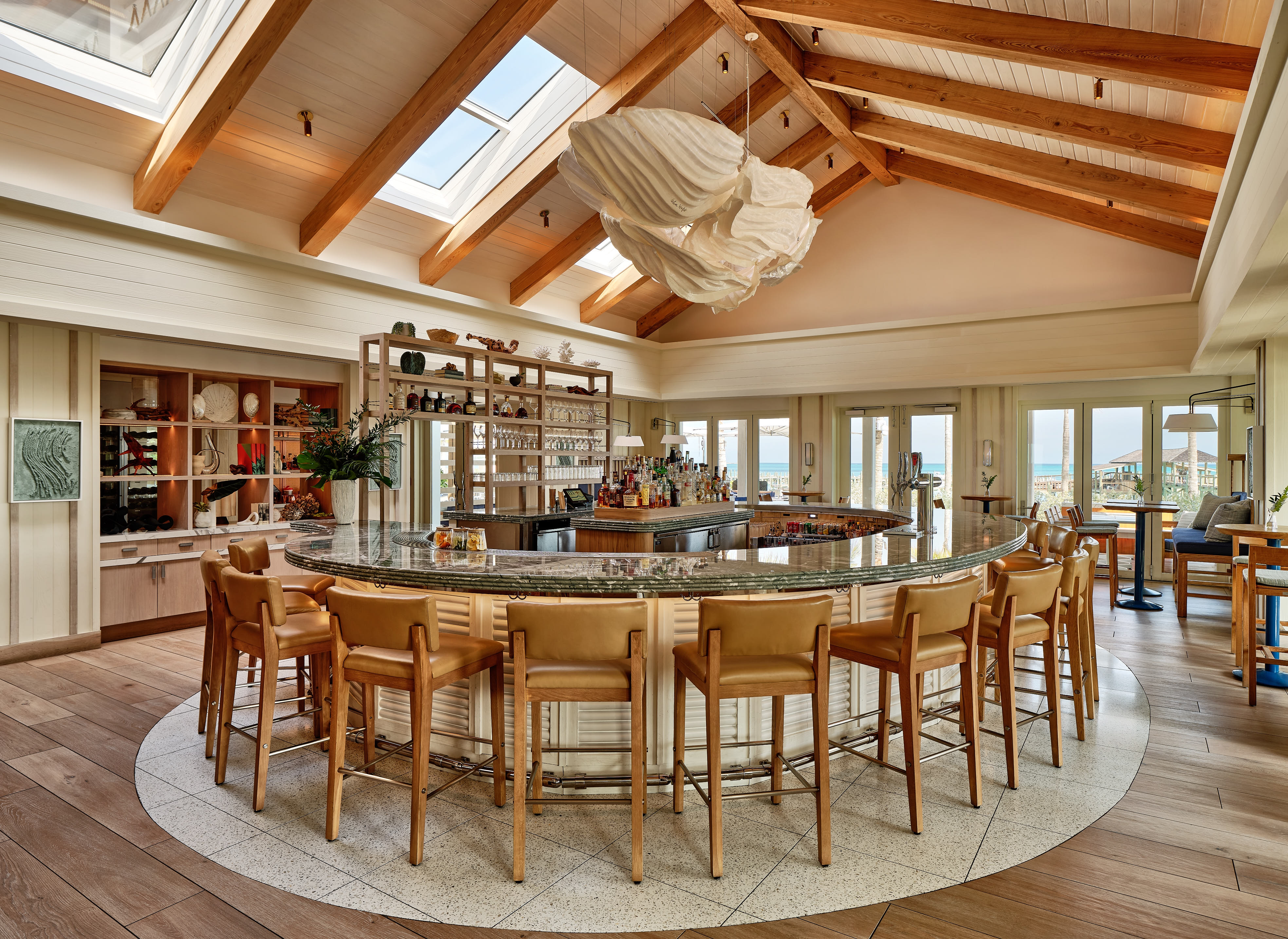 Located on the Bahamian coast of Nassau, this space provides a premier oceanfront dining experience. Beautiful coastal motifs flow through the different dining areas, including a custom structural Japanese light fixture by Celine Wright that hangs above the Verde Antigua bar top, both features gaining inspiration from seashells. The unique mirrored floor plan of the dining room is centered around back-to-back leather upholstered banquettes that add a warm contribution to the otherwise cool décor. Carefully curated Bahamian art is displayed throughout the restaurant, including a custom map of Nassau that serves as the backdrop to the downstairs dining experience. Upstairs, guests are greeted with a custom reclaimed teak backdrop behind the host stand with a custom stain that was created to resemble ocean waves. The bar and dining area creates an open-air experience that allows the guest to surround themselves with beautiful scenery and salty air. Custom rope panels behind the dining tables add a nautical touch to the beachfront space. This eclectic yet comfortable space provides guests with a variety of dining and drinking options, while always providing guests with the views of the