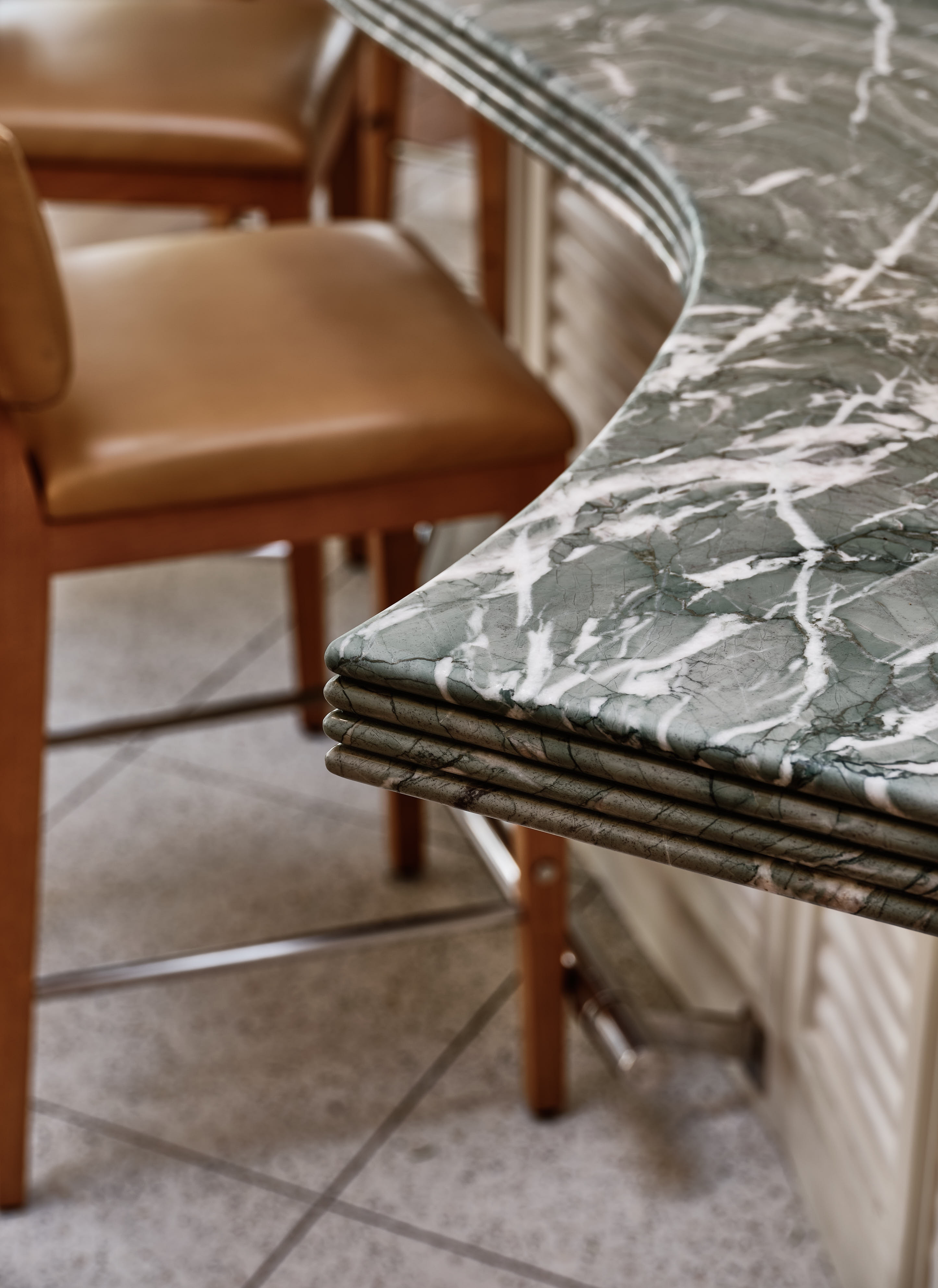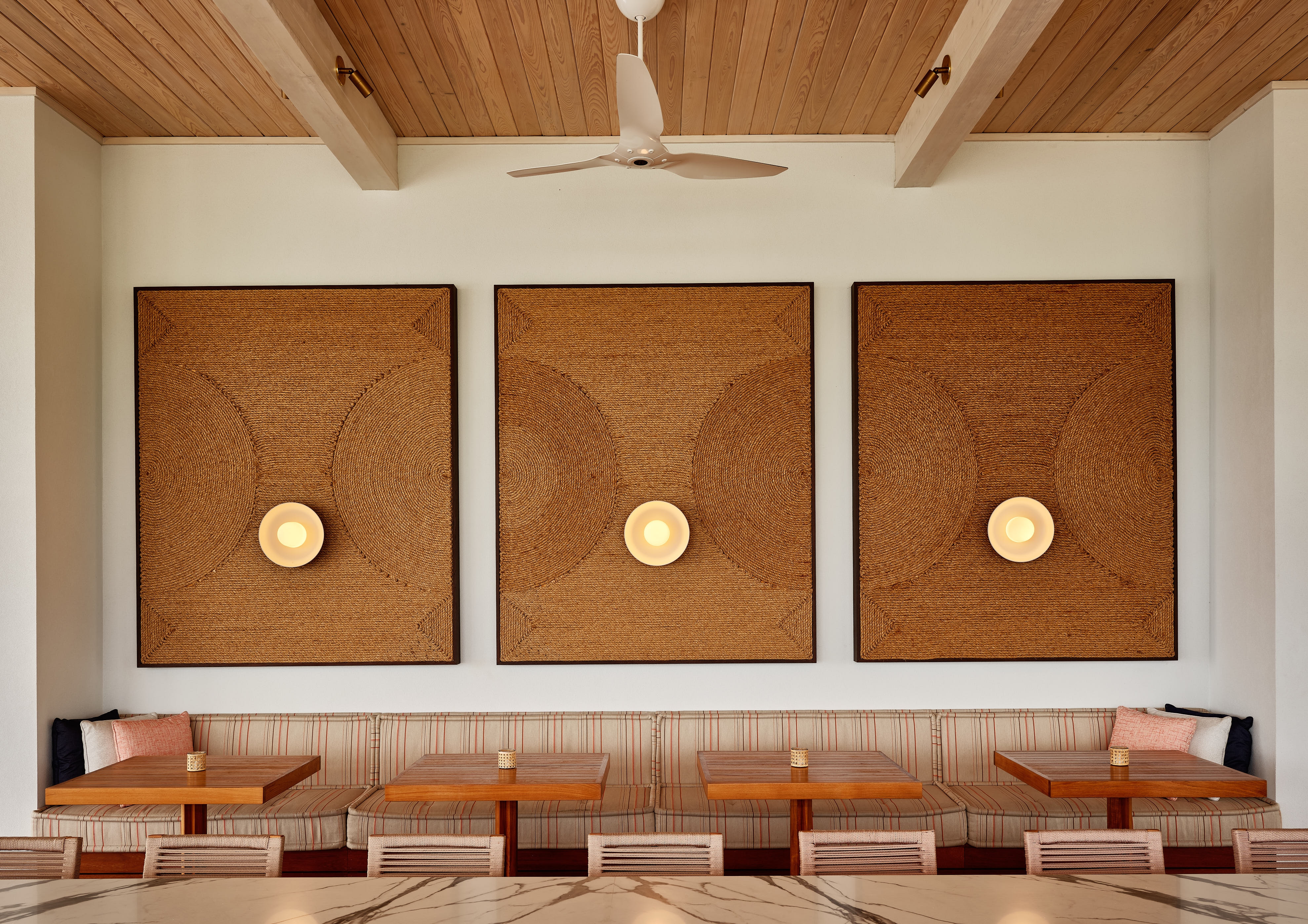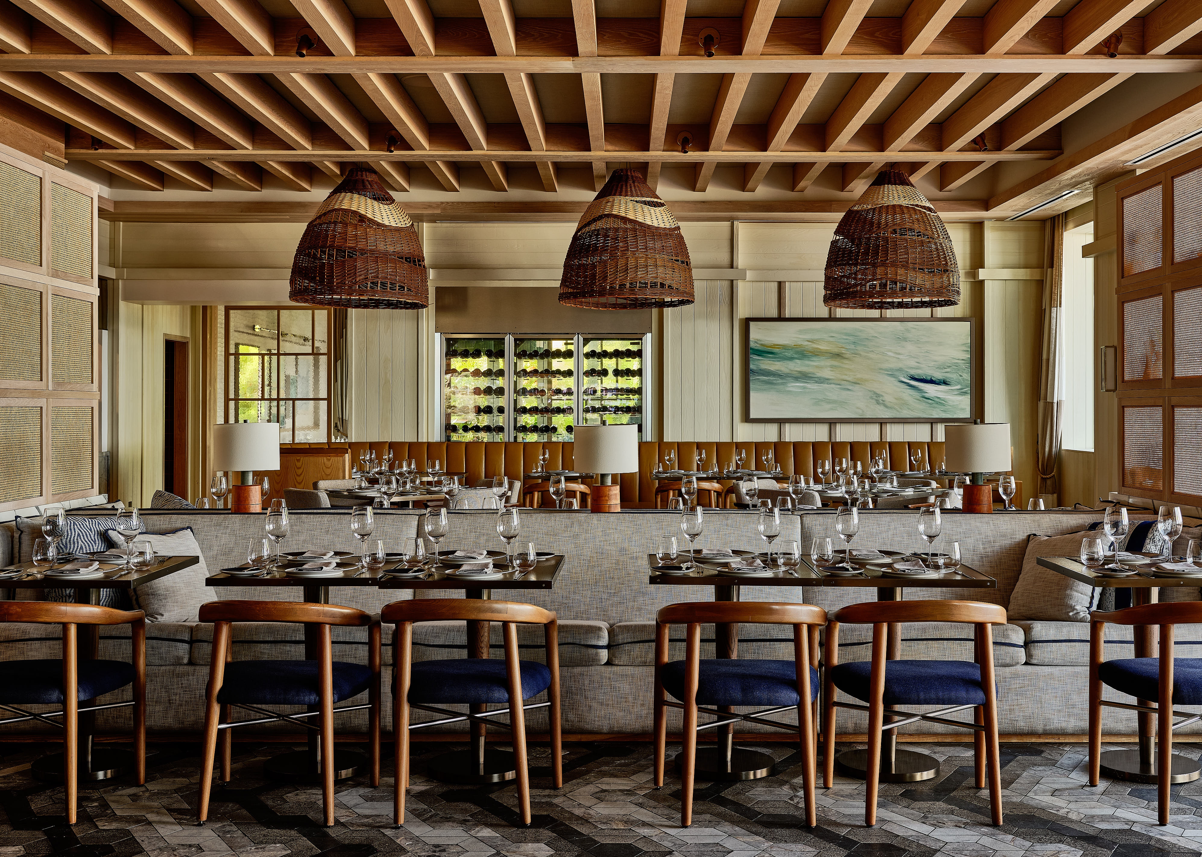 Located on the Bahamian coast of Nassau, this space provides a premier oceanfront dining experience. Beautiful coastal motifs flow through the different dining areas, including a custom structural Japanese light fixture by Celine Wright that hangs above the Verde Antigua bar top, both features gaining inspiration from seashells. The unique mirrored floor plan of the dining room is centered around back-to-back leather upholstered banquettes that add a warm contribution to the otherwise cool décor. Carefully curated Bahamian art is displayed throughout the restaurant, including a custom map of Nassau that serves as the backdrop to the downstairs dining experience. Upstairs, guests are greeted with a custom reclaimed teak backdrop behind the host stand with a custom stain that was created to resemble ocean waves. The bar and dining area creates an open-air experience that allows the guest to surround themselves with beautiful scenery and salty air. Custom rope panels behind the dining tables add a nautical touch to the beachfront space. This eclectic yet comfortable space provides guests with a variety of dining and drinking options, while always providing guests with the views of the