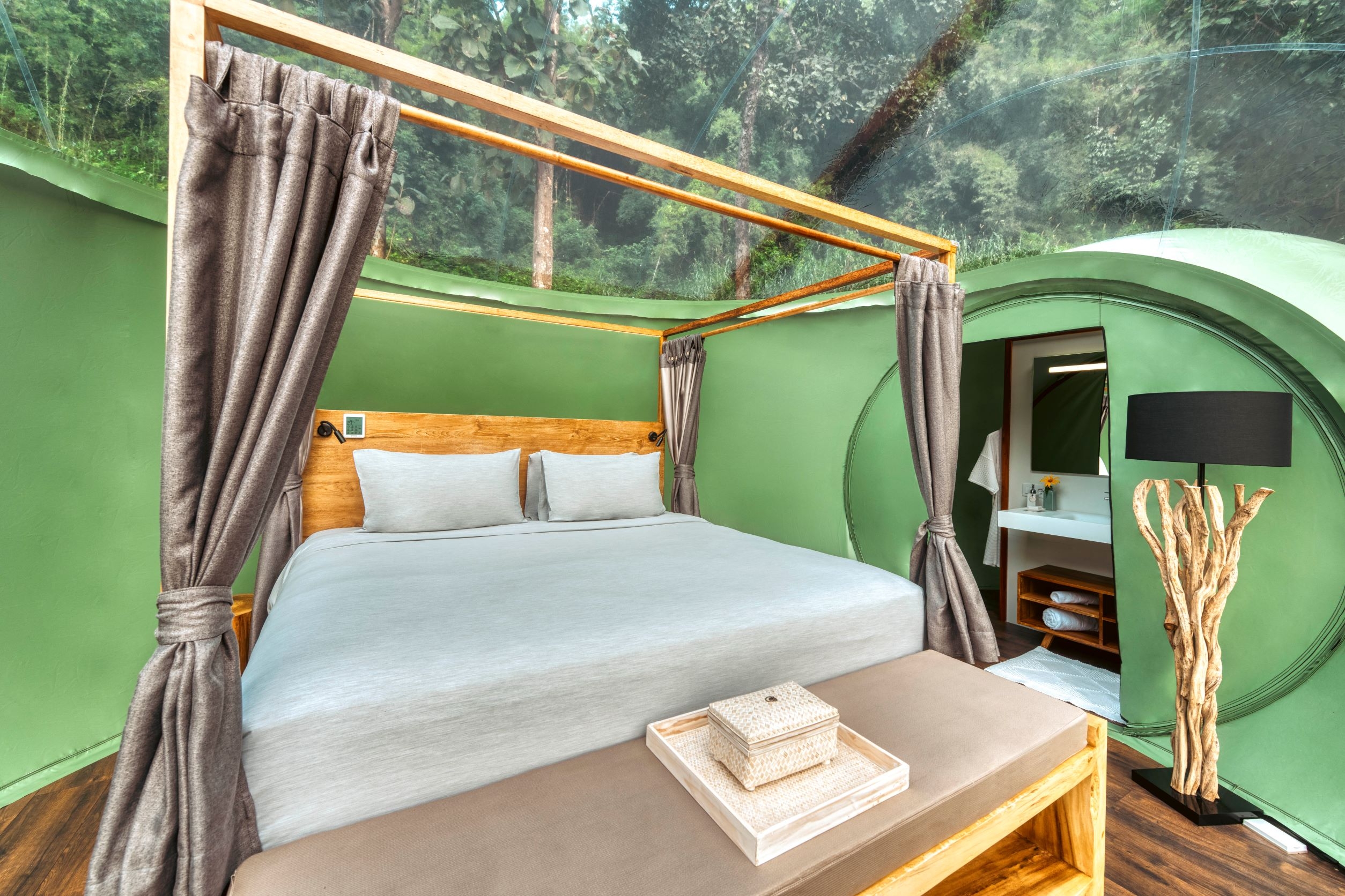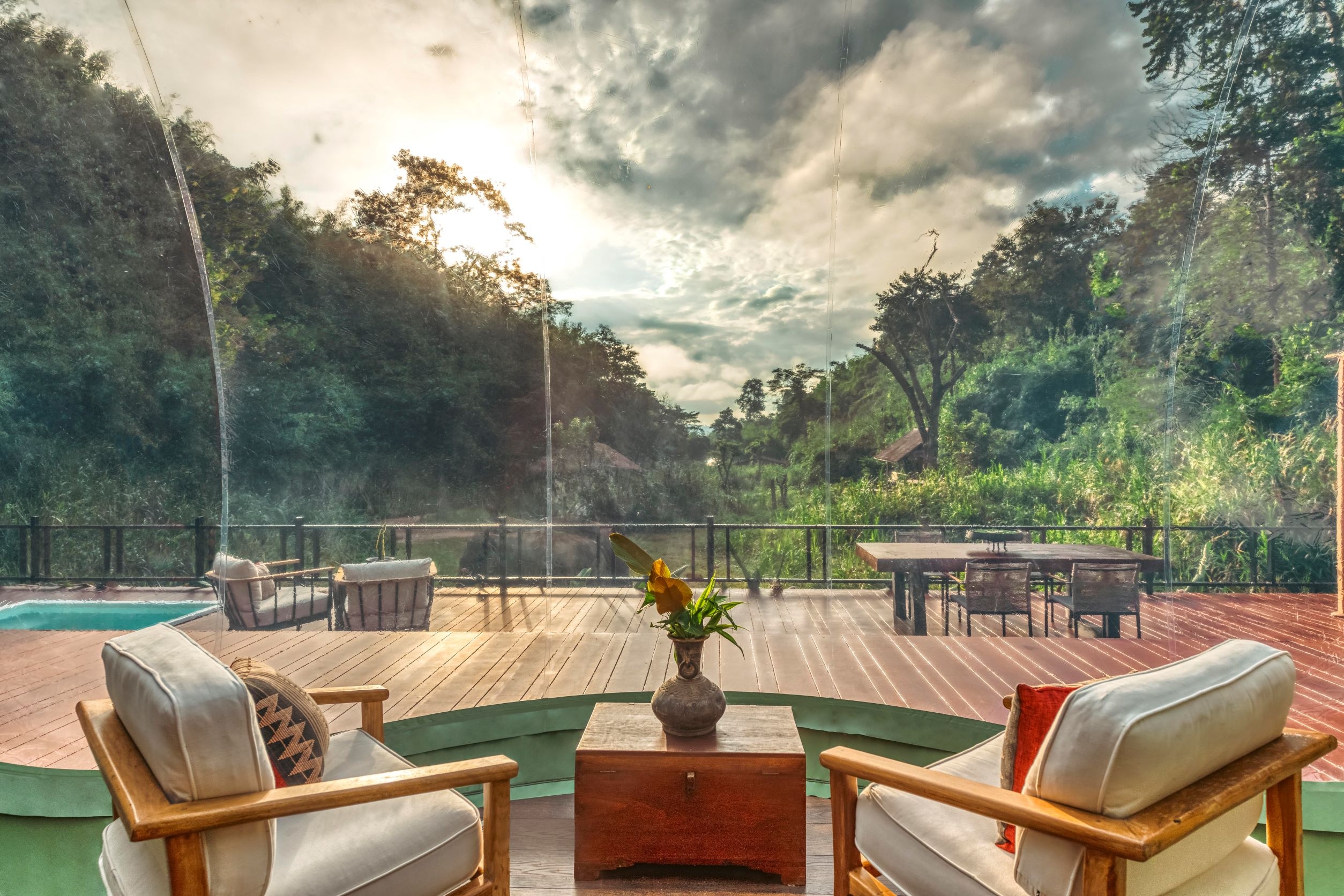 Located in a lush jungle on the banks of the Ruak River, the Jungle Bubble Lodge is perched on a raised wooden deck offering uninterrupted views of rescued elephants. Accommodating up to four guests in 150 square meters of indoors and outdoors living space, the fully climate-controlled Jungle Bubble Lodge consists of two bedrooms under a transparent roof, each with a king bed and an enclosed nontransparent en-suite shower and vanity; and a living room under a transparent roof with comfortable lounge furnishings, a minibar, and tea and coffee making facilities. Intimate touches of bathrobes and slippers; crisp bed linen; regular and feather pillows; and exquisite bathroom amenities provide convenient functions with the comfort of home.