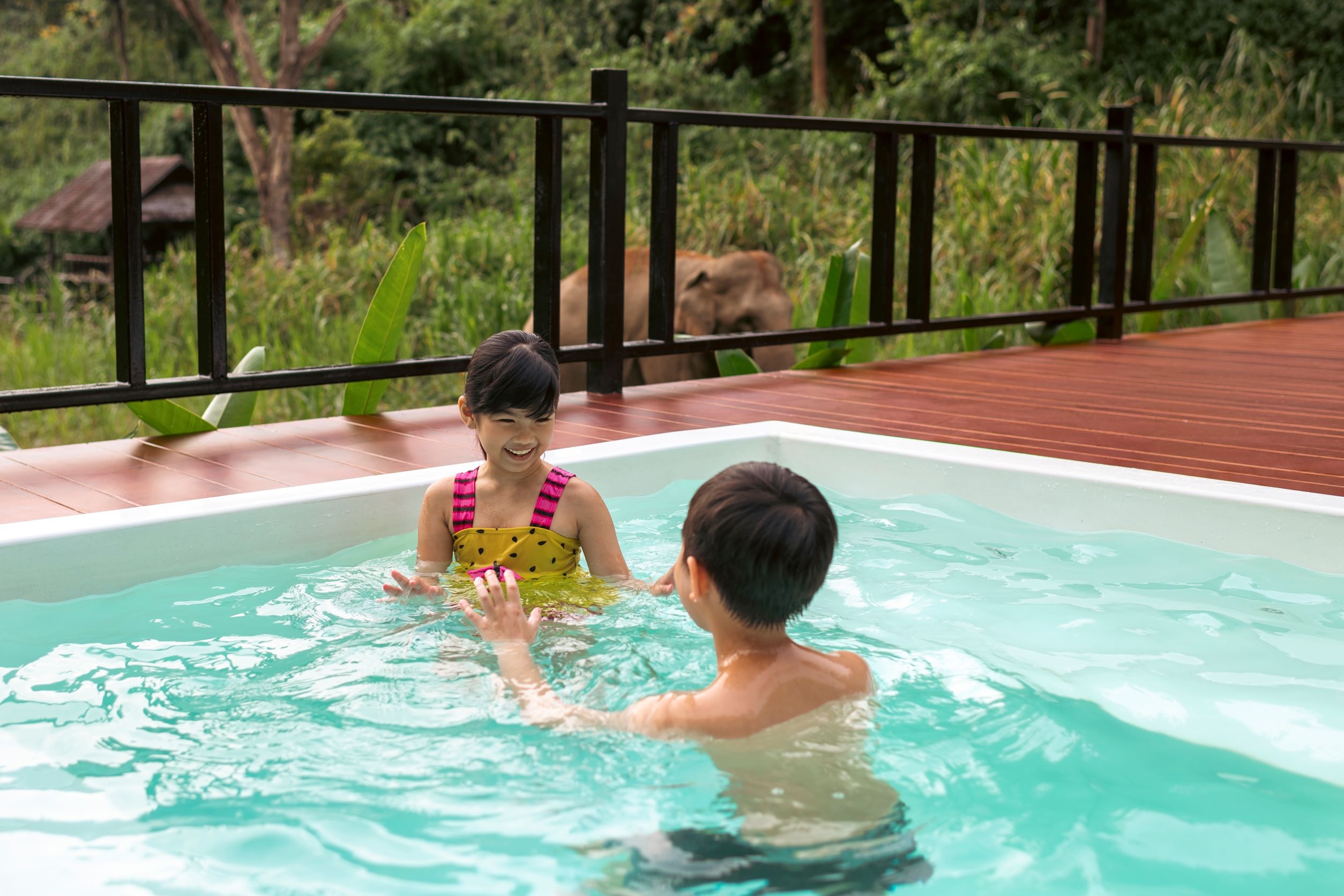 Outside an 80 square meters wooden deck offers ample space for quality family and elephant viewing times with separate al fresco lounging and dining areas and plunge pool.