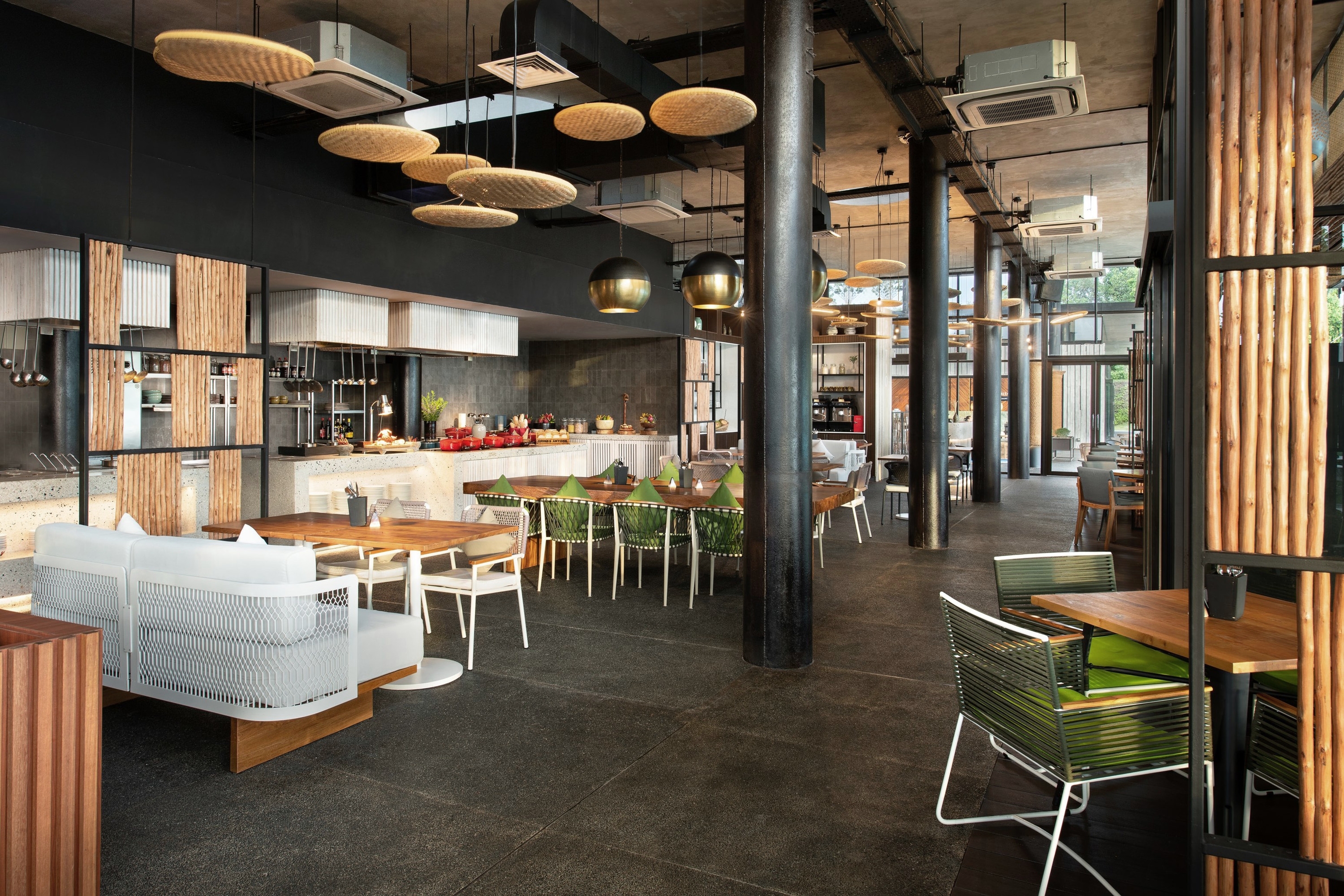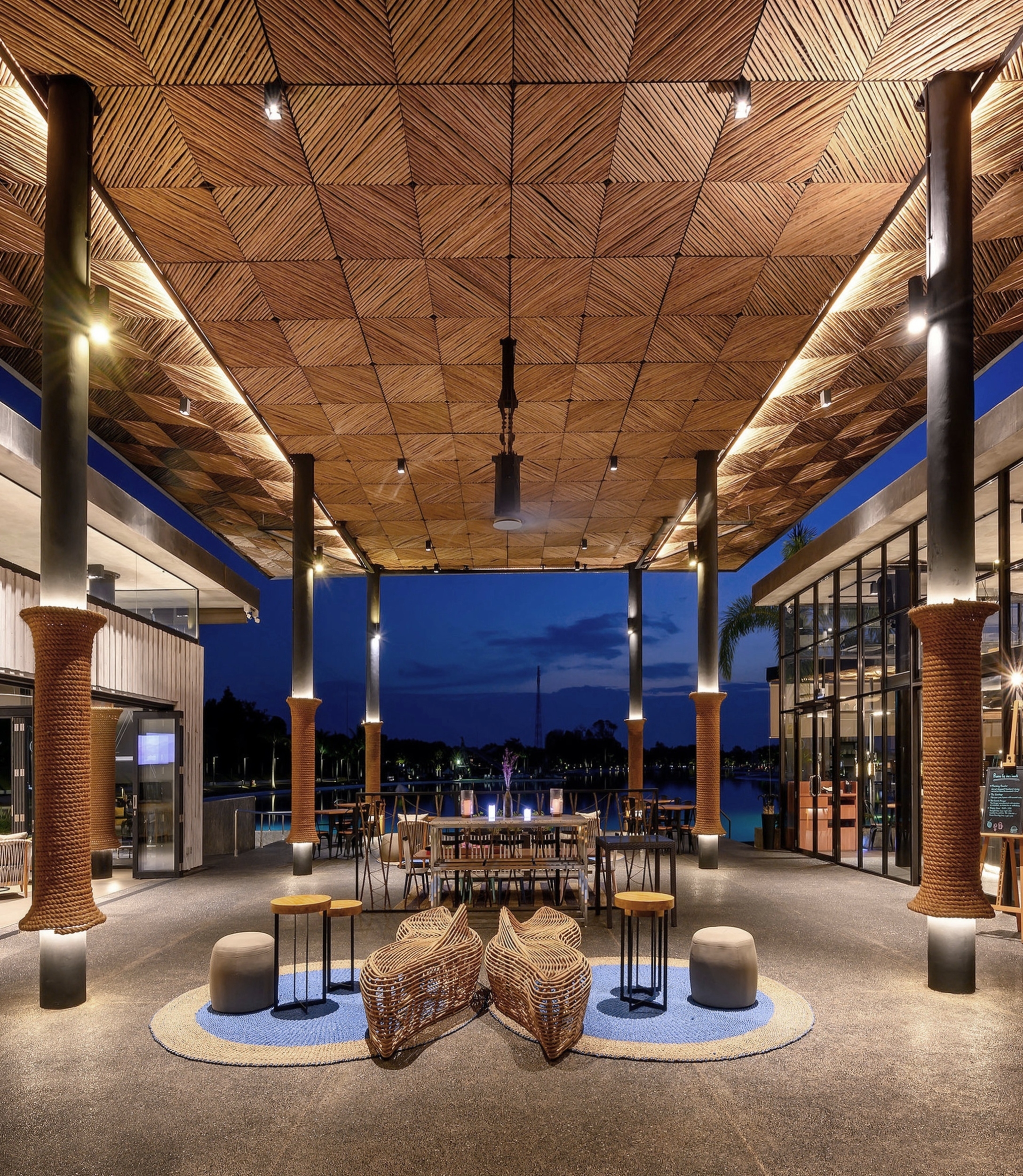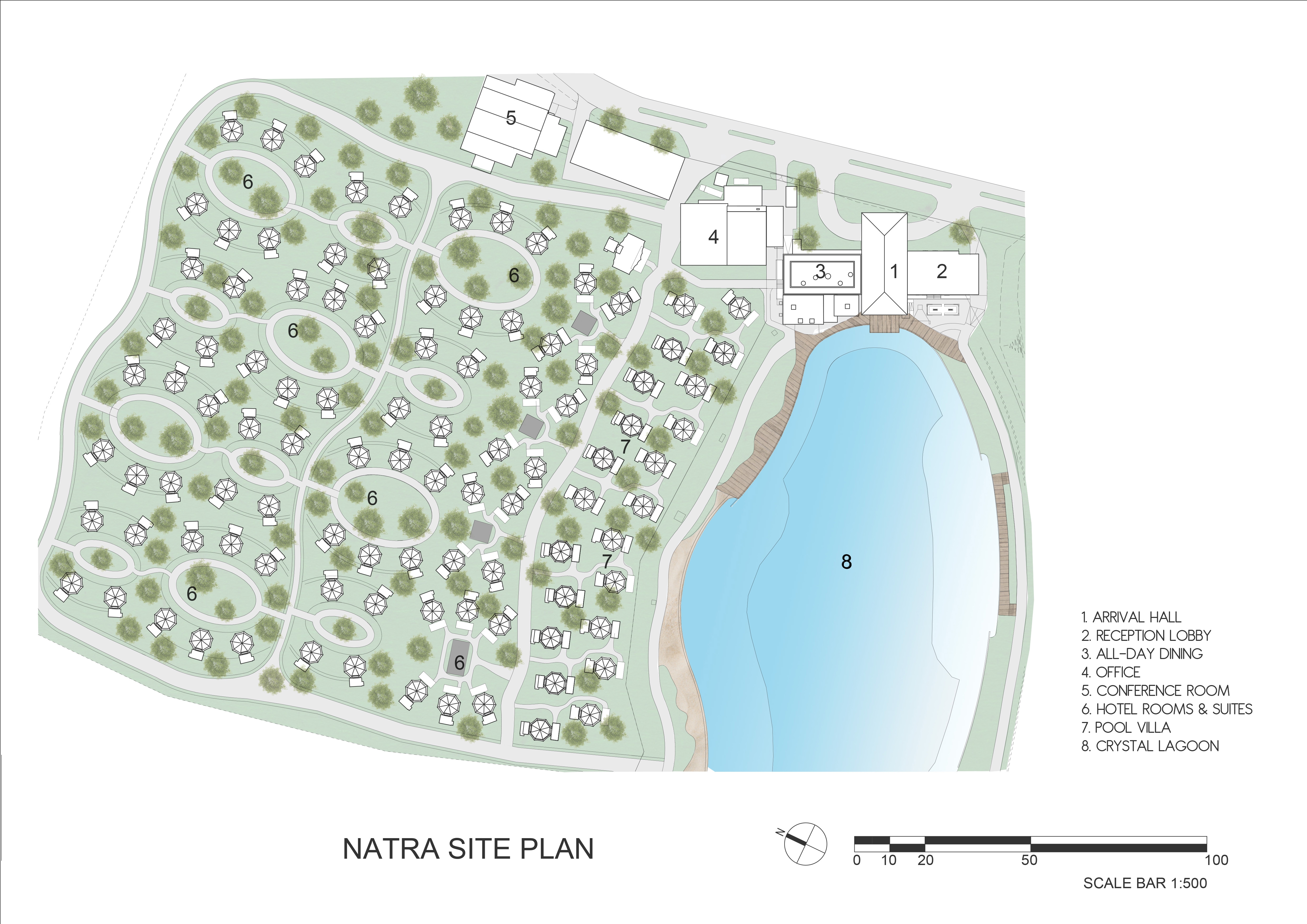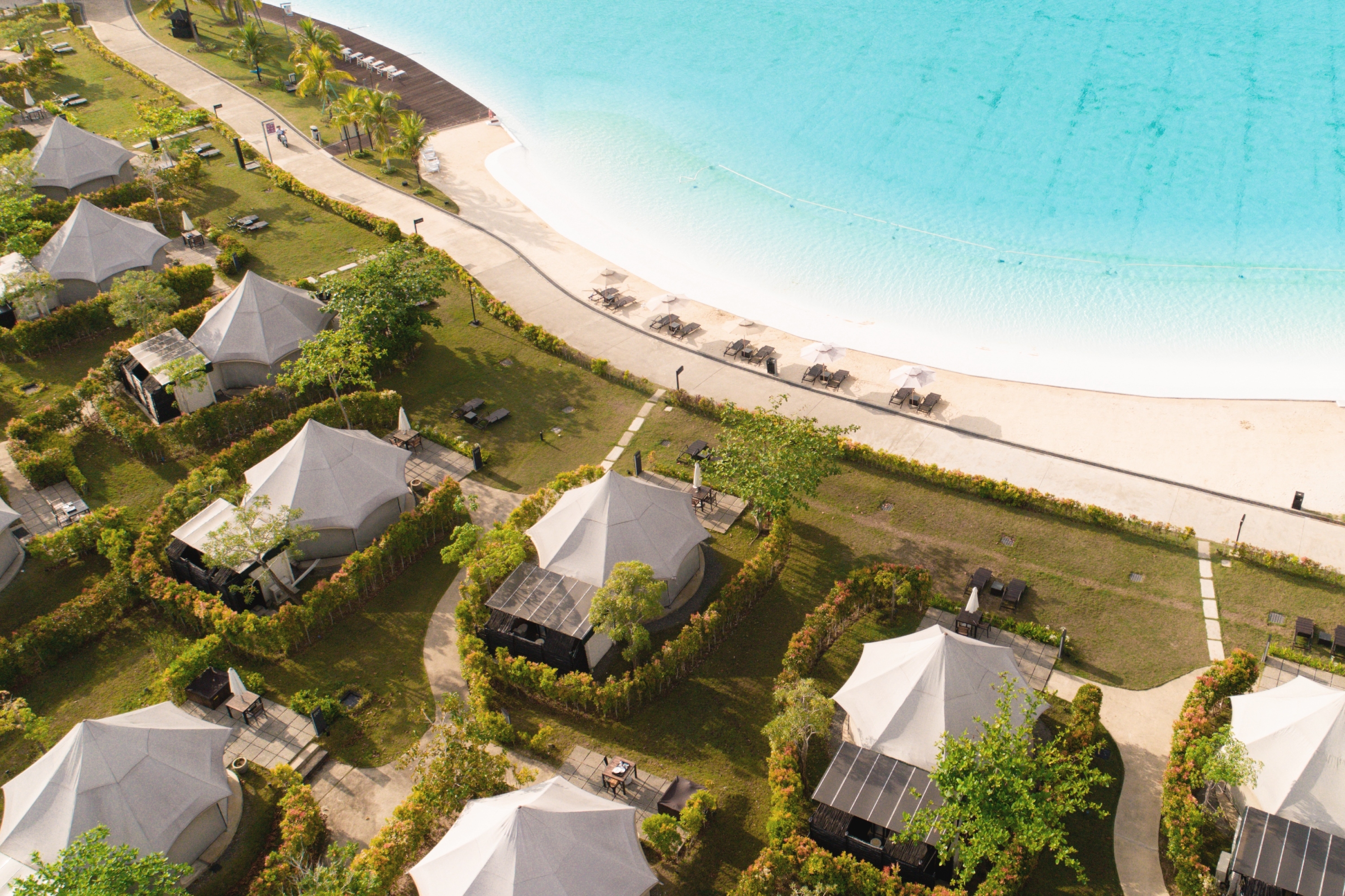 The project was planned as a series of tents and shed-like cantilevered roof forms. The front-of-house block was designed such that guests arriving from the access road have an obscured view, until they step into the open Arrival Hall – and are greeted by a stunning view across the length of Crystal Lagoon. Flanking the hall are the Reception and All-day Dining, both overlooking the lagoon. Guest can lounge at the sand pit or the bar while enjoying the full glory of the lagoon with a sunset view.
