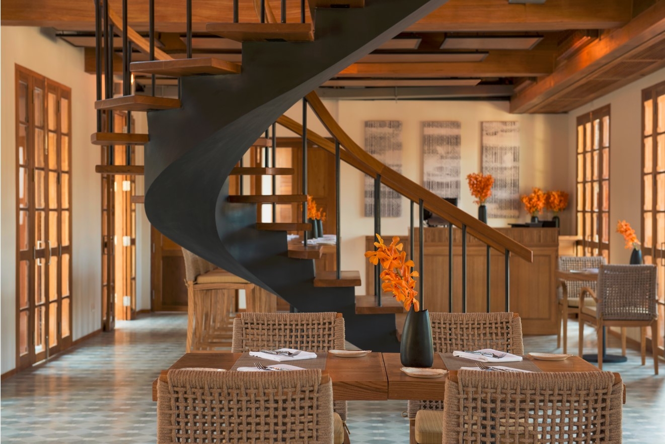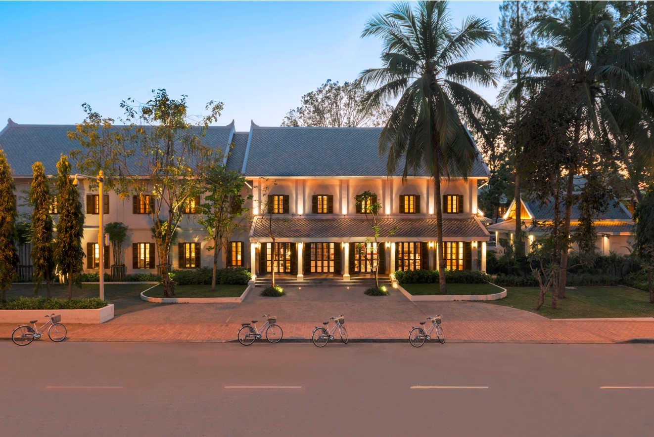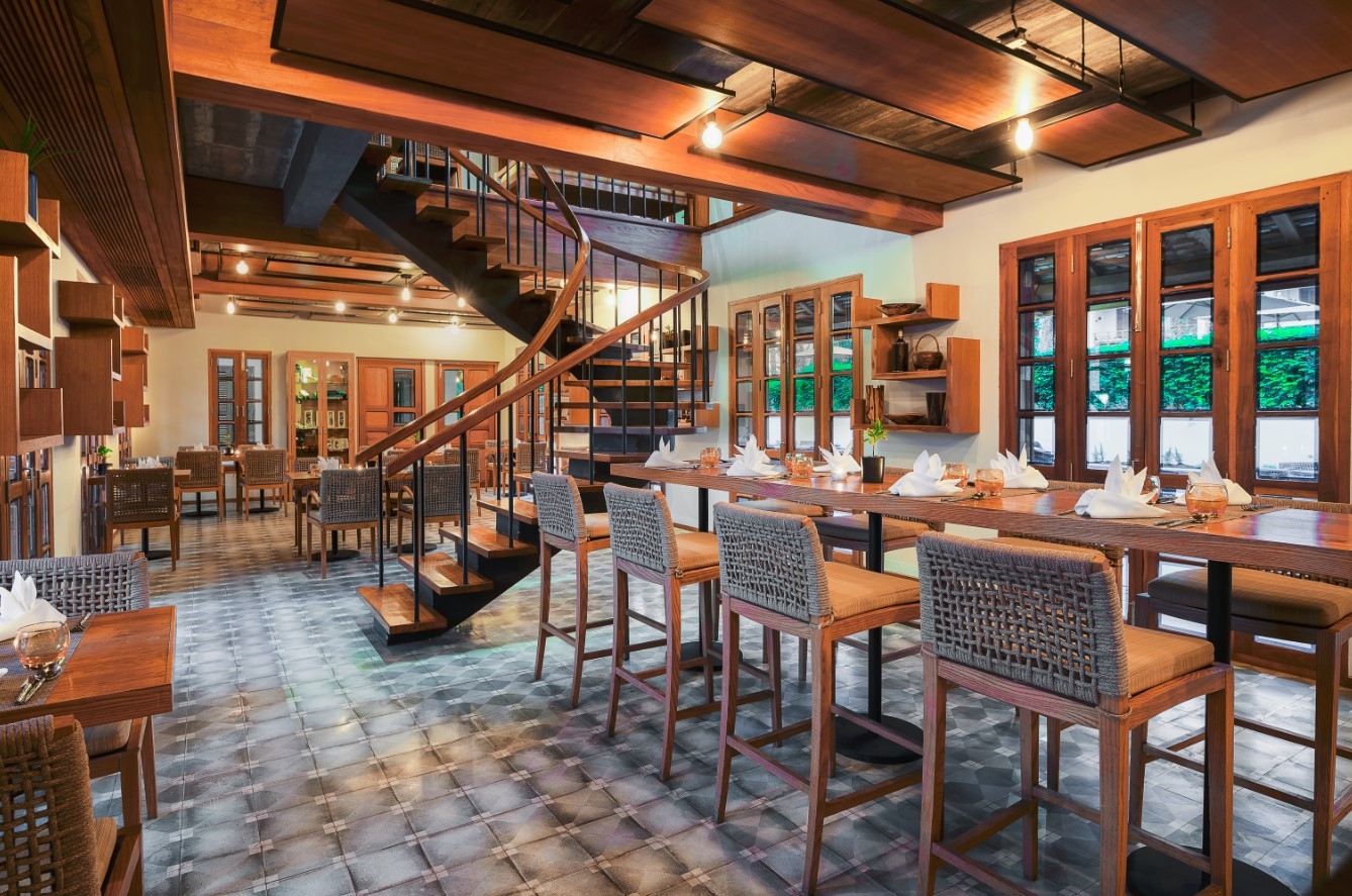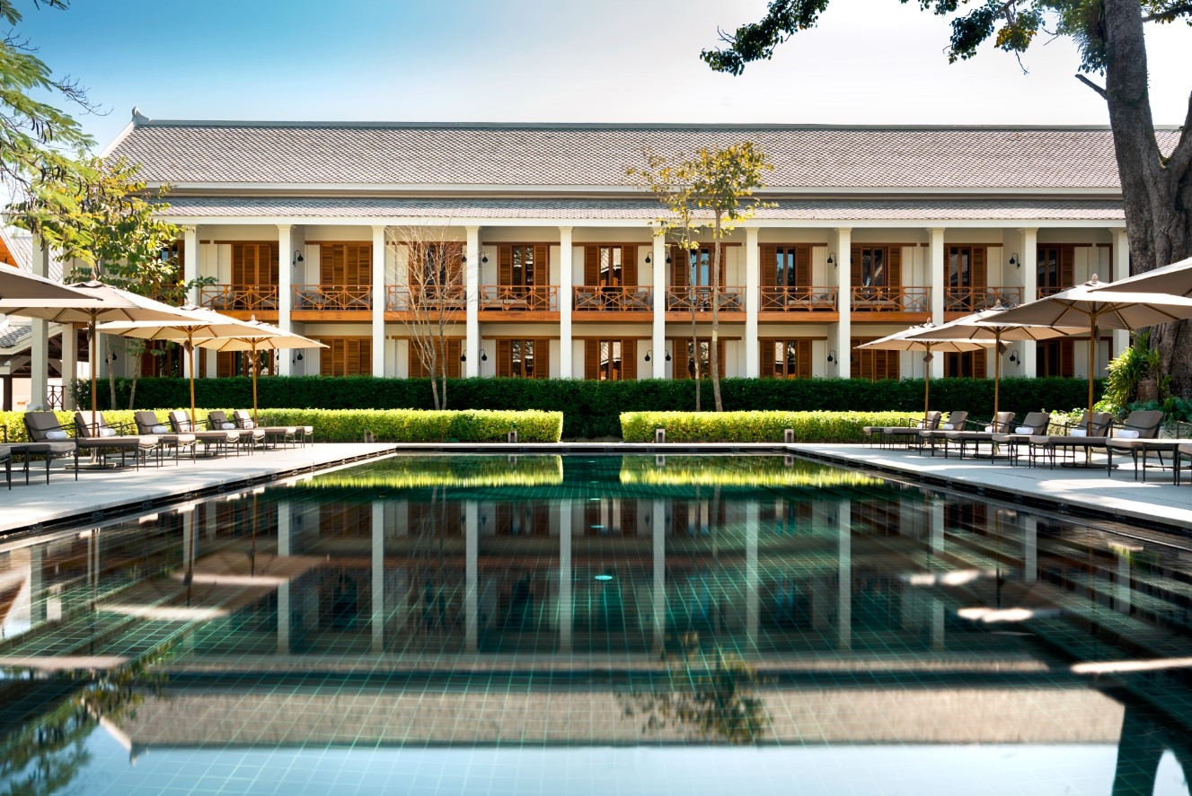 What makes this project stand out is the architect’s desire to ensure complete harmony, not only with the town, but also with nature. At the centre of this hotel is an ancient Banyan tree. It has been lovingly preserved and stands proudly by the 82-foot swimming pool, its deep roots undisturbed. Although new trees have been added to the neat courtyards and walkways that span the property’s 2.5-acre enclave, this has been done to compliment, rather than replace, the existing flora and fauna. This sentiment is echoed throughout with heritage at the forefront. Instead of fencing or high brick walls, low plants and shrubs have been used to border the property, almost bowing in welcome to guests and passersby. The design cleverly allows privacy, whilst maintaining an openness and strong connection to the neighbourhood. Culturally, this is of great importance as it allows guests to offer alms to the orange-robed monks who ritualistically pass by. The building itself is converted from a bungalow built as French officer quarters in 1914. Maintaining the authenticity of the UNESCO Heritage Town, it has wrap-around verandas, high ceilings and a symmetrical design, typical of the era.