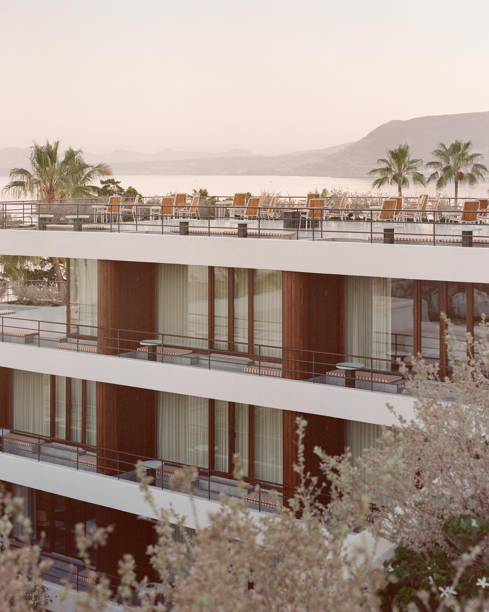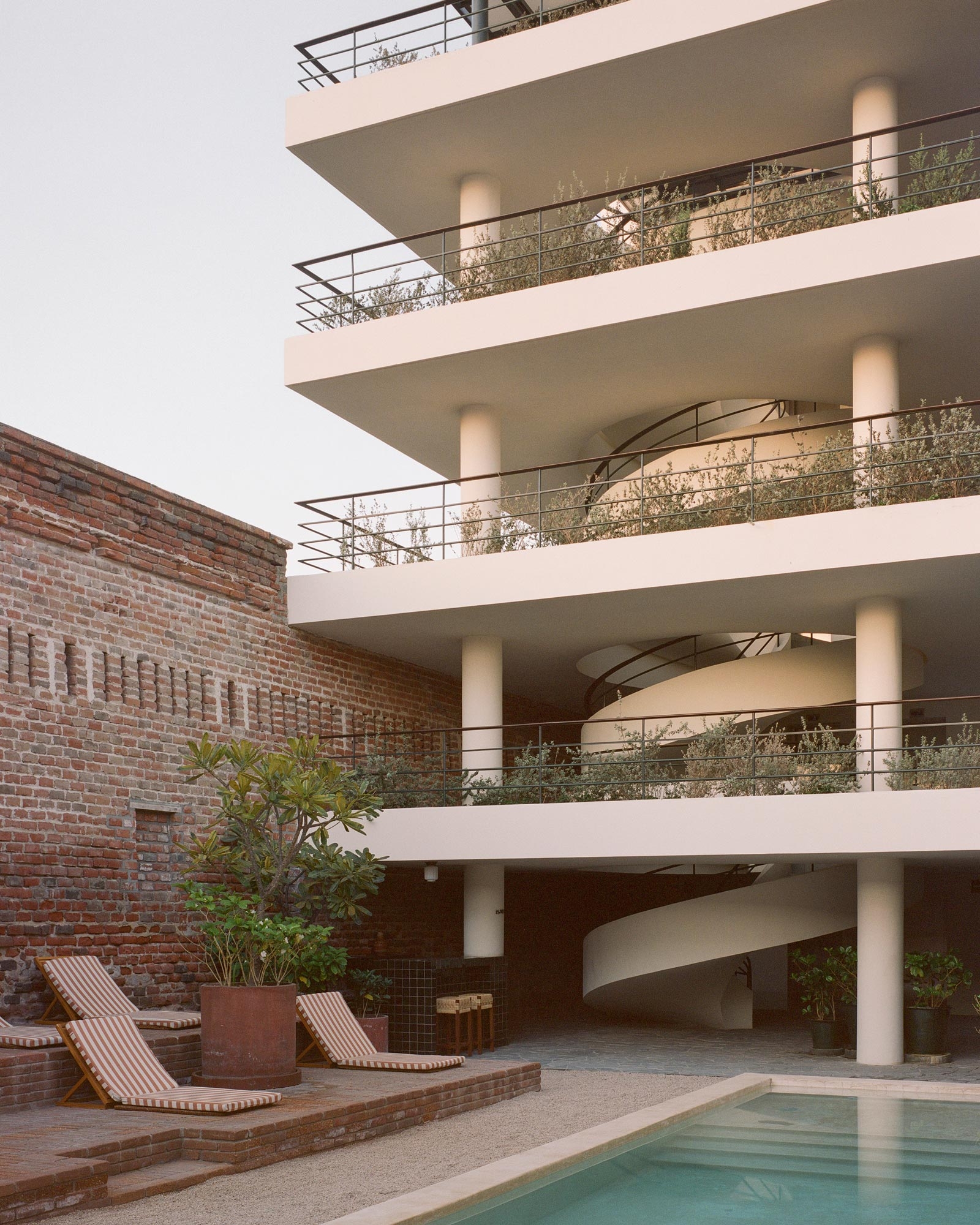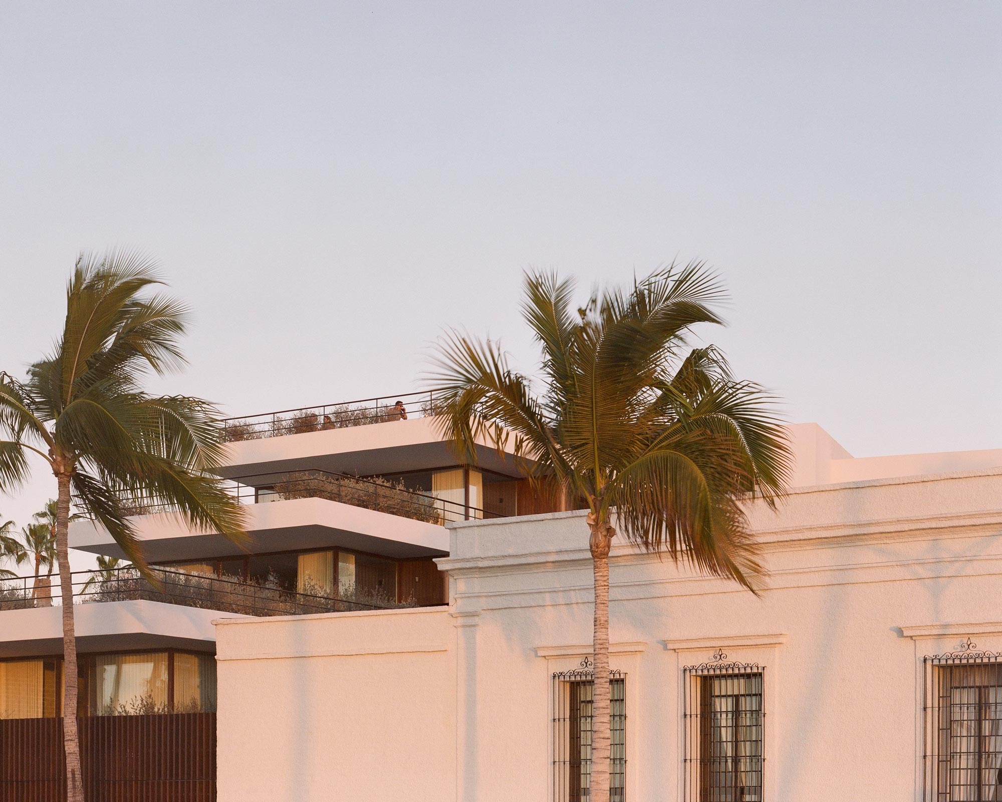 Baja Club entails a 32-room lifestyle hotel for hoteliers Grupo Habita located on a beautiful plot of coastal promenade in the historic centre of La Paz, Baja California Sur, Mexico. Blending old with new, the project brings together the restoration and adaptive reuse of a pre-existing colonial-style villa dating from 1910 -once a site for oyster pearl harvesting- and the construction of a new four-story extension containing guestrooms, suites, a spa and a rooftop sunset bar.
