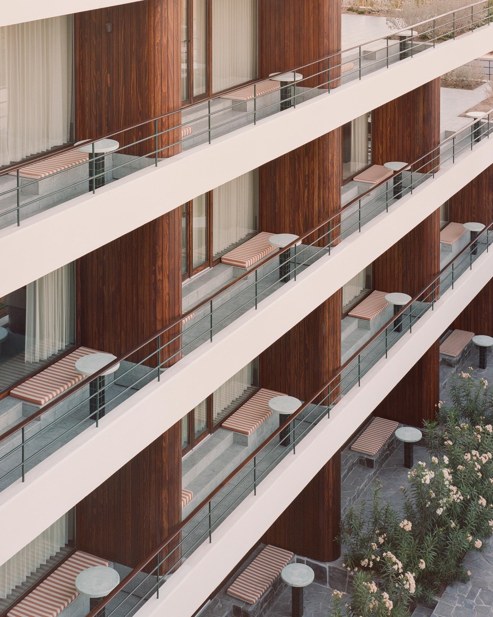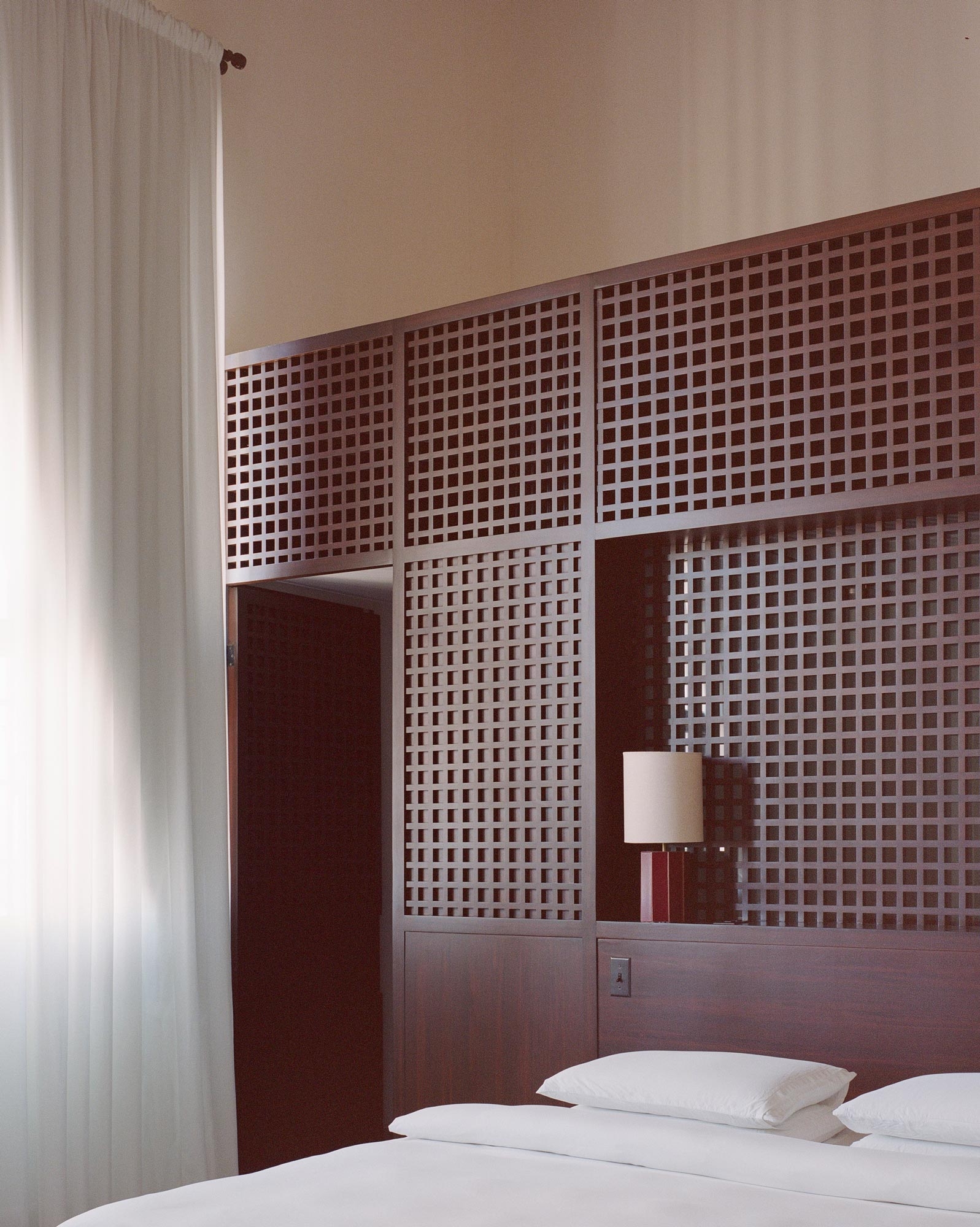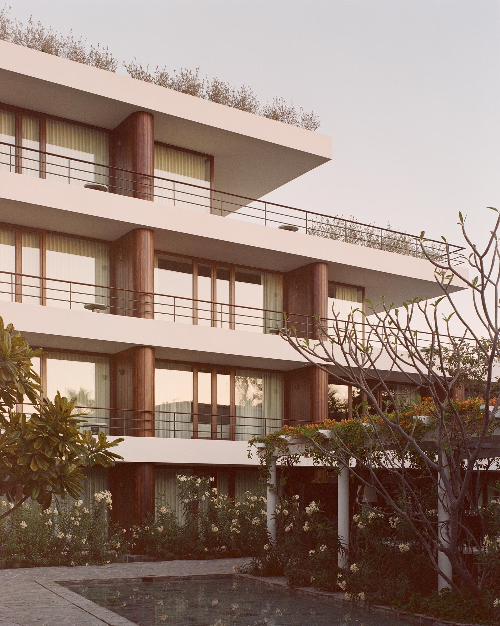 The new build echoes the L-shaped floor plan of the villa resulting in an ensemble that loosely frames a central courtyard, home to several fragrant frangipani trees, while isolating a series of more tranquil gardens and patios along the perimeter of the site. Throughout the project, the material palette draws on the property’s original detailing, including artisanal terrazzo and Talavera tiles, hand-finished timber latticework and carpentry, and blown glass lamps in transparent and amber tones.