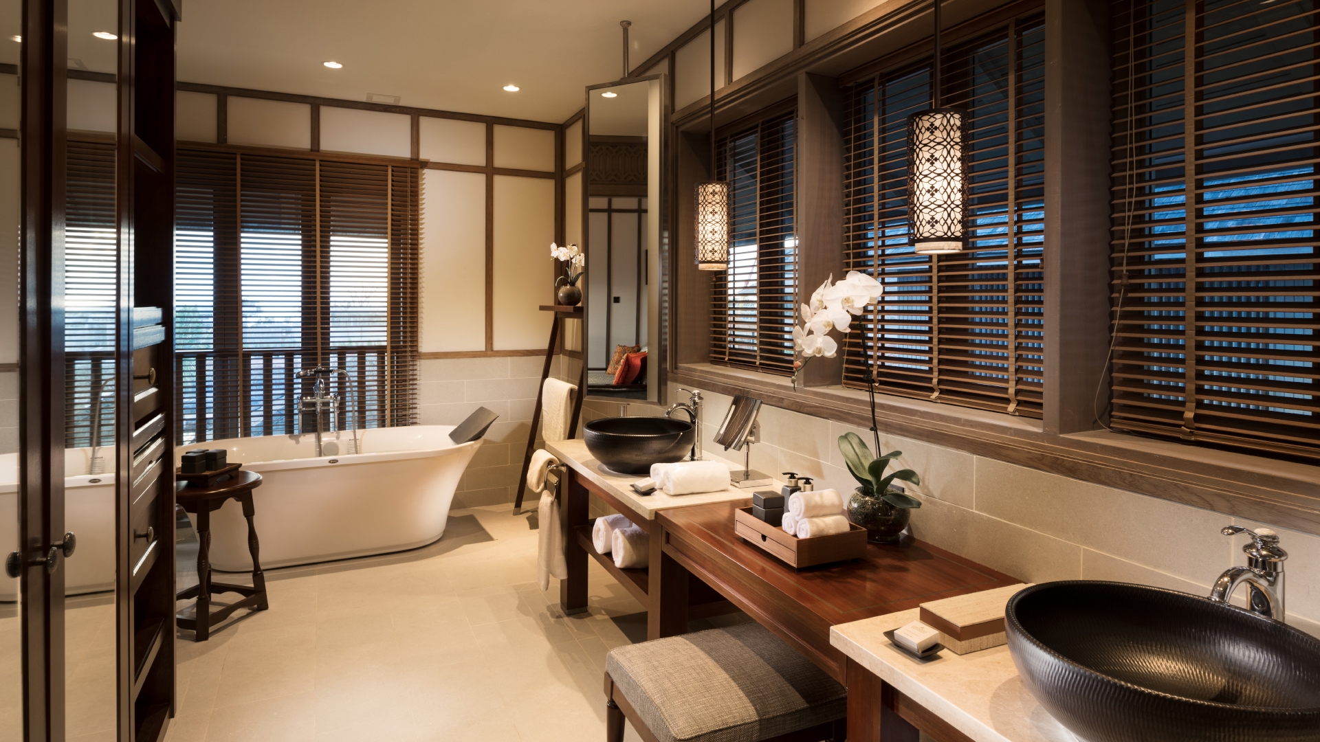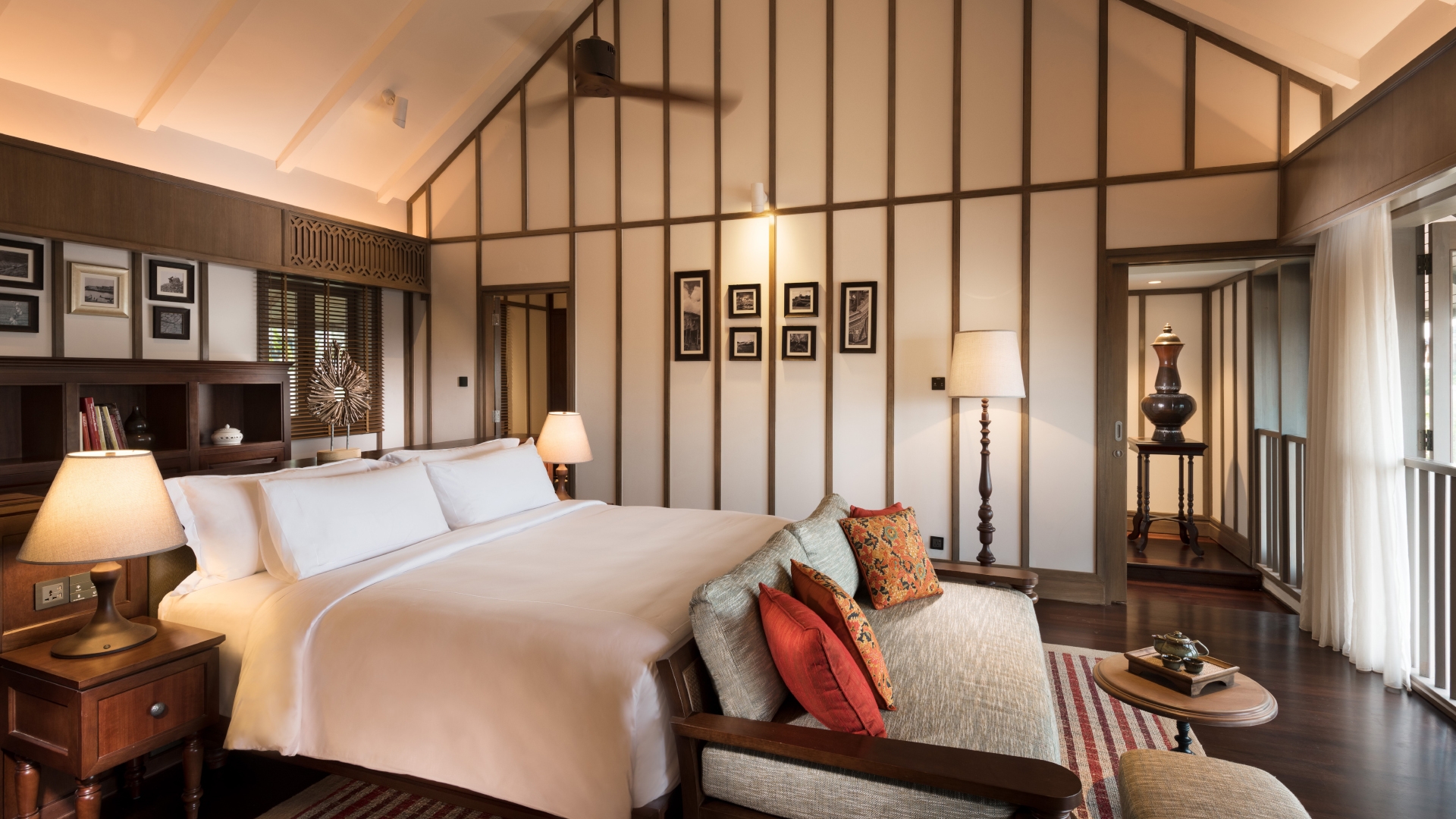 Thirteen stand-alone double storey luxurious one- and two-bedroom pool villas are located around a lagoon. Their design draws heavily from traditional kampong houses that are designed to suit the tropical Malaysian climate with floor-to-ceiling windows, slanted carved wooden panels, louvres and vents under the roof, and wide-open doors that allow natural airflow to cool the interior.