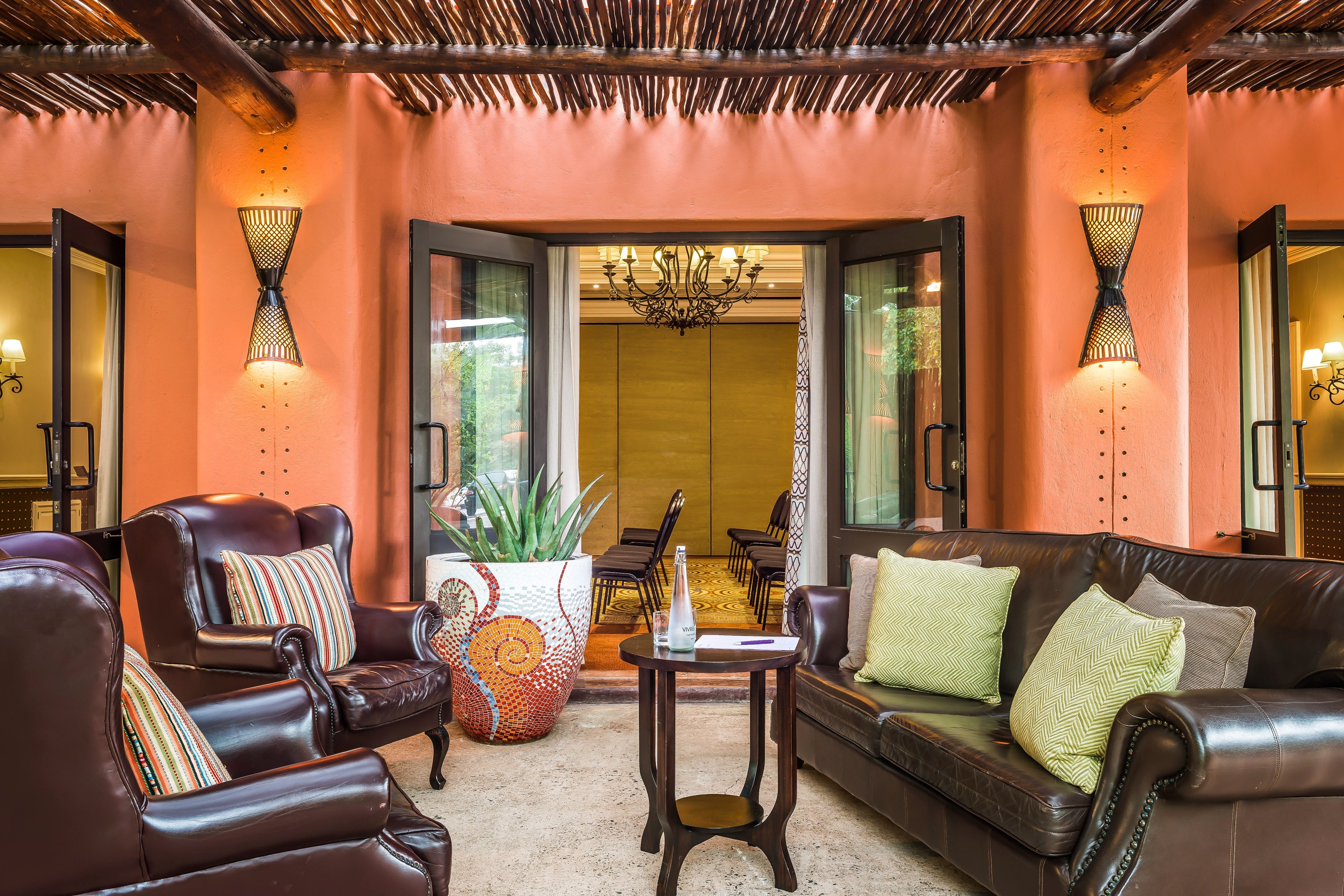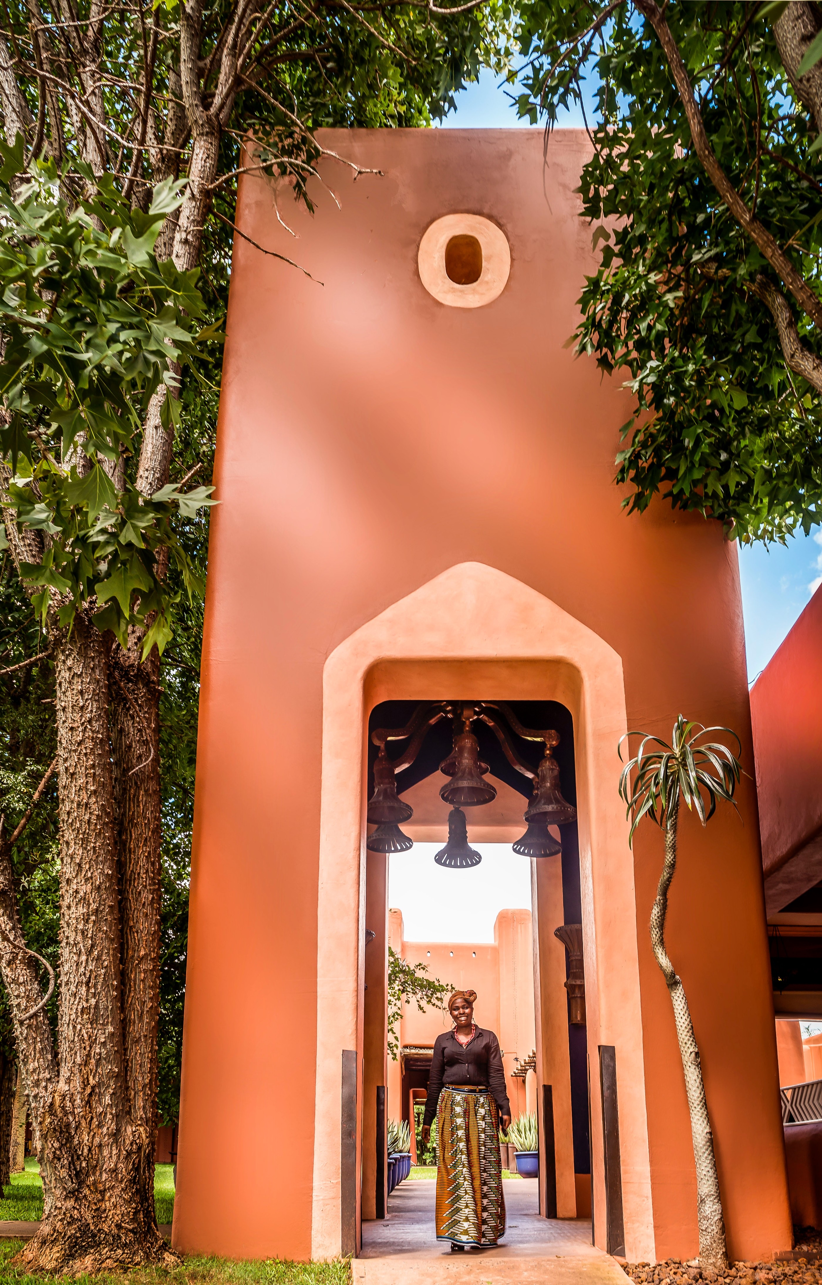 The resort has the feel of a centuries-old walled city, reflecting the richness and diversity of the land’s heritage. Earth-coloured buildings feature turrets and chimneys, with a large lawn and swimming pool at the centre. Well-polished smooth stone floors combine with colourful mosaic tiles, patterned fabrics and vibrant African artwork to create a sense of place.