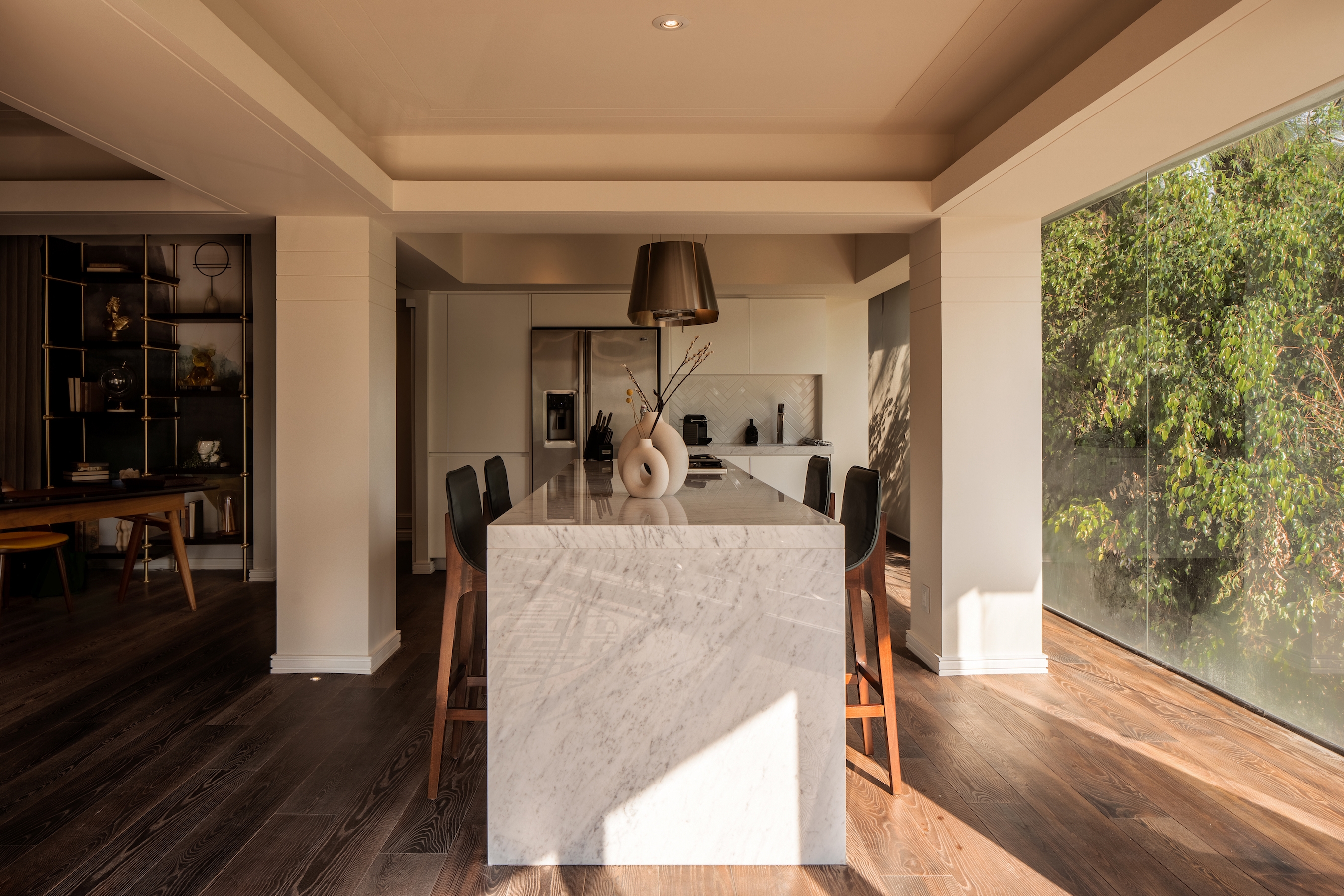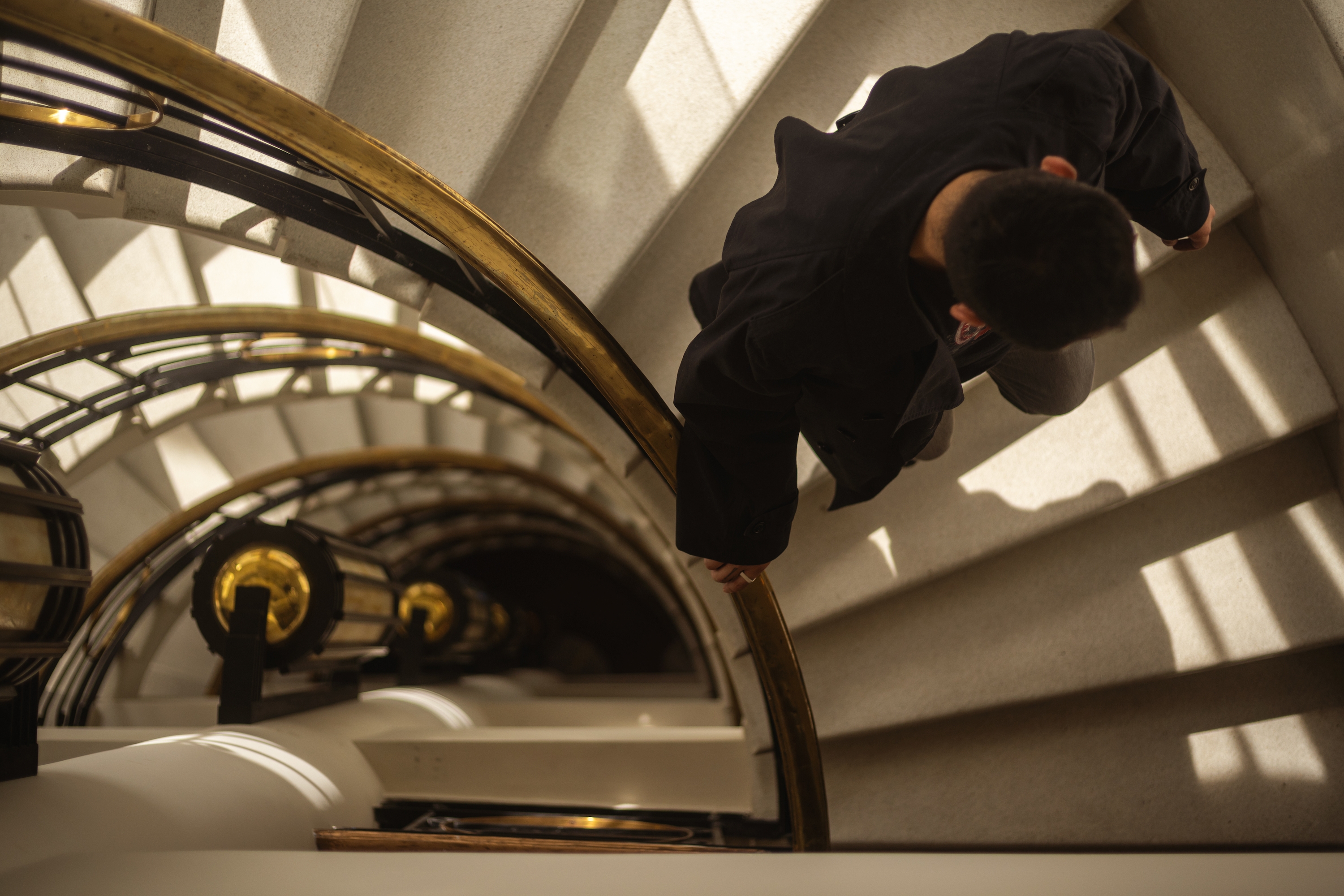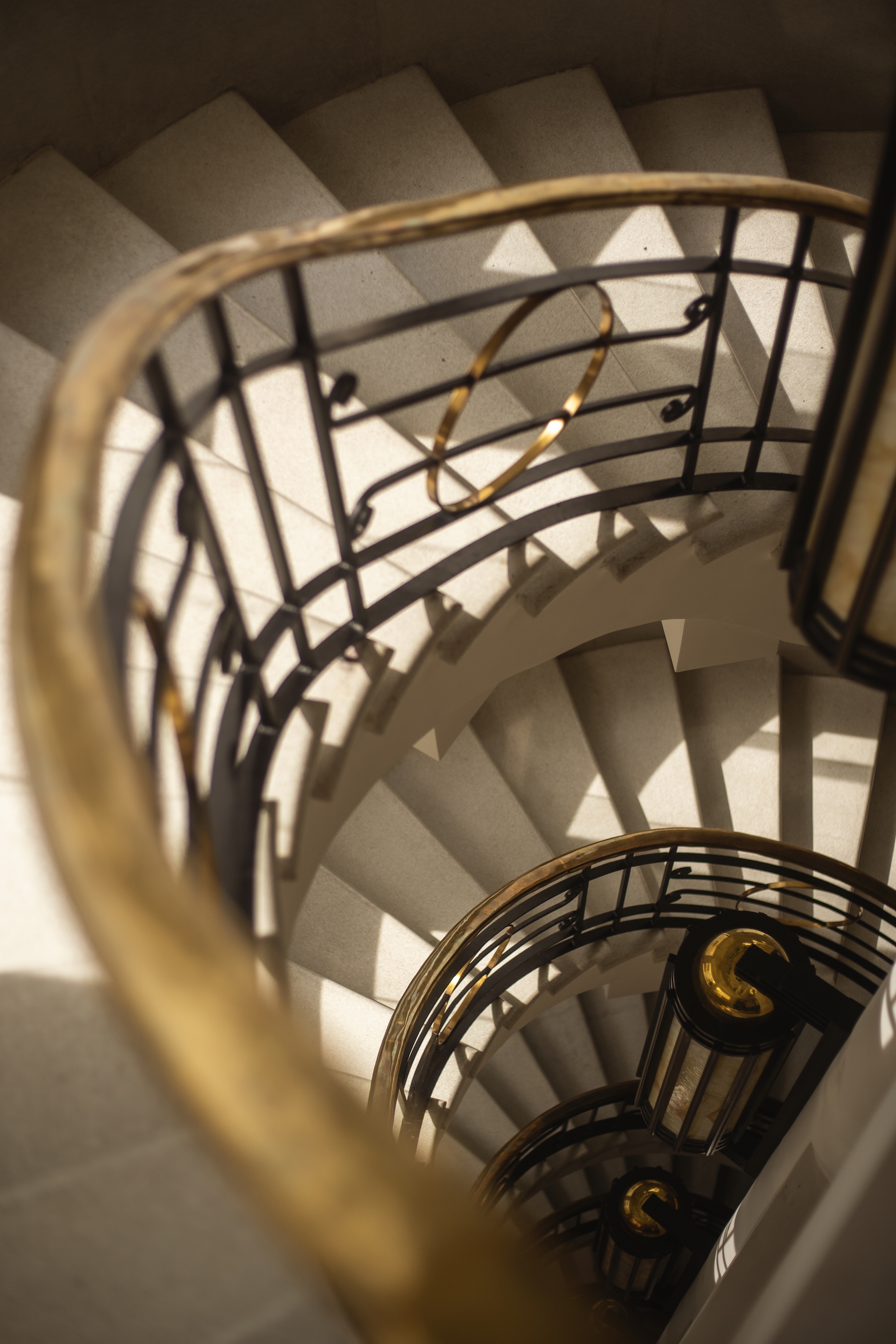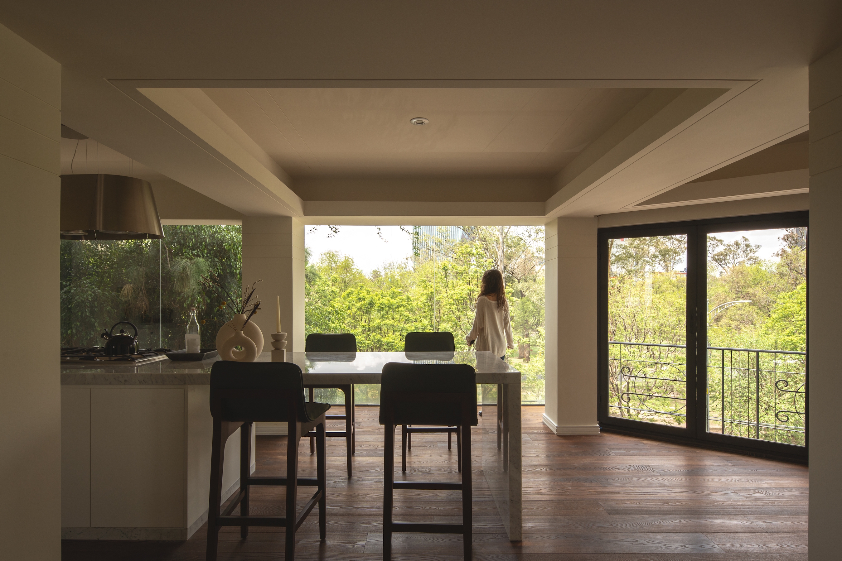 The original 1940's spiral staircase dictates the aesthetics of the space. The Art Decó design of the handrail is the inspiration for the ironwork of the wraparound balconies that offer floor-to-ceiling views of the verdant Republica del Líbano garden.