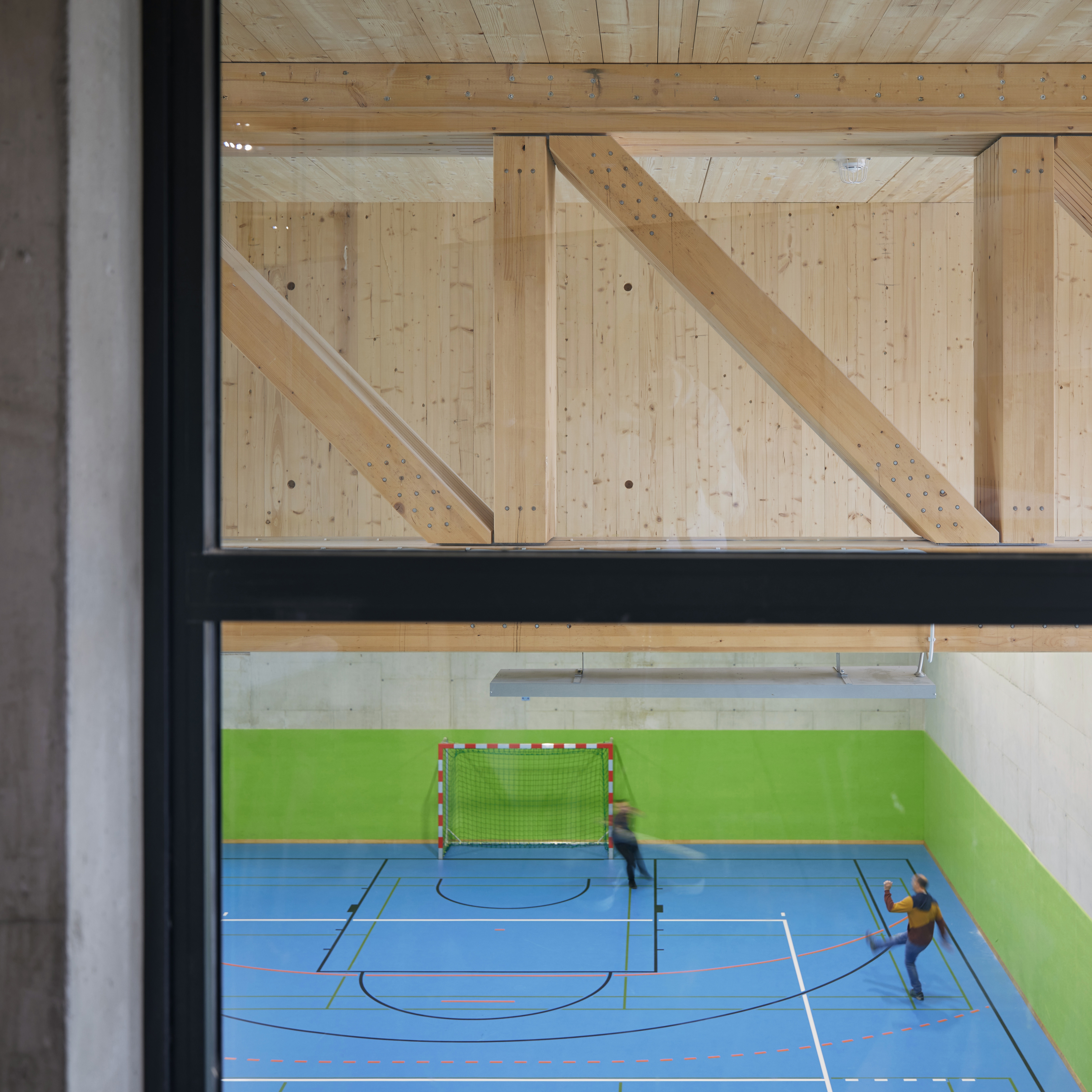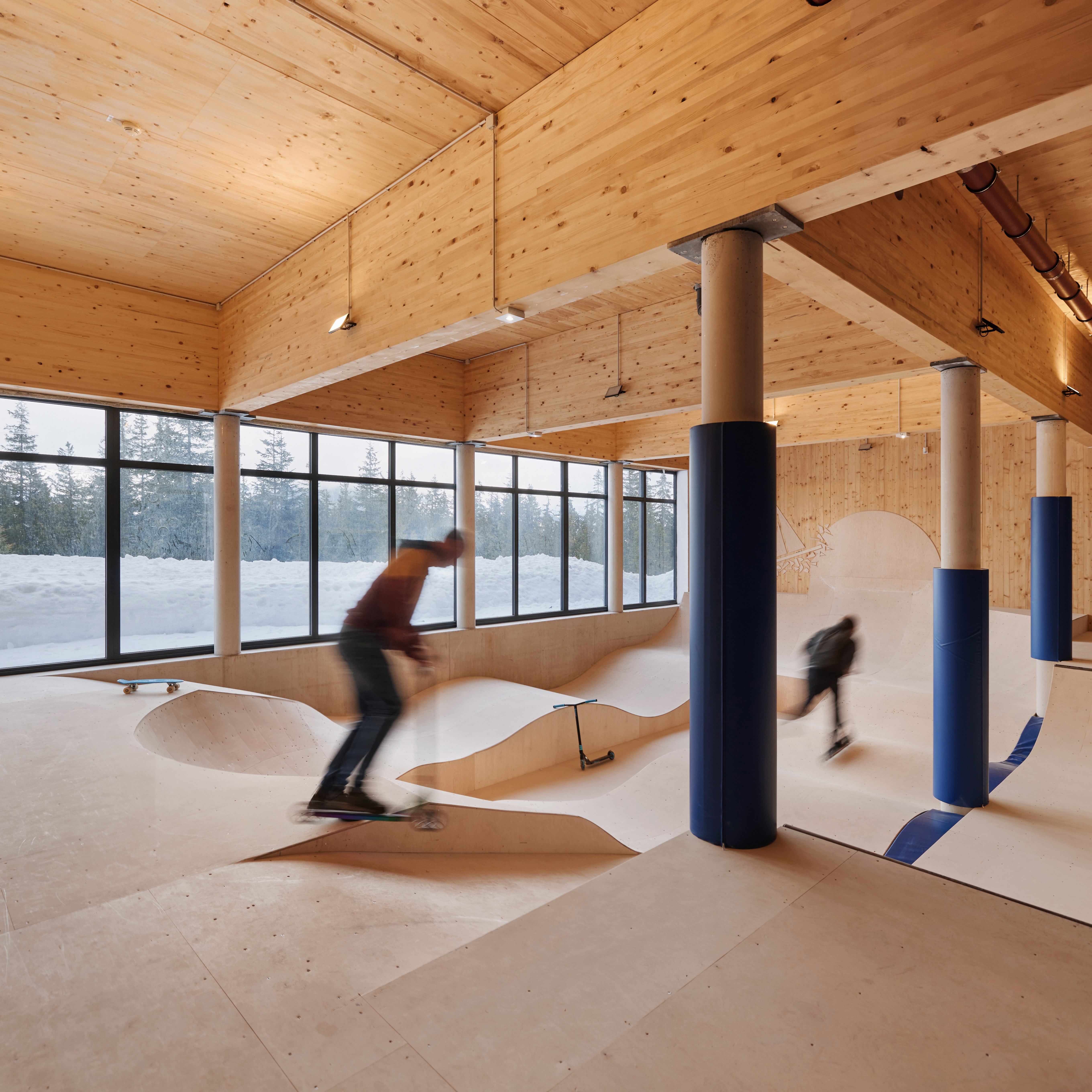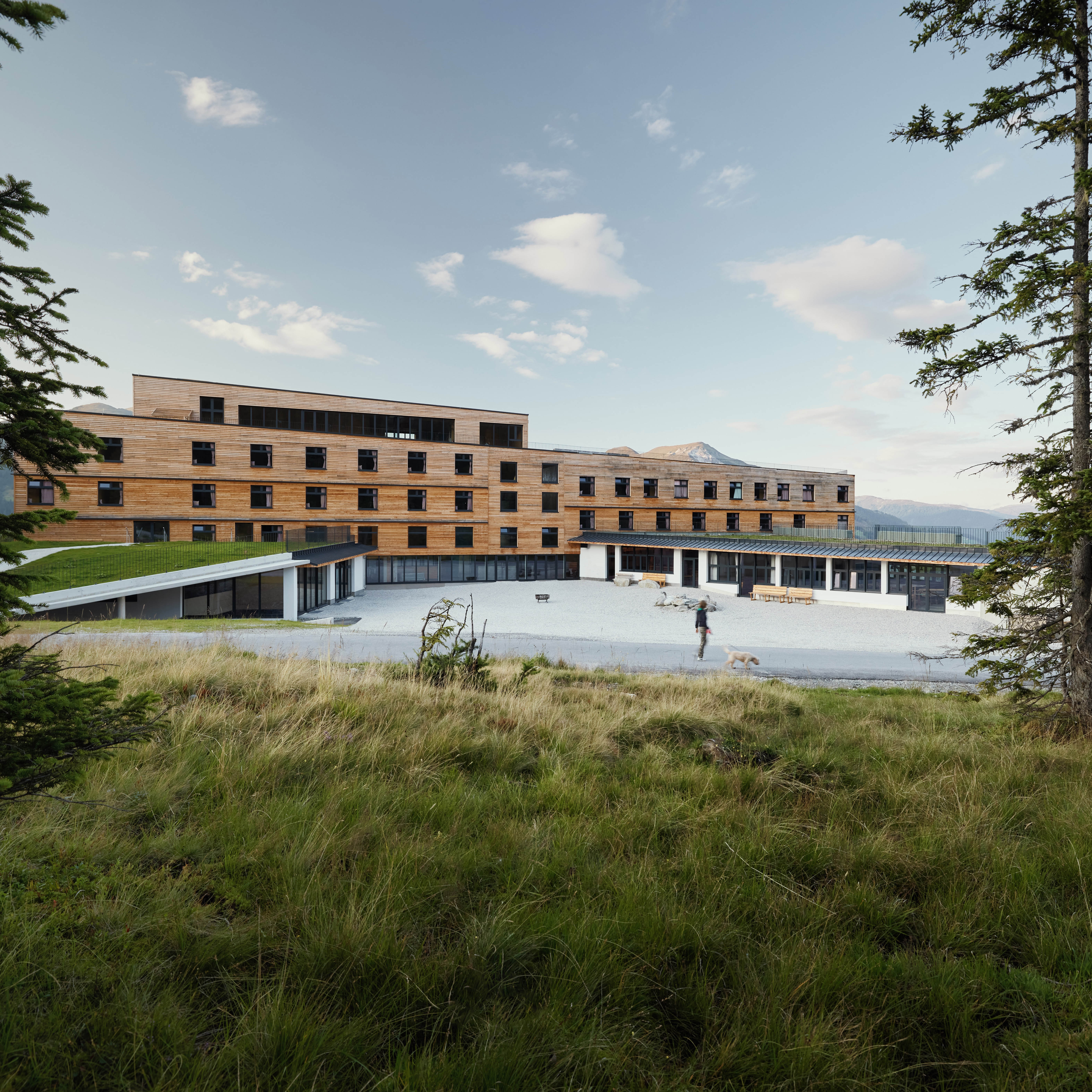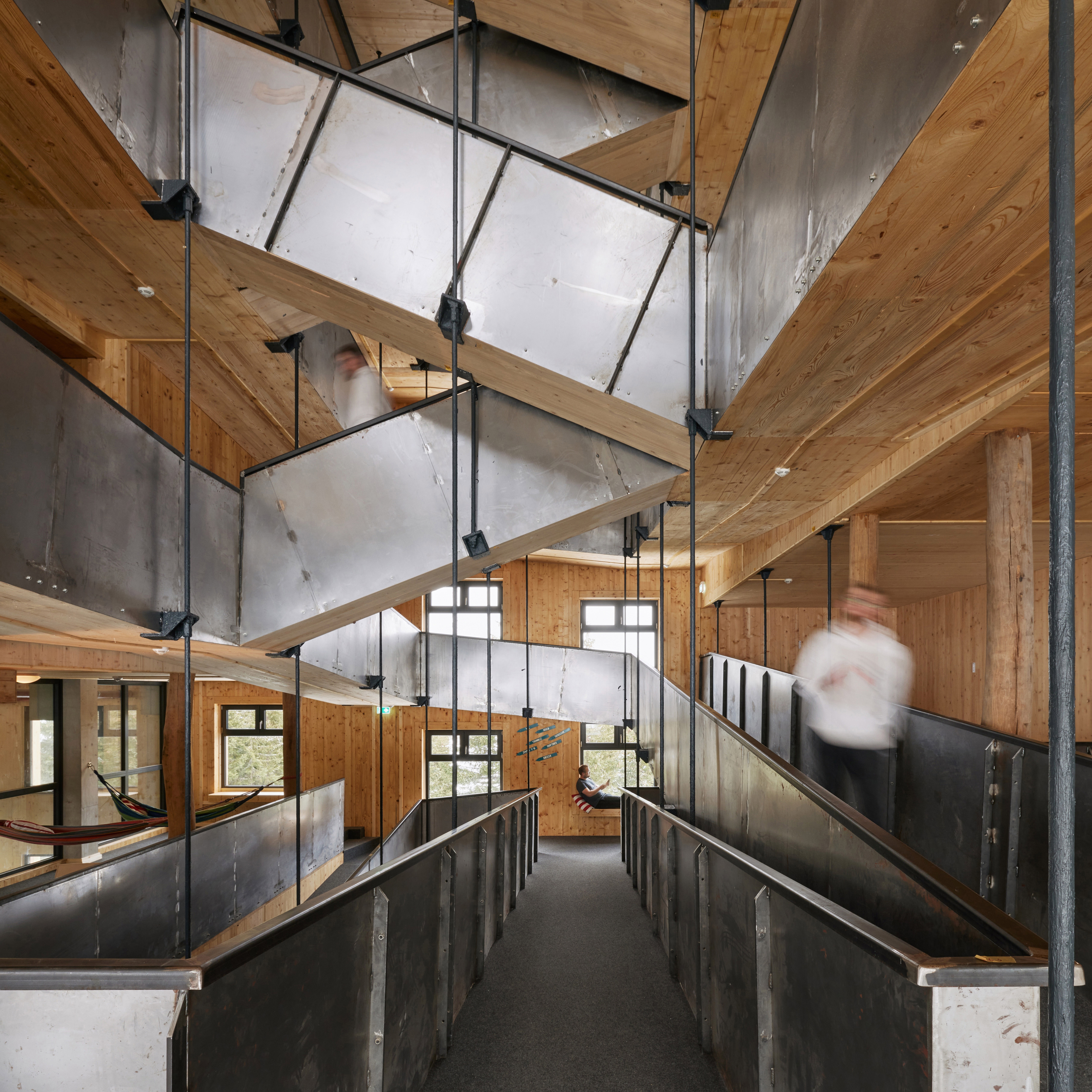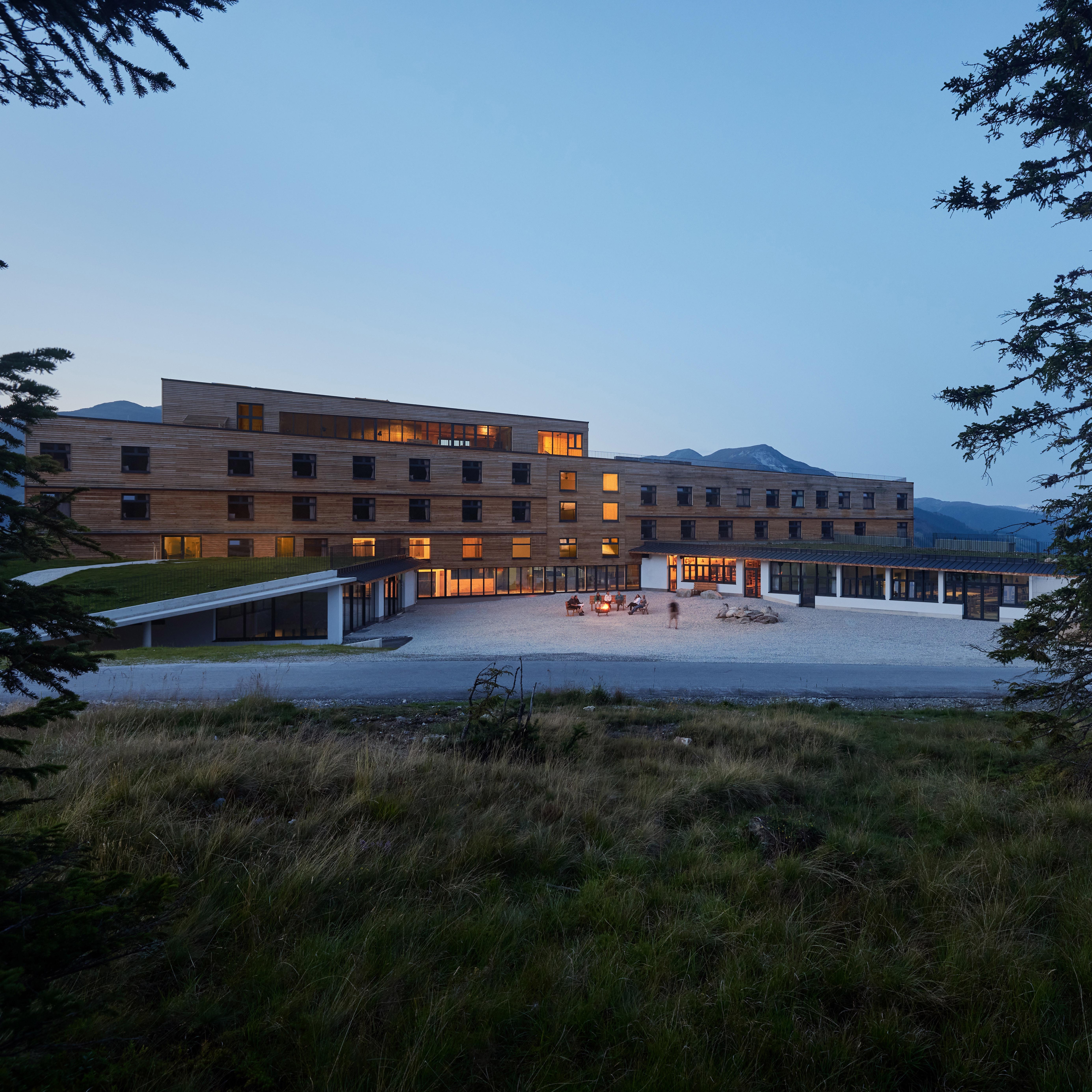 The aim of this project was to make affordable school trips possible in an ecological environment. That is why the hotel was built from regional wood in solid wood construction, the hotel is heated by biomass district heating, the journey is mainly by coach and the leftover wood of the cross-laminated timber walls was processed into furniture. The main structure of the hostel is designed as a longitudinal timber structure. The urban and spatial intention is to create a south-facing U-shaped “village square” between the main building and the street, which functions as a semi-public zone. This square is accompanied by two side wings, which are formed as landscape waves and allow the square to sink into the landscape. When entering the hostel via the village square, you are in the foyer. This is where the vertical development begins with suspended ramps and spacious air holes. These allows visual relationship into the deeper landscape on the other side of the building and to the sport areas inside. A climbing wall goes through this vertical development and starts on the lower leveled sport area.