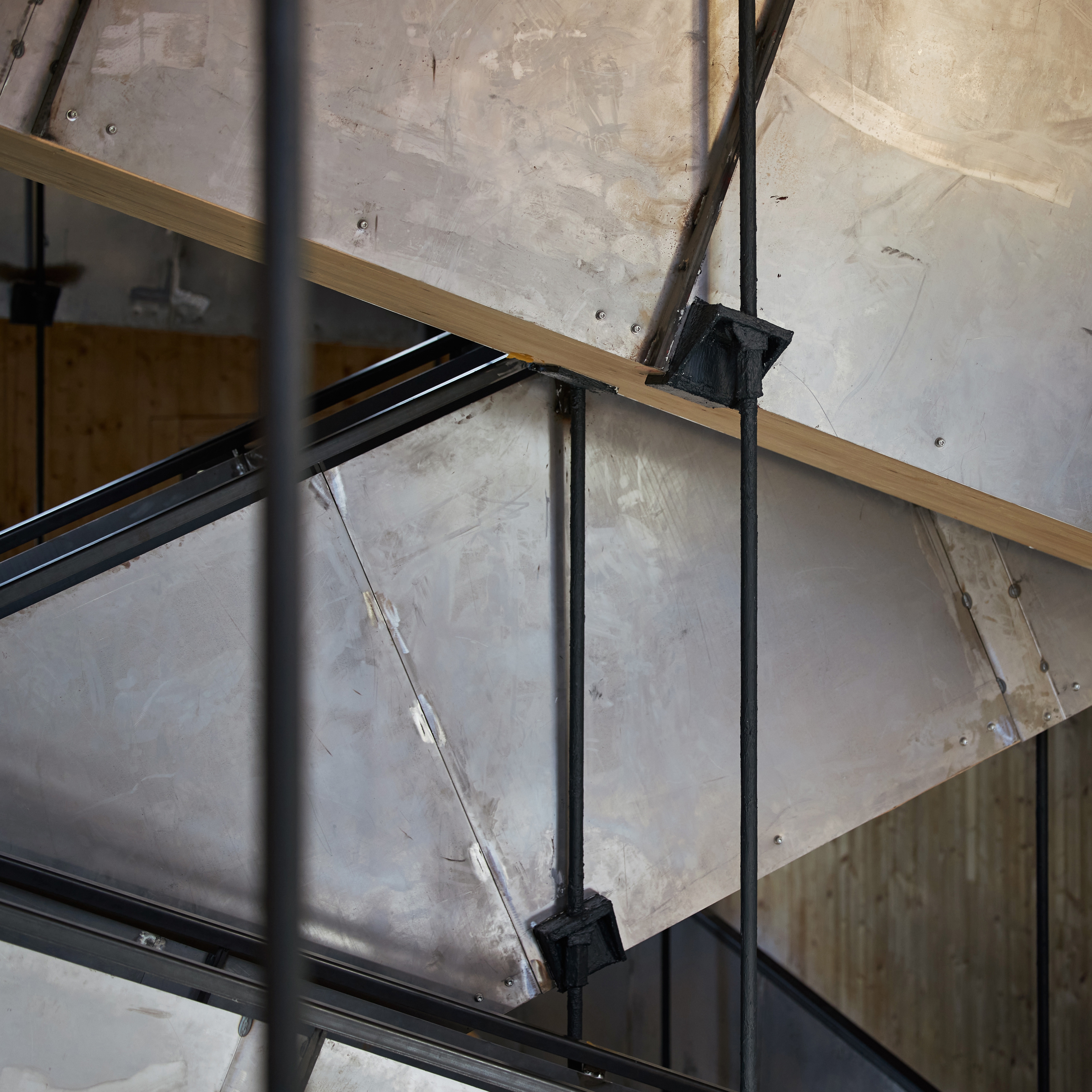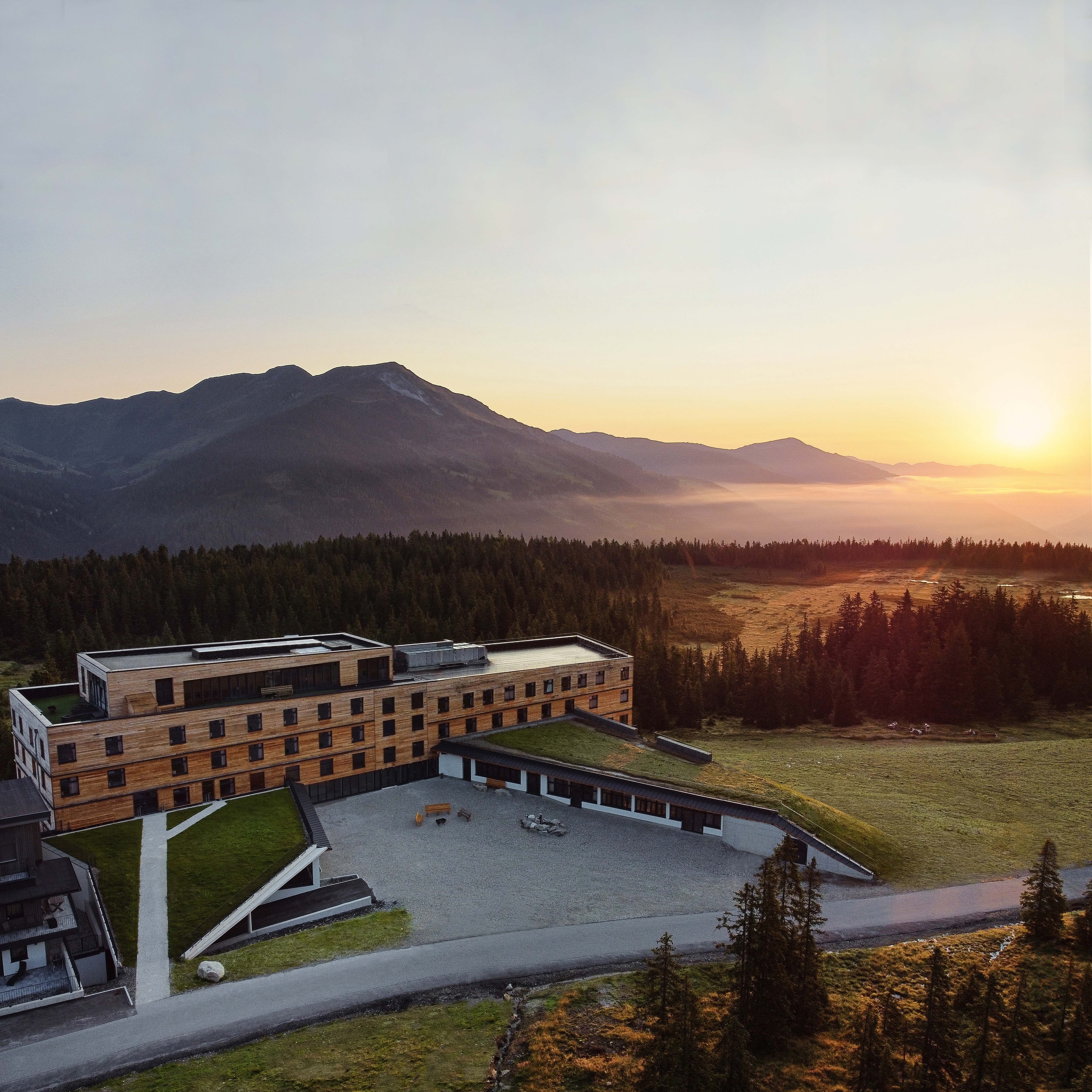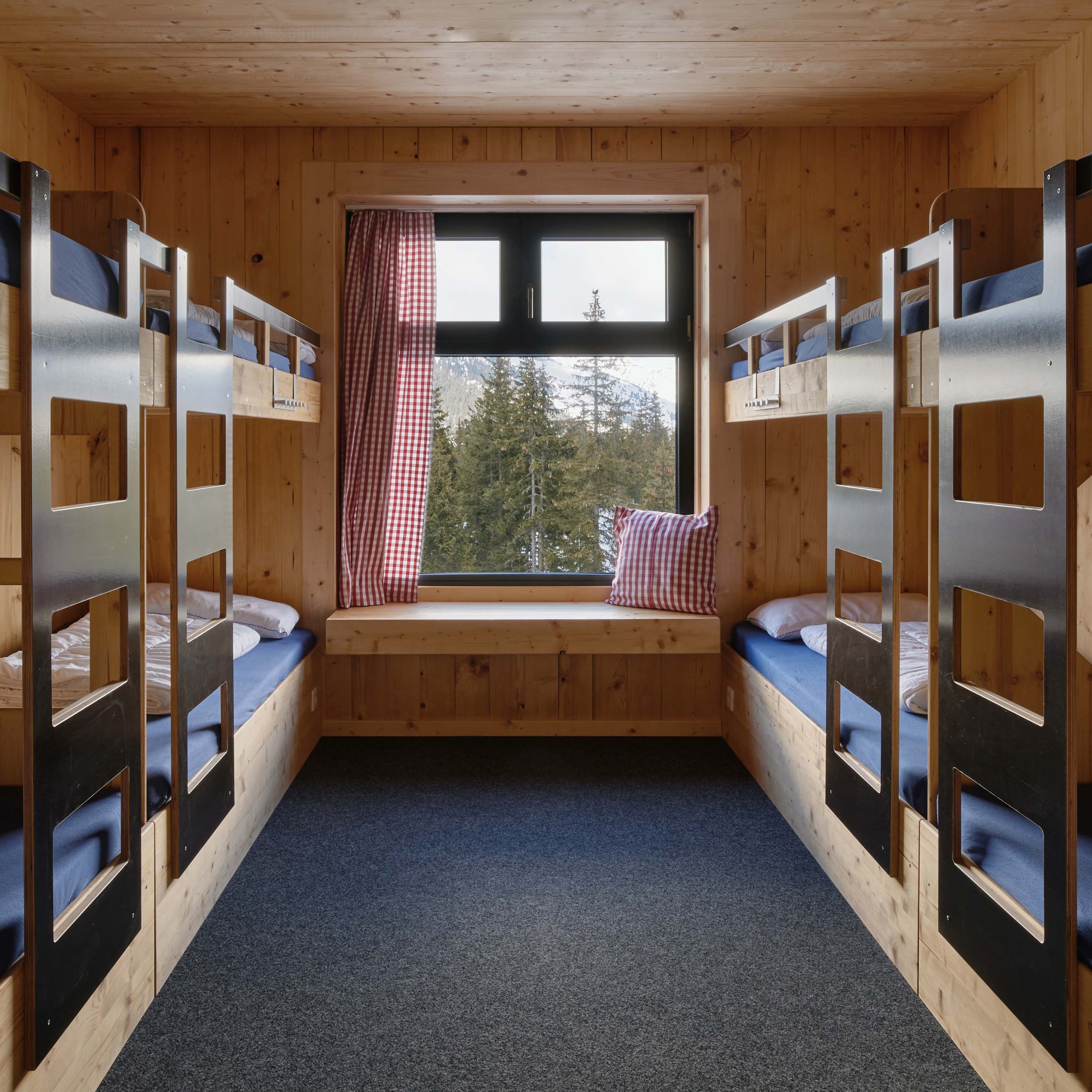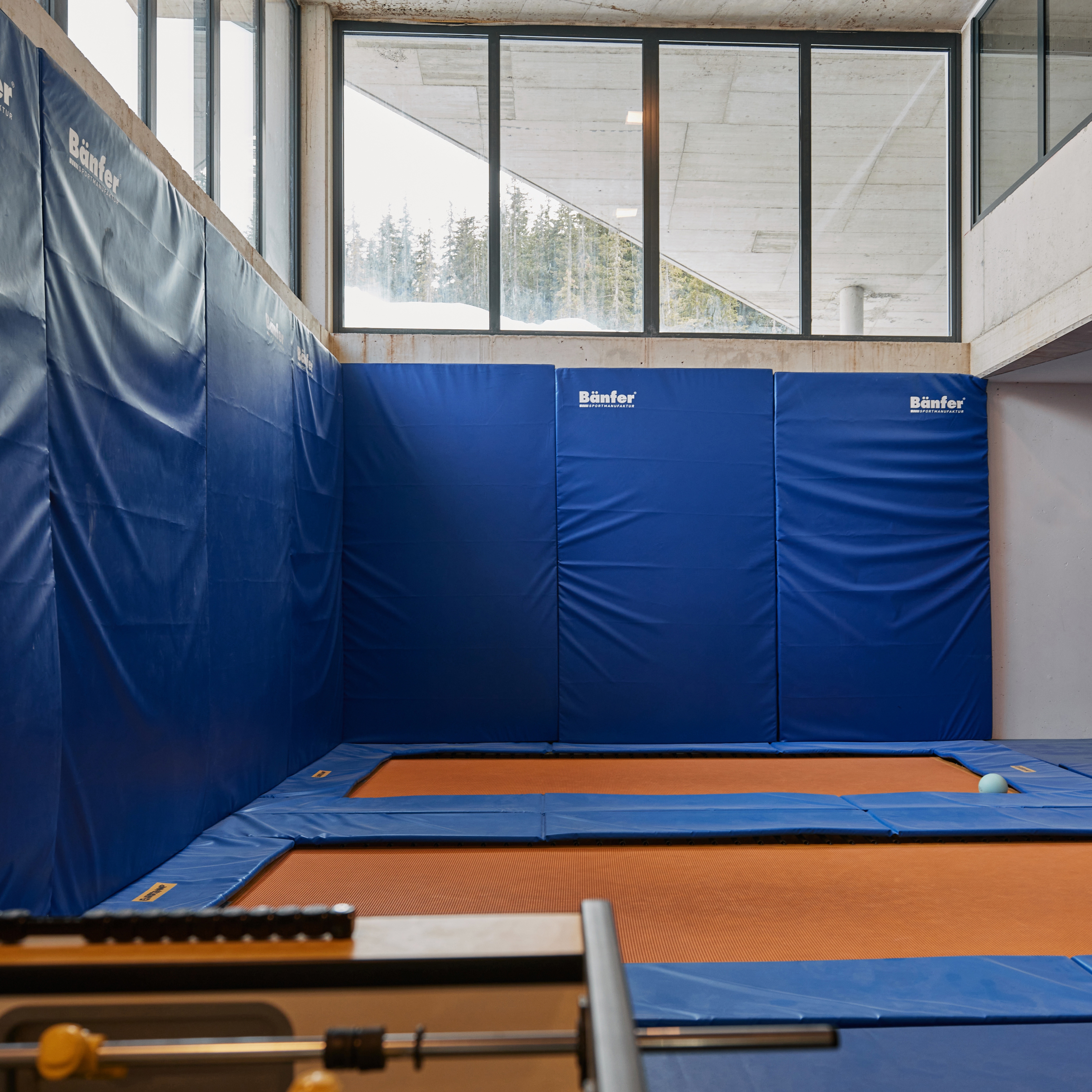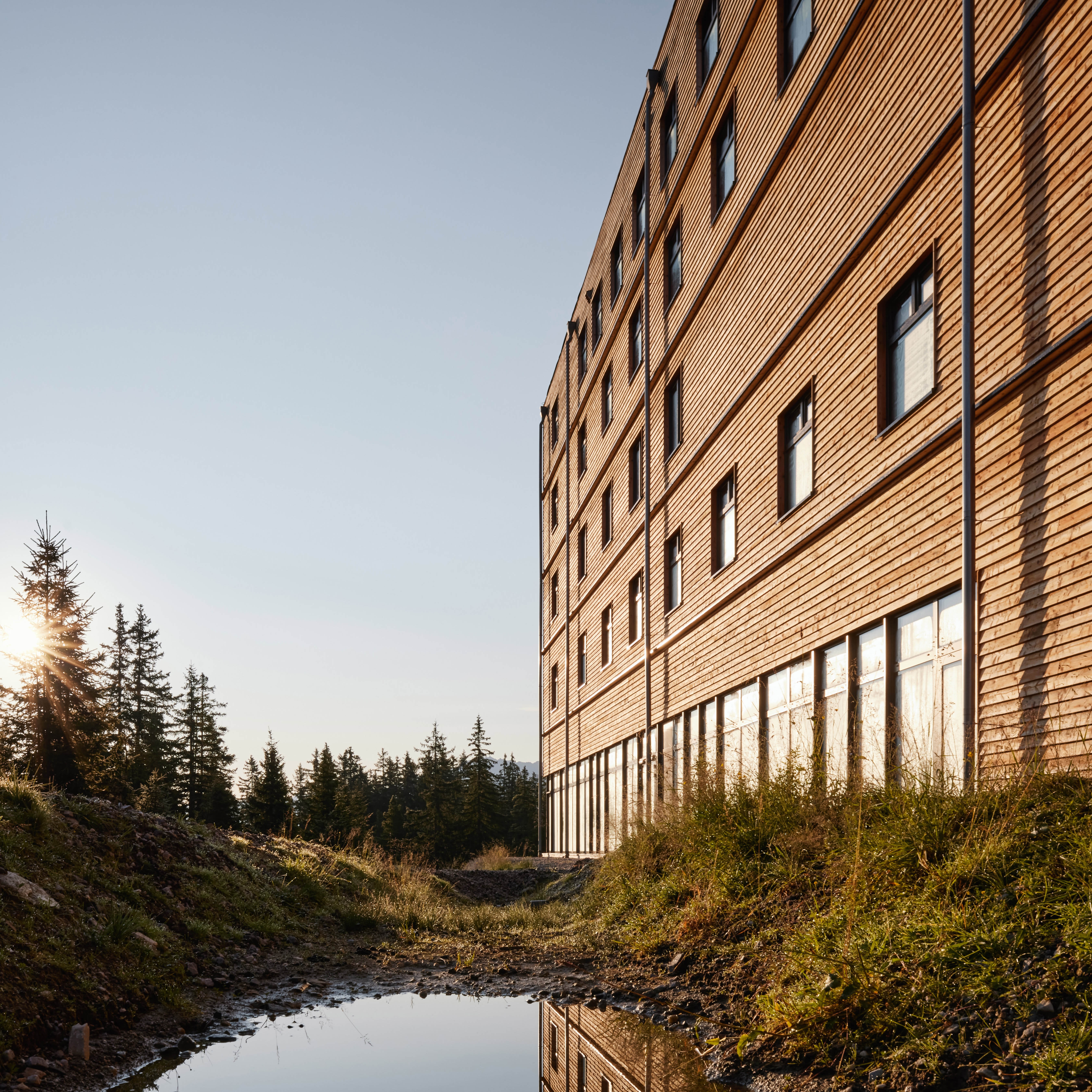 The aim of this project was to make affordable school trips possible in an ecological environment. That is why the hotel was built from regional wood in solid wood construction, the hotel is heated by biomass district heating, the journey is mainly by coach and the leftover wood of the cross-laminated timber walls was processed into furniture. The main structure of the hostel is designed as a longitudinal timber structure. The urban and spatial intention is to create a south-facing U-shaped “village square” between the main building and the street, which functions as a semi-public zone. This square is accompanied by two side wings, which are formed as landscape waves and allow the square to sink into the landscape. When entering the hostel via the village square, you are in the foyer. This is where the vertical development begins with suspended ramps and spacious air holes. These allows visual relationship into the deeper landscape on the other side of the building and to the sport areas inside. A climbing wall goes through this vertical development and starts on the lower leveled sport area.