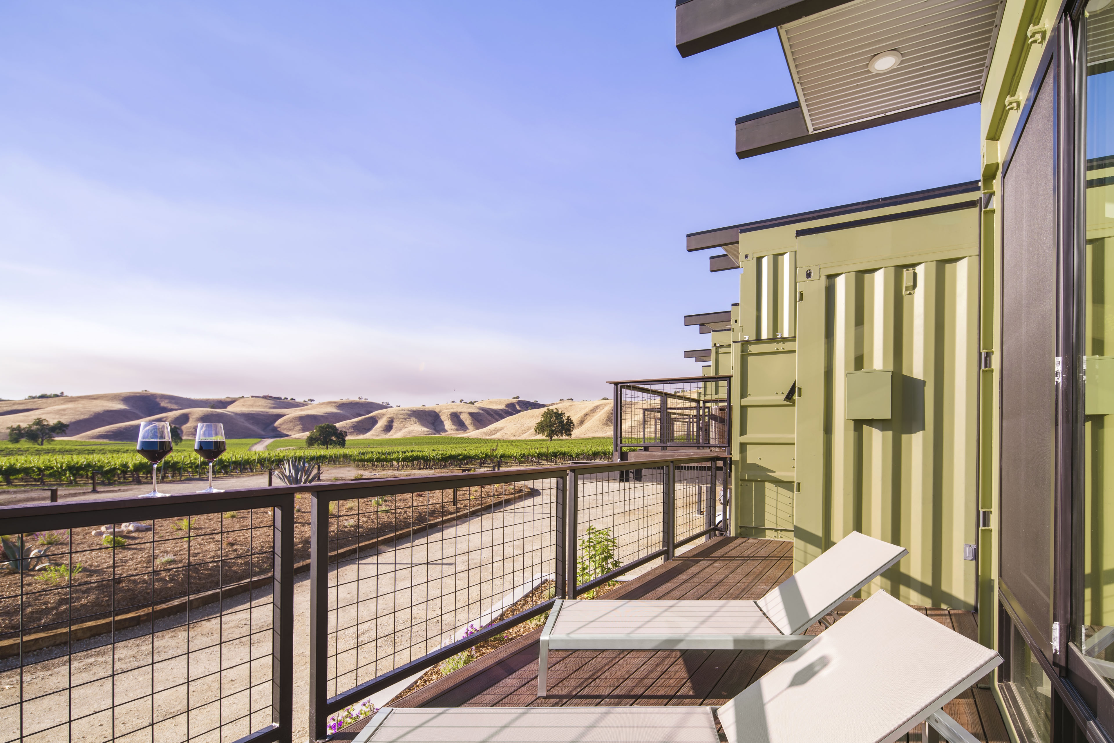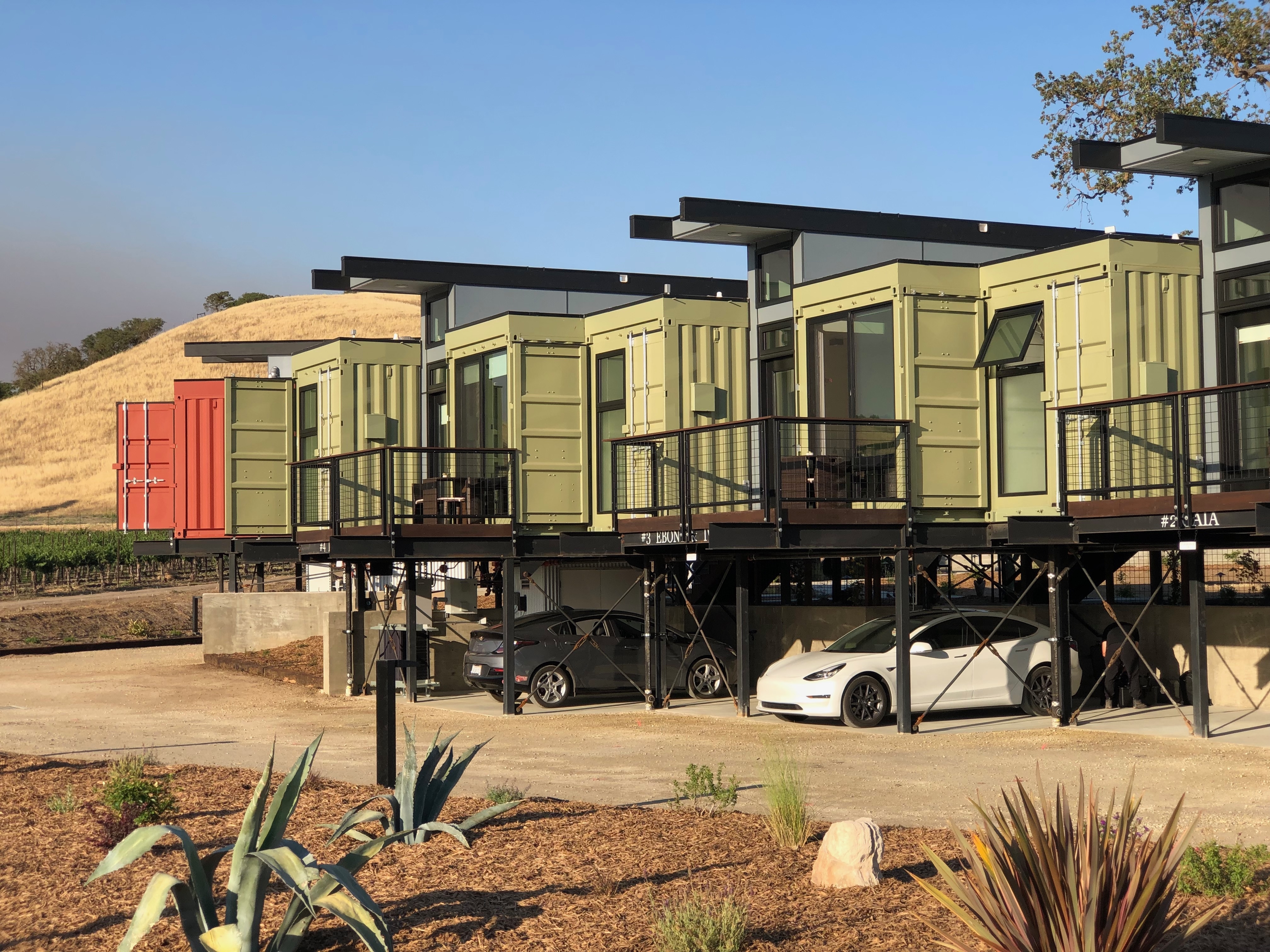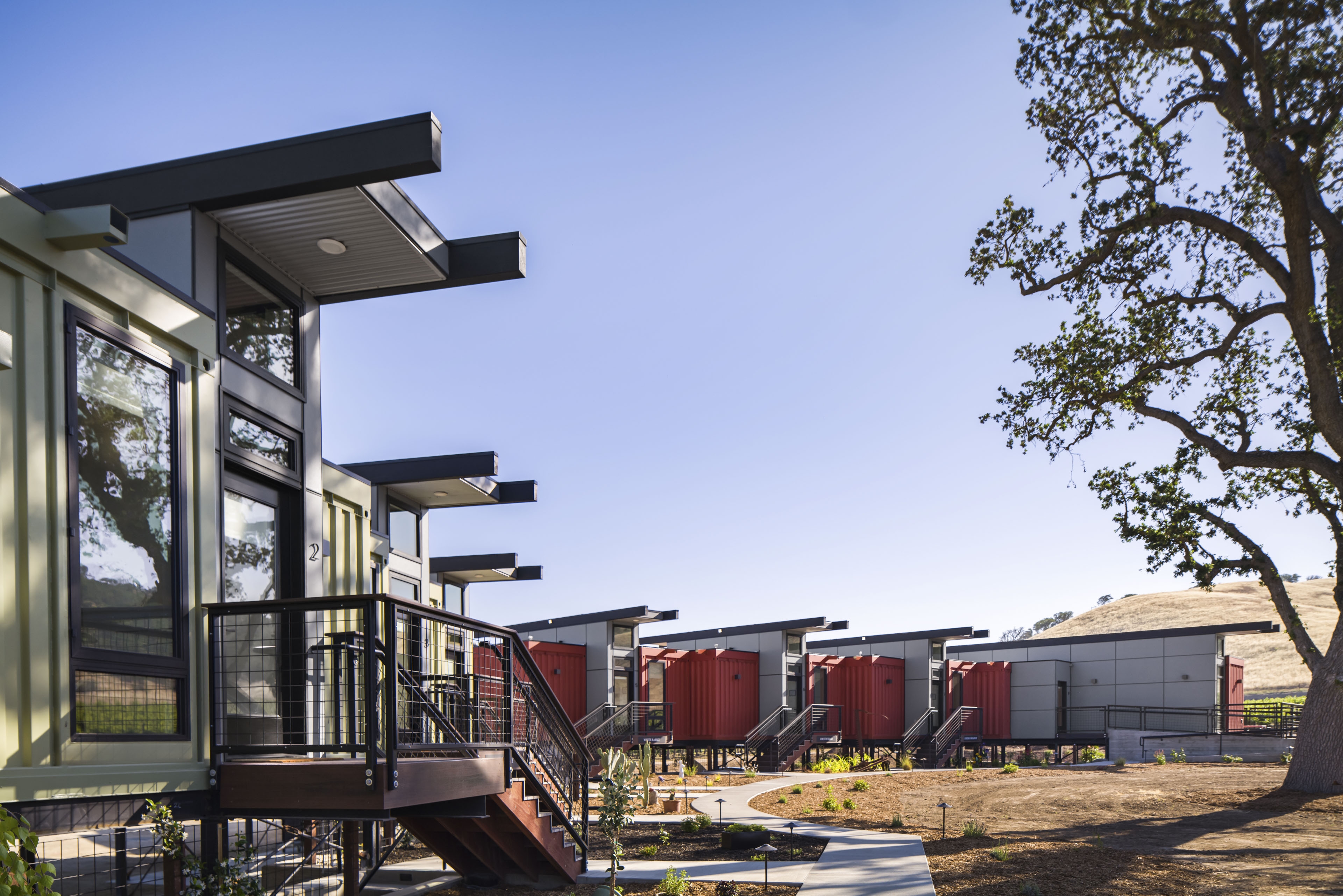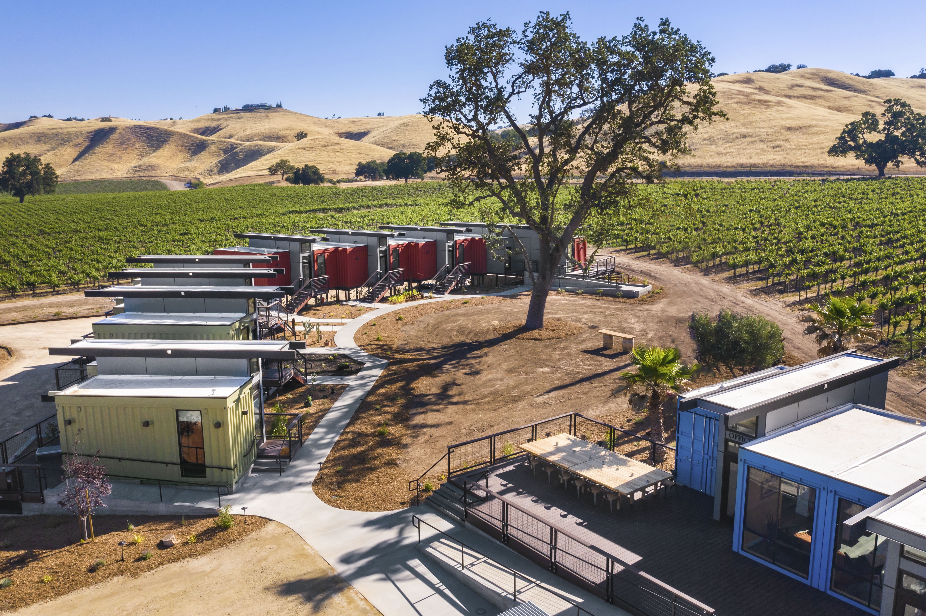 It was decided to incorporate cargo containers into a 'hybrid design' that integrates pre-fabricated, recycled industrial building and energy systems with conventional construction and locally sourced recycled materials and products. There are 8 BnB units @ 400 SF ea. with decks placed in 2 clusters and lifted 8' above shaded parking to maximize 360 deg views over the surrounding wine country. The clusters enclose an open recreation space under an enormous live oak. Each unit consists of a 20'l. x 12'h. naturally lite and ventilated circulation module with one 8'w. x 20'l. container placed on each side, one for sleeping, the other bathing and both with deck access and views.
