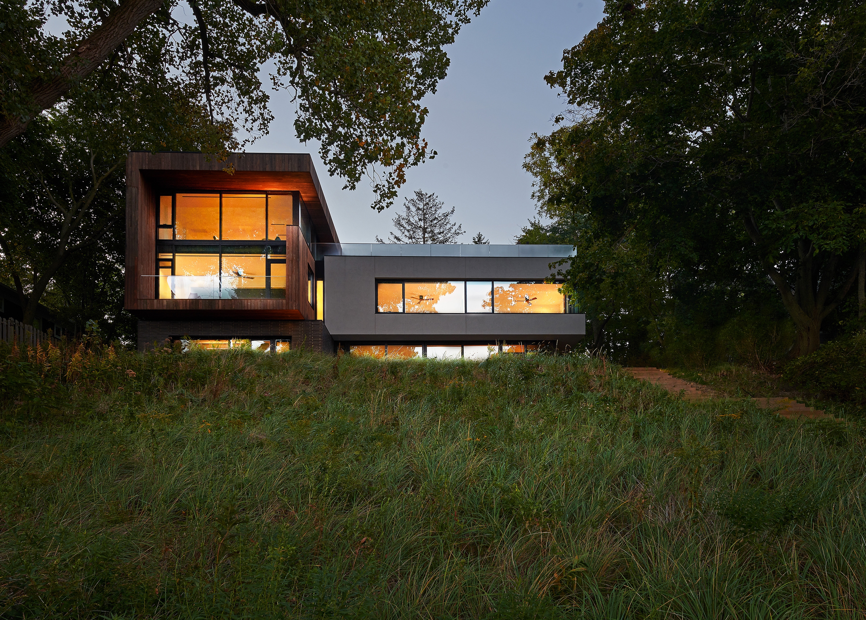Located on Lake Michigan, this 6,000 square-foot lakehouse is designed for its spectacular views and natural setting. The lakeside facade is nearly all glass with fluid indoor-outdoor space, capturing light from sunrise to sunset. The streetside is clad in wood to mimic the wooded landscape.
