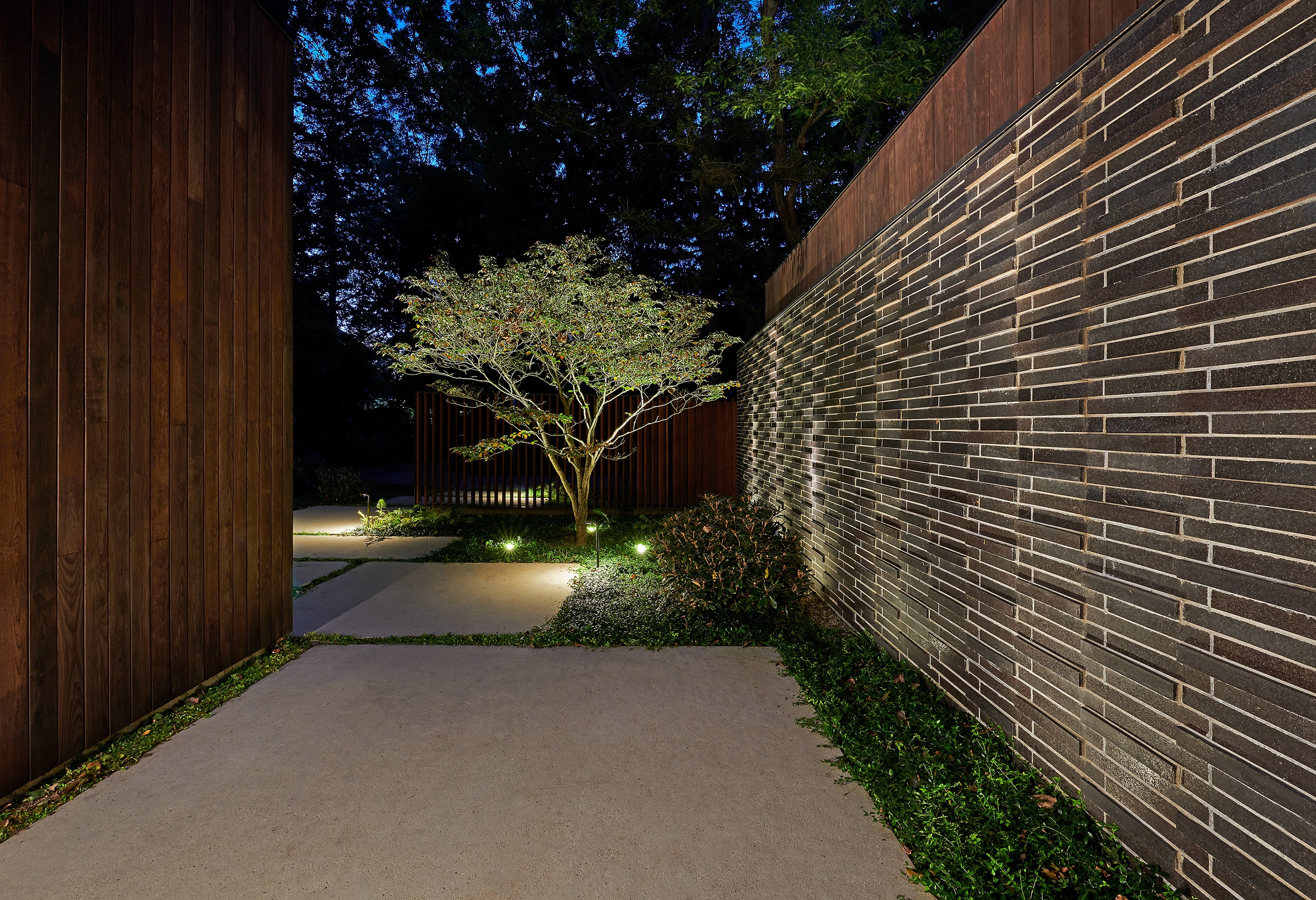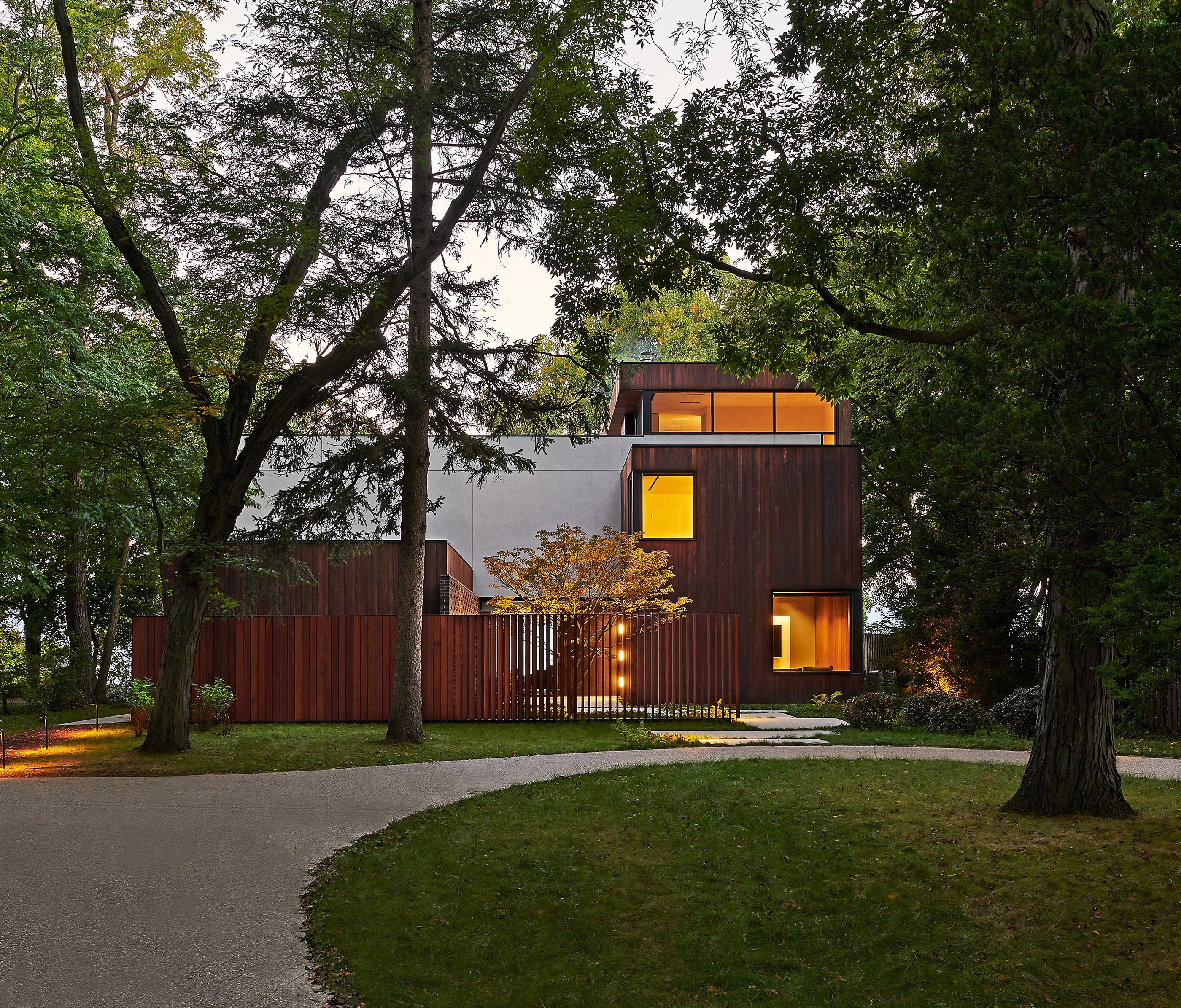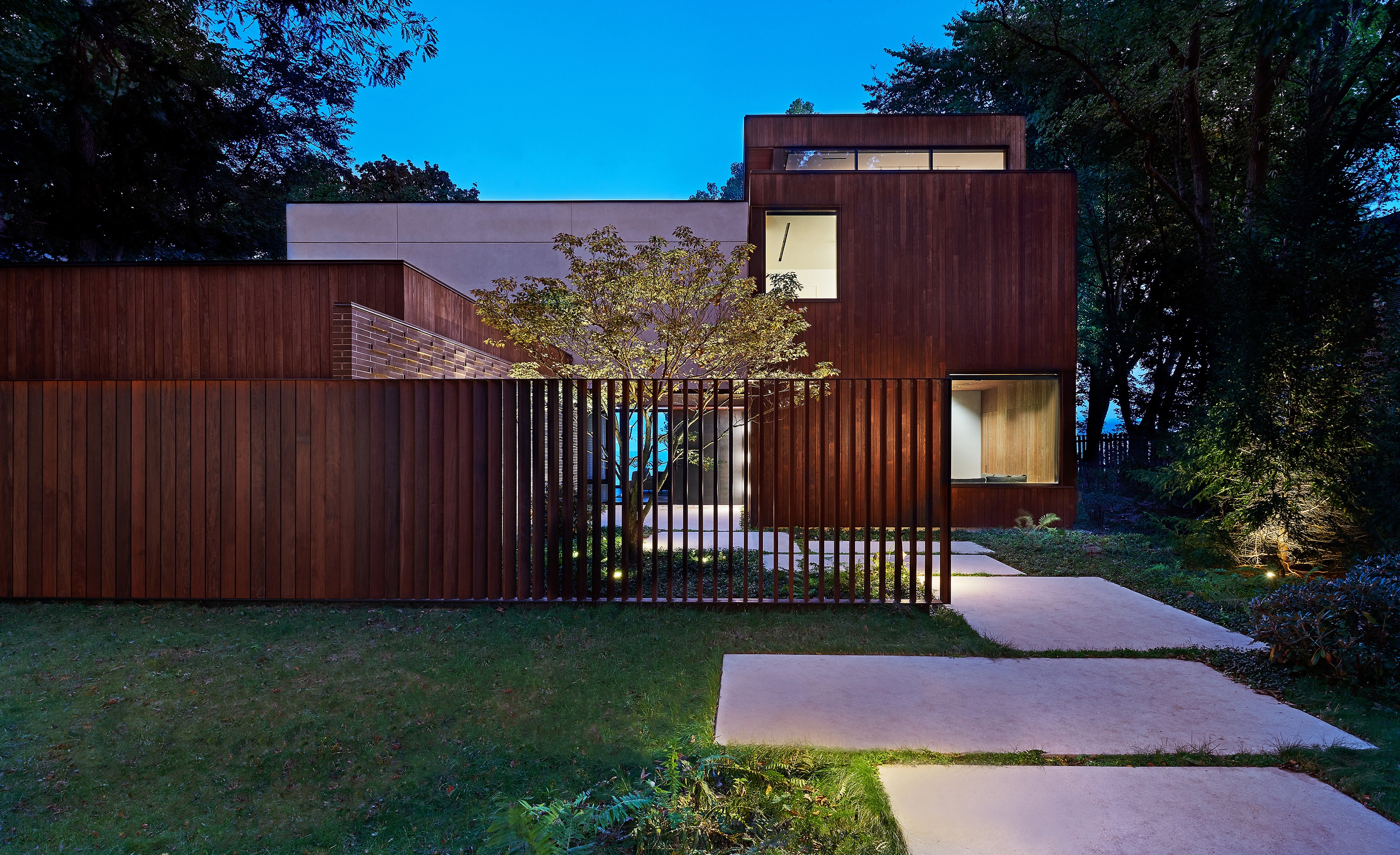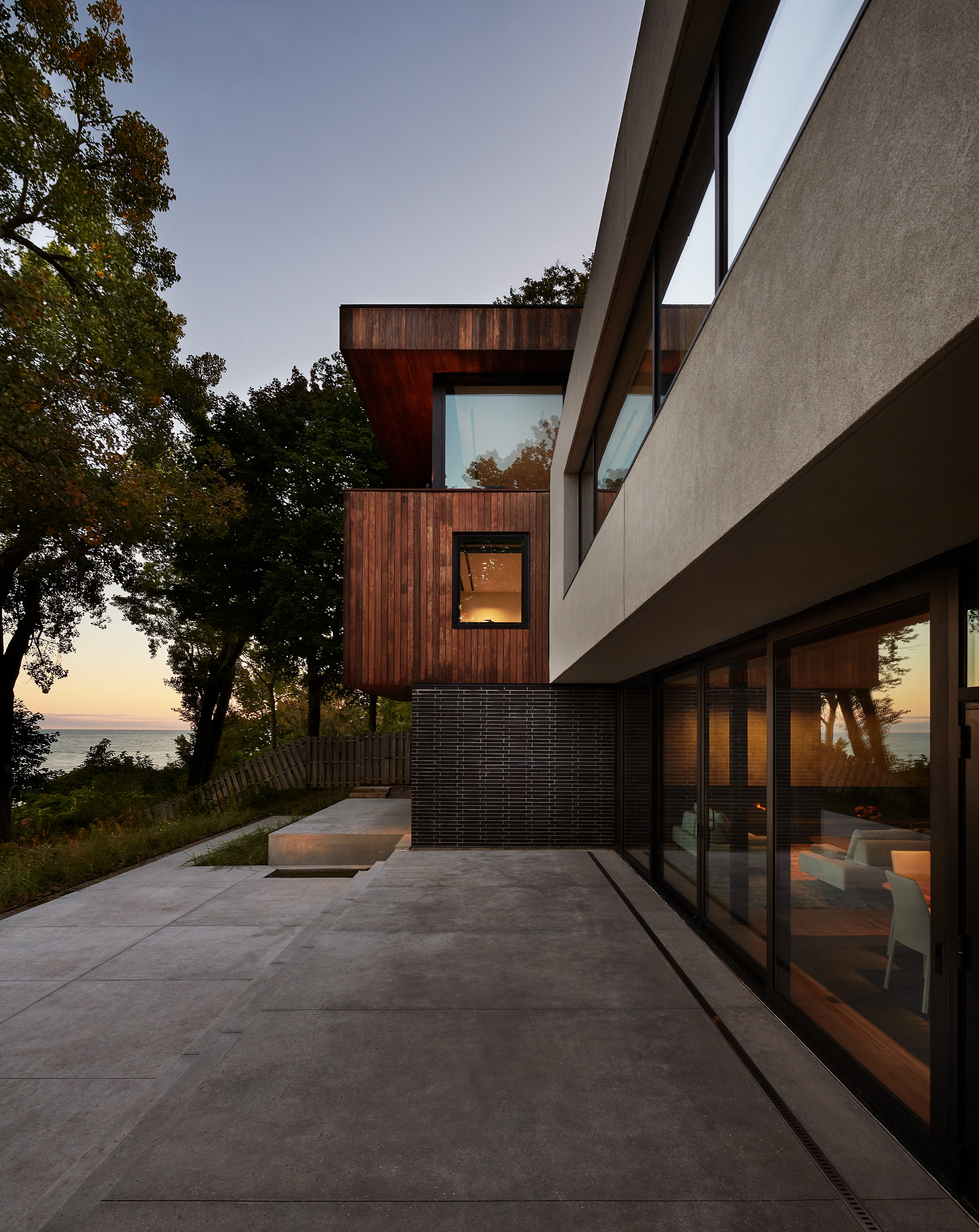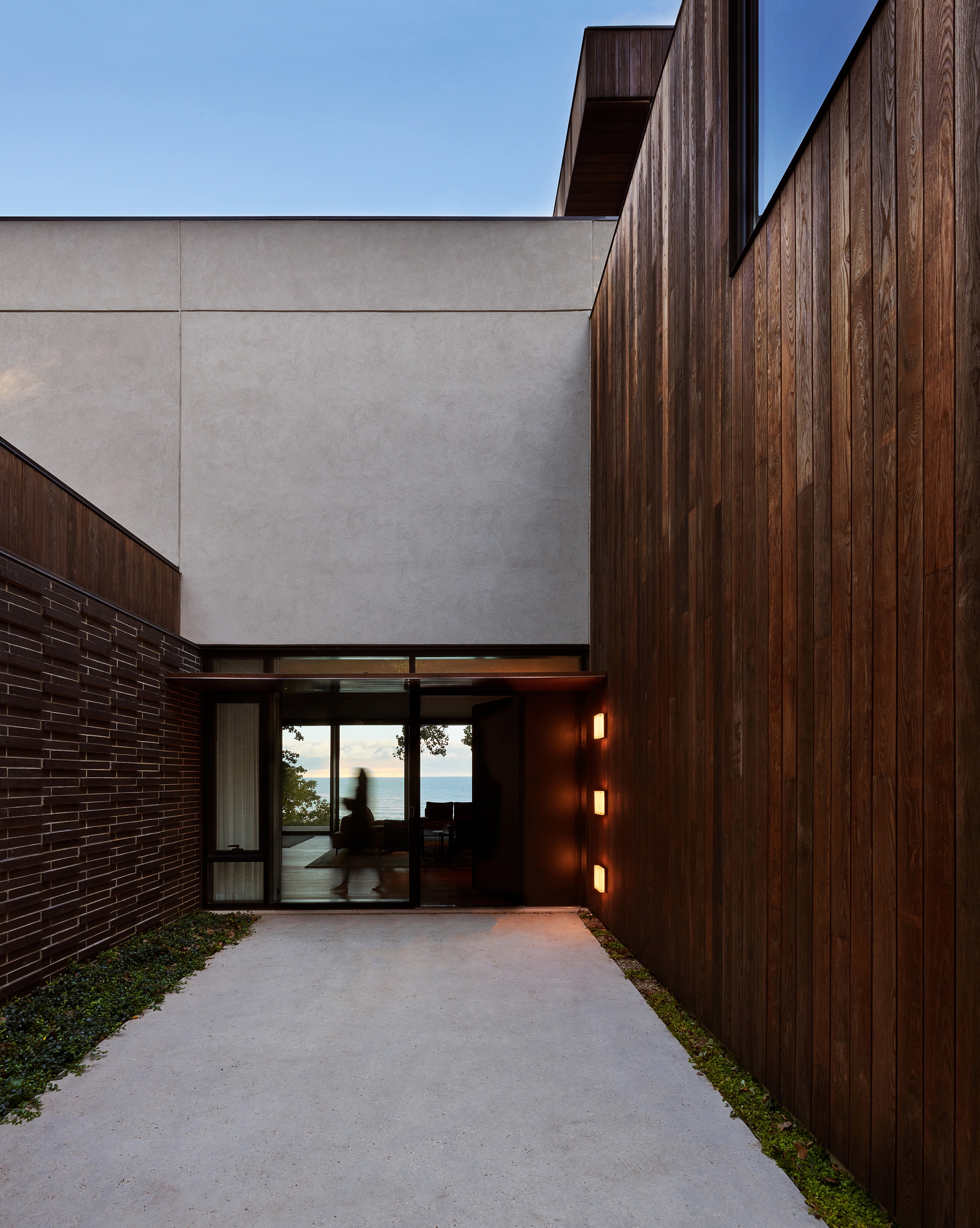 The approach to the house is a series of zen moments that quietly crescendo. A wood screen with slats at subtle angles separates the public side from the inner courtyard where the focus turns to a small tree. Behind is a wall of narrow bricks that signal a change of seasons when snow collects on the outcrops. The all-glass entry reveals a breathtaking lake horizon.