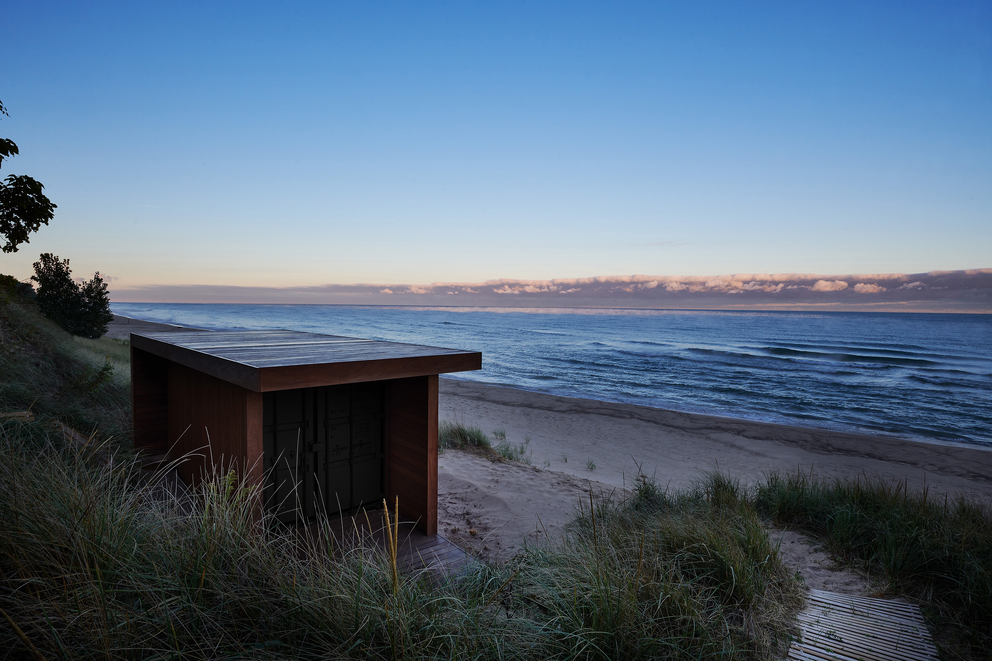 From the outdoor patio, a footpath winds its way to a beach box–an upcycled shipping container clad in wood. The container is set into the hill where it disappears from the view above, and the house similarly is hidden from view in the grasses and trees from the beach below.