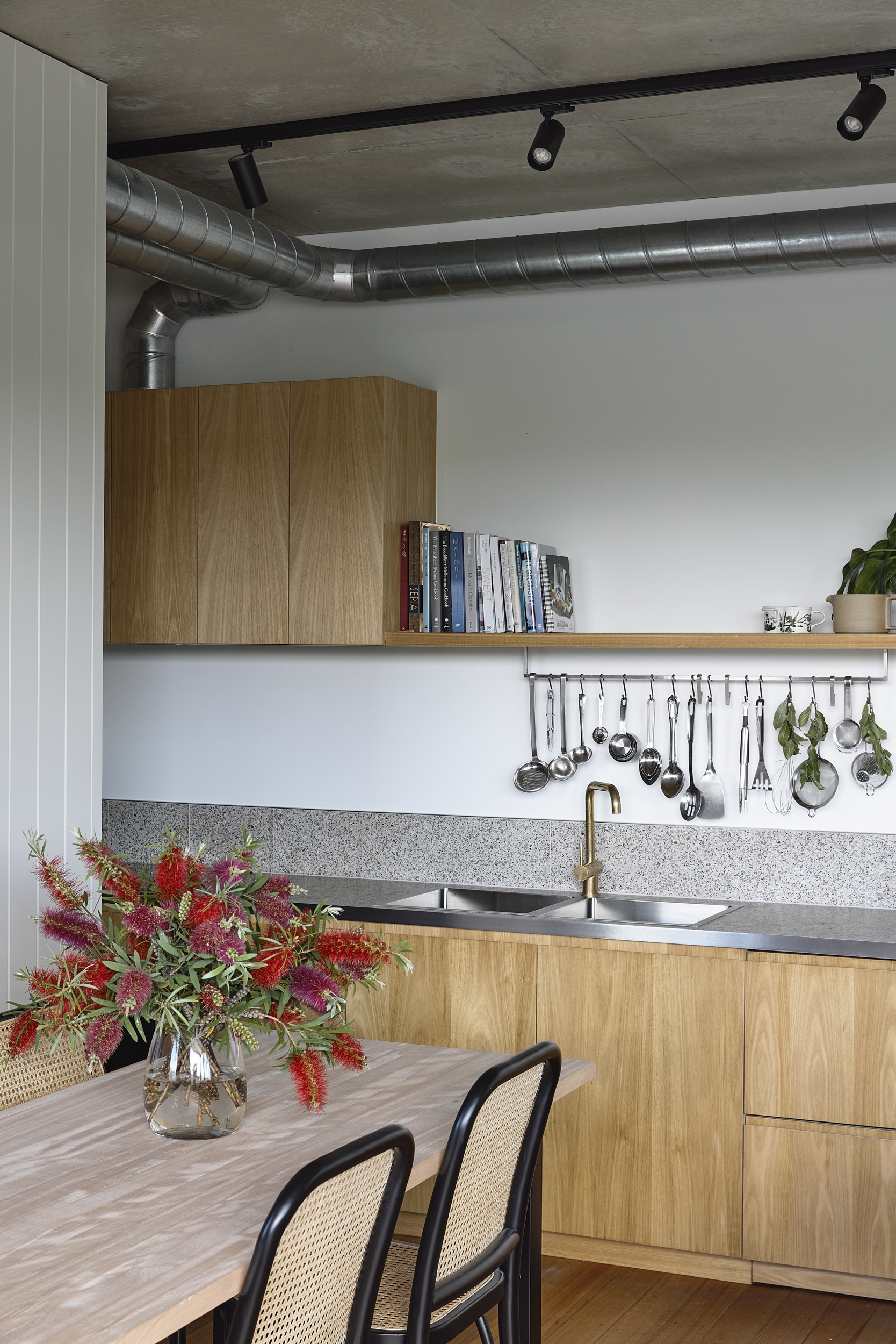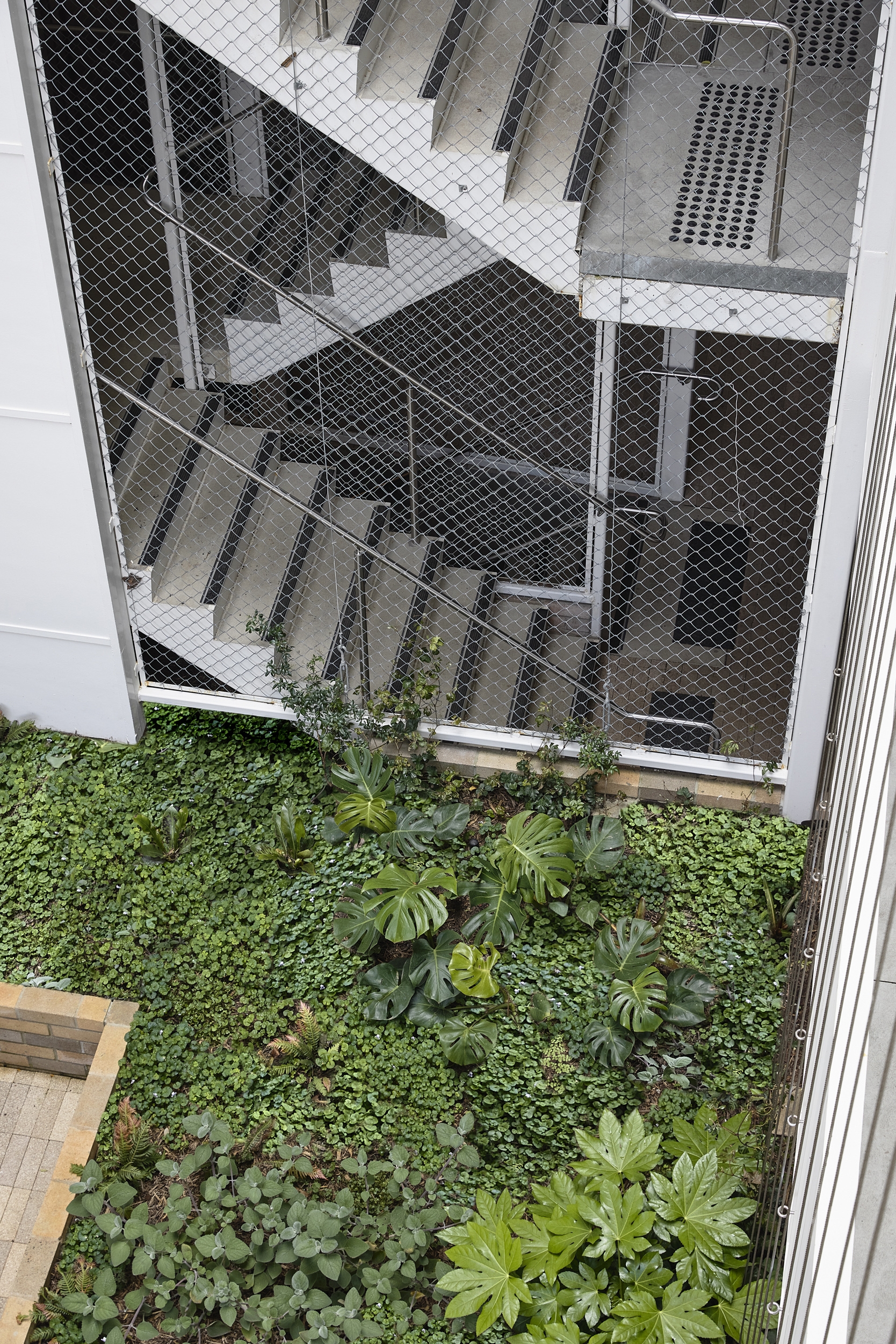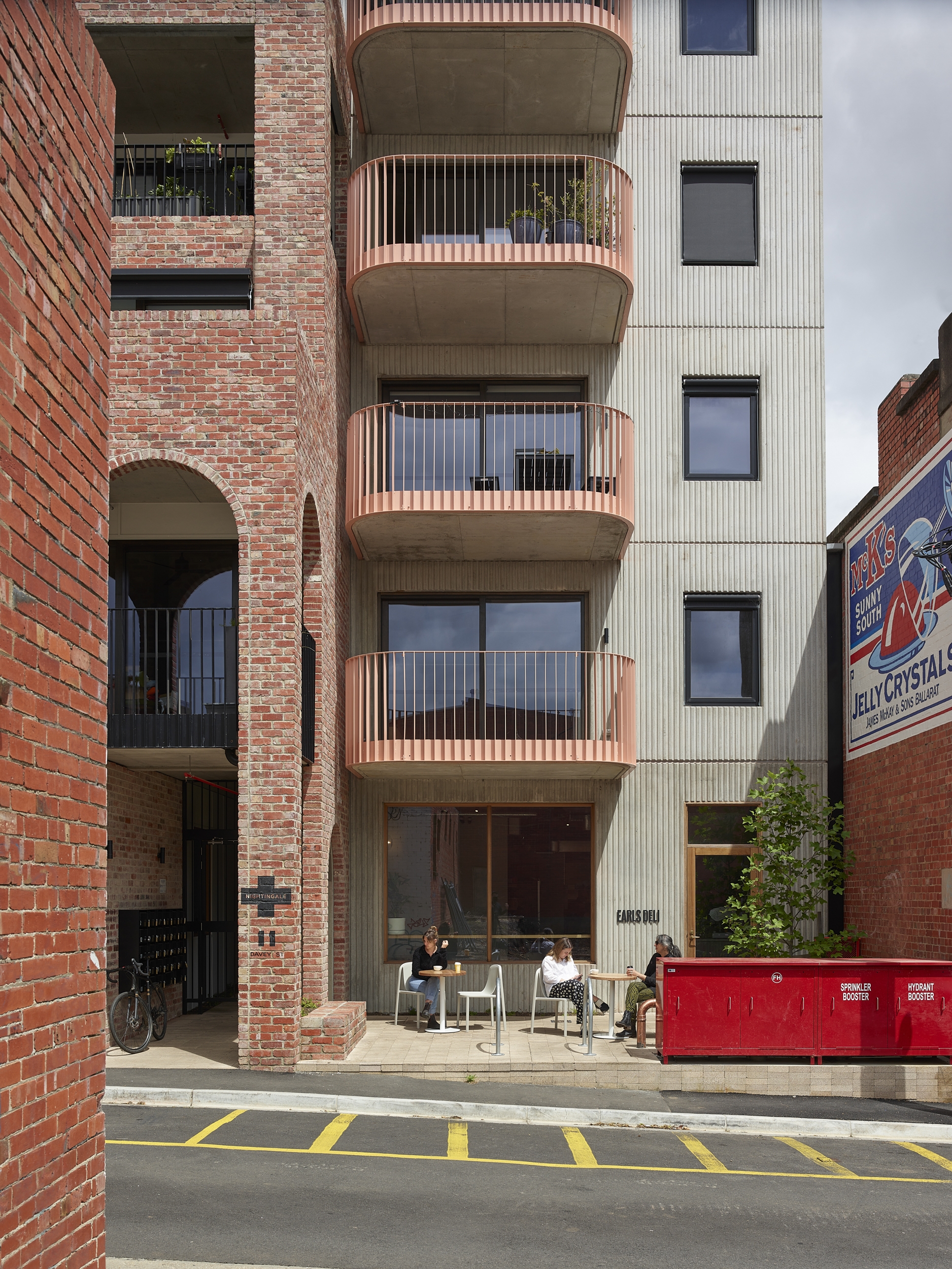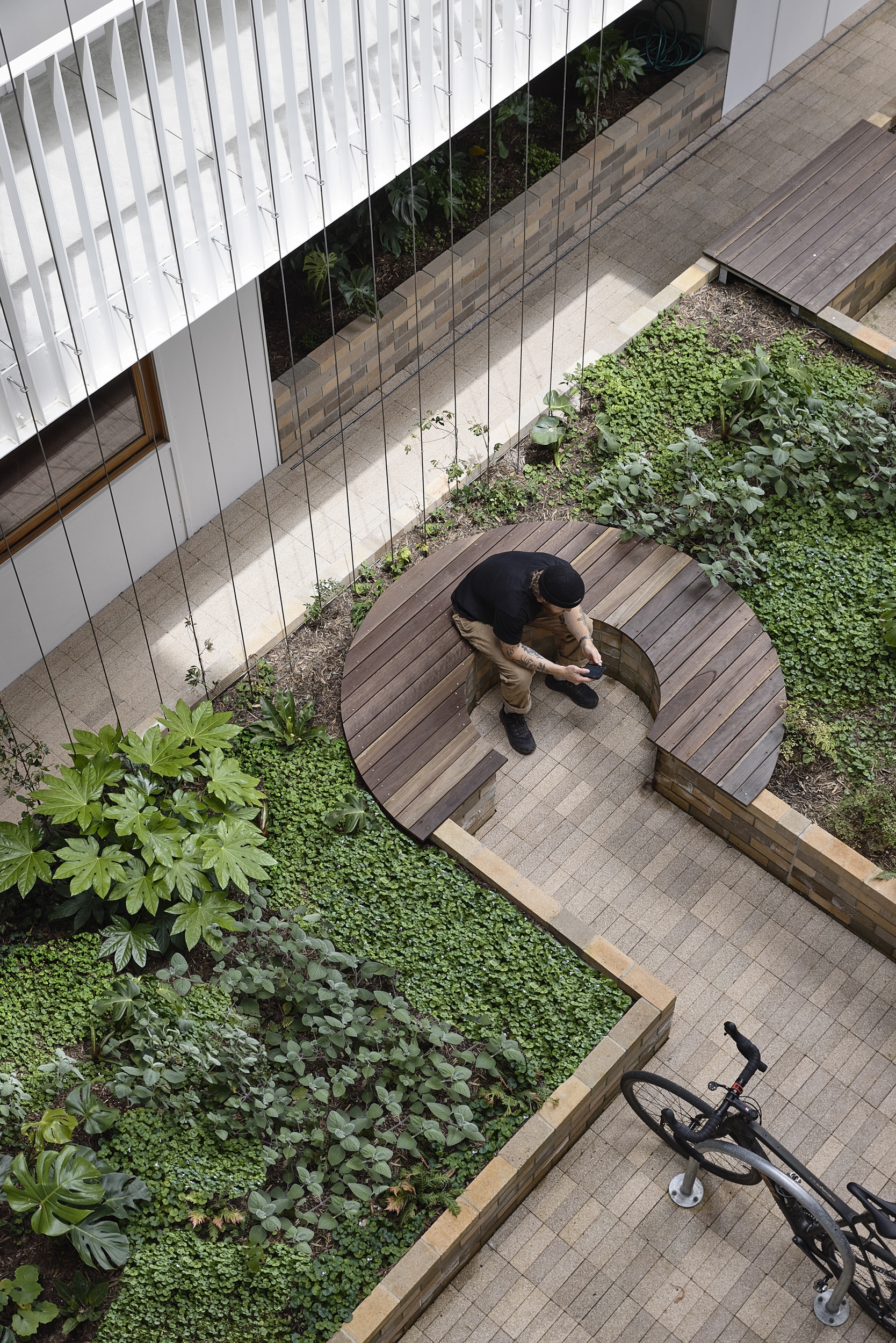 The project includes simple urban design gestures to activate the street. We took the power lines underground, carved out a generous, semi-public courtyard, planted a significant tree to throw shade over the footpath and built-in seats to improve the pedestrian experience.