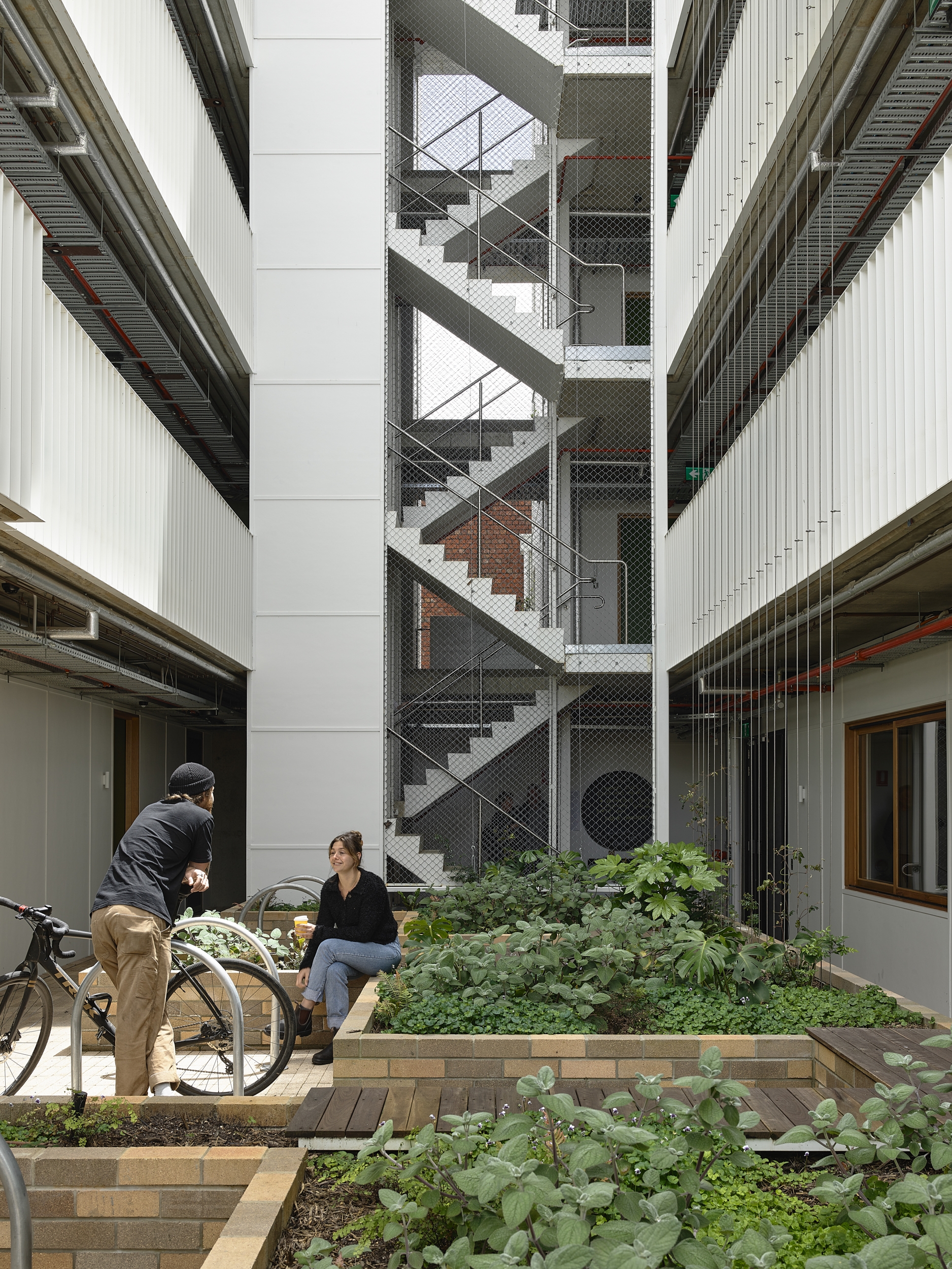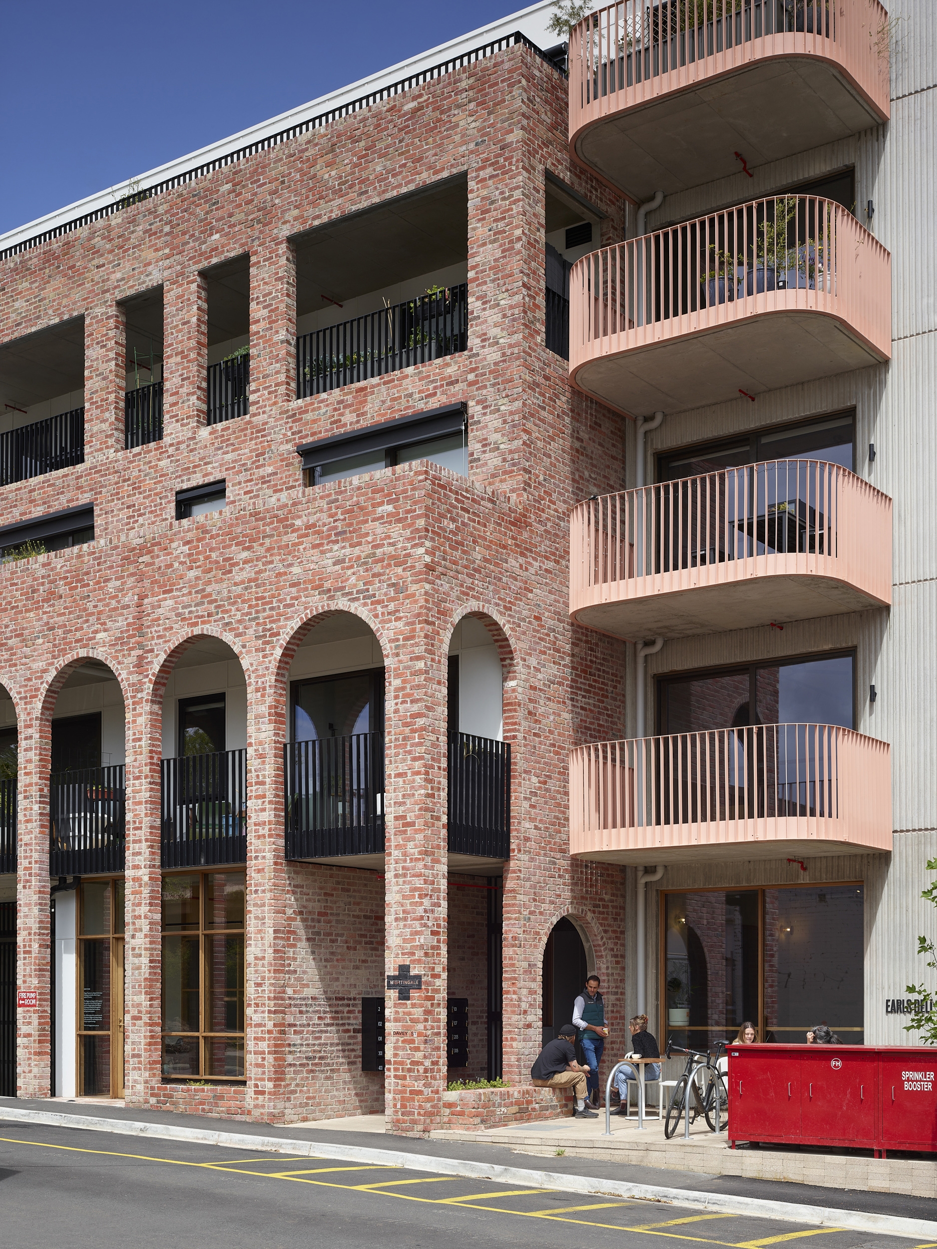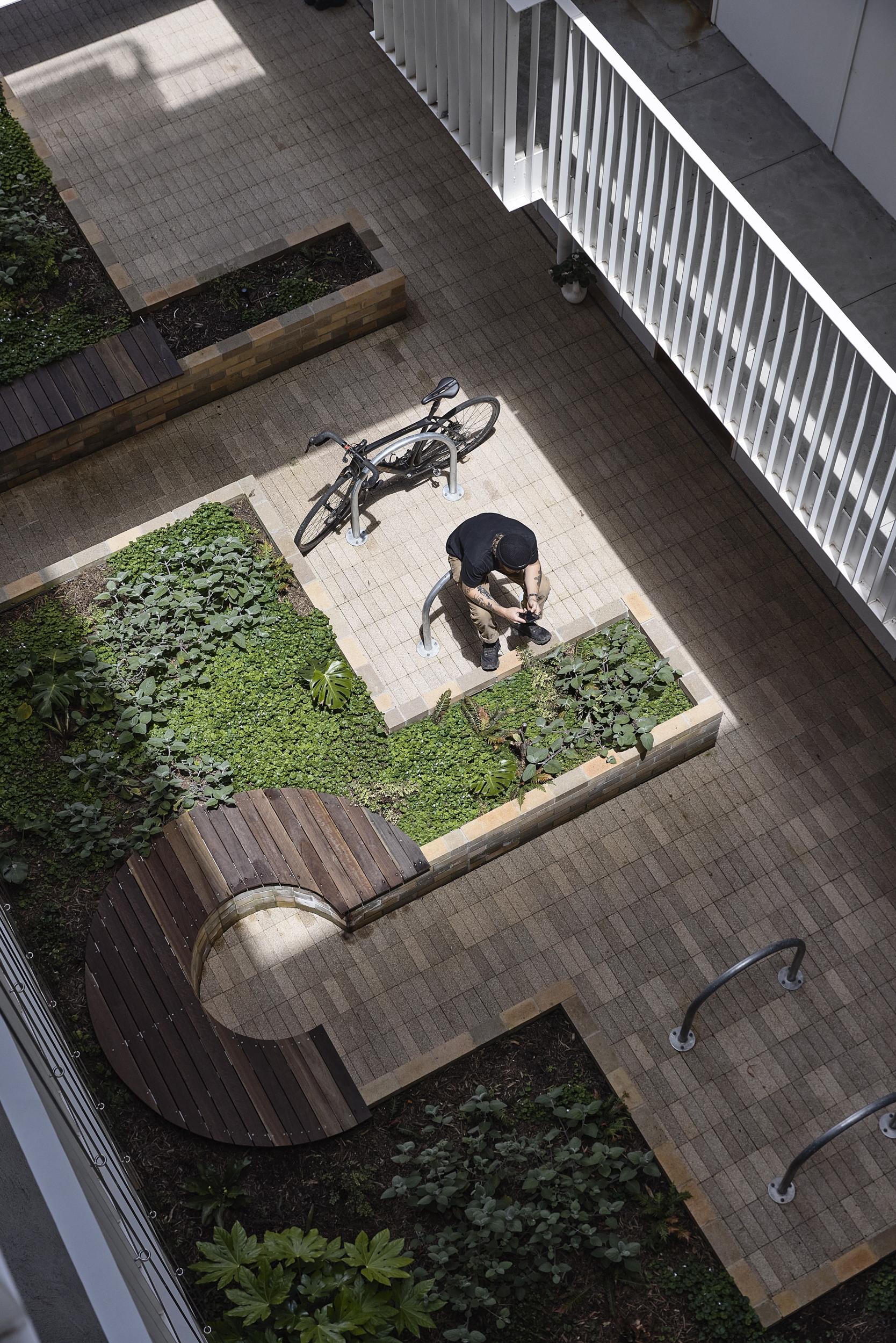 A stunning arched facade, created from locally sourced recycled red brick forms part of the active street frontage that gives back to the broader community created by the downstairs cafe, deep root planting, and lush open courtyard. The building exeeds 8 star NatHERS rating and each home is cross-ventilated with access to open-air walkways and operable windows. Importantly, 20% of apartments are allocated to Housing Choices Australia to provide safe, secure, housing to those most in need.