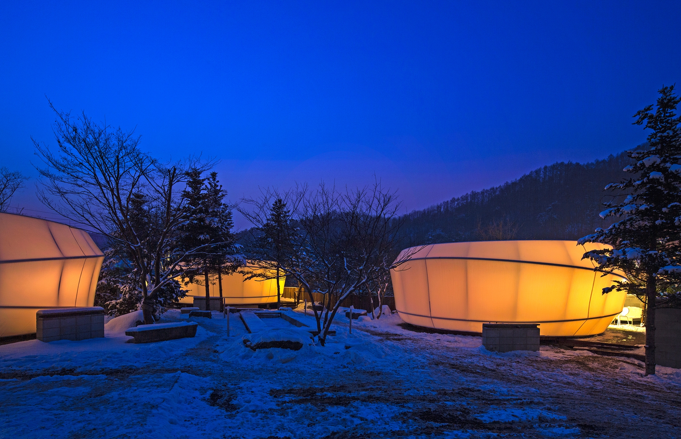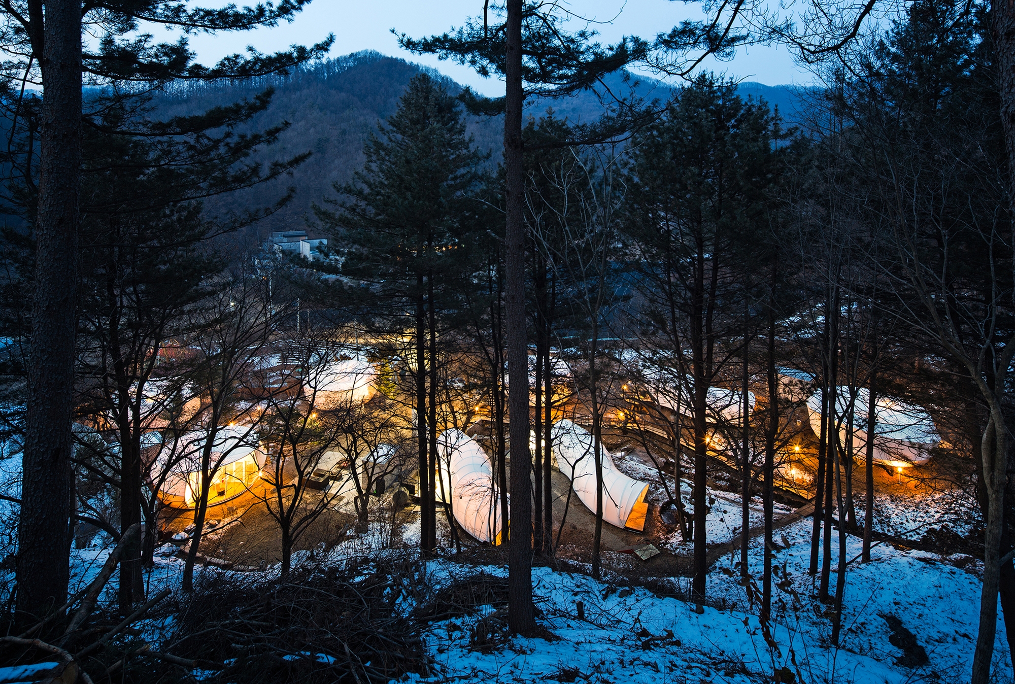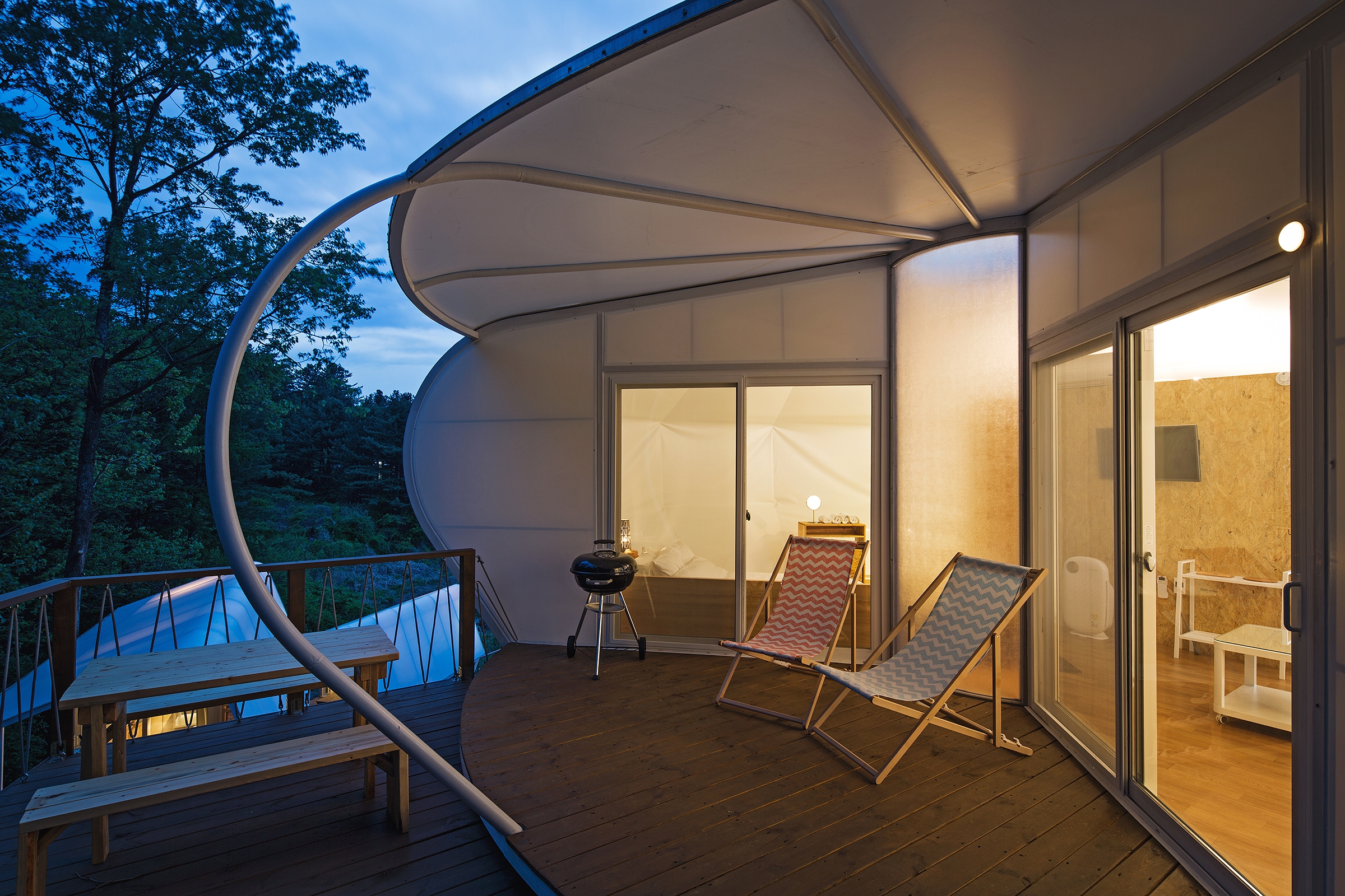 The word 'Glamping' was introduced over 20 years ago in Korea but its meaning was misappropriated in terms of its quality. Instead of glamorous camping, poor quality tents were installed and profiteered. We came to a mind of creating Glamping, which gives people chances to experience the nature even closer, while providing place to experience uniquely designed architecture and comforts. A place, where nature, ecological values, comfort and modern design are equally balanced. This concept led to the creation of Glamping Architecture in Korea.