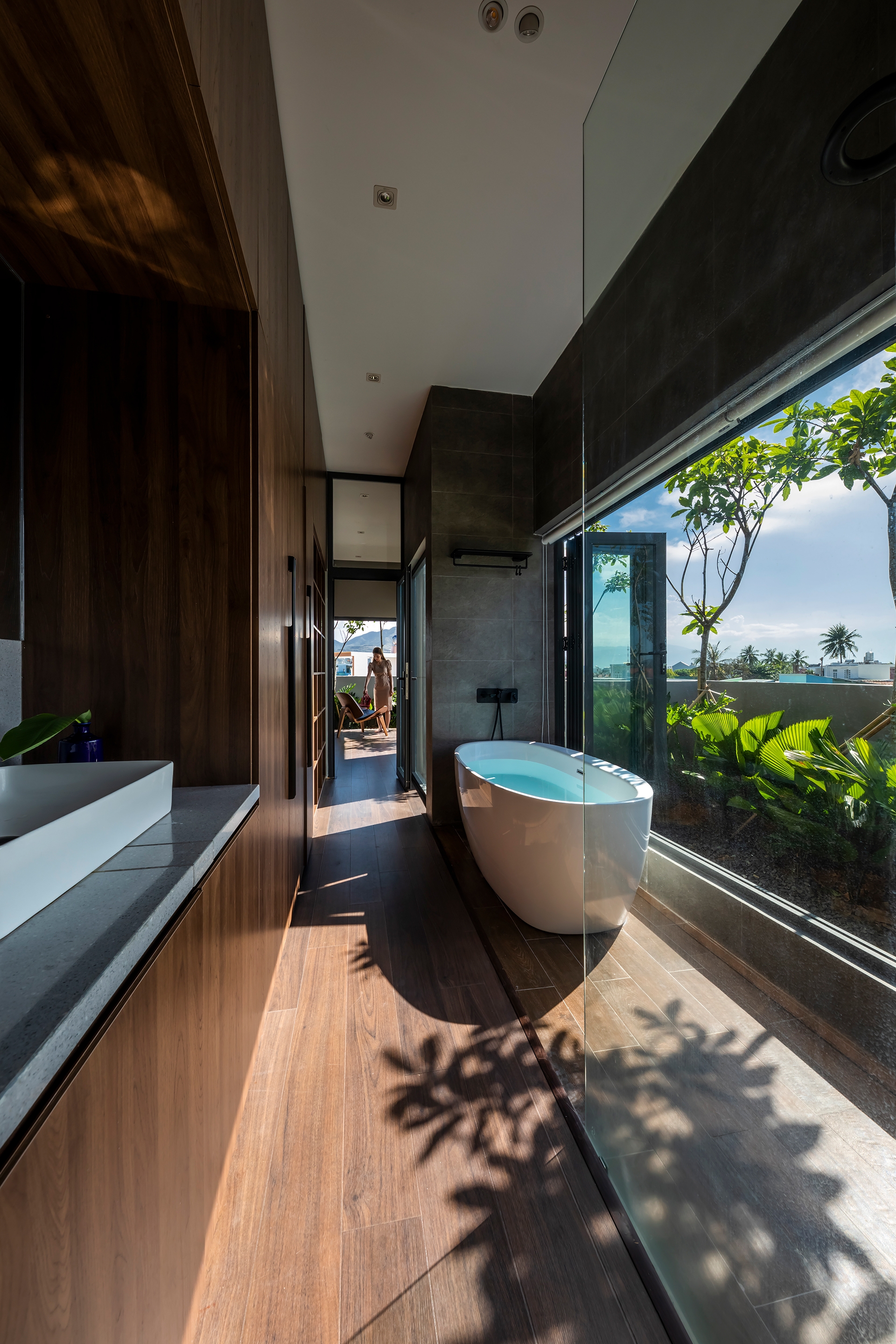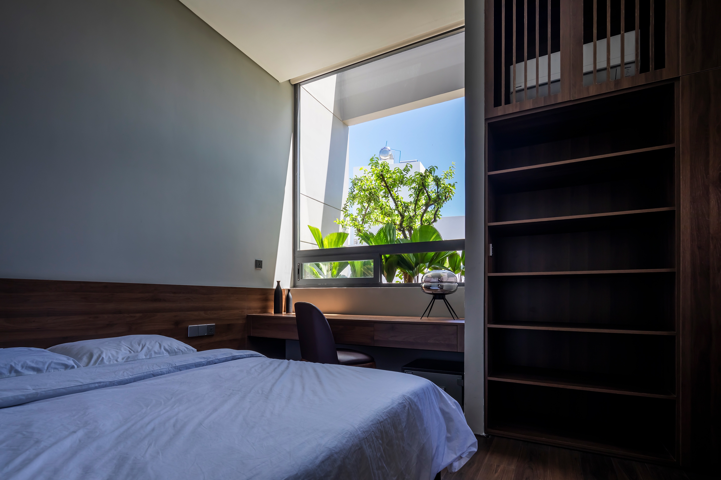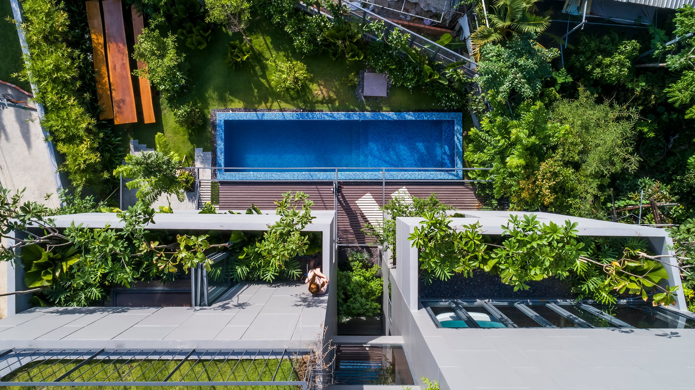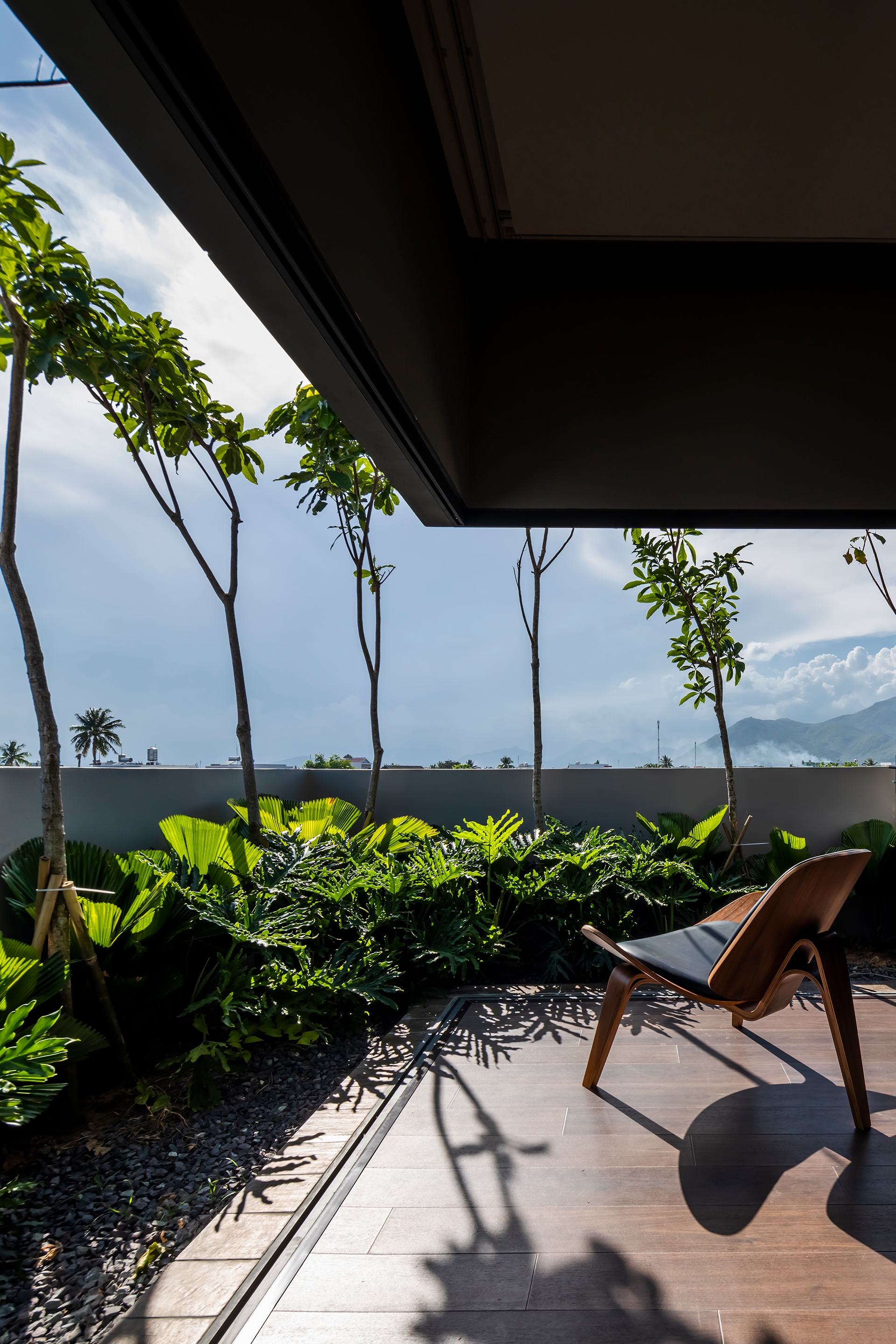 Bi House Nha Trang is located in a rapidly developing suburb with increasing population where intense concrete construction is shrinking vegetation and natural green spaces. Keep in mind the spirit of Green Architecture, Bi House Nha Trang design brings a sustainable resort space and nature to the house and contributes to counteract the impact of humankind on the planet. Built on an area of 80 m2, Bi House does return as much the natural green space by vertical green patches weaving and rearranging throughout the building. This helps create a natural shield against heat, noise and dust as well as give the house a different appearance from the outside.