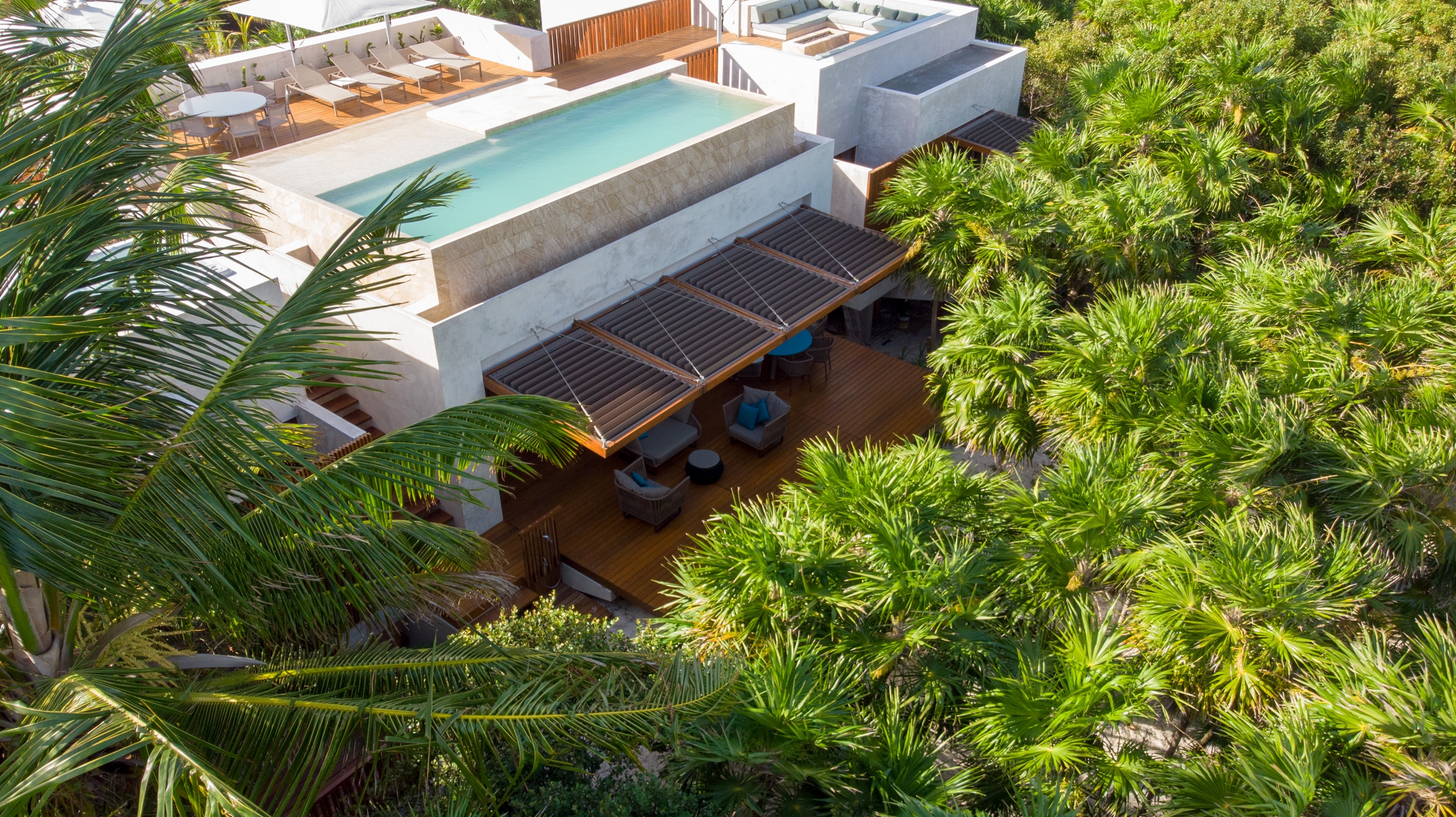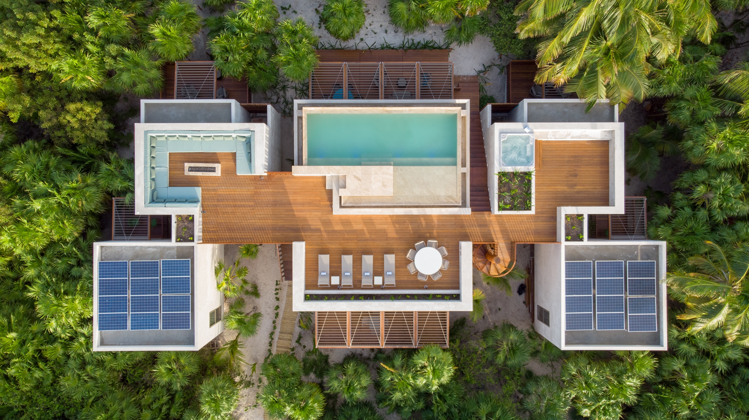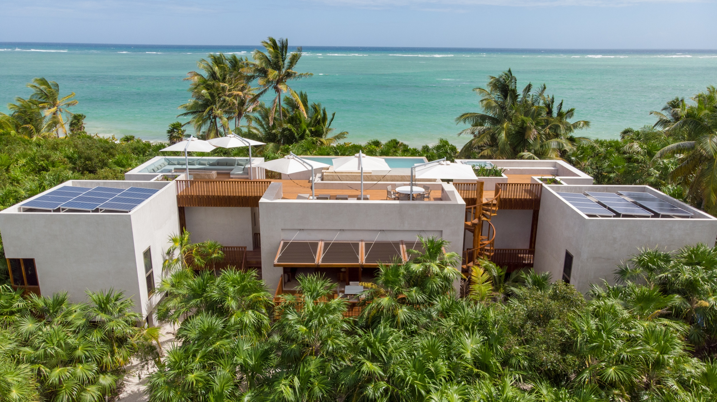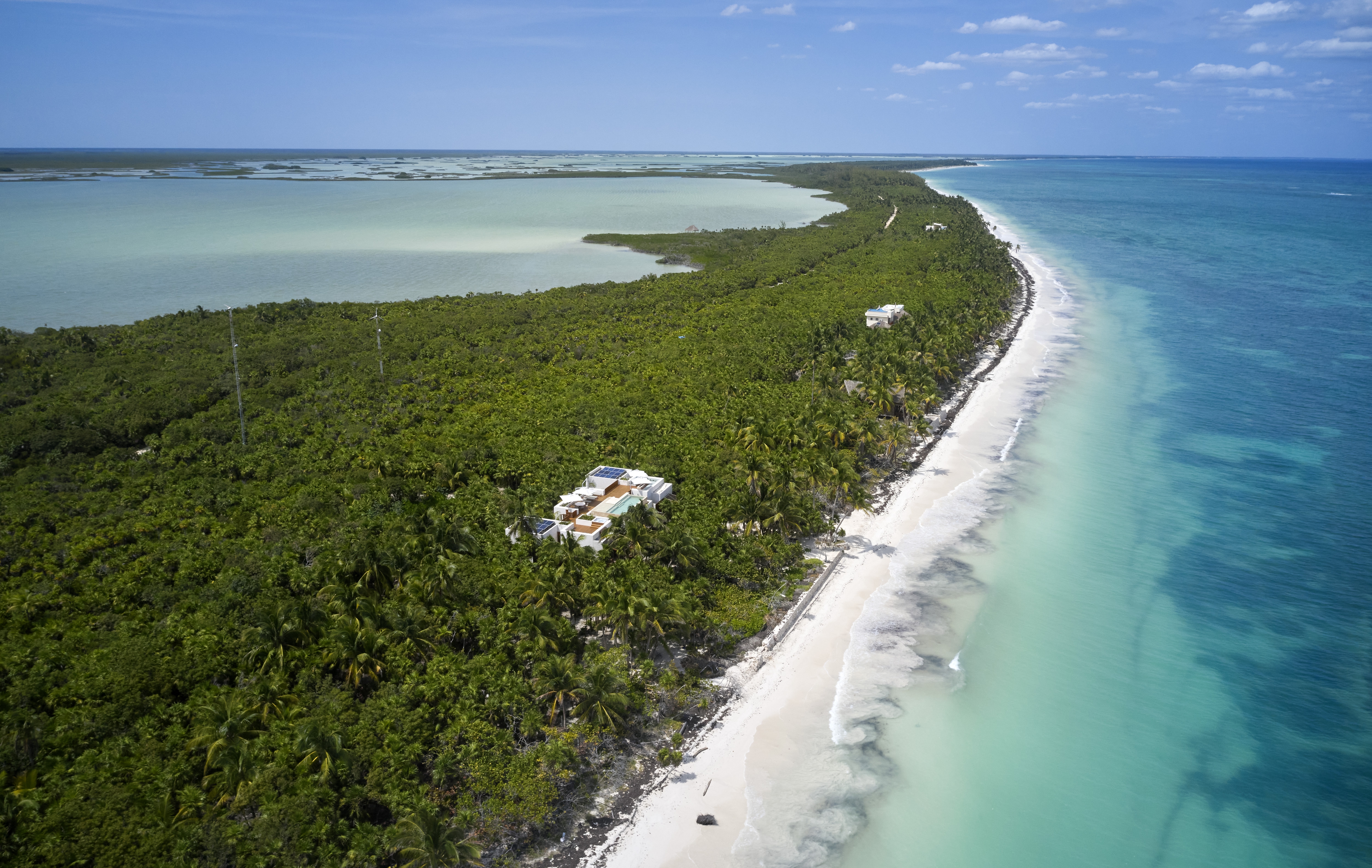Nestled amidst the lush tranquility of Sian Ka'an Reserve lies Casa Uh K'aay, a beach retreat of grandeur and grace. Designed to embody high-end hospitality, its symmetry invites one to bask in the comfort of two master and two junior suites that sit gracefully either side of a central living abode. Raised aloft amidst the rustling palms and tropical trees, this haven seems to float upon the gentle sea breeze. Decks of wooden majesty stretch forth from each room, inviting one to fully immerse in the lush vegetation that surrounds. A rooftop terrace of breathtaking beauty awaits, offering views unrivaled - of the sea, jungle and the estuary that lies beyond. In adherence with the strict, low-density regulations, this property spans 2 hectares with a mere 400 sq mts of construction and 100 meters of beachfront. As the Reserve lies untouched by the conveniences of electricity and fresh water, the dwelling was crafted with self-sustenance in mind. Solar panels and wind turbines generate power, stored in a battery bank for use, while rainwater from the roof is captured and stored in tanks below. A harmonious blend of luxury and eco-consciousness, Casa Uh K'aay is a true gem.