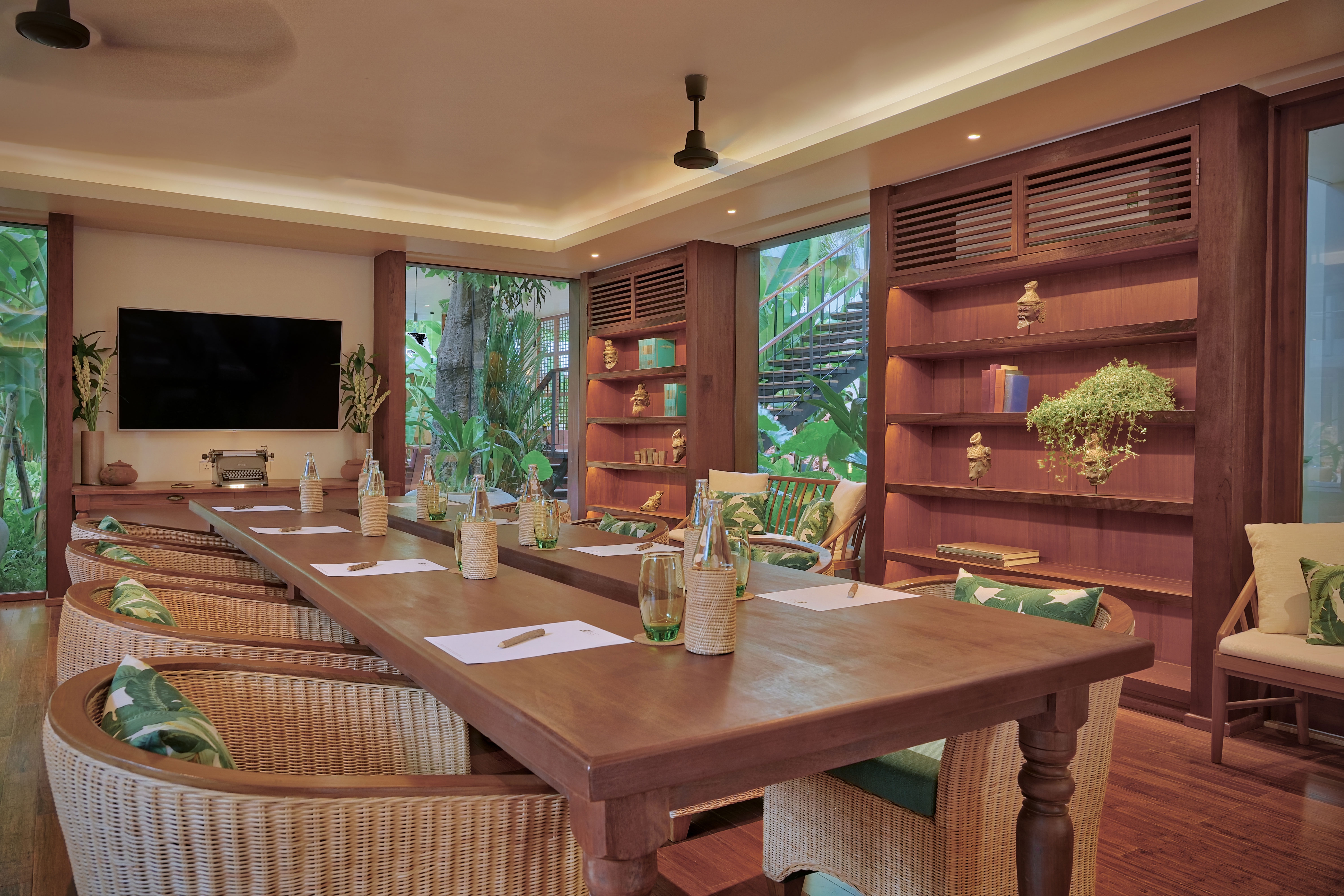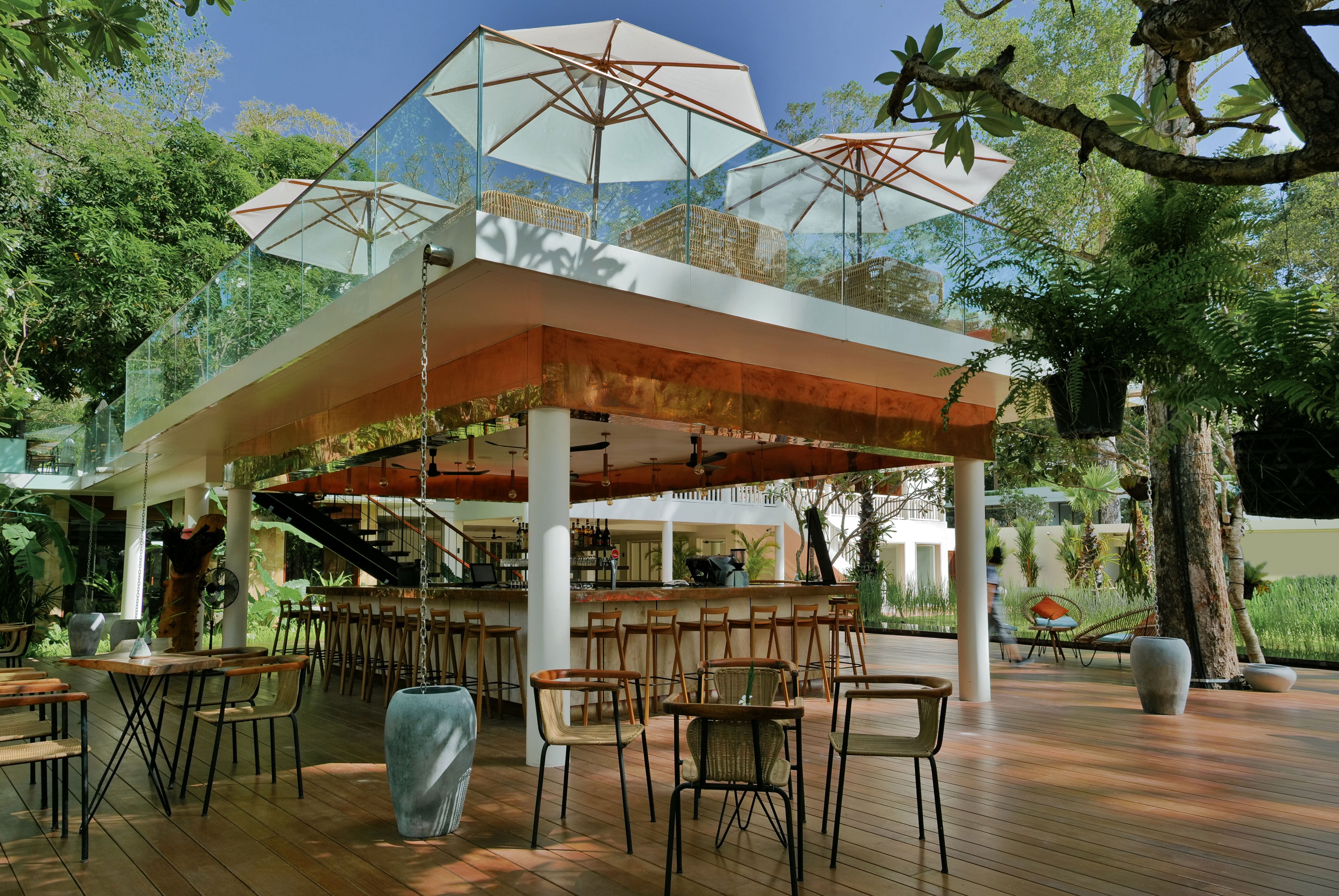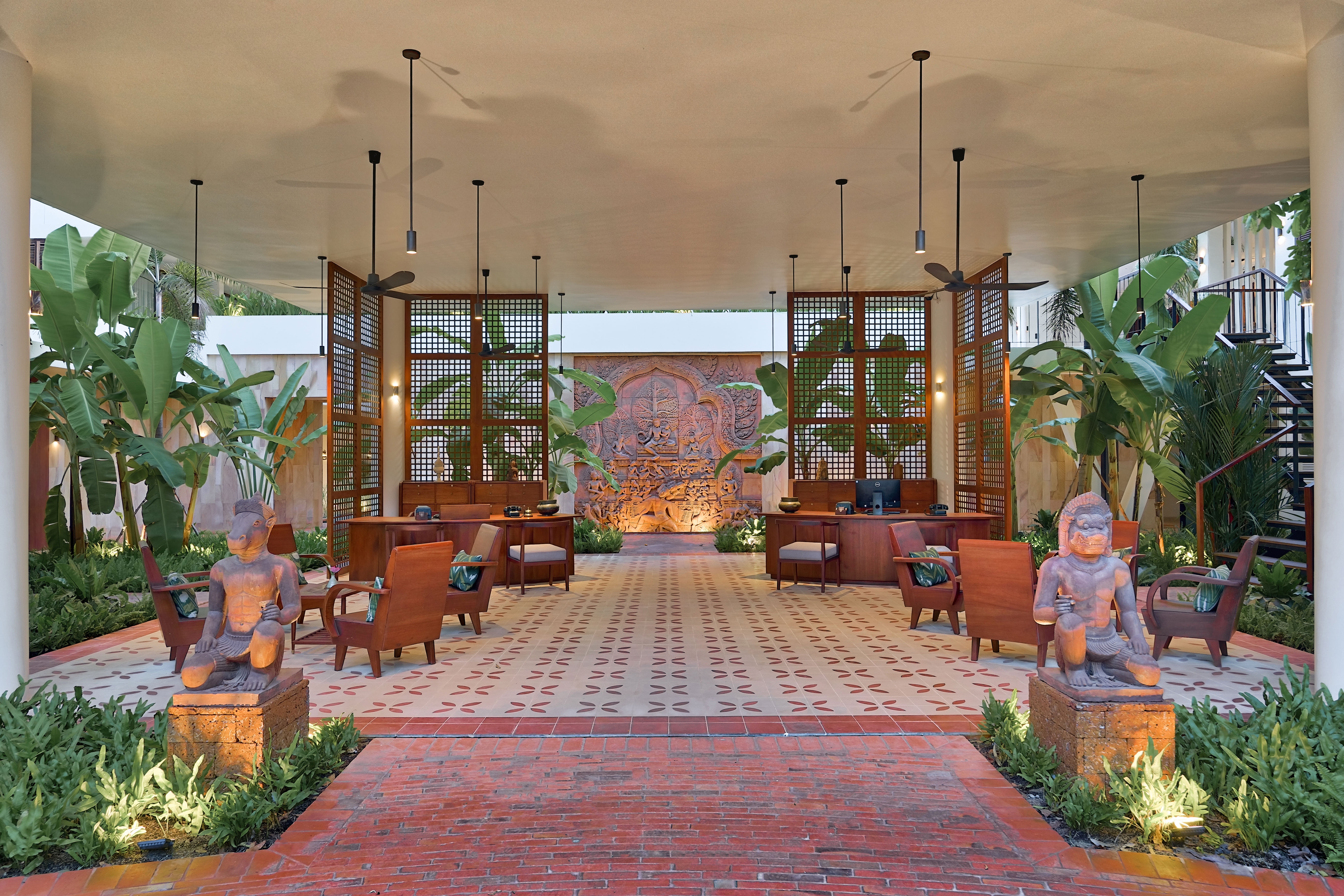 Founded on the warmth and comradery of the globetrotting story seeker, the property is centered around an elegant historic building which has been deeply embedded in the local community since 2003. Surrounded by sacred, centuries-old trees and lush tropical flora, the hotel now houses 80 well-appointed, modern rooms accented with thoughtful Khmer touches. From artisanal textiles and handwoven rattan baskets to bespoke furnishings as well as a marble-tiled pool, holistic spa, charming Bibliotheque for meetings, the property offers an oasis annex in the heart of Siem Reap, where the perpetual scent of lemongrass wafts through the air. Mere steps from the Royal Independence Gardens and Royal Residence, guests are enchanted by natural surroundings, sandstone cladded walls, copper and wood mirroring natural materials, sustainable raintree wood furniture, bamboo wooden floors. Upon arrival guests pass over a small floating bridge which mirrors Angkor Wat as well as the low laterite wall with lemongrass surrounding the property of lush gardens and large jungle trees.