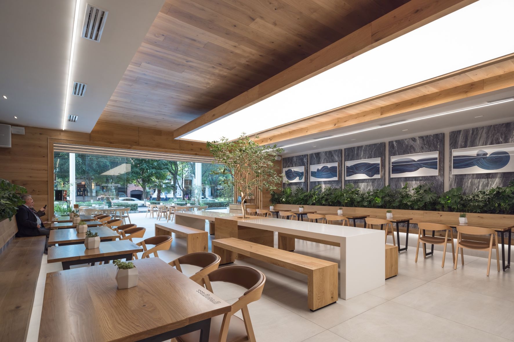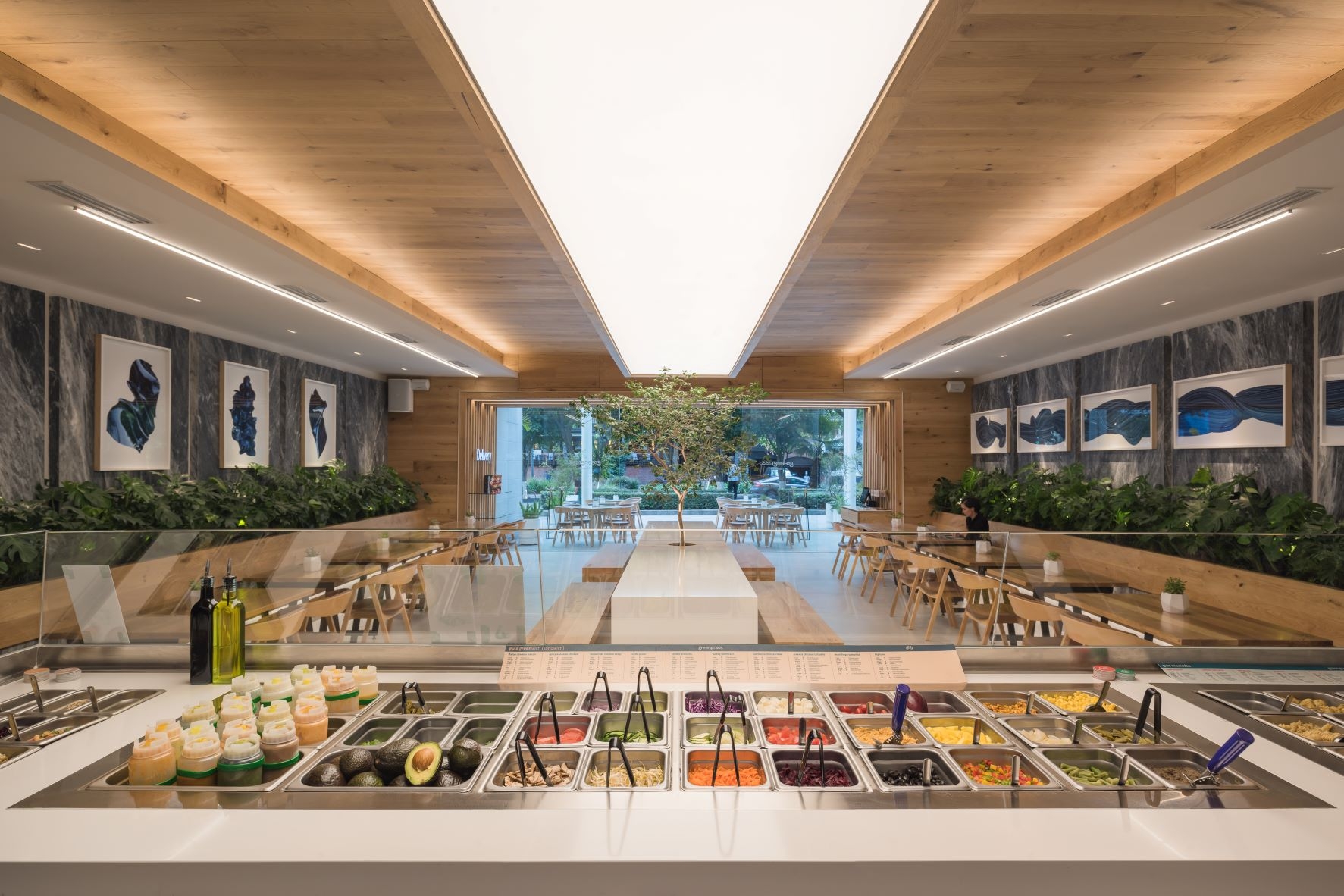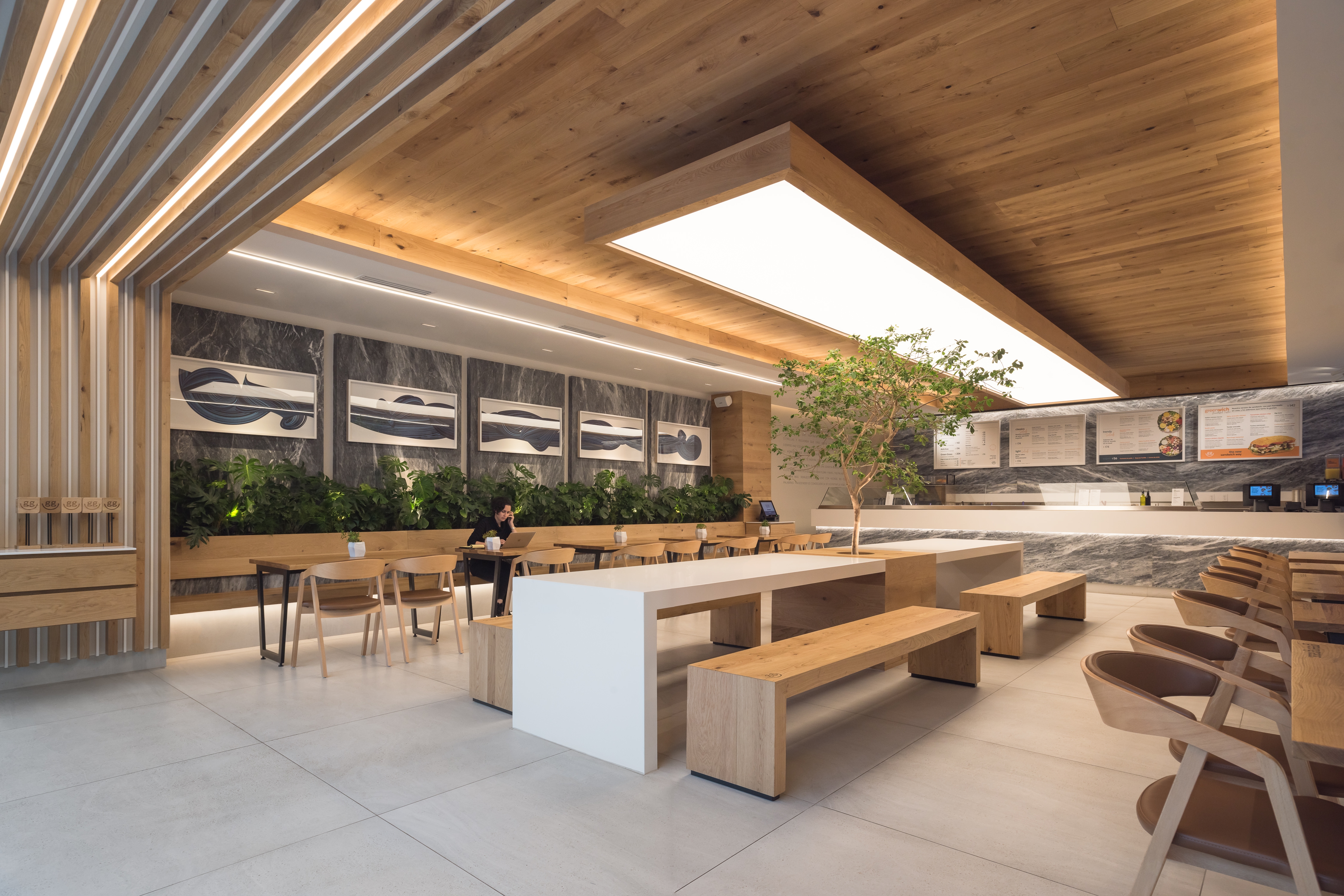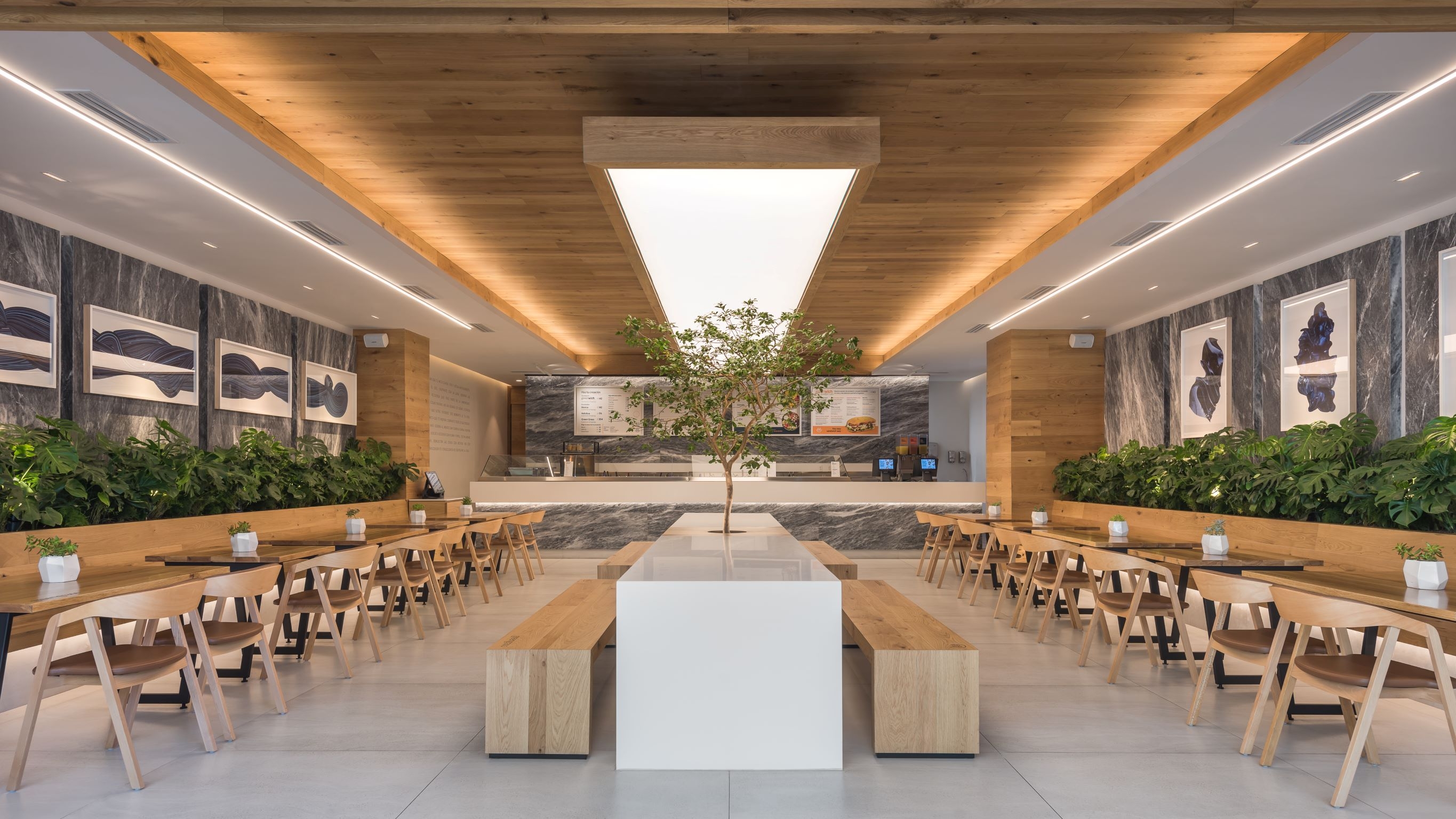 Our starting point was to create a palette of local materials, as if putting together a salad: representing the freshness and the authentic origin of the products. Using oak wood, amani marble, and colors that heightened the architectonic aspects of the location, like barrisol lighting and marble panels, which lodge art works.The restaurant's amani marble walls work as a linen cloth to promote local artists - part of the brand's proposal to approach the creative side of customers and build community - turning the premises into a live and constant-changing gallery.