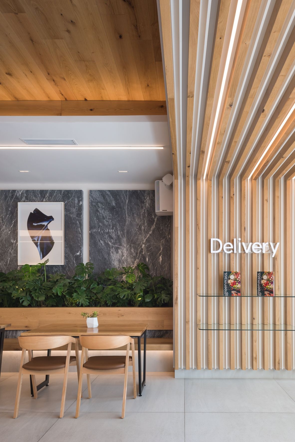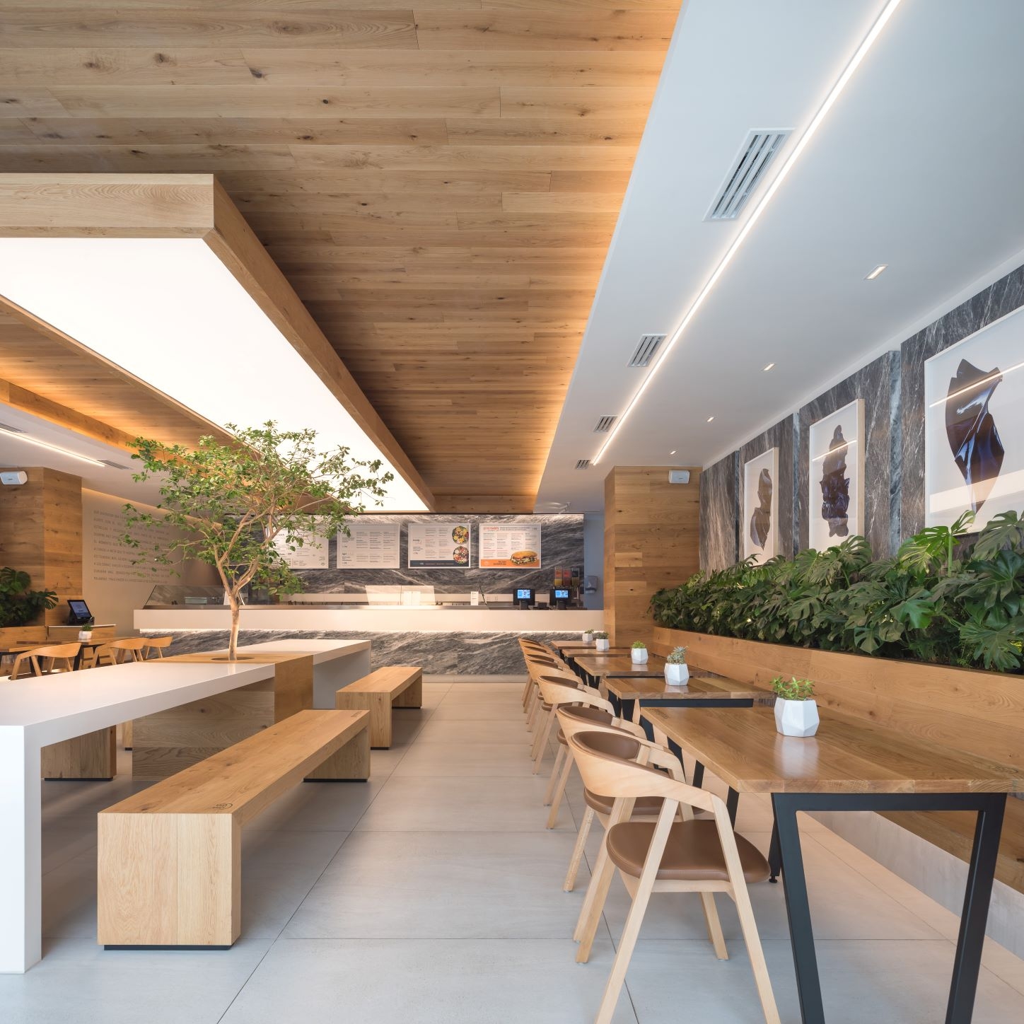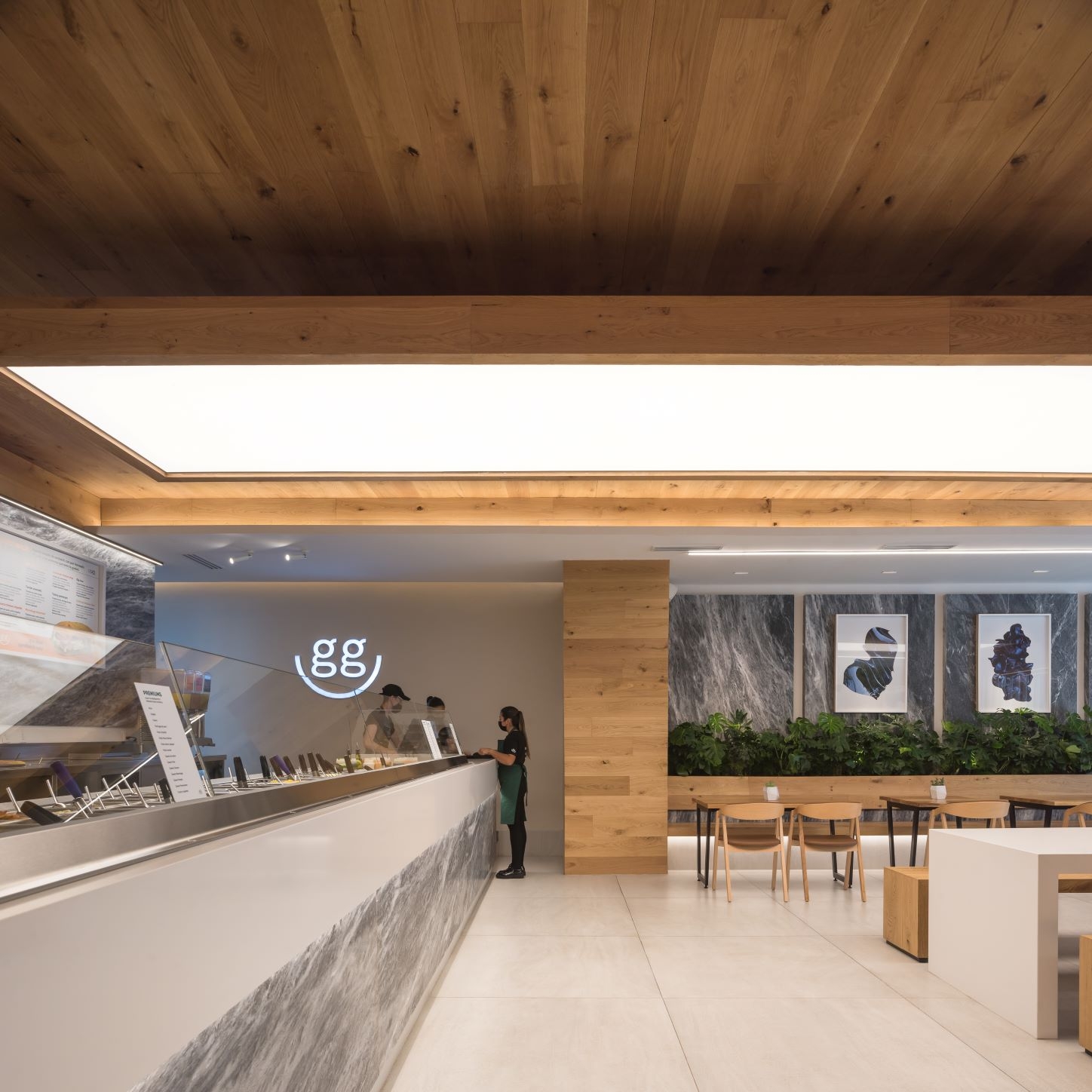 Our starting point was to create a palette of local materials, as if putting together a salad: representing the freshness and the authentic origin of the products. Using oak wood, amani marble, and colors that heightened the architectonic aspects of the location, like barrisol lighting and marble panels, which lodge art works.The restaurant's amani marble walls work as a linen cloth to promote local artists - part of the brand's proposal to approach the creative side of customers and build community - turning the premises into a live and constant-changing gallery.