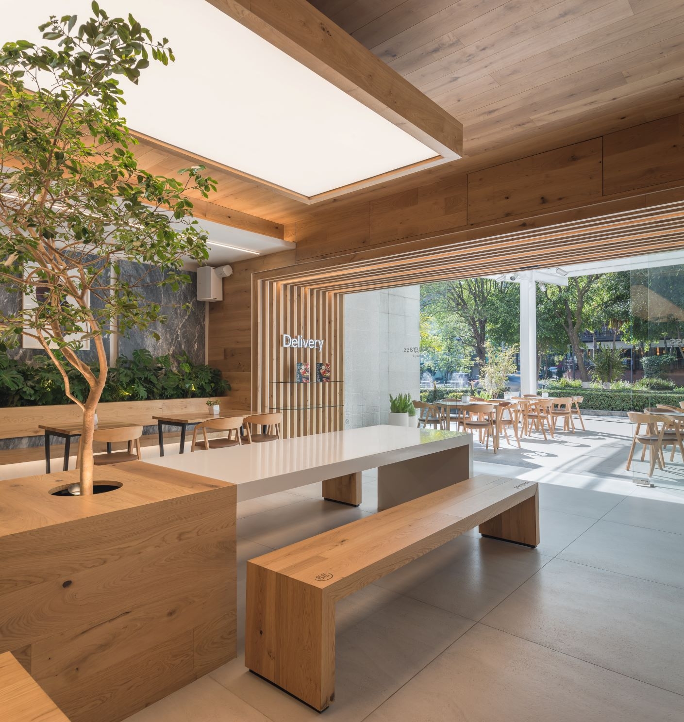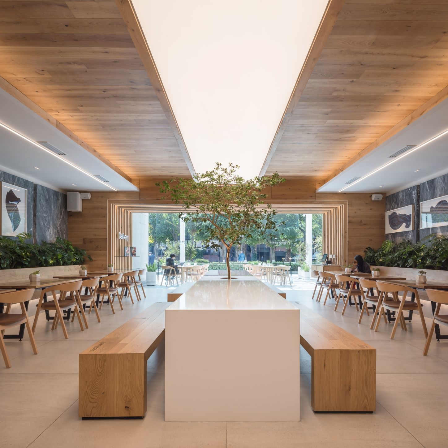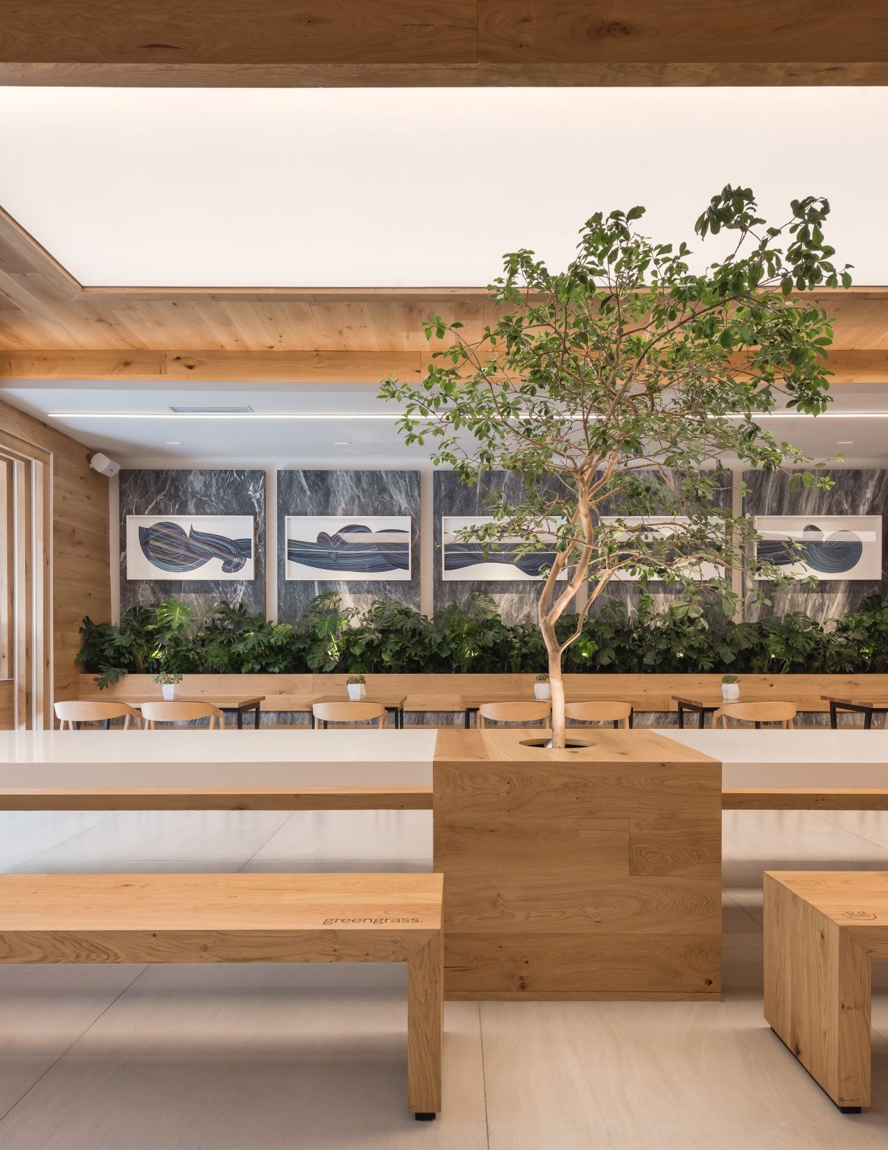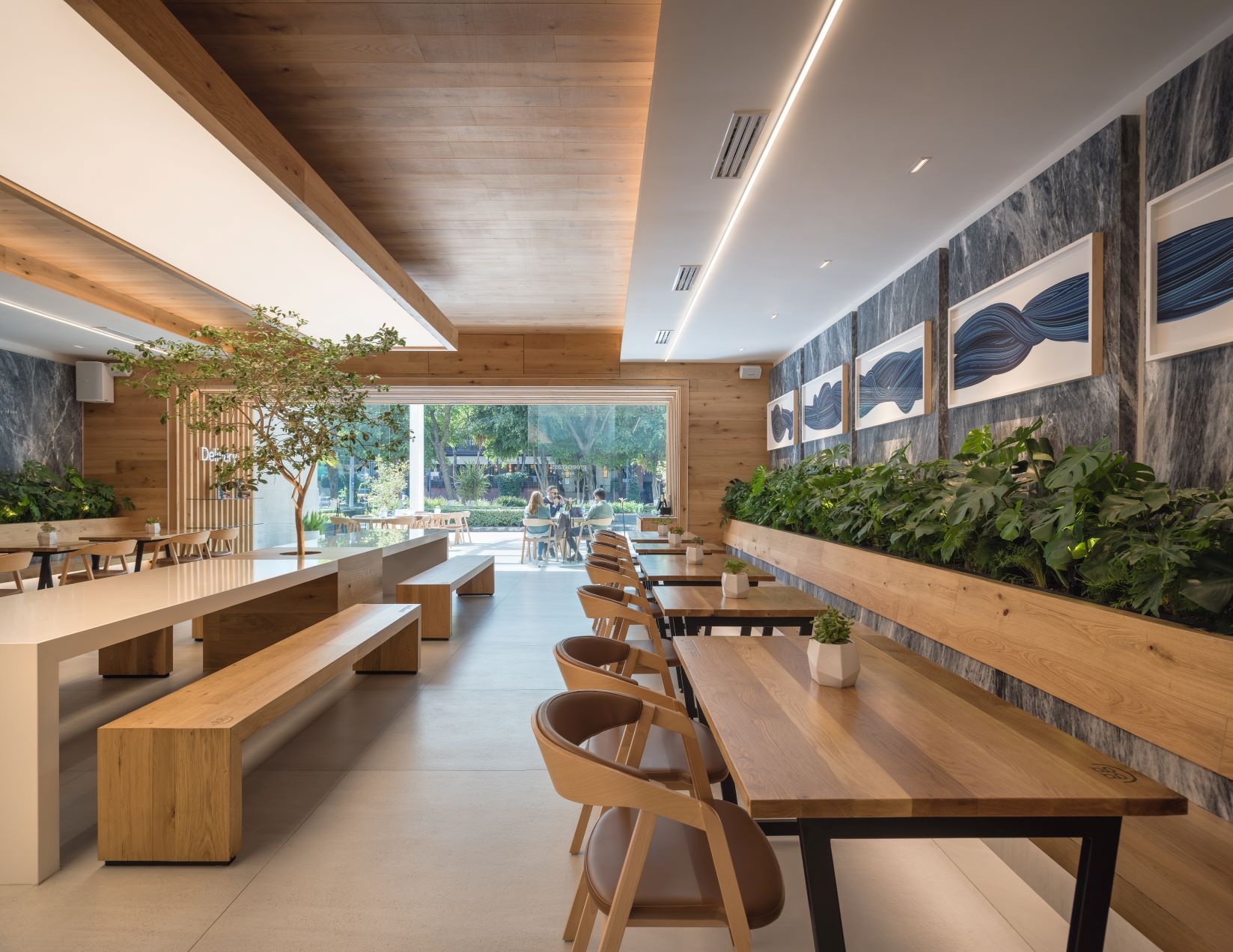 Our starting point was to create a palette of local materials, as if putting together a salad: representing the freshness and the authentic origin of the products. Using oak wood, amani marble, and colors that heightened the architectonic aspects of the location, like barrisol lighting and marble panels, which lodge art works.The restaurant's amani marble walls work as a linen cloth to promote local artists - part of the brand's proposal to approach the creative side of customers and build community - turning the premises into a live and constant-changing gallery.