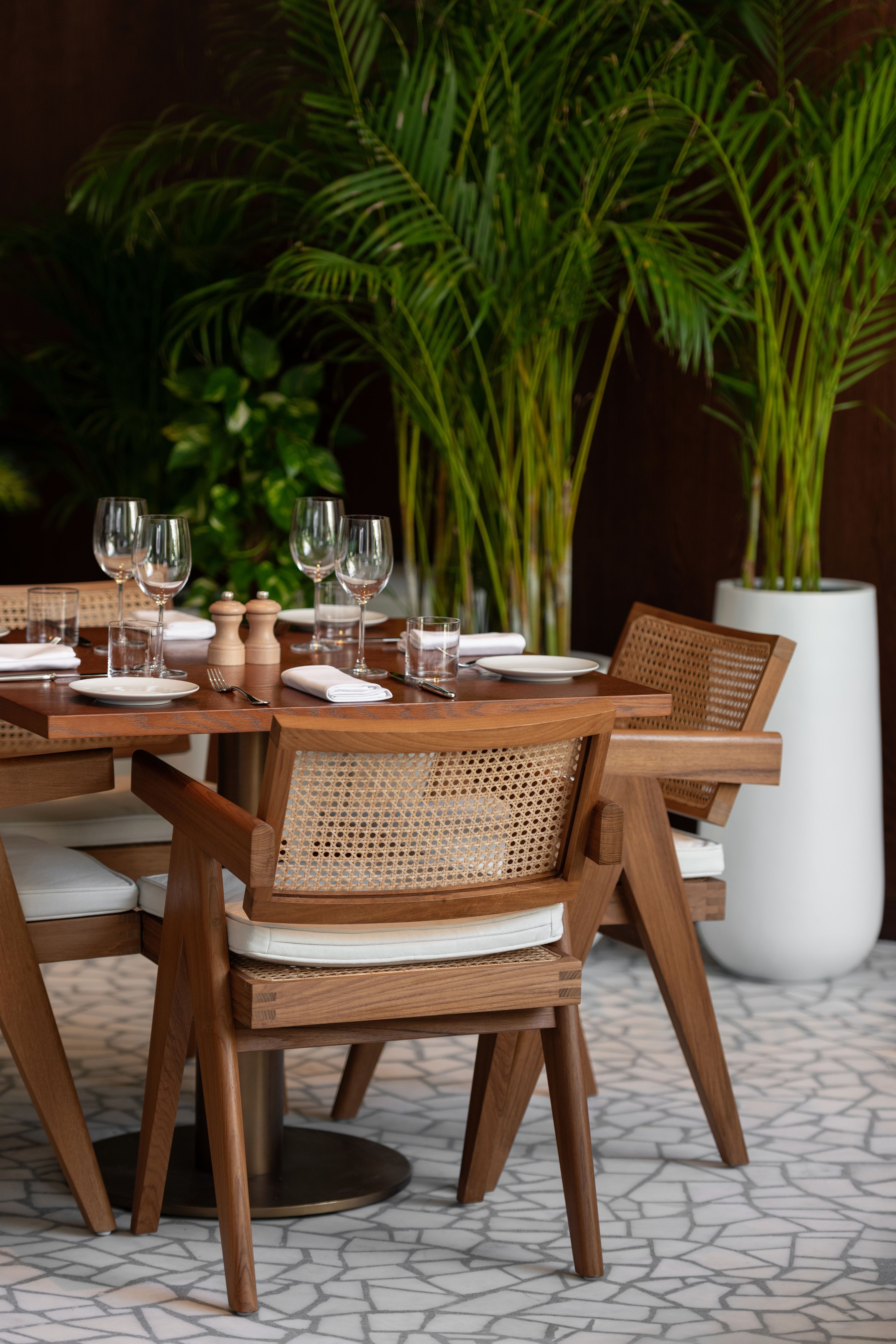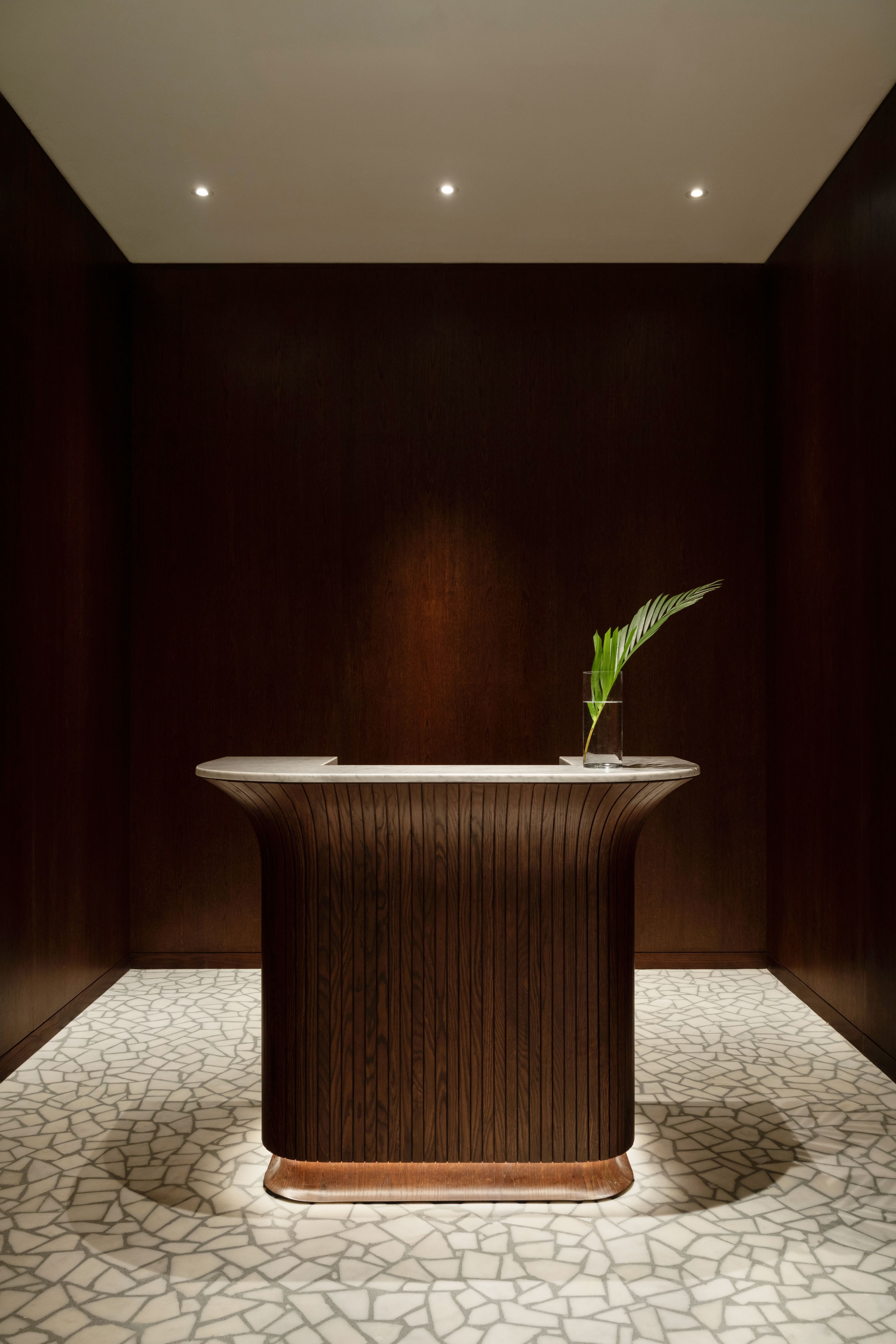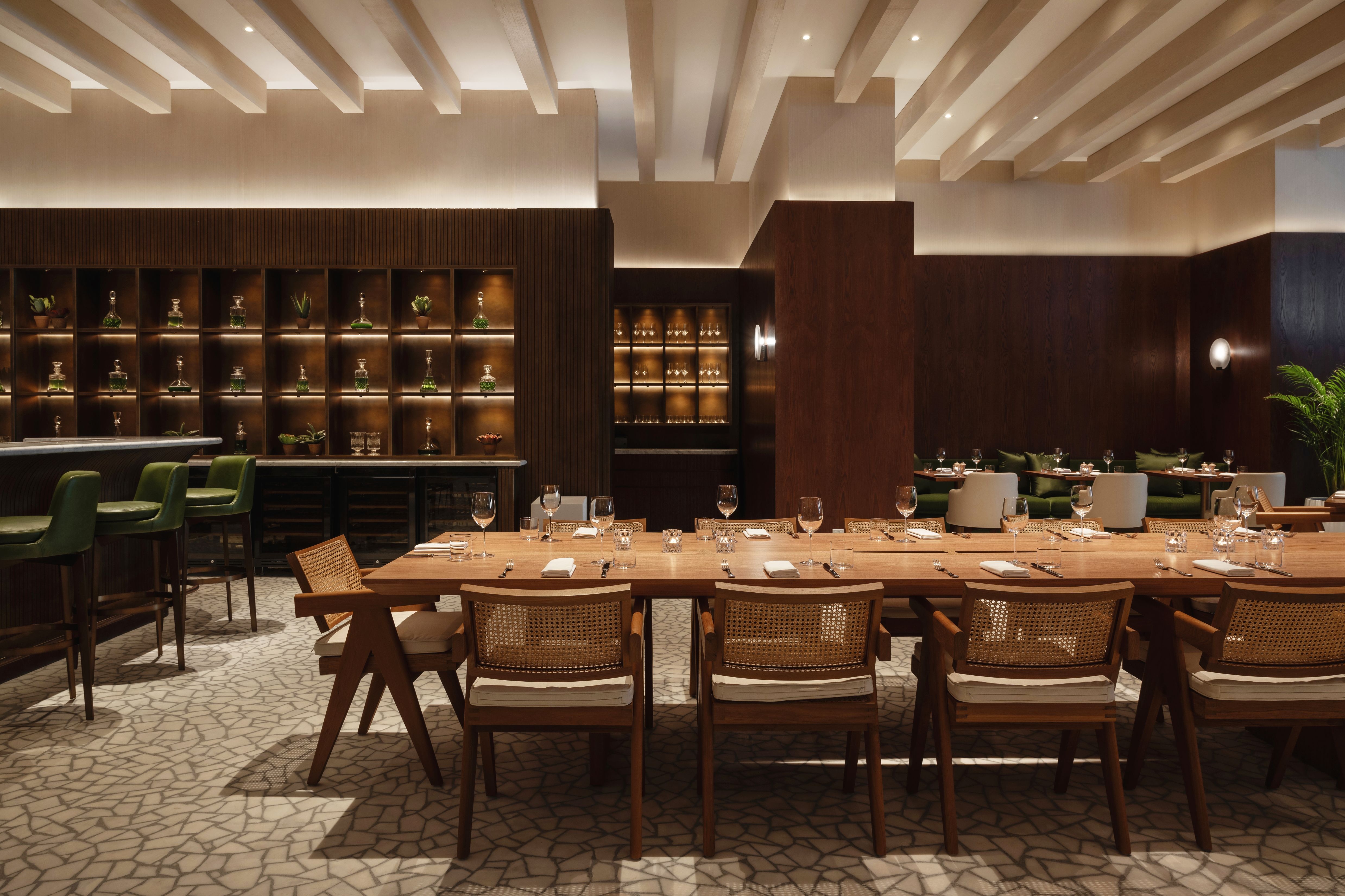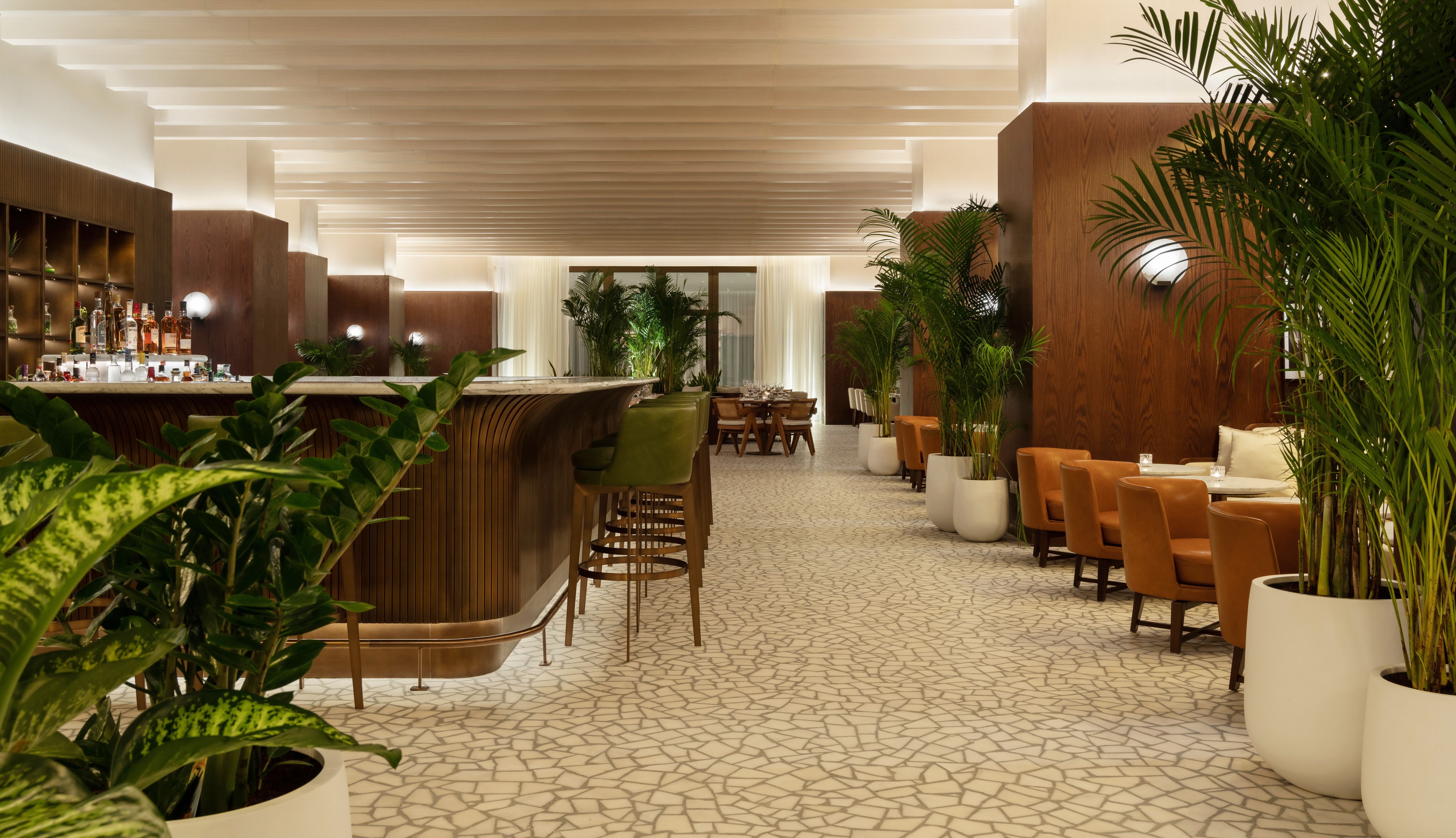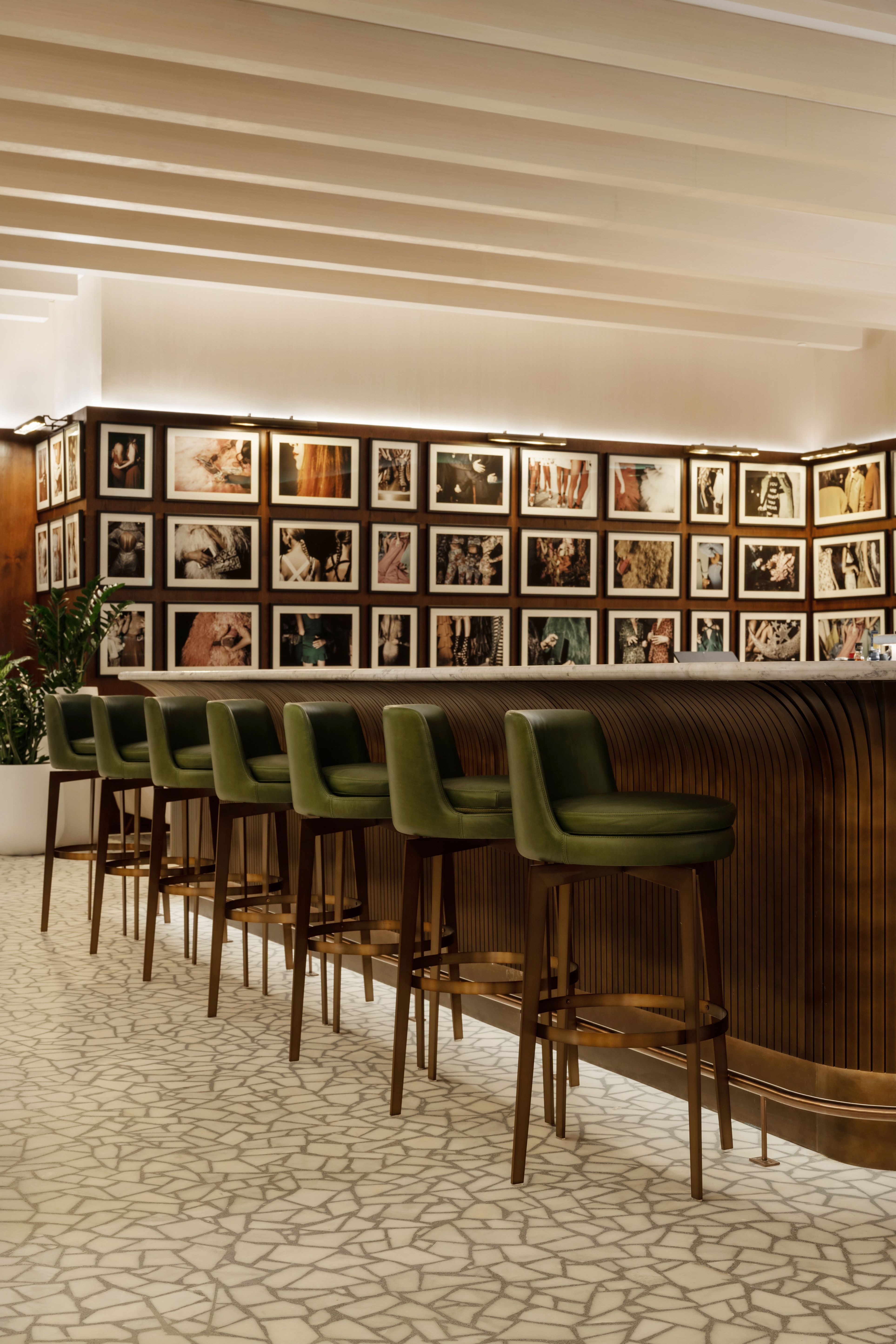 Jolie is located on the mezzanine floor with direct access to the iconic spiral staircase to the hotel lobby; Jolie offers an extraordinary French brasserie experience injected with unexpected moments of provocation. The restaurant is filled with natural, earthy tones from the bronze finishes, tan hide chairs, and raised olive green chairs lining the 'U' shaped bar. The bar has beautiful detailing with curved brass strips, so it feels like it's growing out of the floor like a palm. Behind the bar is a metal wall, a prominent design feature that glows with green liquid-filled decanters and is peppered with rustic succulents. It appears like a residential kitchen counter by day and a fully activated bar by night.