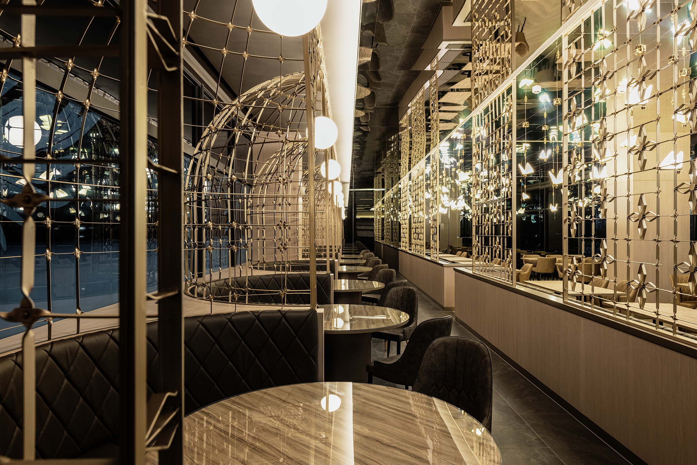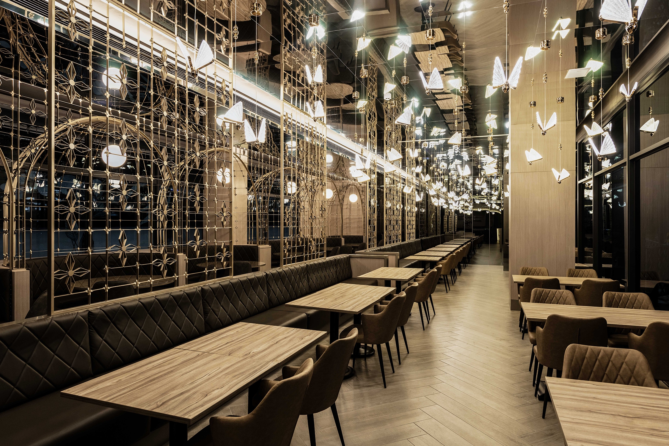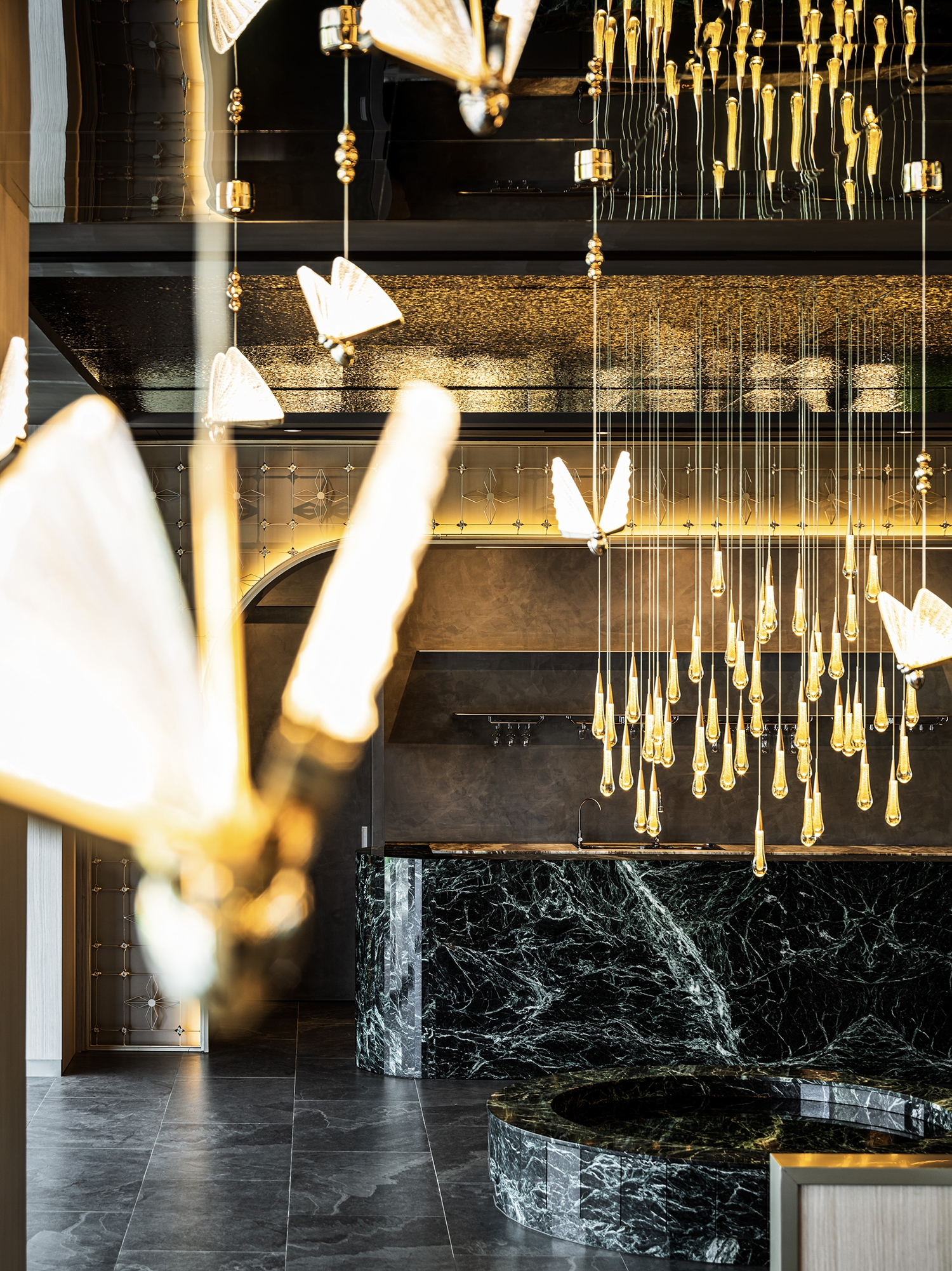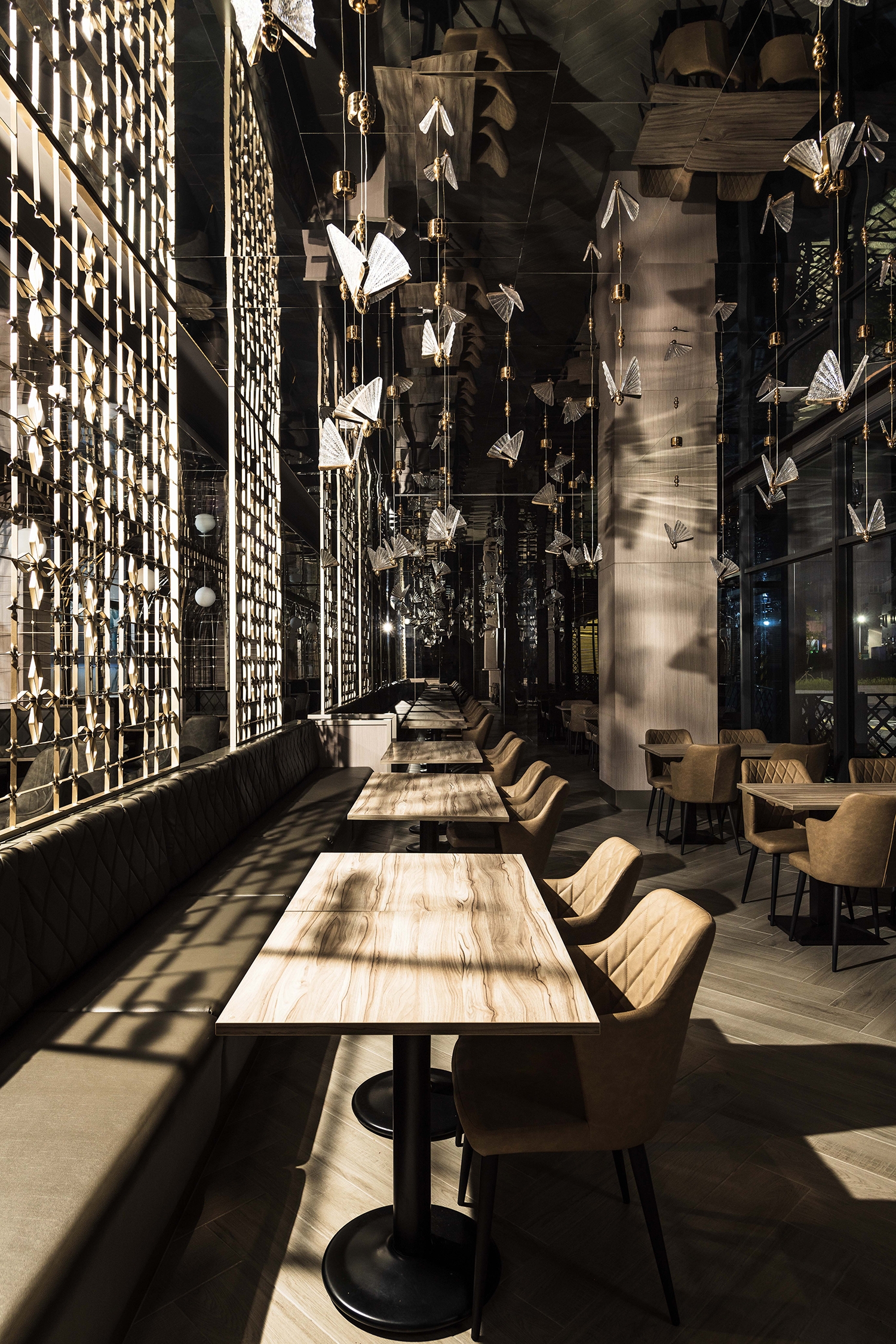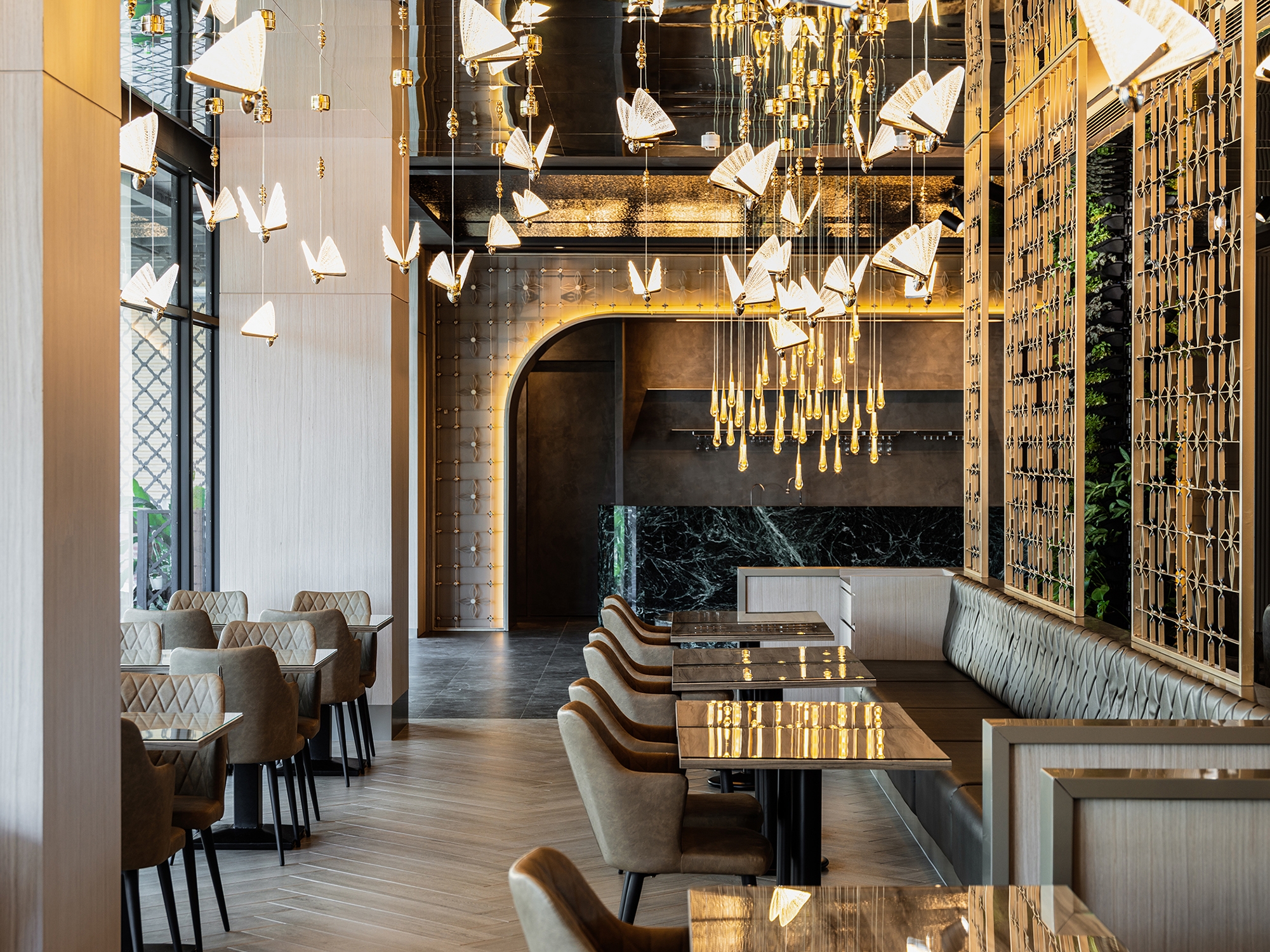 This project is a restaurant and bar on the first floor of a new building in downtown Tainan. The space design combines the unique food culture elements of Western restaurants and bars with the profound local artistic and cultural situation in Tainan, creating a dining environment that is exquisite, gorgeous and full of modern atmosphere. The restaurant takes "Flying Flowers and Dancing Butterflies" as the main idea of interior design, transforming the imprint of butterflies that are fluttering and freely traversing the flowers into the space. Through imitation and transformation, the figurative elements are implemented in the dining memory, having a wonderful time with your five senses.