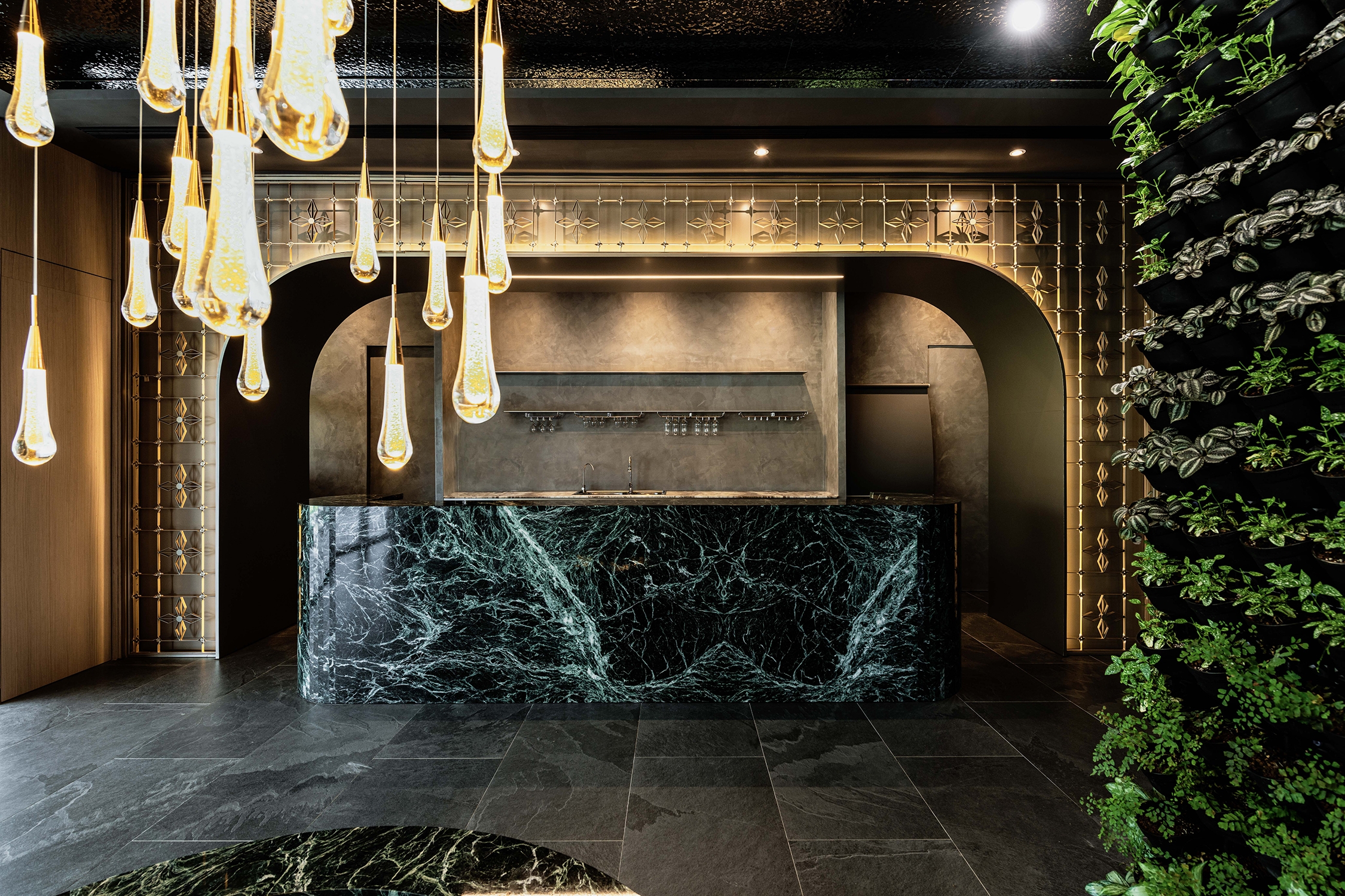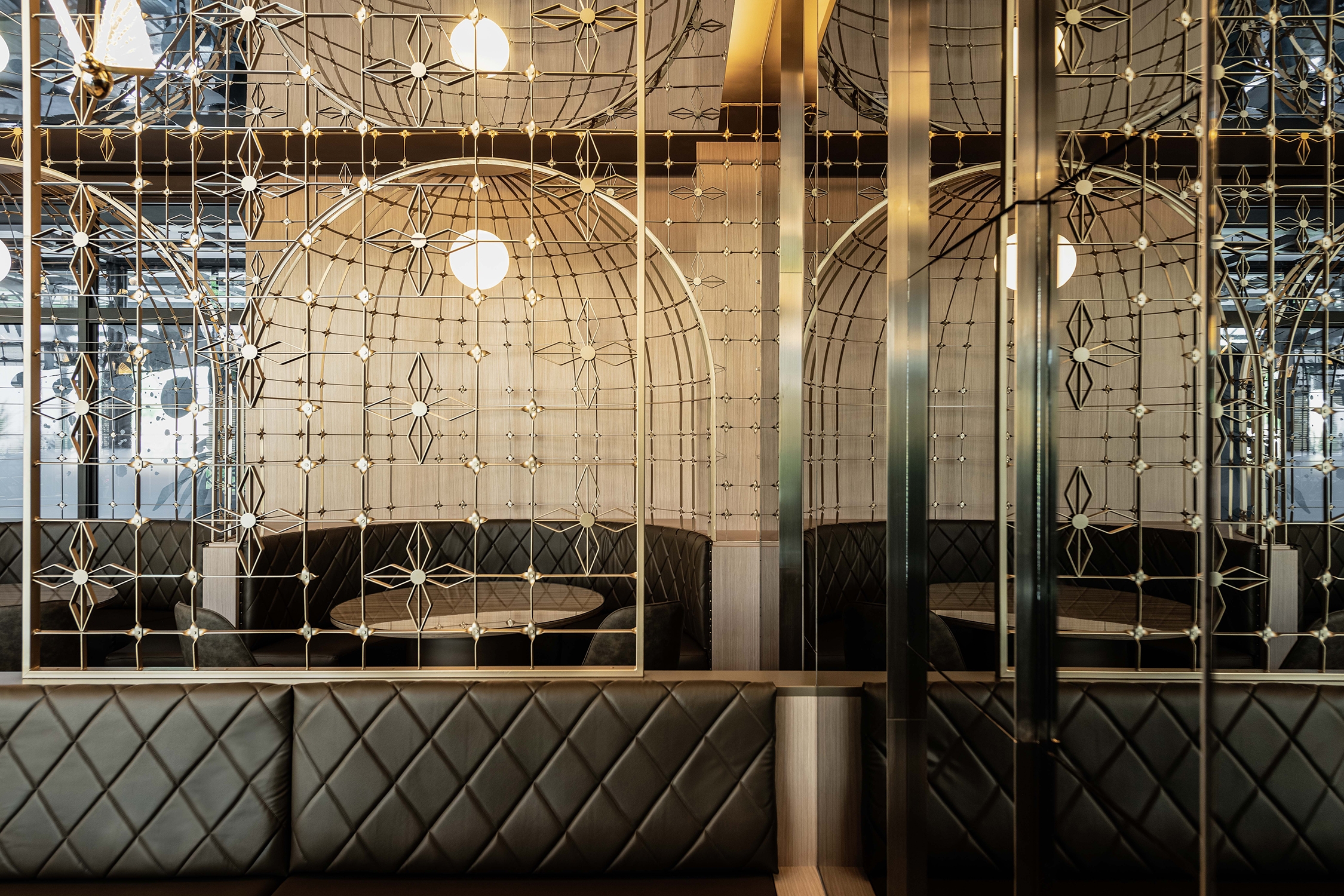 The designer took inspiration from the "Window gratings culture" that prevailed in Tainan since the 1960s and used the unique forging patterns as an essential element of the space. From the wall in the hall, the screen in the dining area, to the back wall of the semi-circular open area, there are many window gratings in gold.