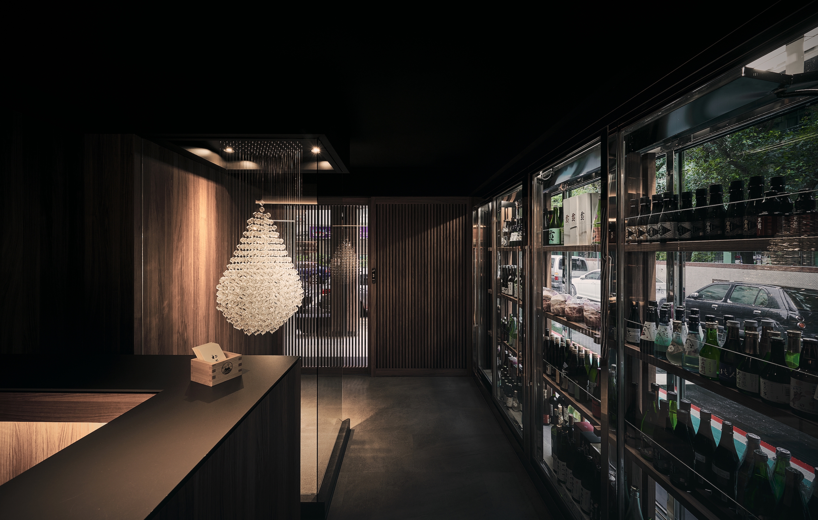On the exterior, the wall adjacent to the street is embedded with glass sake coolers, which attracts the attention of passersby.