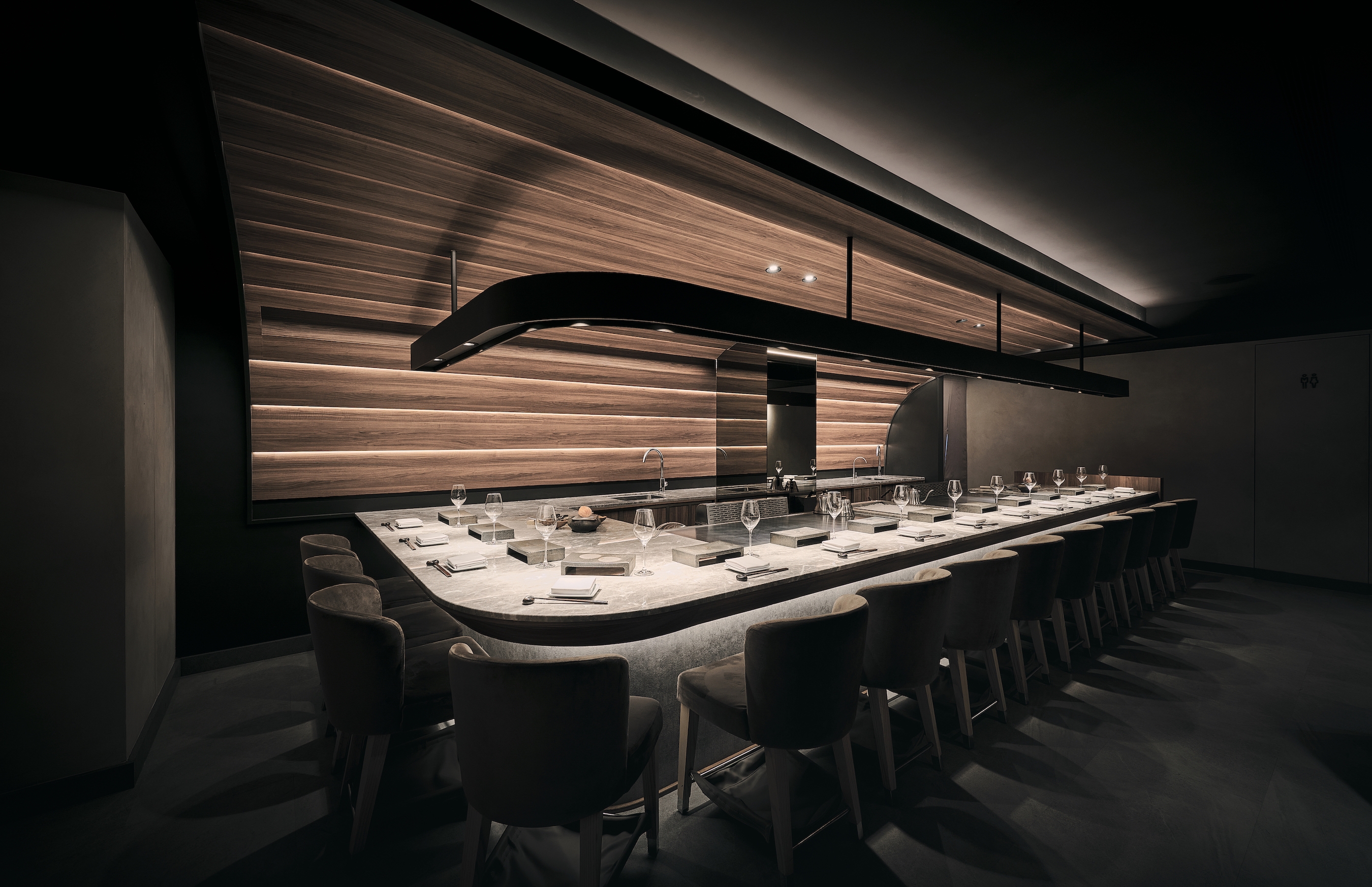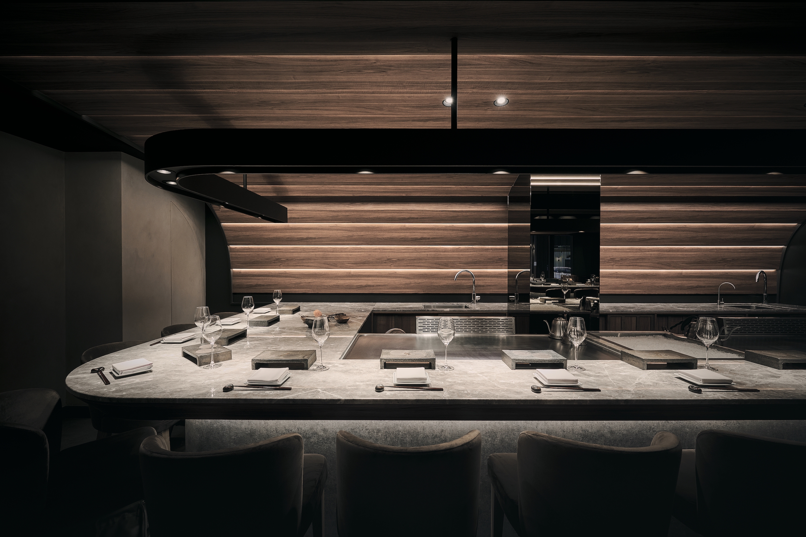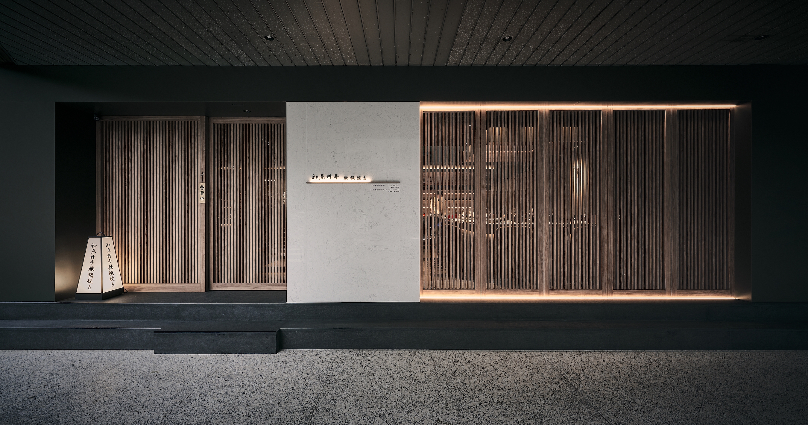 To achieve a cohesive vision and taste, the project takes a classic Japanese scene: a town street (machi) as the starting point of the design, and employs the weatherboard common in street scenes to create a dining environment in line with the brand. This evokes a strong Japanese flair through resemblance to fish scale roofs, with the impression of fresh seafood as the centerpiece. The dark tone weakens the sense of human presence and the awkwardness of sharing tables.