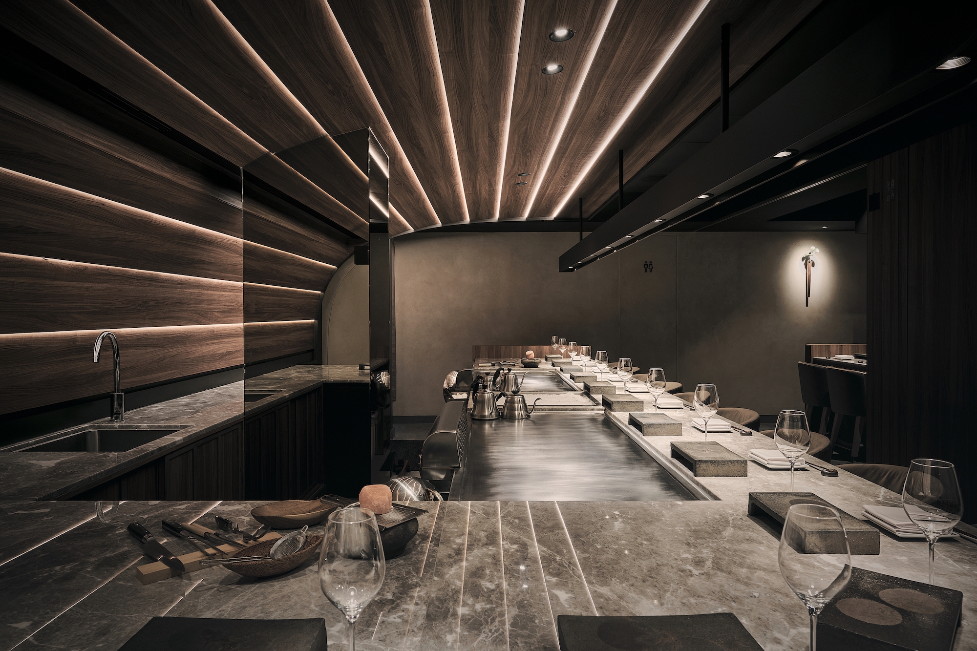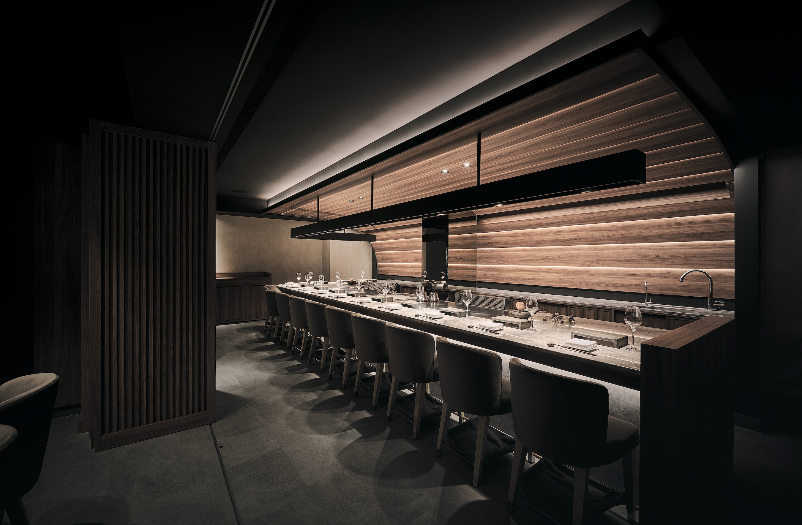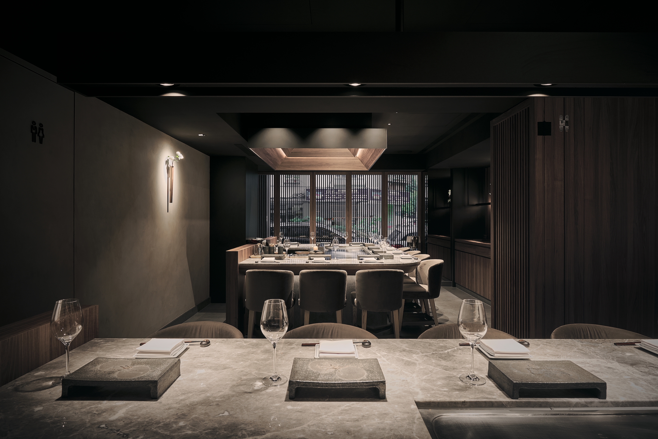 To achieve a cohesive vision and taste, the project takes a classic Japanese scene: a town street (machi) as the starting point of the design, and employs the weatherboard common in street scenes to create a dining environment in line with the brand. This evokes a strong Japanese flair through resemblance to fish scale roofs, with the impression of fresh seafood as the centerpiece. The dark tone weakens the sense of human presence and the awkwardness of sharing tables.