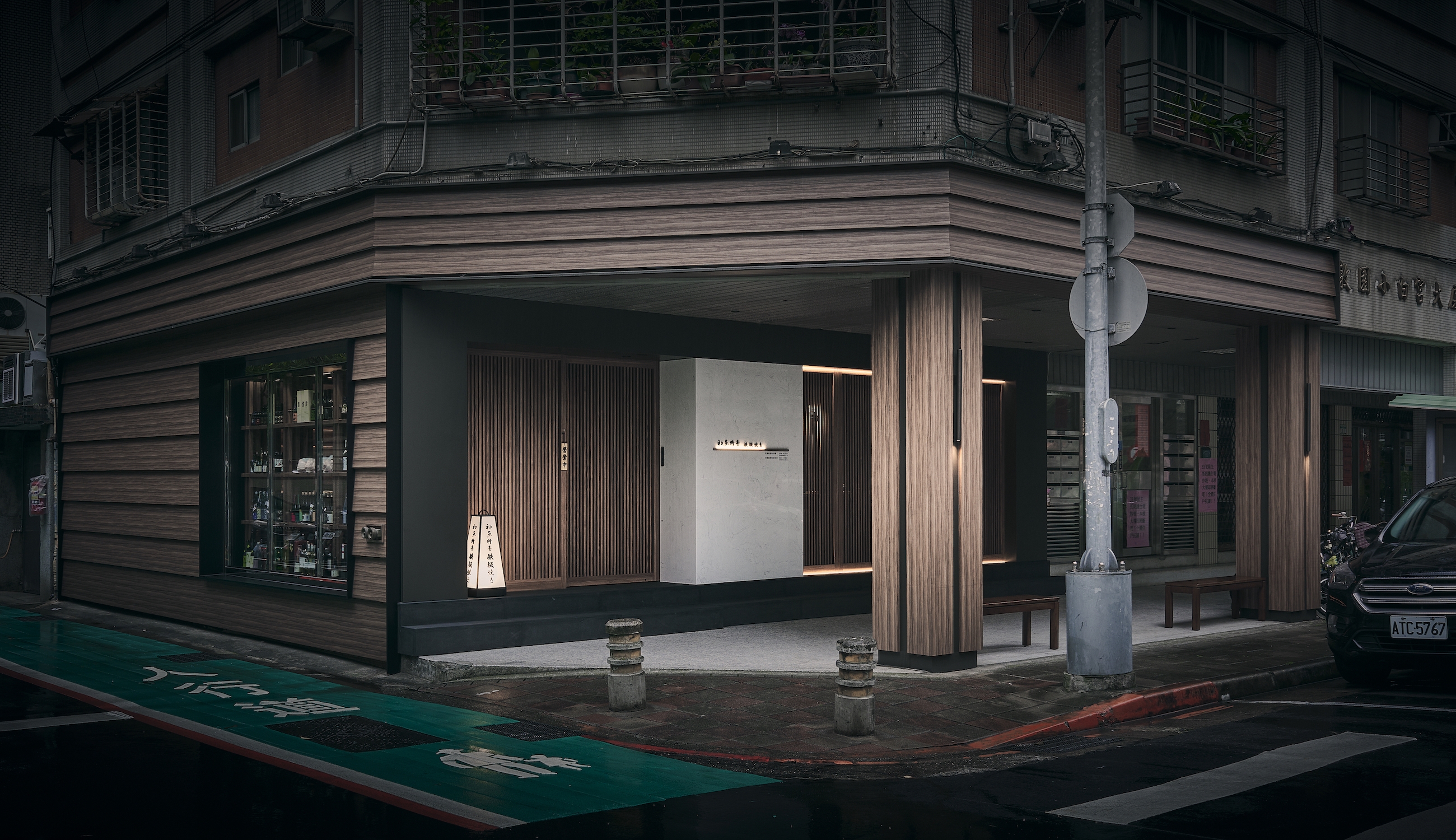 The weatherboard is an element that extends from the traditional Japanese wooden exterior wall into the interior, projecting the atmosphere of Shukuba (post town), featuring simple lines and reflective materials. This highlights the creative tension in simplicity and refinement of heritage and creativity.