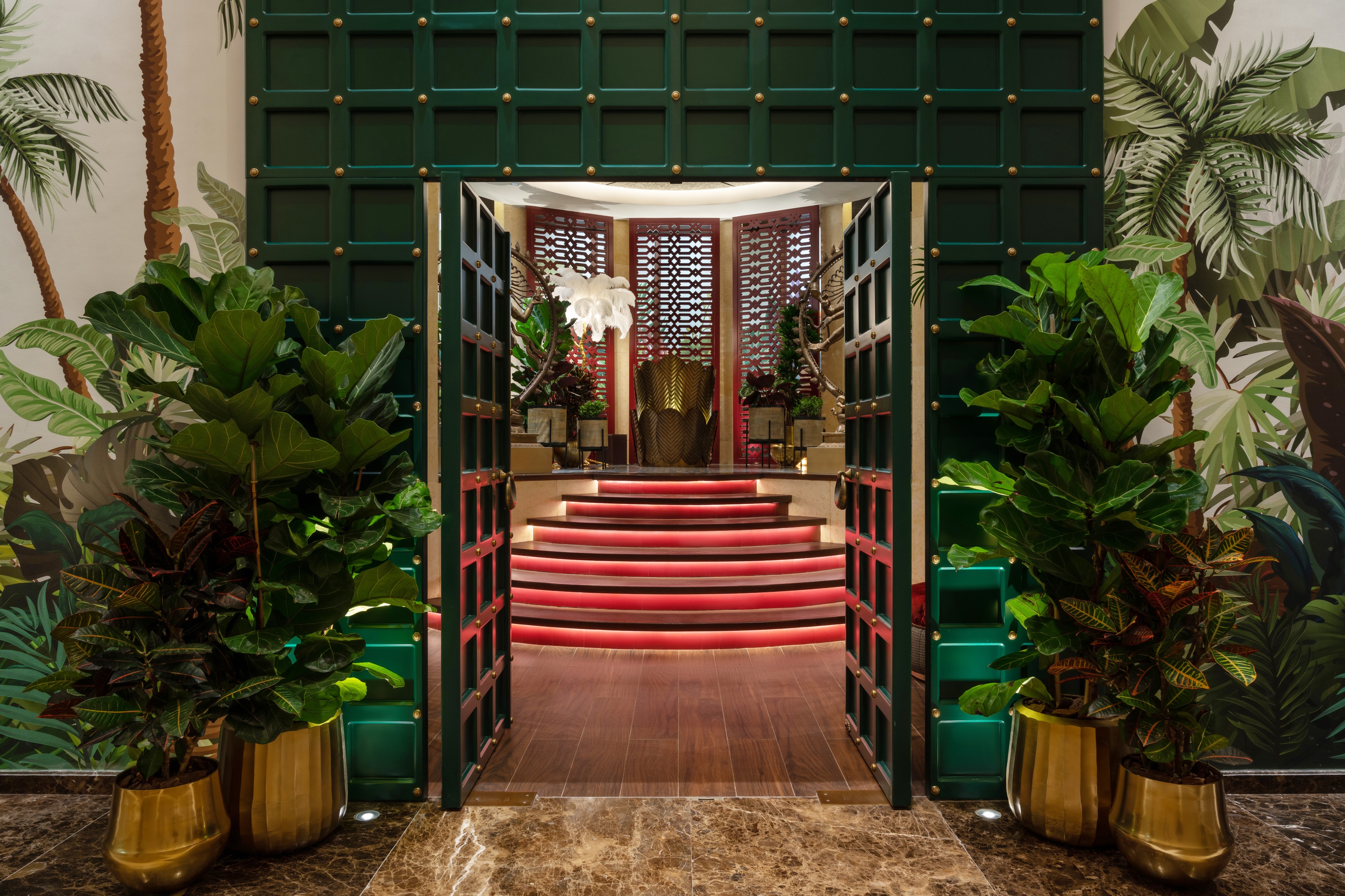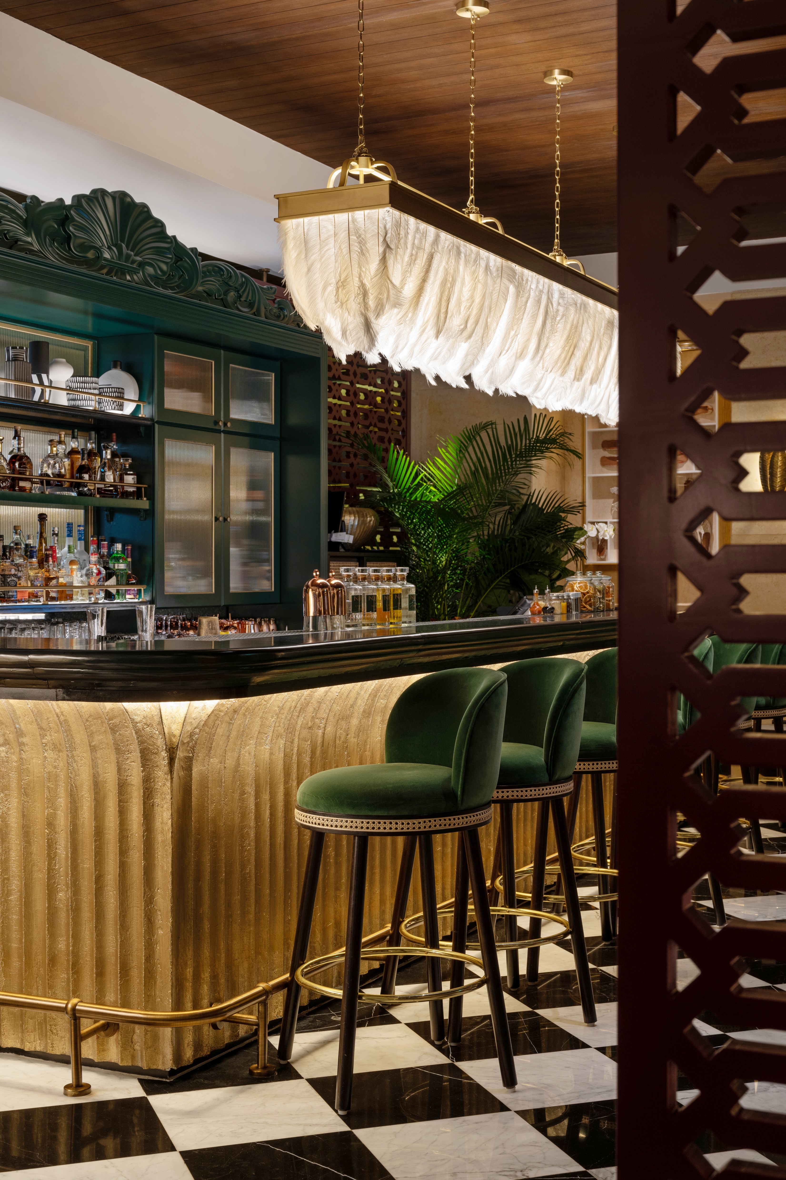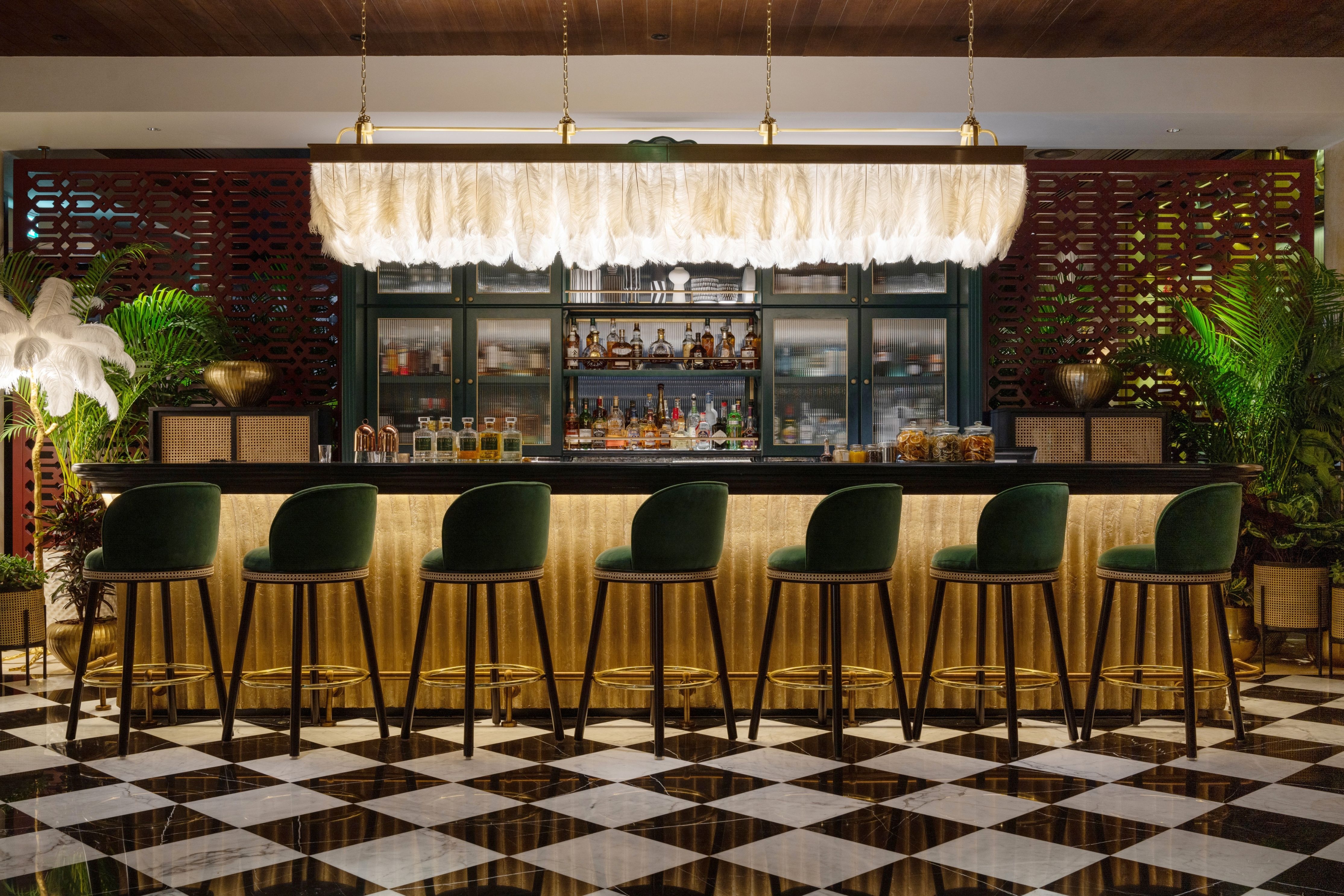 Indego by Vineet is a multi-award-winning Michelin Star restaurant located in the lavish Grosvenor House Hotel in the Marina district. The brief was to capture the essence of colonial India whilst echoing the vibrant modern culture of the country. The restaurant was historically a dining room, but the new design includes an extraordinary feature bar and a private dining room to expand the restaurant’s luxury offerings. The design team was tasked with creating indoor-outdoor dining spaces with uninterrupted views of the marina whilst retaining the decade-old appeal of the much-loved soul of Vineet’s restaurant. Guests are welcomed into a lotus-inspired hall through a splendid large green lacquered door with brass door knockers, striking foliage-inspired wallpaper, eccentric feathered lamps and Nataraja statues.