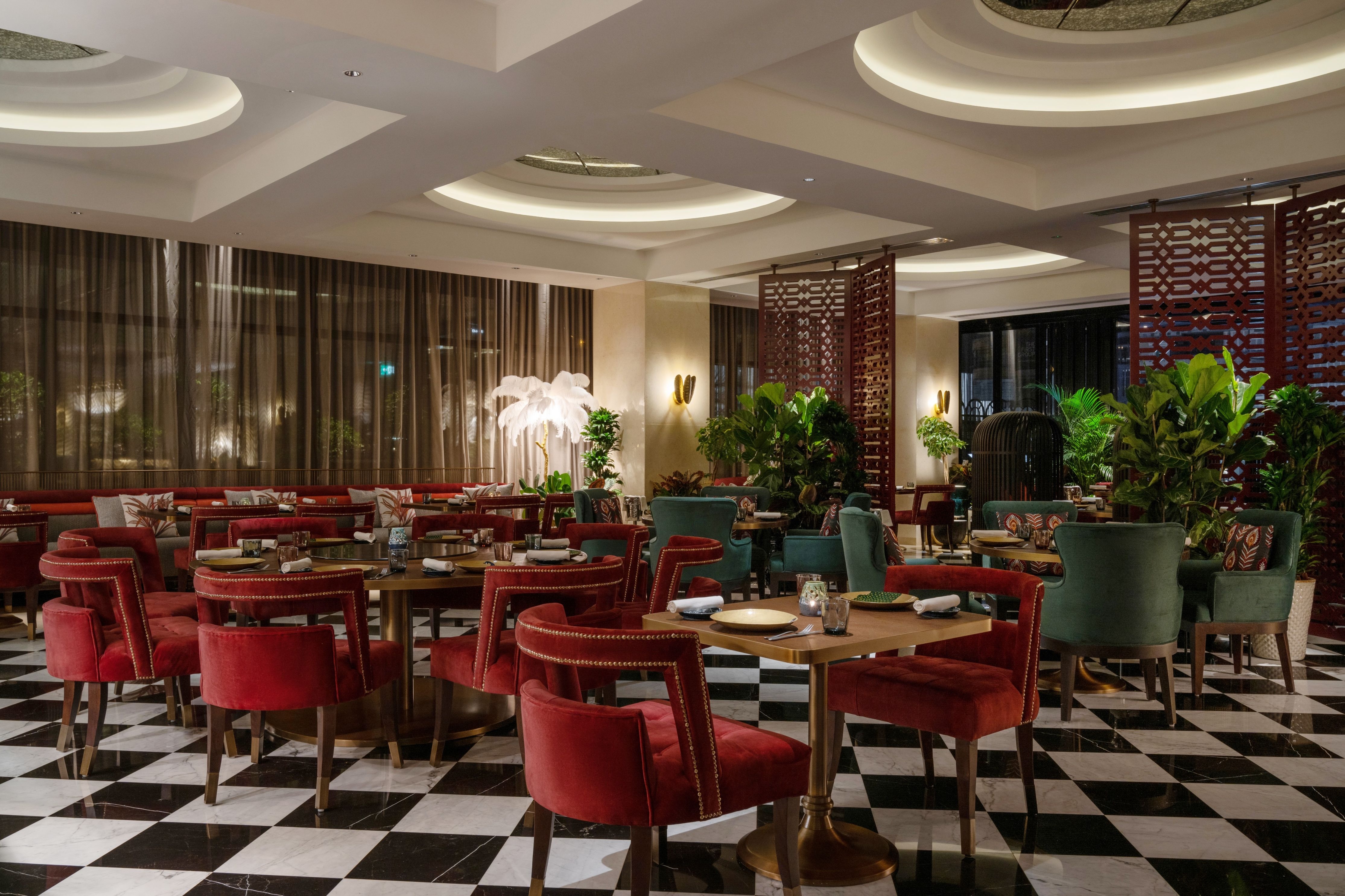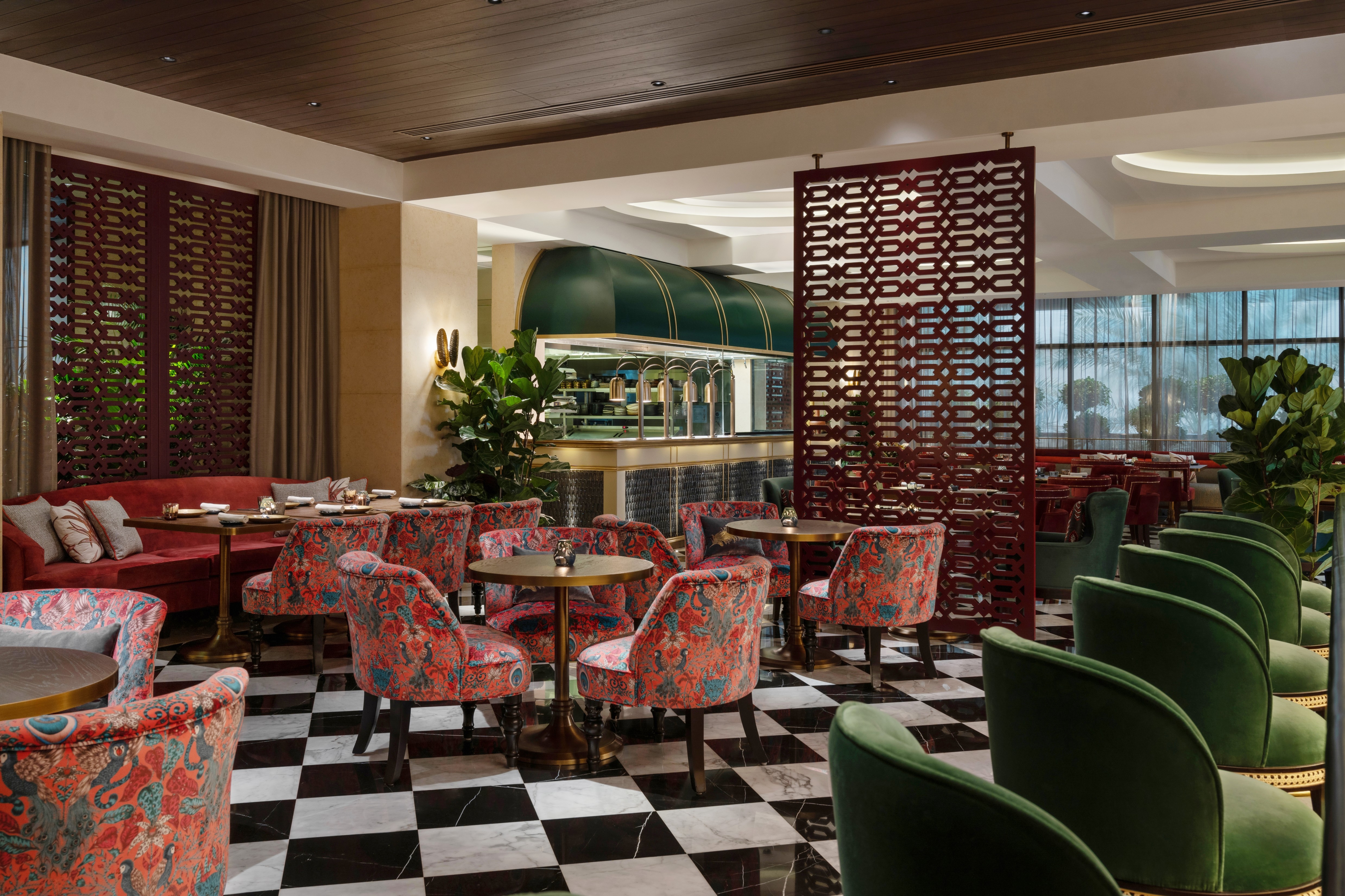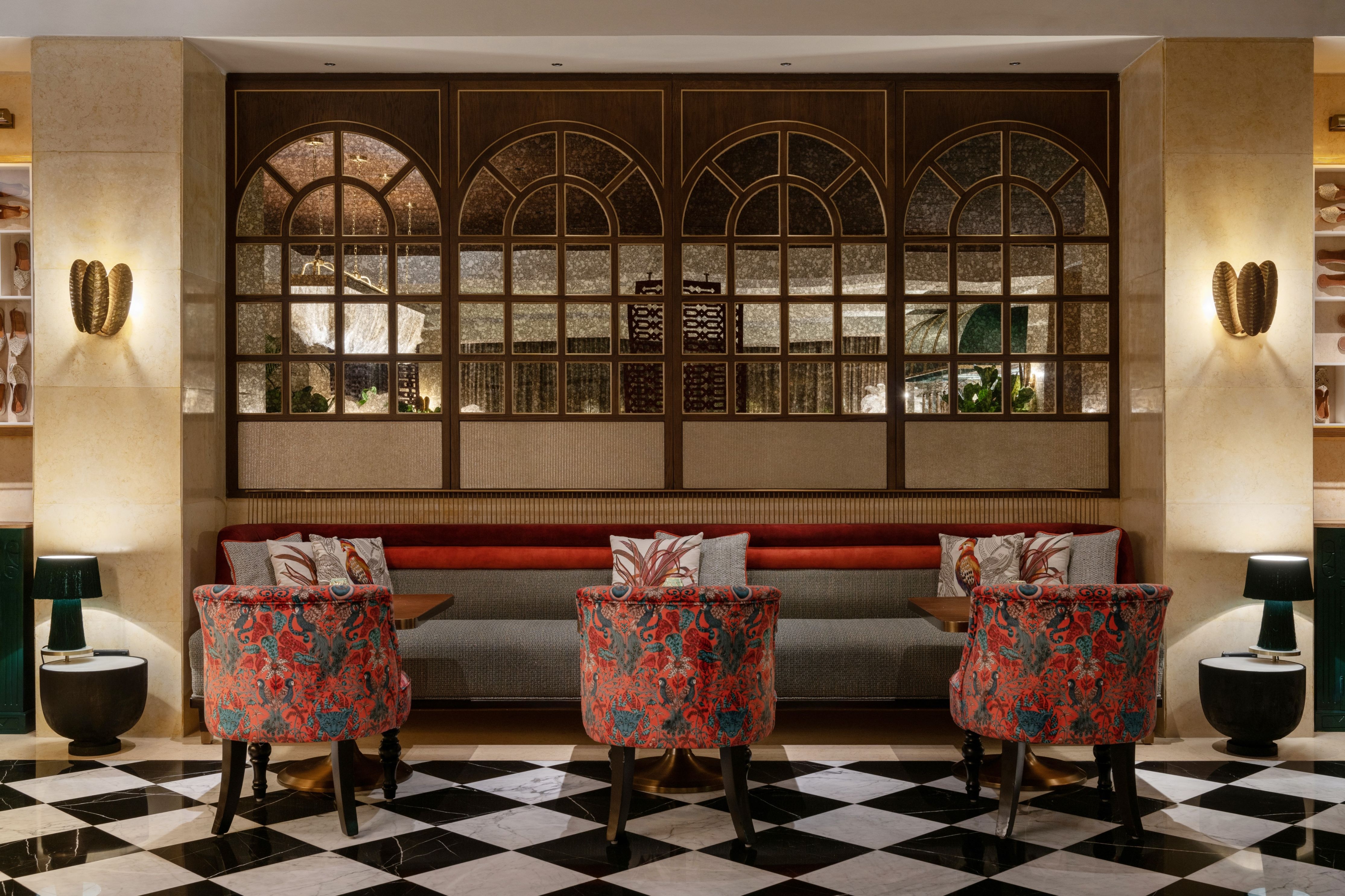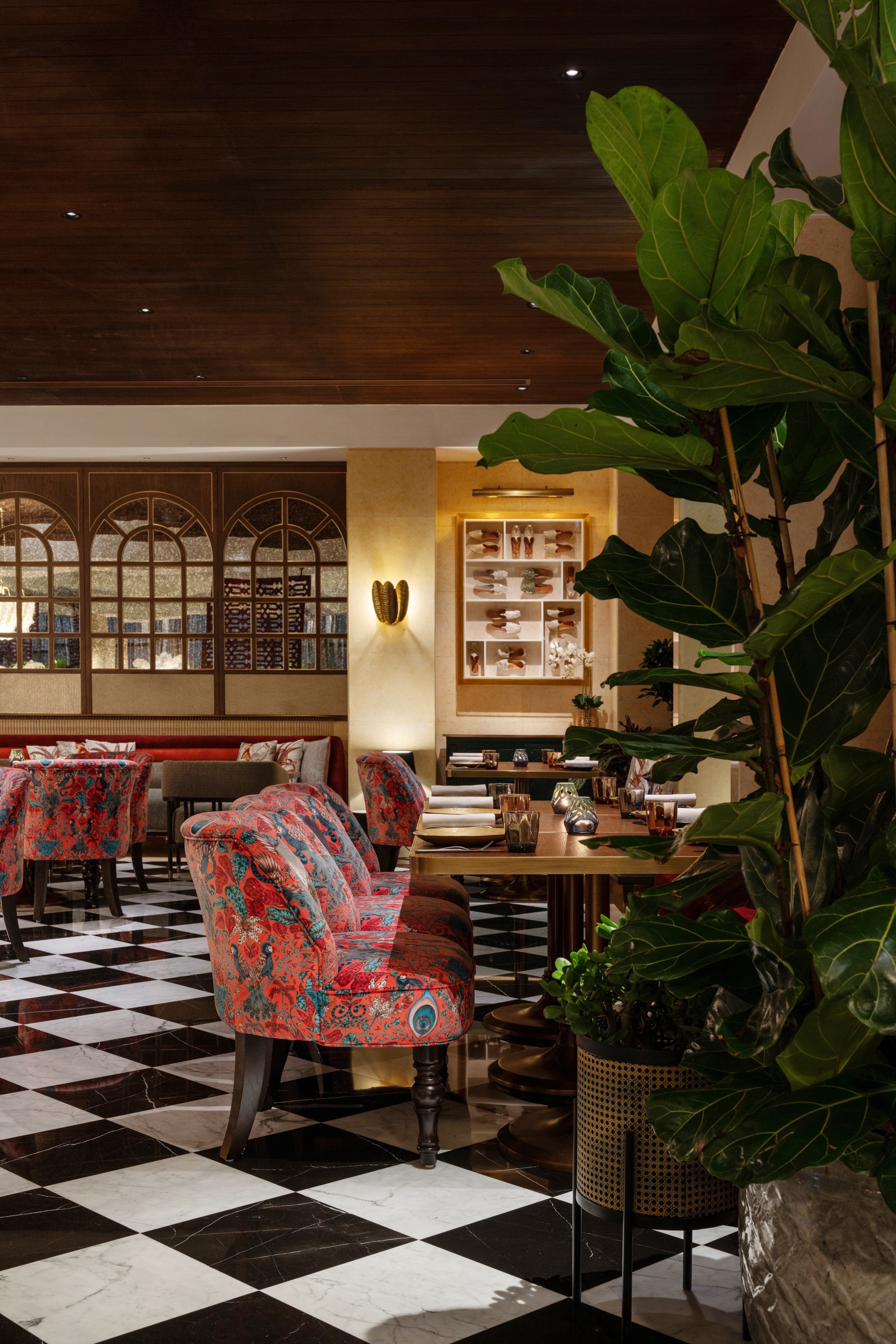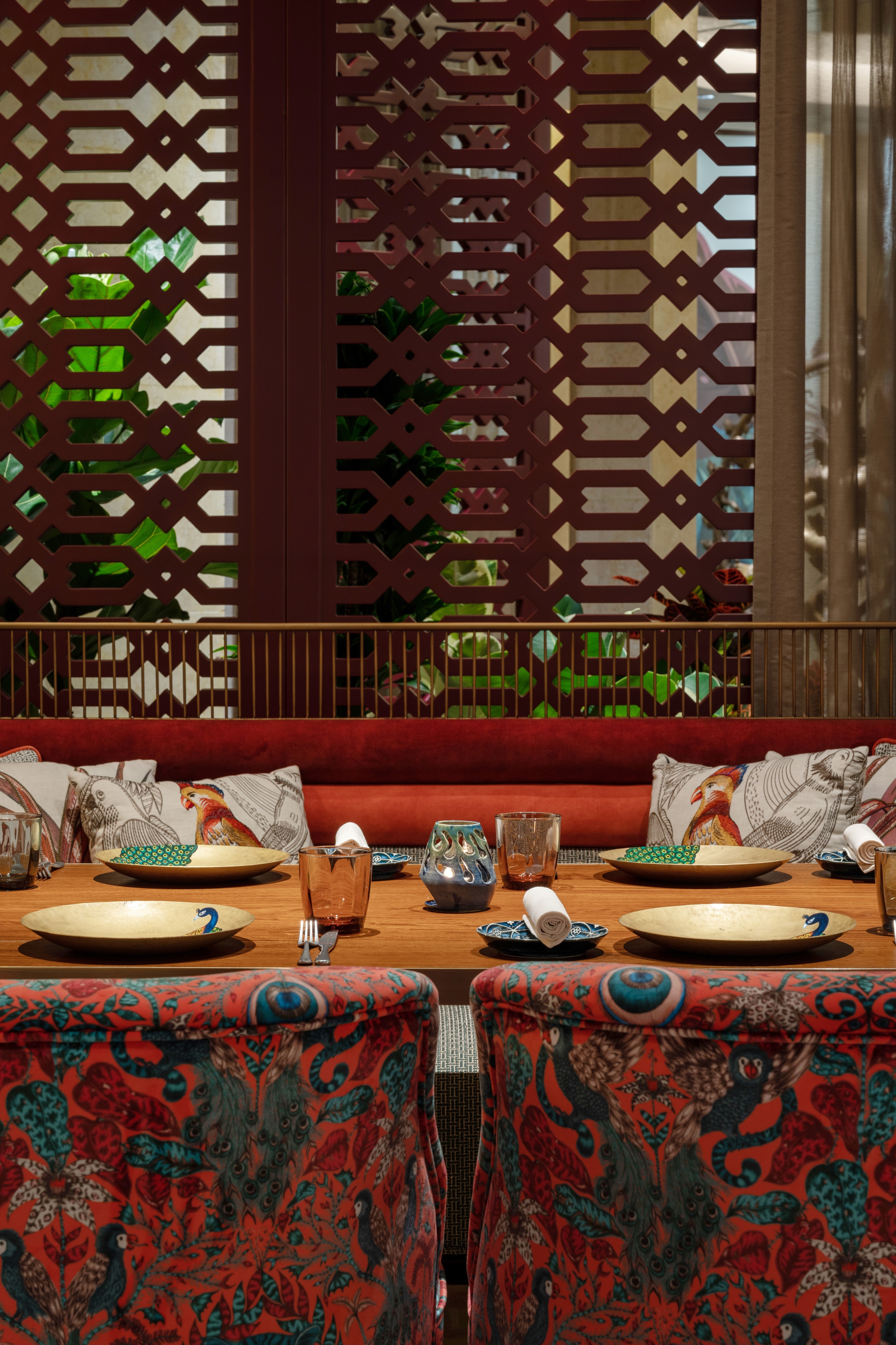 The overall aesthetic transports guests into a time of bygone royalty with lush upholstery-clad lounging chairs and banquettes. Collectable Jhutis framed in modern perspex are dotted throughout the restaurant, and old Jhalli screens have been repurposed. Time restrictions were tight, so many original features were retained.