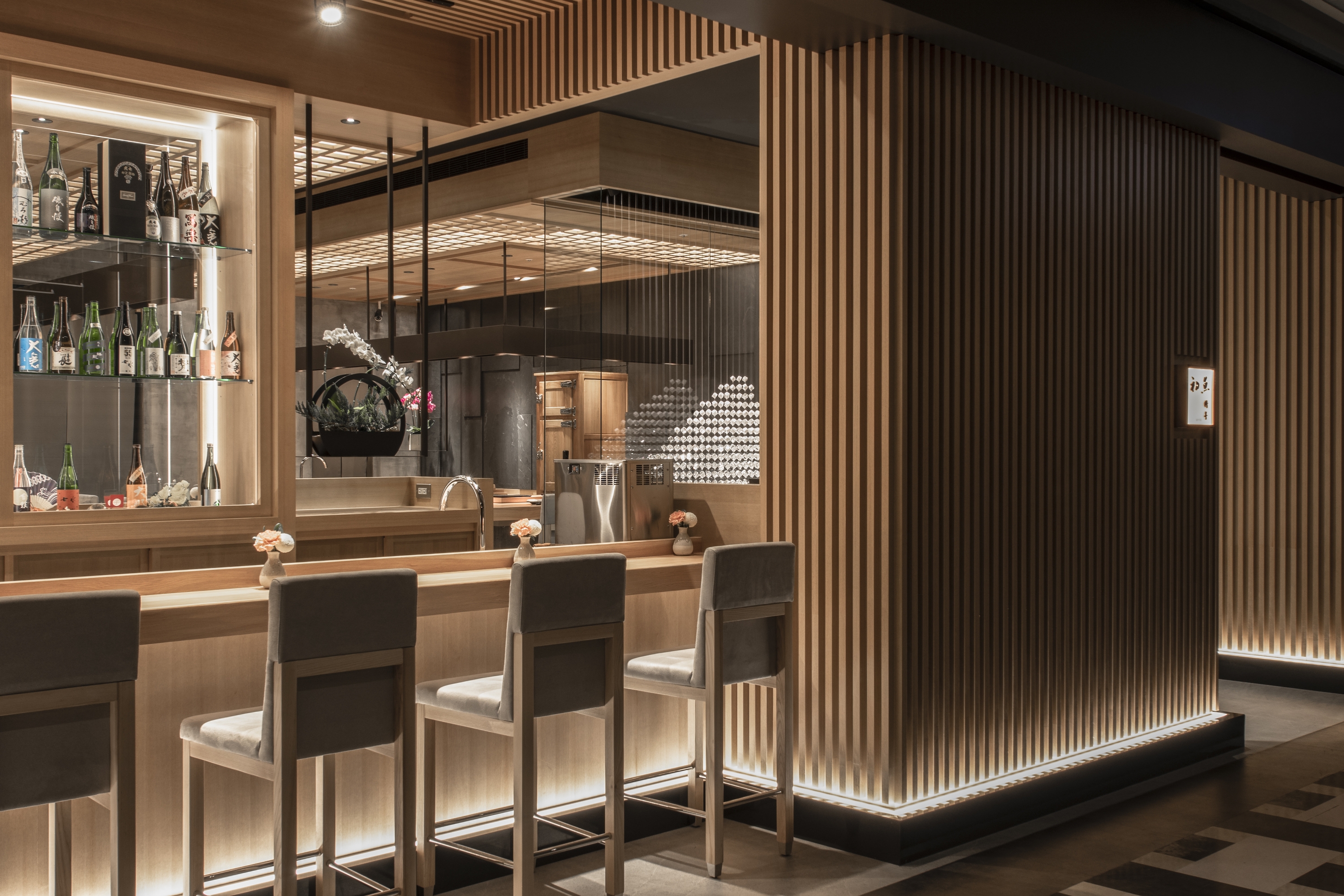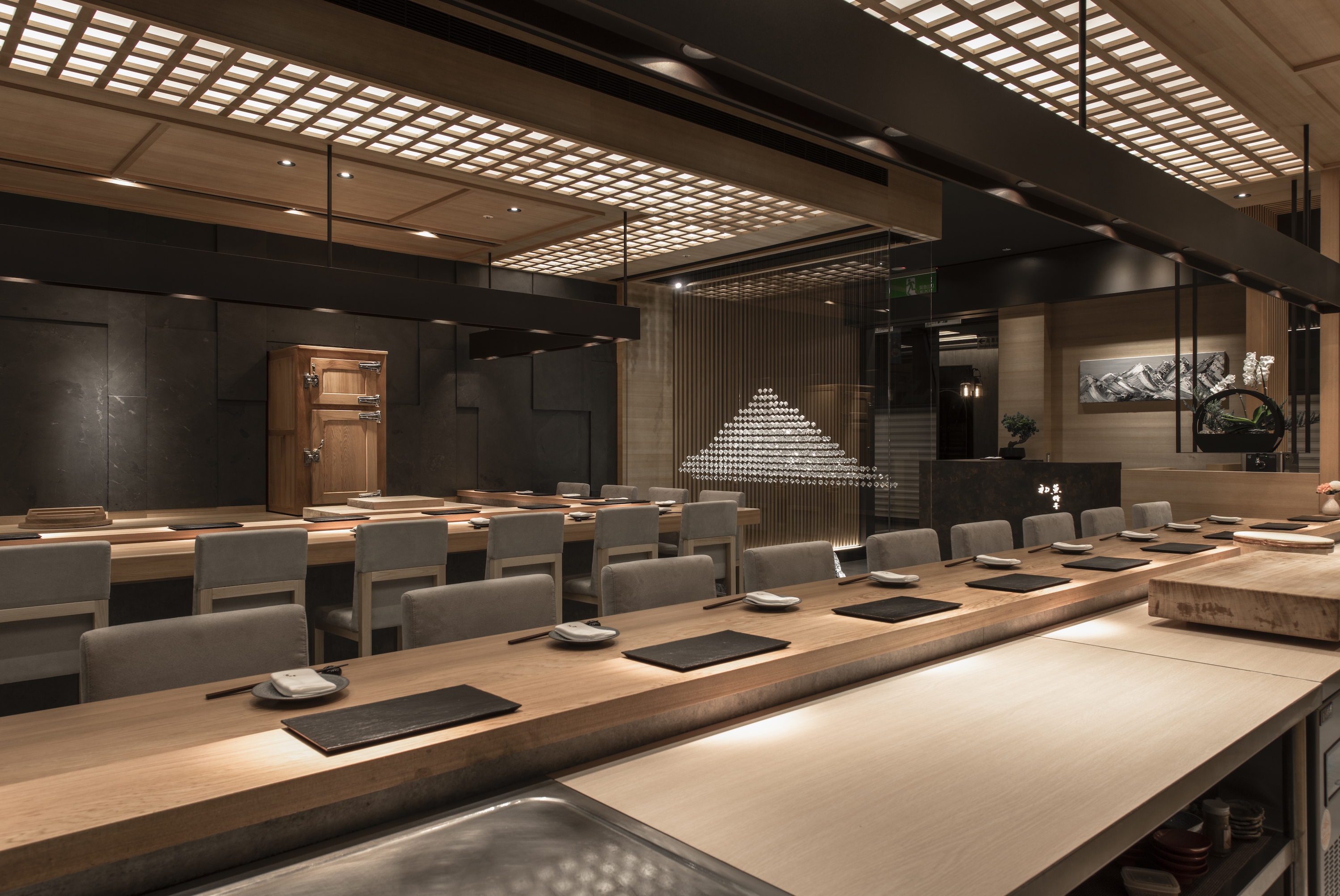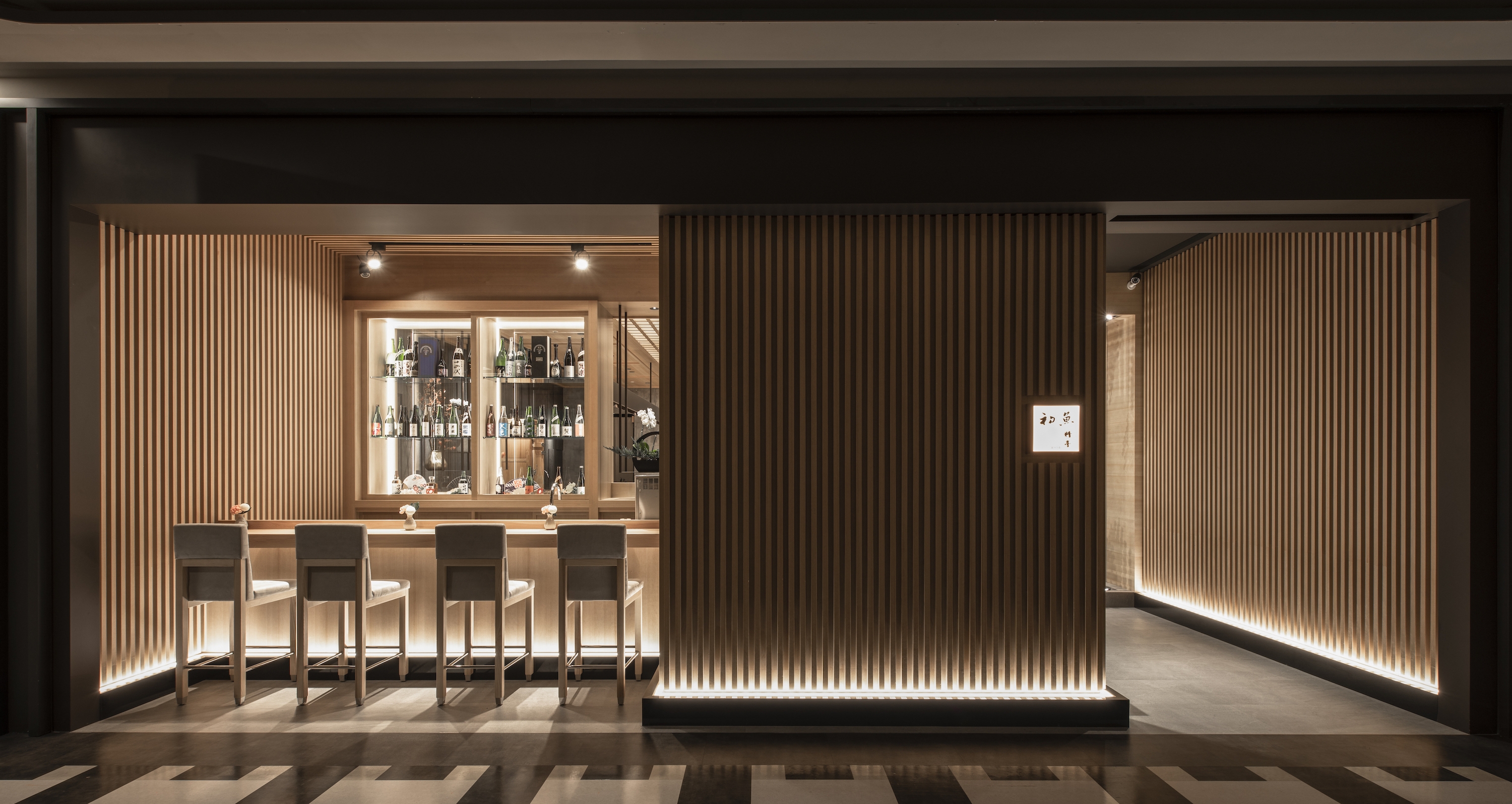As the first branch of a Japanese sushi brand in a department store, and a stepping stone to transform into a fine-dining establishment. The original Yatai (food stall) style of the founding store continues, while taking into account the semi-open layout of the venue. The entrance façade is split in three to integrate the visual image, entrance and access functions, together with the sake bar, so that the positioning and service items are immediately visible. The store maintains the same itamae style, with two sushi bars combined with seating and cooking stations, extolling service philosophy and thoughtful Japanese hospitality.