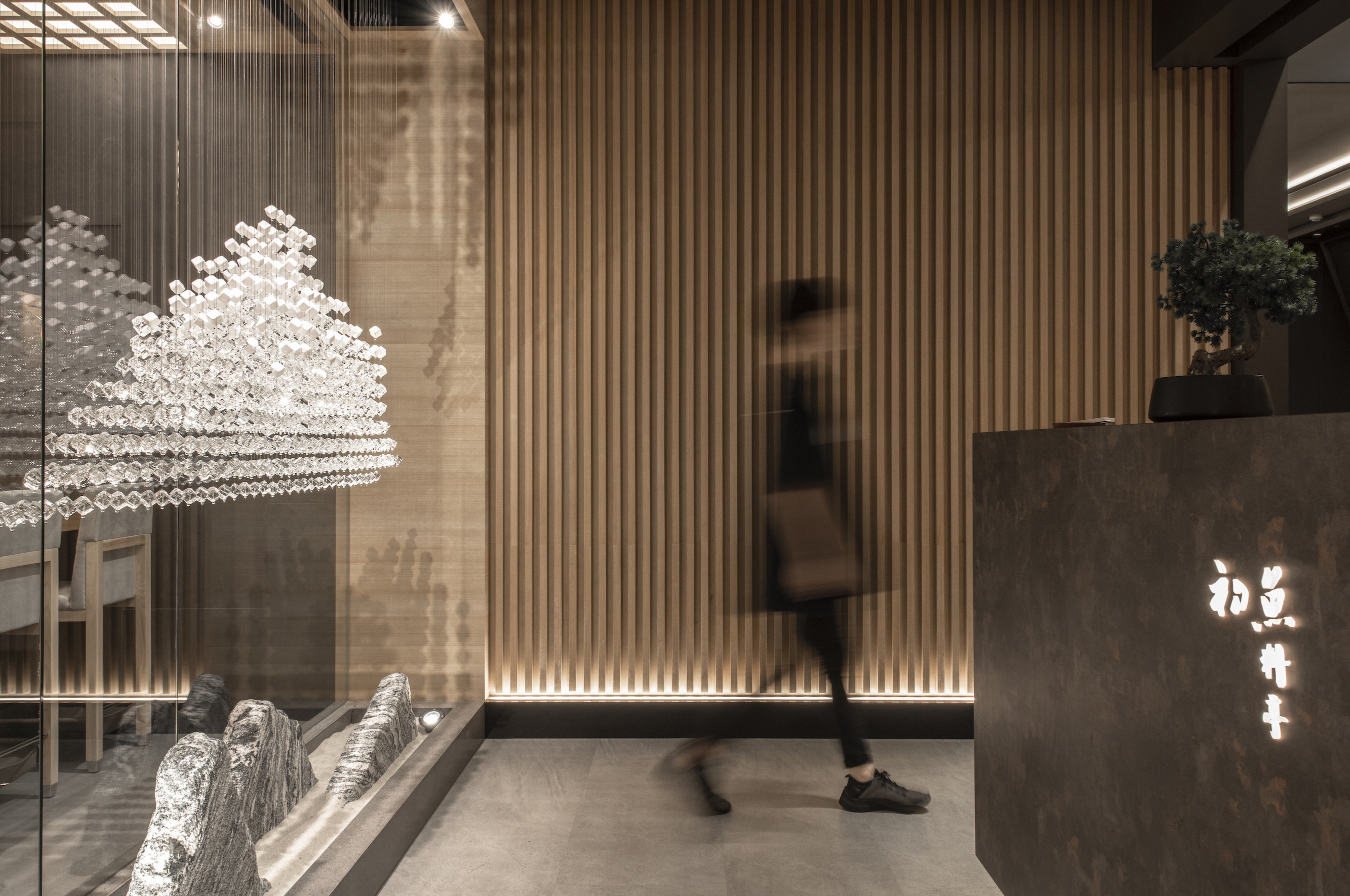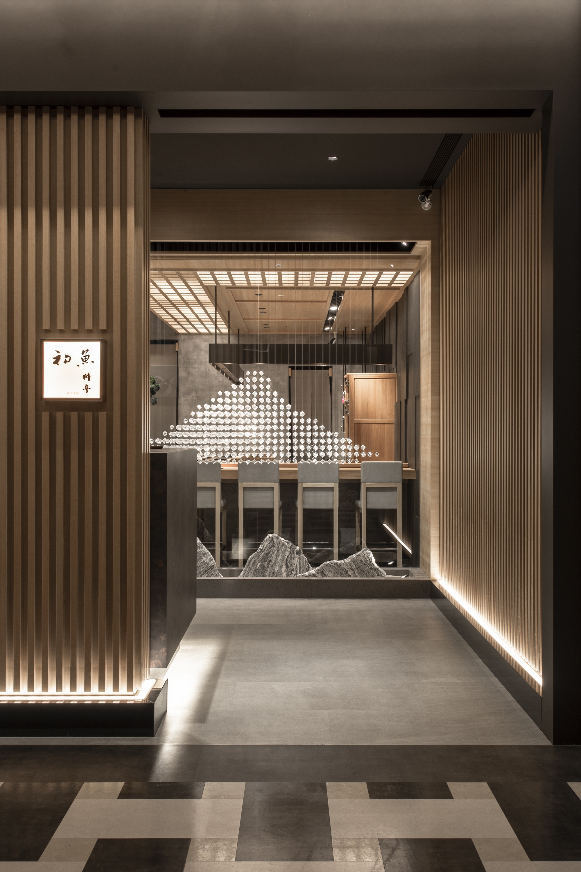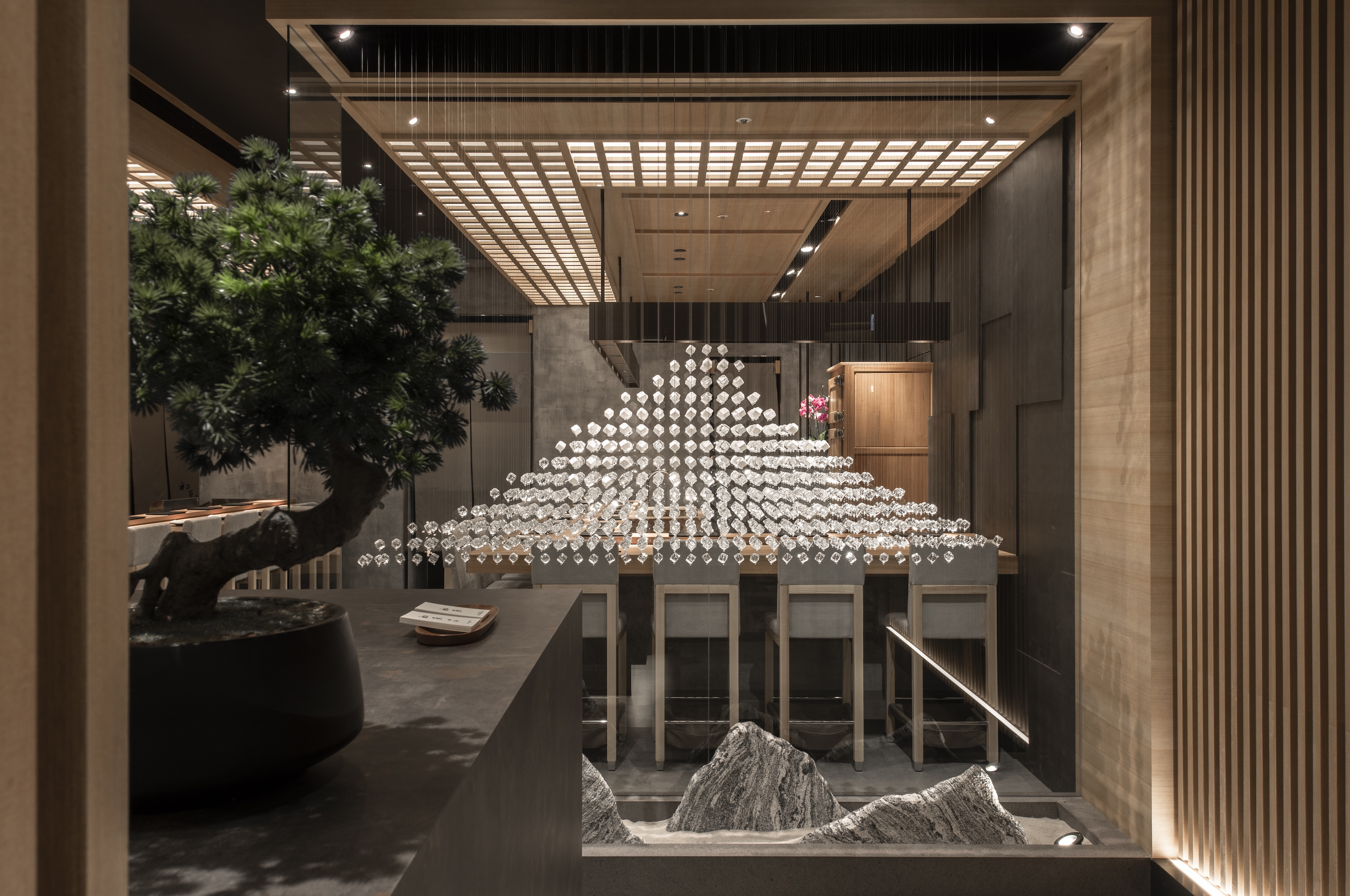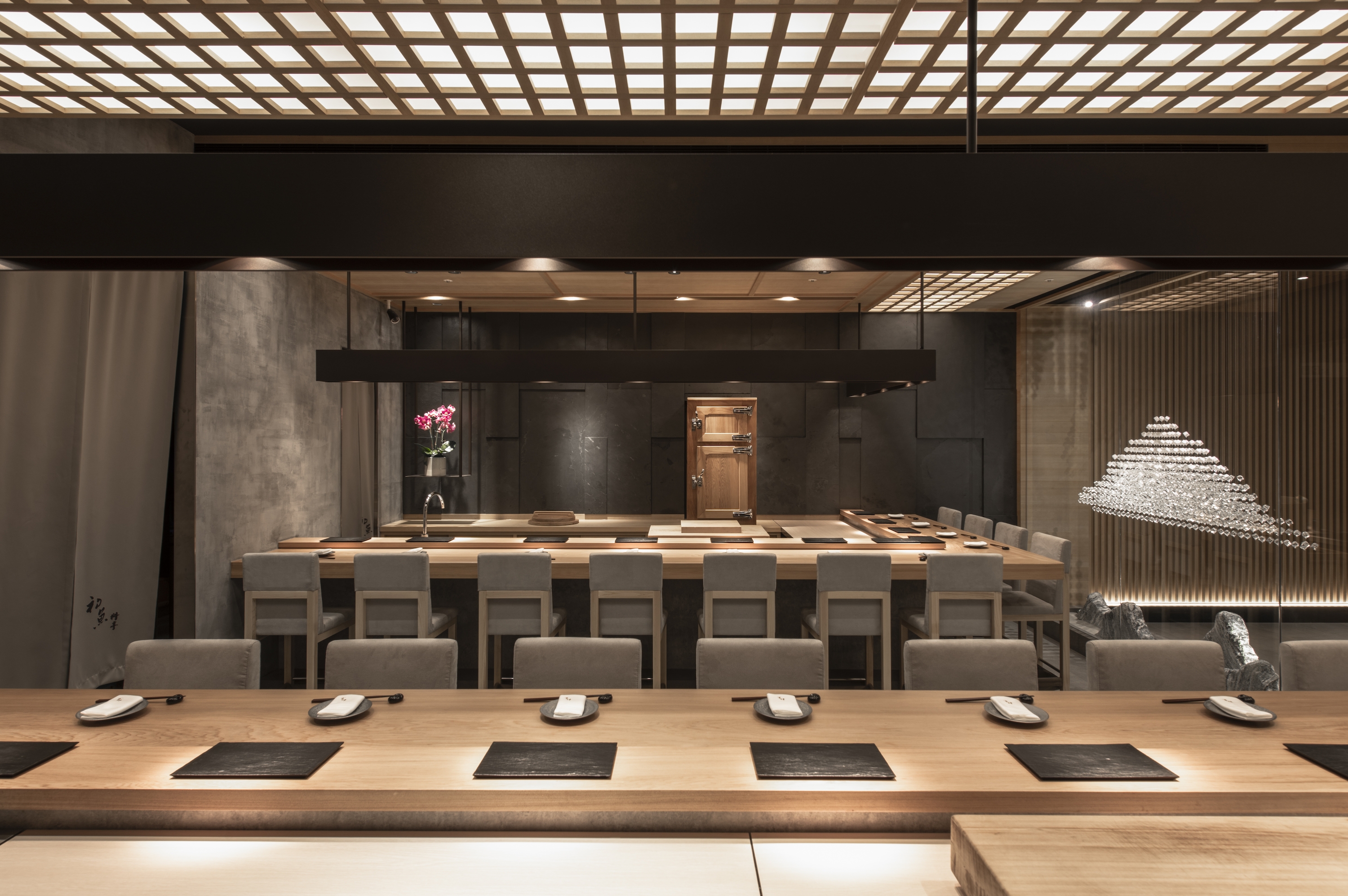 As the first branch of a Japanese sushi brand in a department store, and a stepping stone to transform into a fine-dining establishment. The original Yatai (food stall) style of the founding store continues, while taking into account the semi-open layout of the venue. The entrance façade is split in three to integrate the visual image, entrance and access functions, together with the sake bar, so that the positioning and service items are immediately visible. The store maintains the same itamae style, with two sushi bars combined with seating and cooking stations, extolling service philosophy and thoughtful Japanese hospitality.