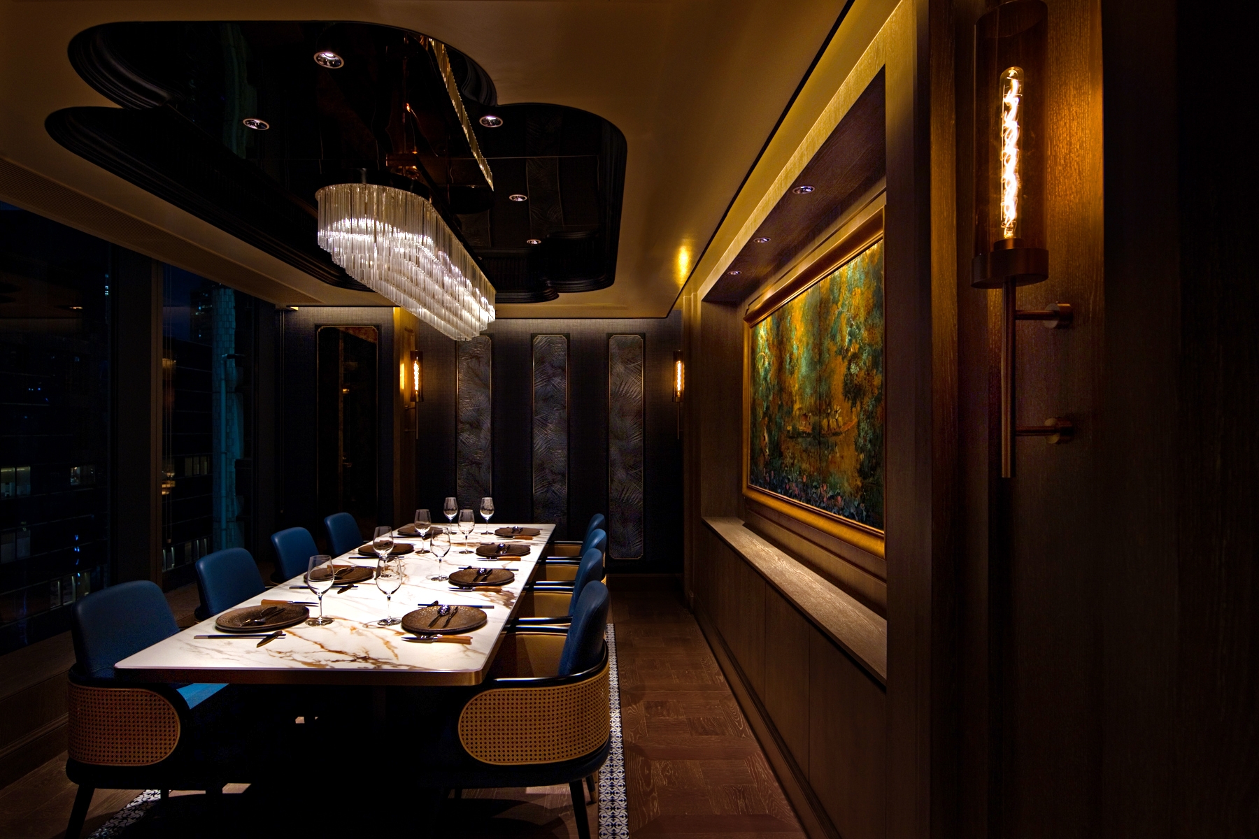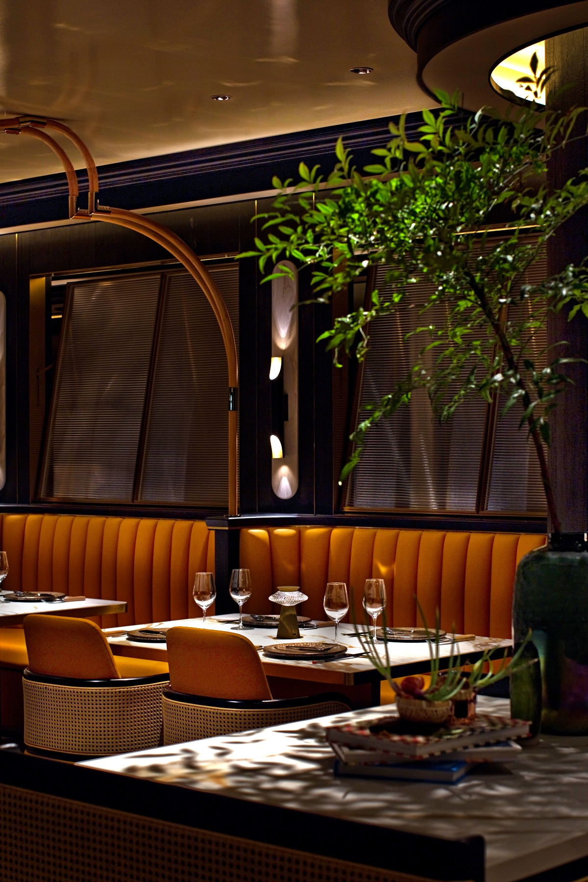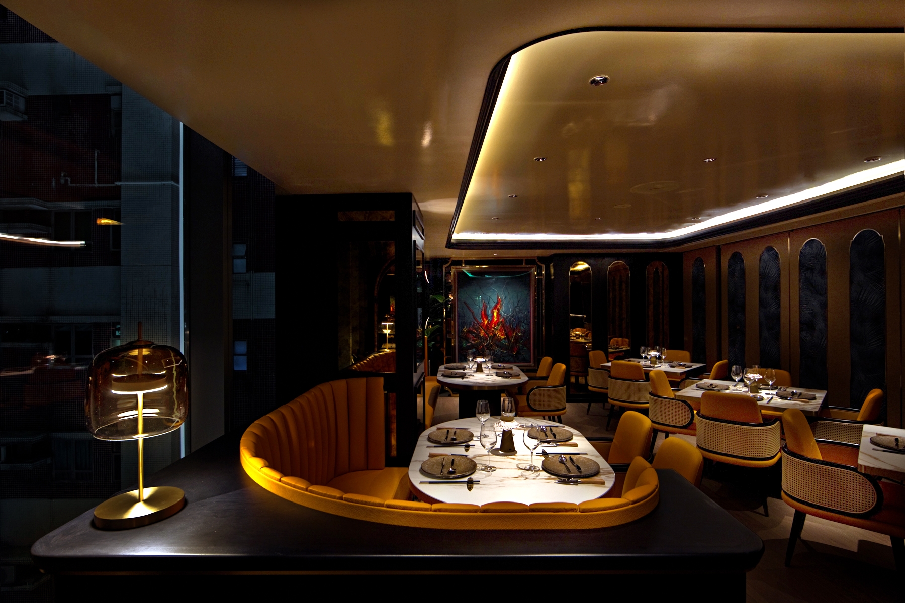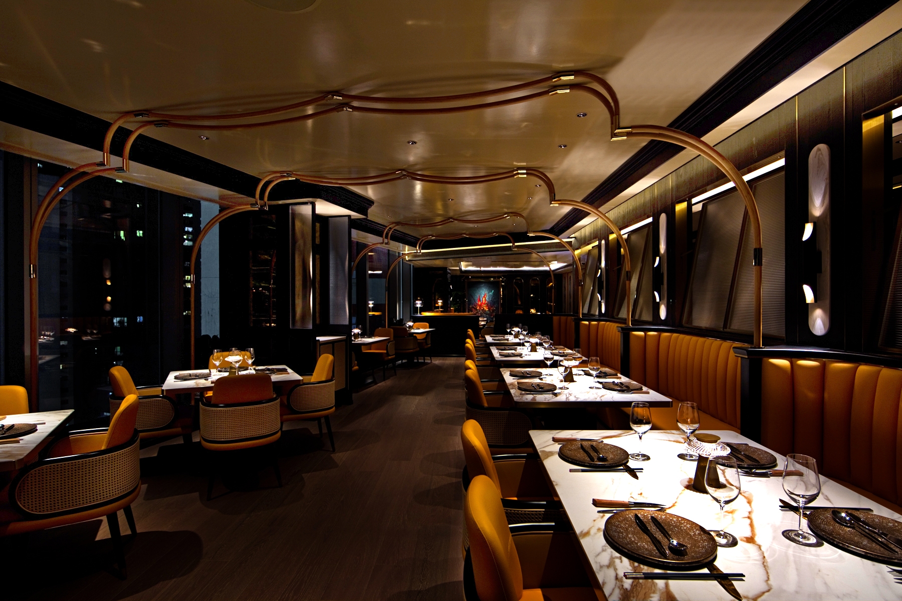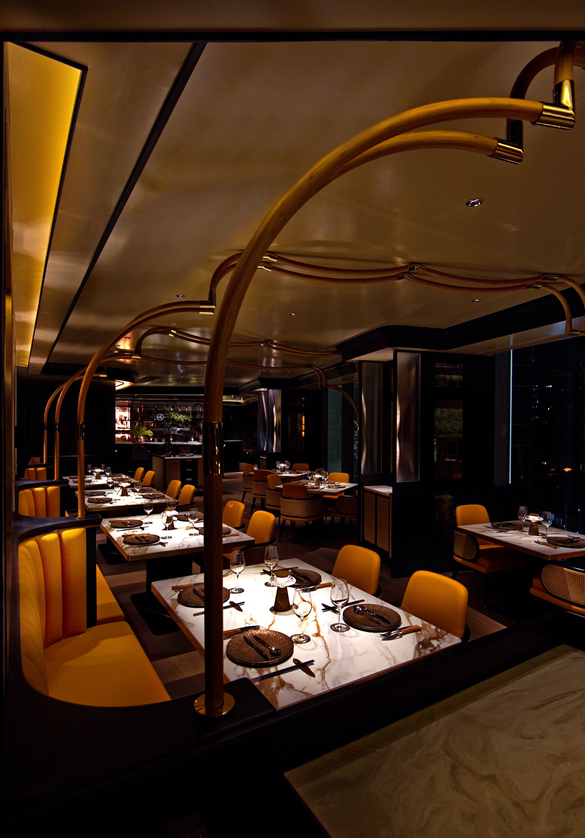 Bamboo was transformed into arch features to define a courtyard-like open dining area. A palette of orange contrasted with dark hues unified the décor, bench seating backed with patterned window panel and golden wall sconce overseeing the beautiful urban scenery.