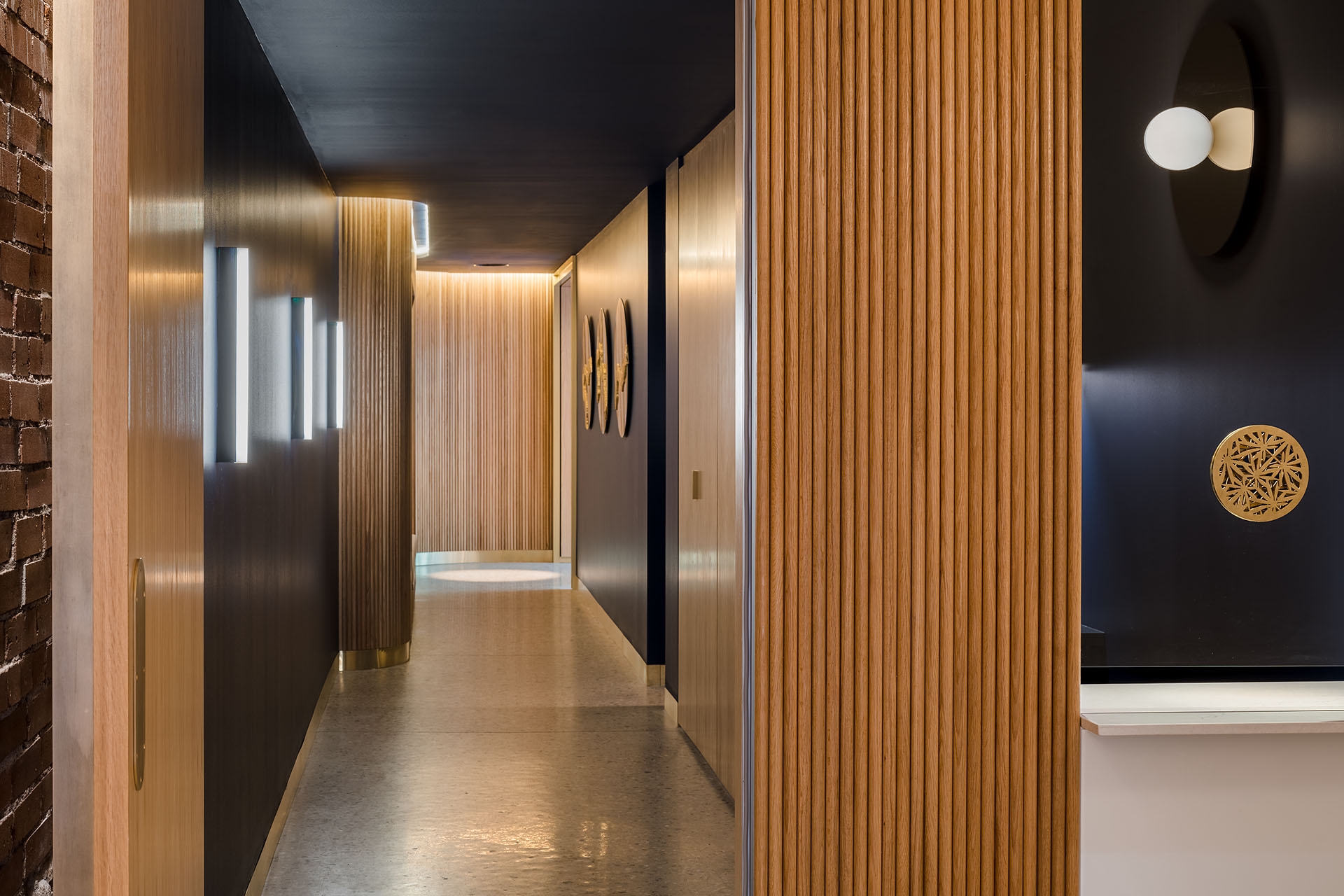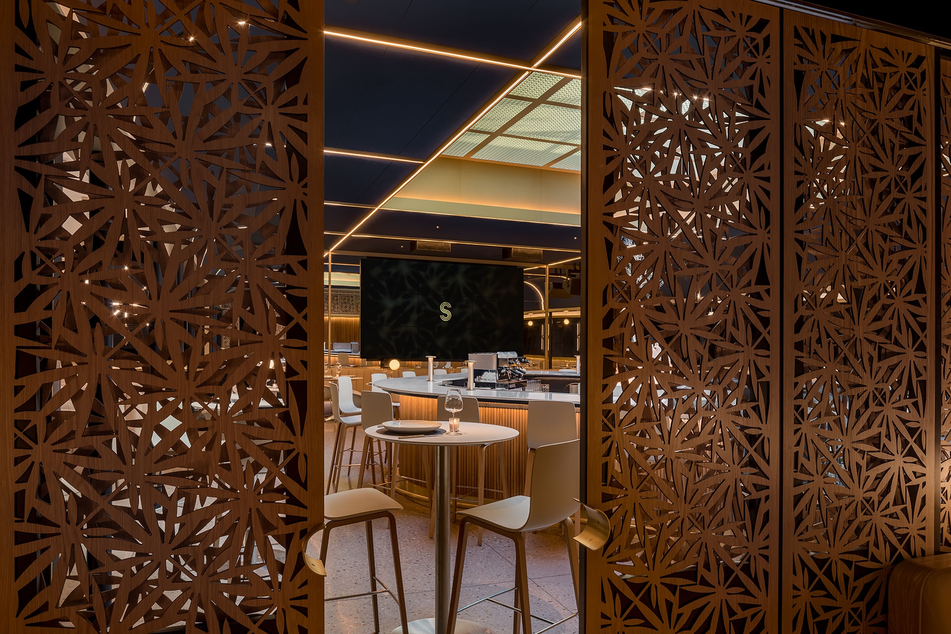 Originally conceived as a cannabis lounge, Stella’s Cucina sits in the core of a new commercial building facing Boulder’s Historic District. When entering the building an existing a brick wall reflects on the opposite mirrored wall escorting the guests to the interior. In the lobby, an oak wall with a check-in window awaits the visitors, where an unseen bouncer cards the guests. From there, a hidden wooden door reveals a dark corridor, where the host welcomes the visitors and walks them through a compressed and dimmed space with wood walls. Inside a squared dinning room with a massive 16´x 16´ centered skylight, the light is filtered through a golden aluminum egg crate. Below, a 45 degree rotated bar with curved corners, welcomes and invites the guests onto the perimeter tables. This entrance view emphasizes the grid and allows the guest to have a glimpse of the whole dining room, while the back mirrored wall doubles the whole space, and a large screen wall serves as a digital window. A curved fixed seating is arranged on the perimeter of the square. On the left and right walls, equidistant columns separate the main space from the white vaulted dining areas in the back.