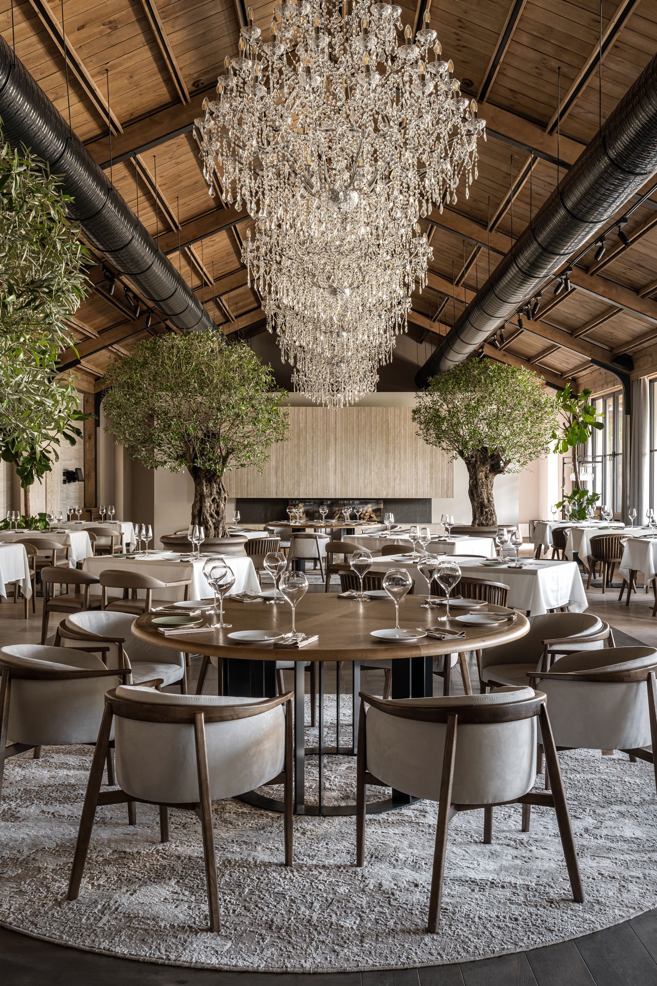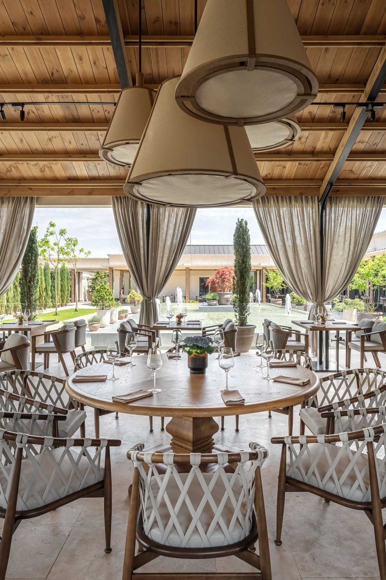 A restaurant of 1600 square meters is a kind of well with a cozy courtyard with a fountain and an abundance of greenery inside. The dining space with the largest seating stands out with a certain pomposity while the small dining space located next to it is more secluded and intimate.