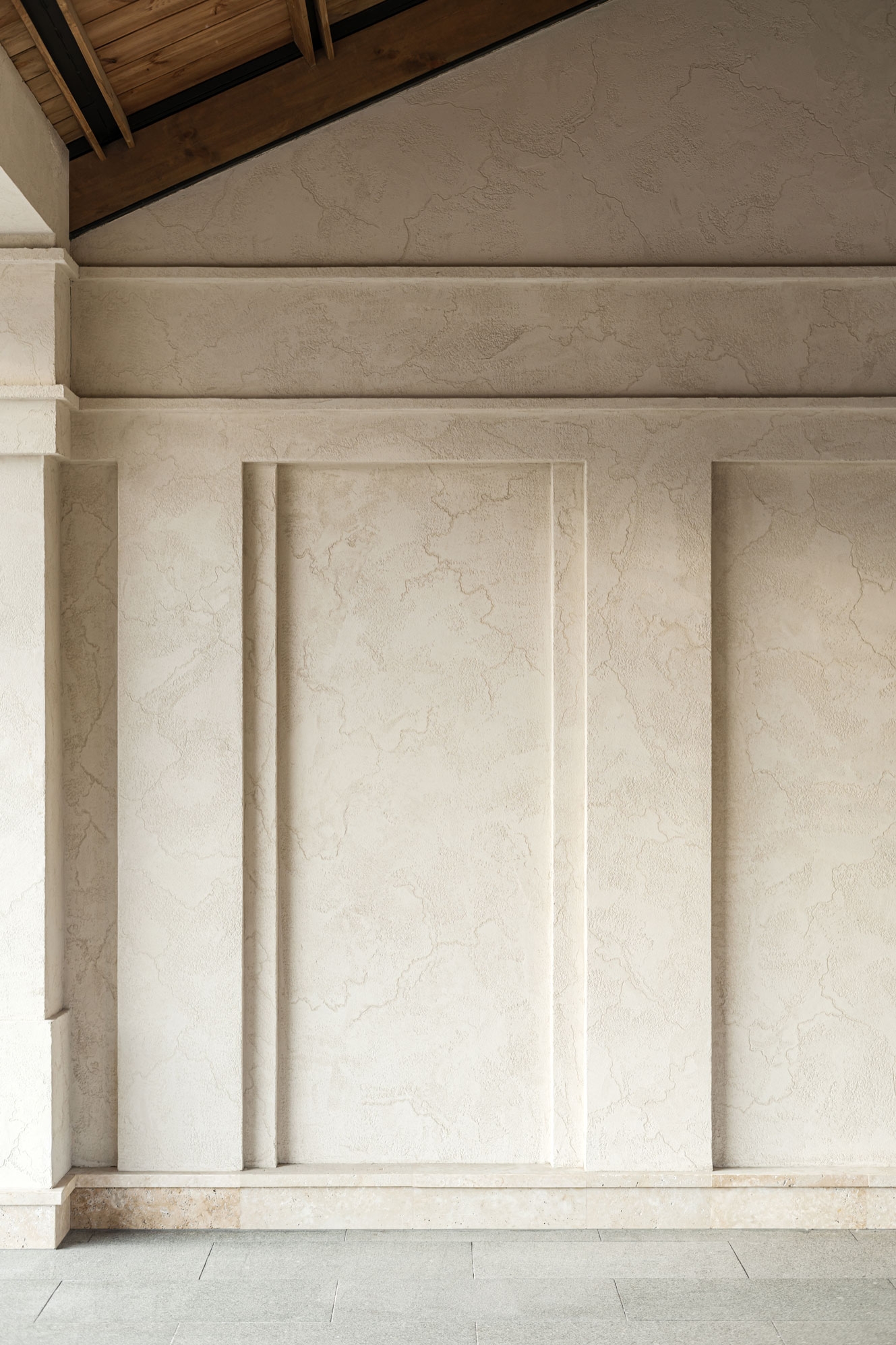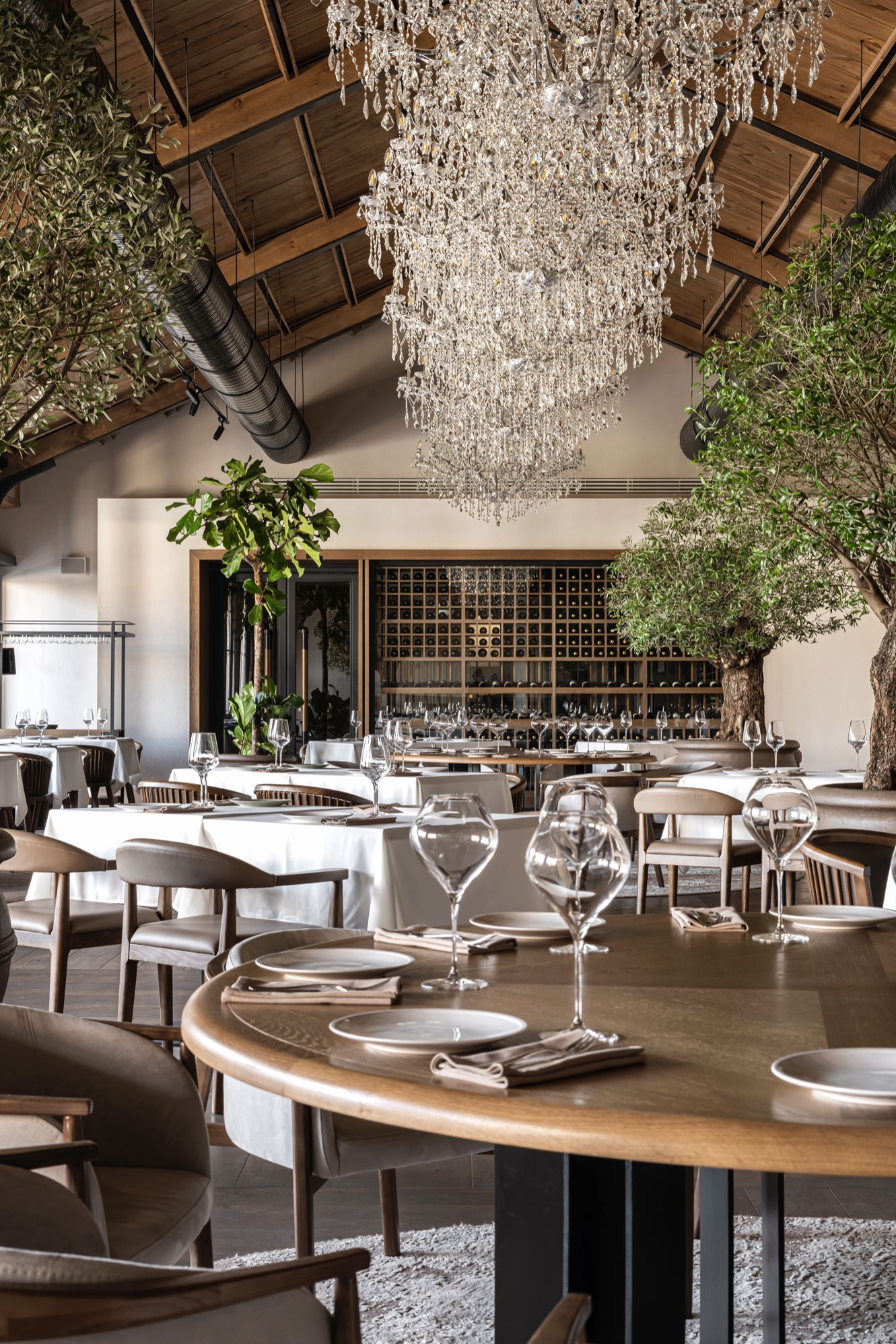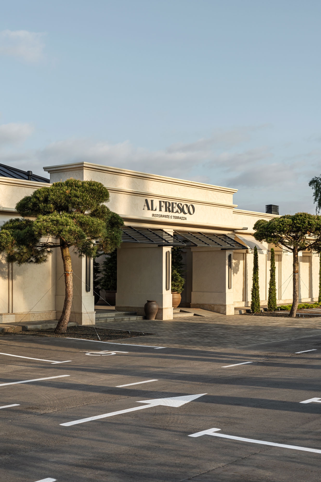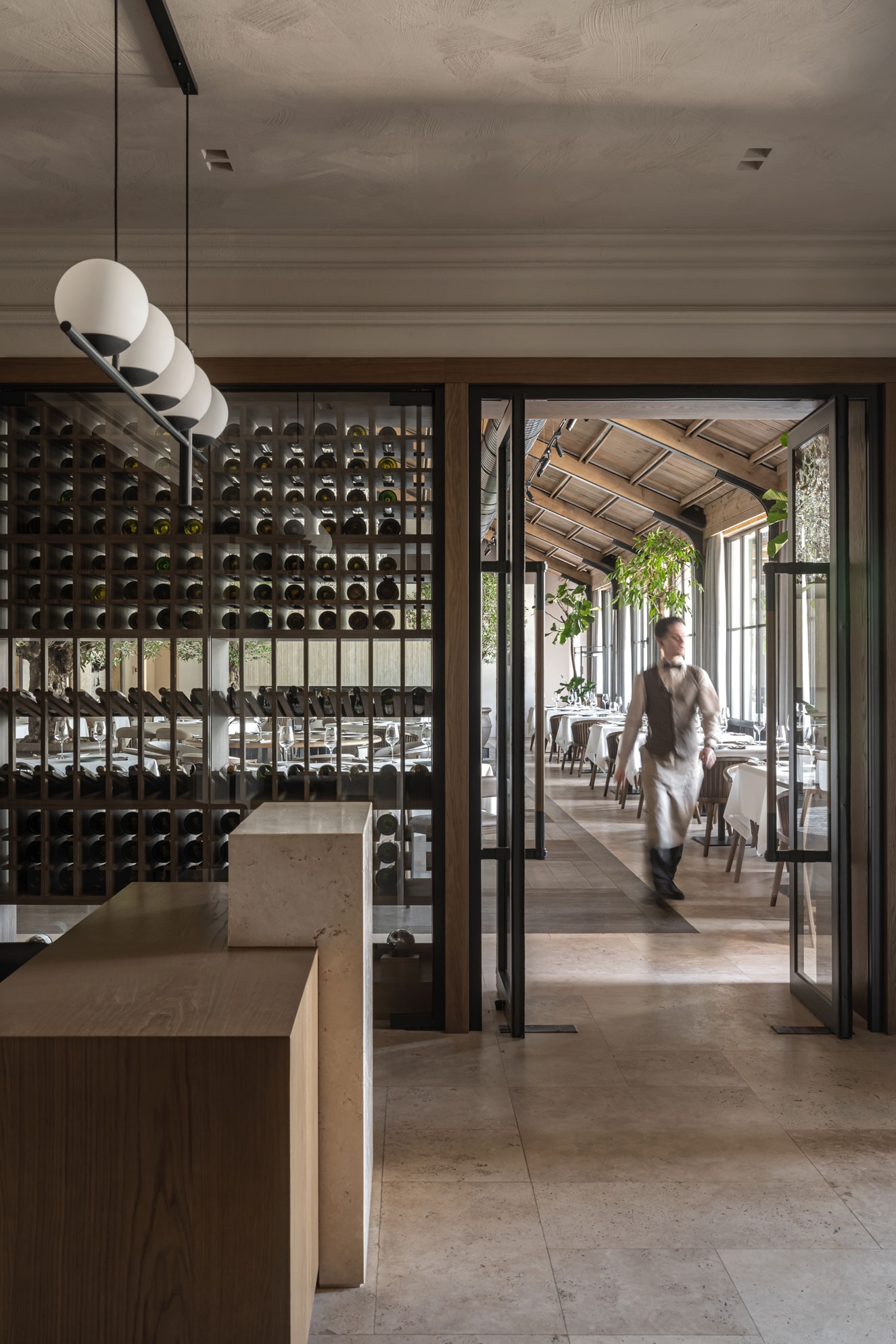 The facade of the building itself looks very inviting in its soft eggshell hue and crisp lines of stucco. And the uppermost material of the project, rustic travertine, builds up a domestic comfort of a sunny country and performs an enchanting function inside the restaurant.