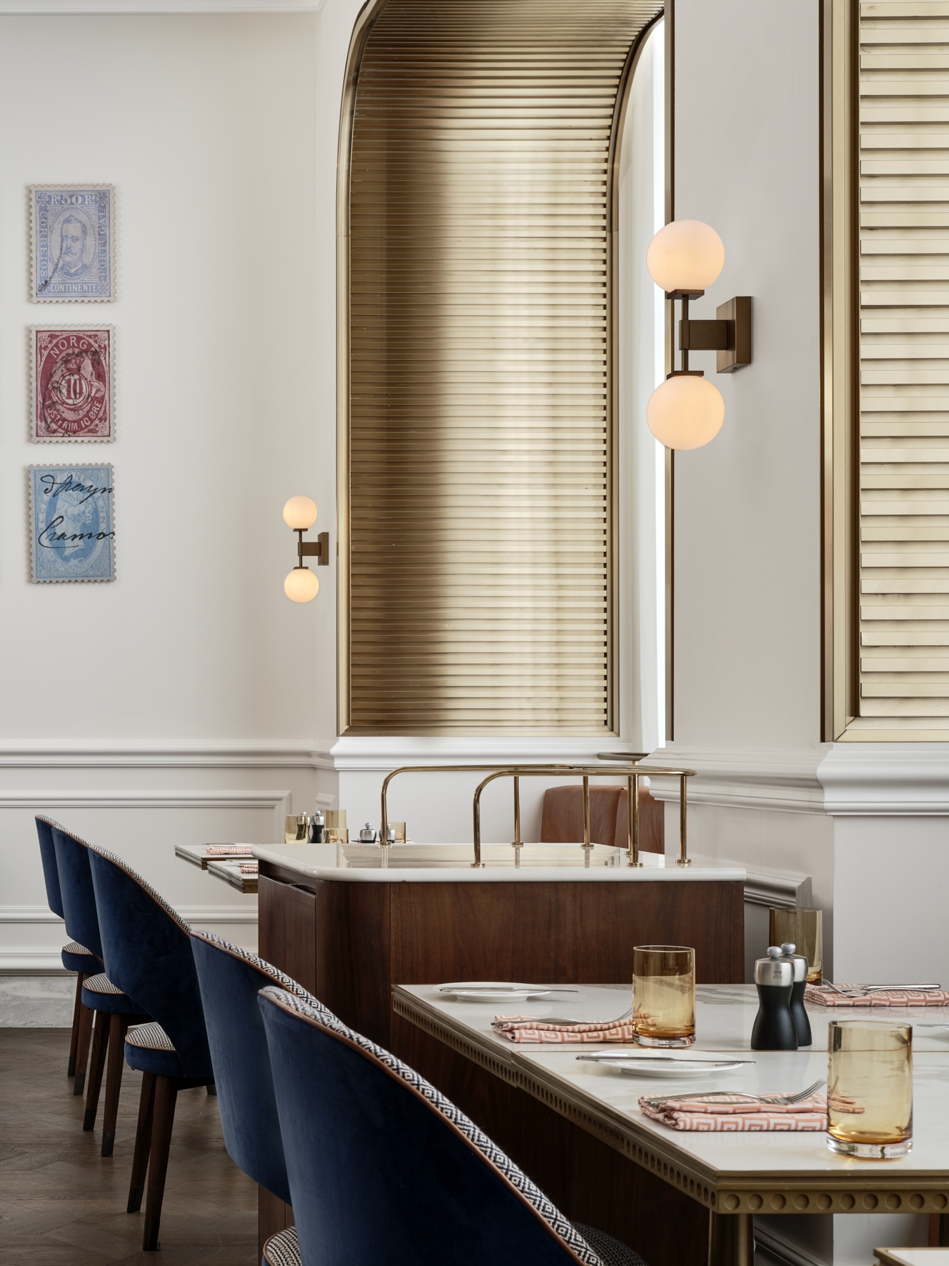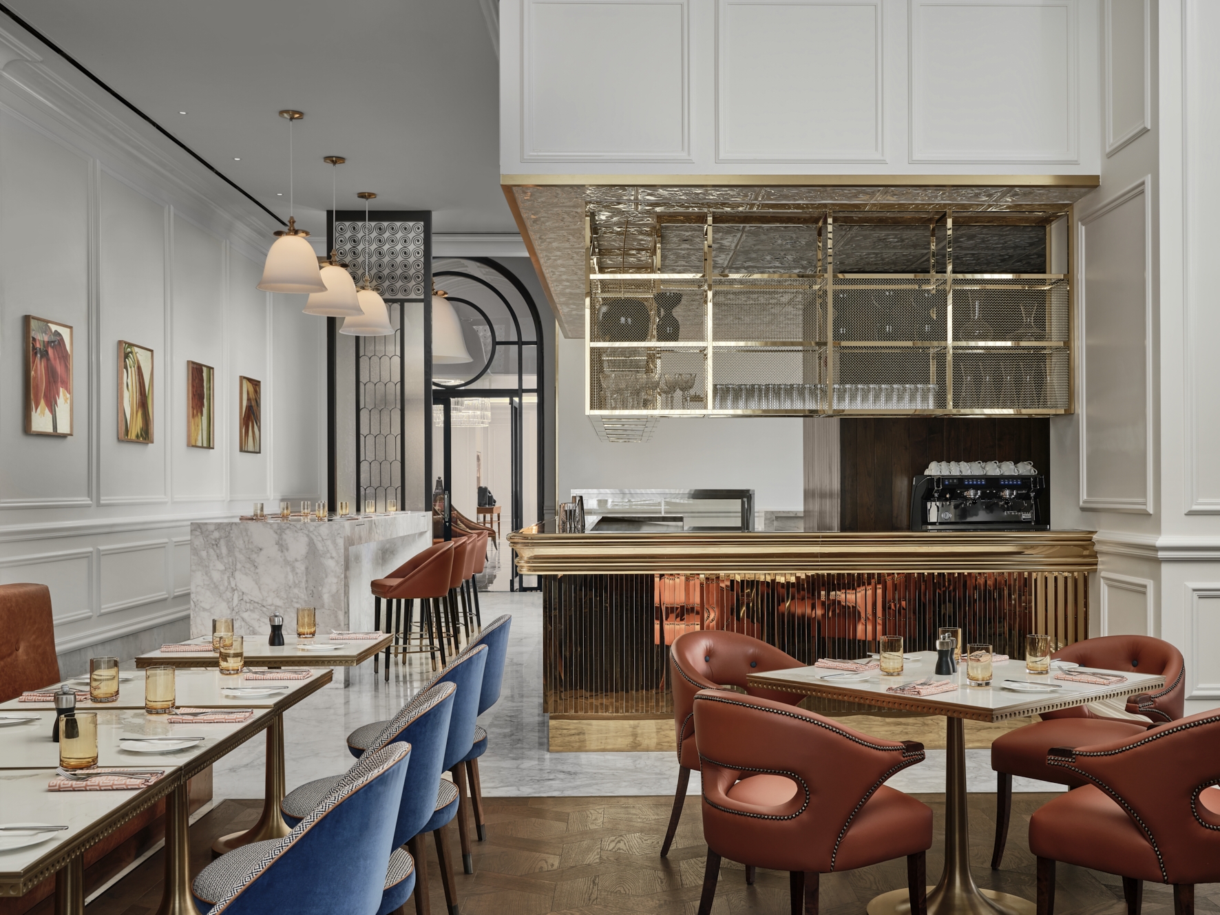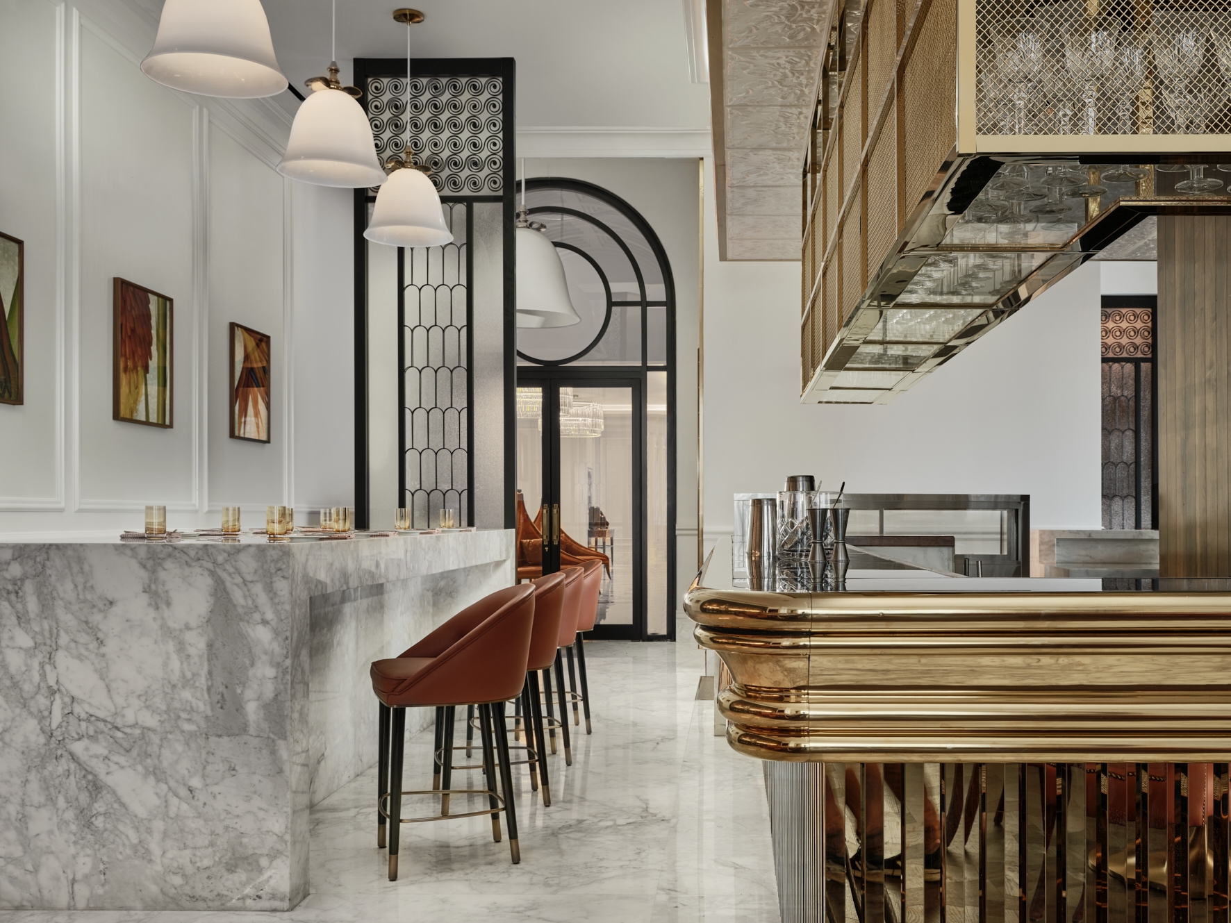 Streamlined geometric forms, metallic finishes, rich and warm texture epitomize the luxe and the glamour of the space, taking center stage as the defining elements of Ambros. Classic detailing in the wall paneling and ceiling cornices is adapted with a modern twist providing a light and unexpected palette for the space. Layered materials of fluted brass, black Marquina marble, rich caramel leather and warm patterned timber set the tone to a unique dining experience reminiscent of better times. A large bespoke feature chandelier and contemporary abstract artwork add to the ambient divinity and effortless sophistication of the space.