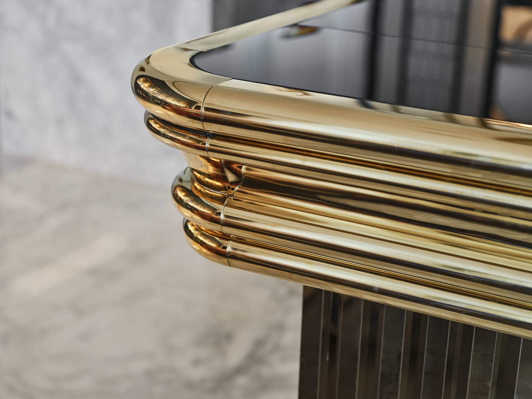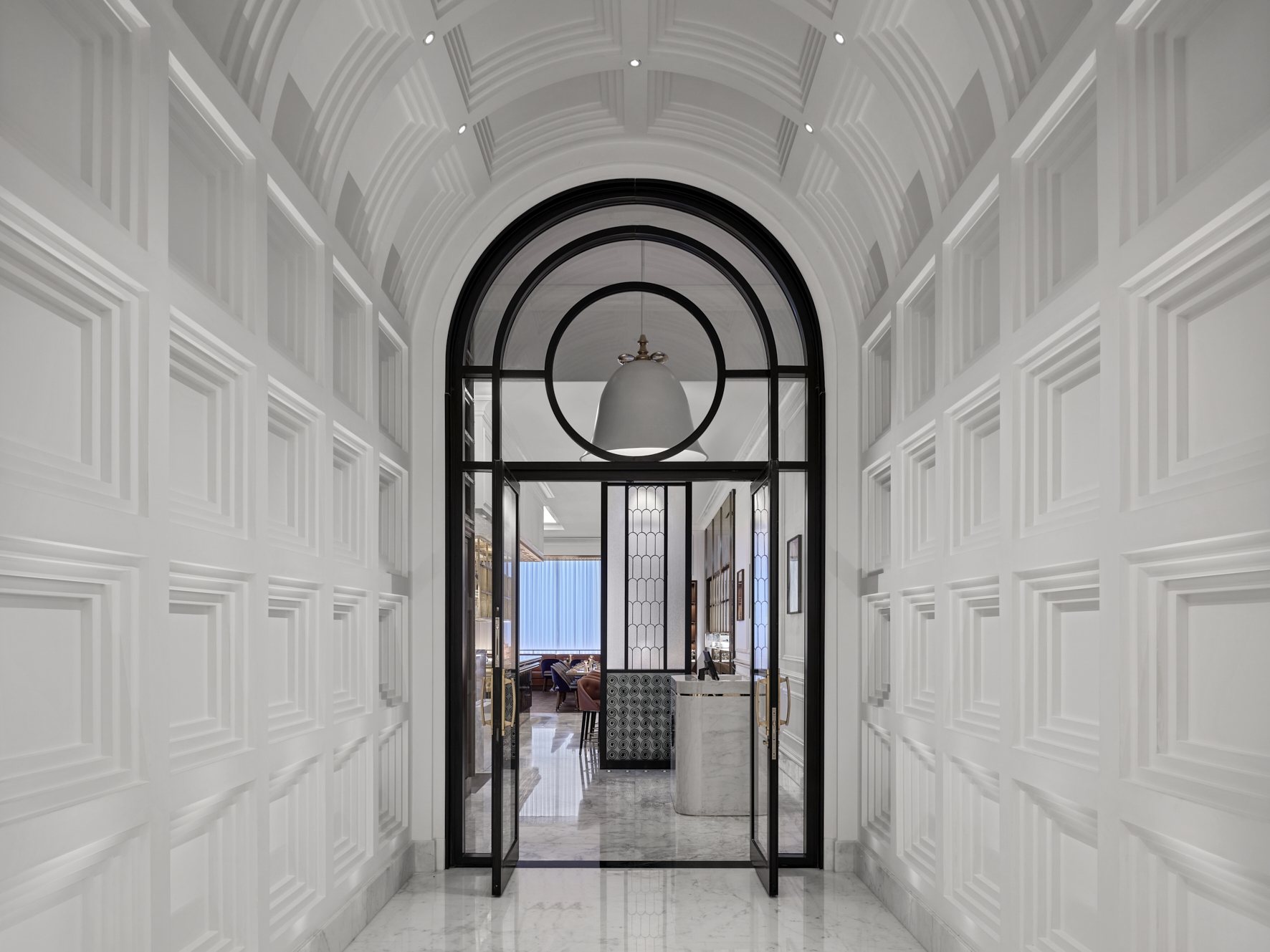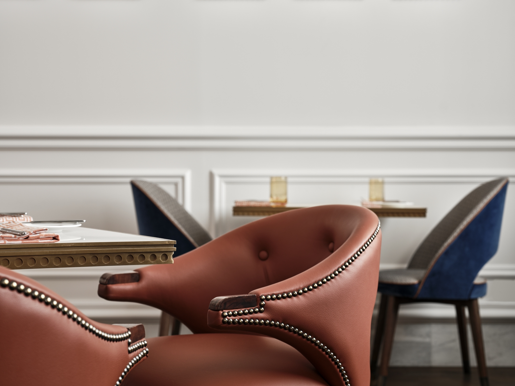 Streamlined geometric forms, metallic finishes, rich and warm texture epitomize the luxe and the glamour of the space, taking center stage as the defining elements of Ambros. Classic detailing in the wall paneling and ceiling cornices is adapted with a modern twist providing a light and unexpected palette for the space. Layered materials of fluted brass, black Marquina marble, rich caramel leather and warm patterned timber set the tone to a unique dining experience reminiscent of better times. A large bespoke feature chandelier and contemporary abstract artwork add to the ambient divinity and effortless sophistication of the space.