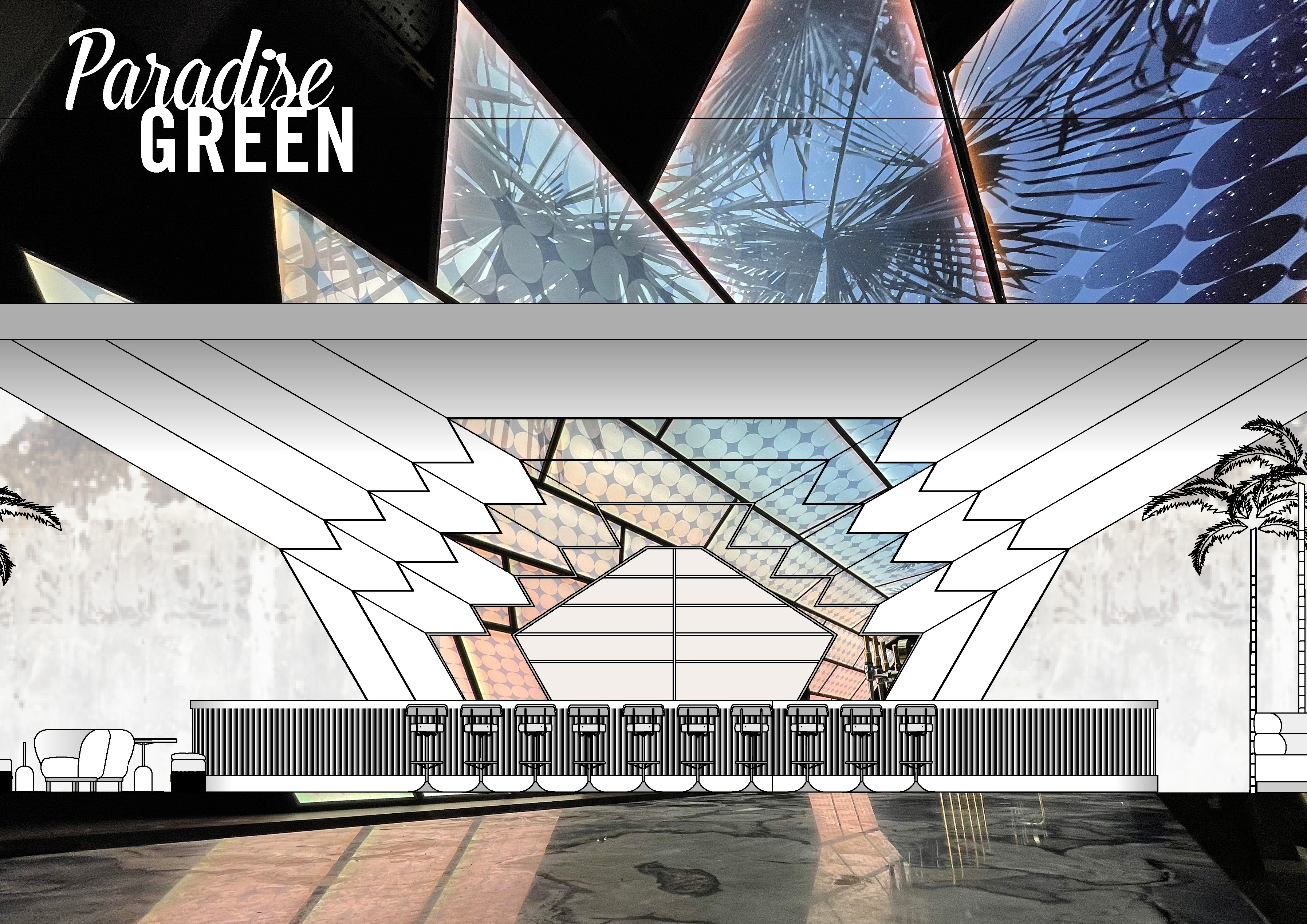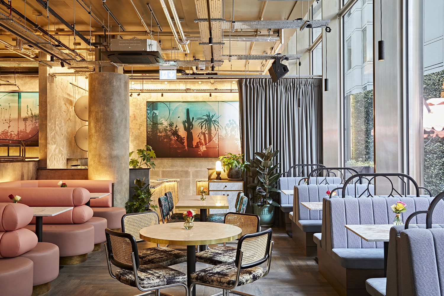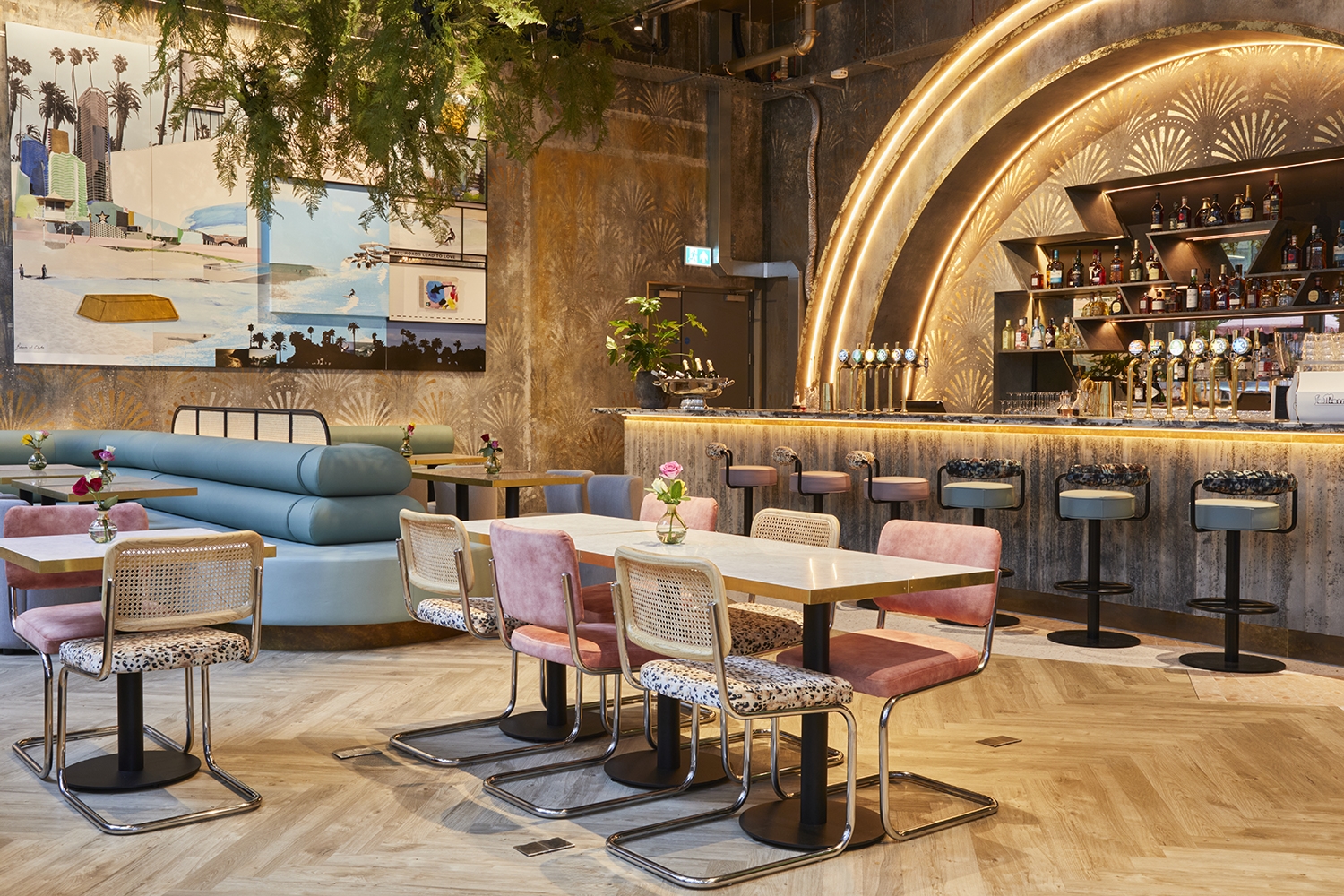 Paradise Green is an epic venue in London City: with 3 bar/restaurants and truly immersive art. ‘Sunrise’ and ‘Sunset’ have distinct entrances and personalities; paying homage to the golden beach mornings and sultry nights of Surfers Paradise in Australia. 'Sunrise' is sun-drenched Deco-fabulous gold. 'Sunset' channels 80s electric sundown vibes. They’re connected by a 3,000 sq foot mezzanine with buzzy kitchen, private bar and a PDR encapsulated in a Bank Heist installation by Lucy Sparrow, formerly shown at the Saatchi Art Gallery.