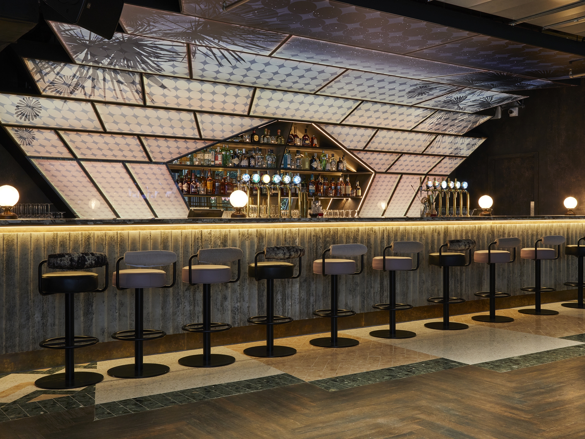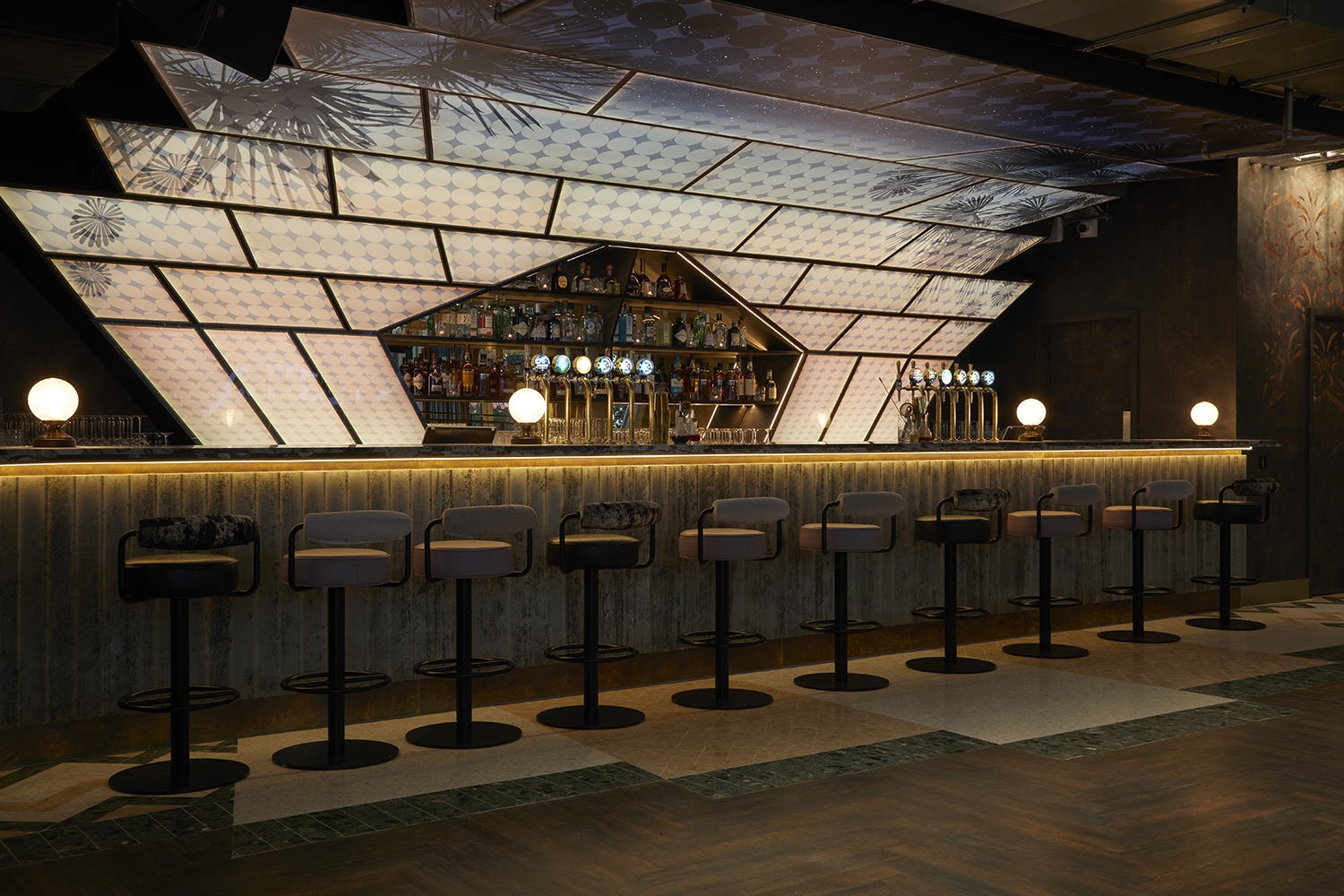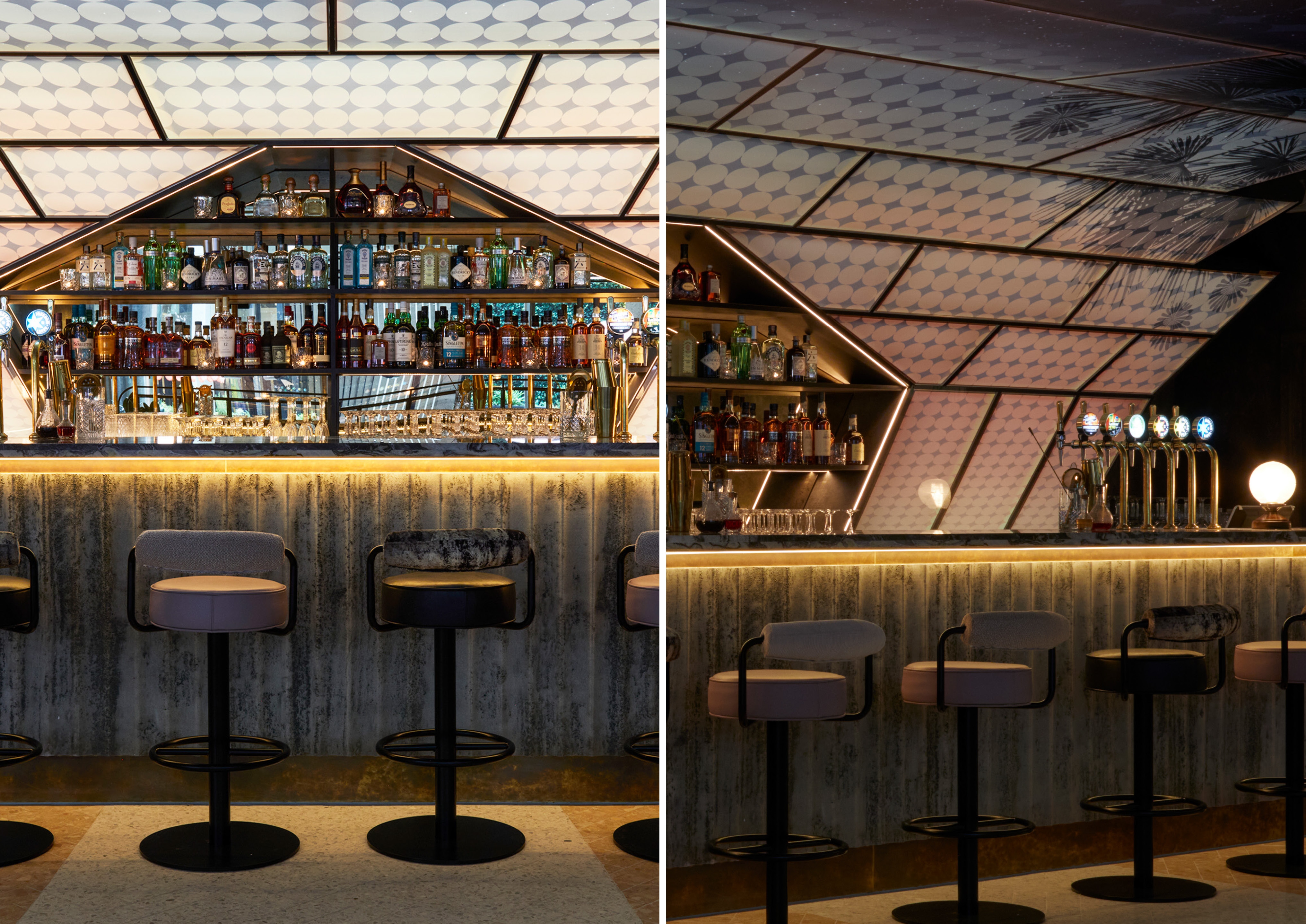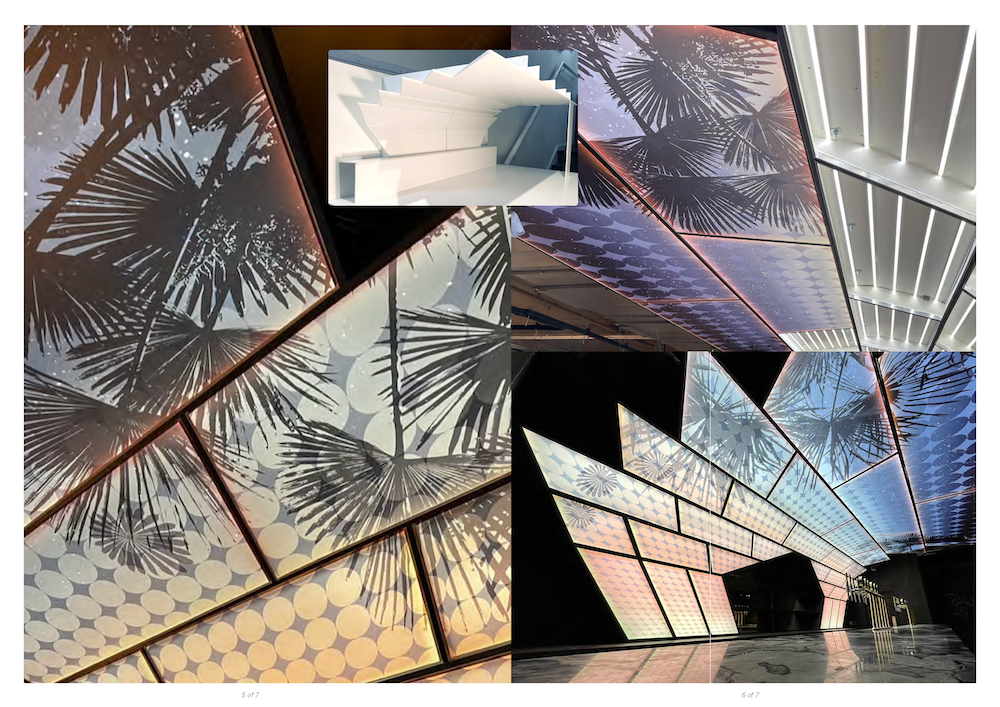 It was a complex collaboration, starting life as an original bar design by the interior designers, then given to Artist Justin Hibbs to develop into a large-scale artwork. Justin tested his designs across multiple panes, using 3D models. The main contractor then developed structural drawings before fabricating off-site in modular parts. Light-sheet specialists recommended a stretch fabric lightbox to display the final art. A unique bar which beckons the night away.