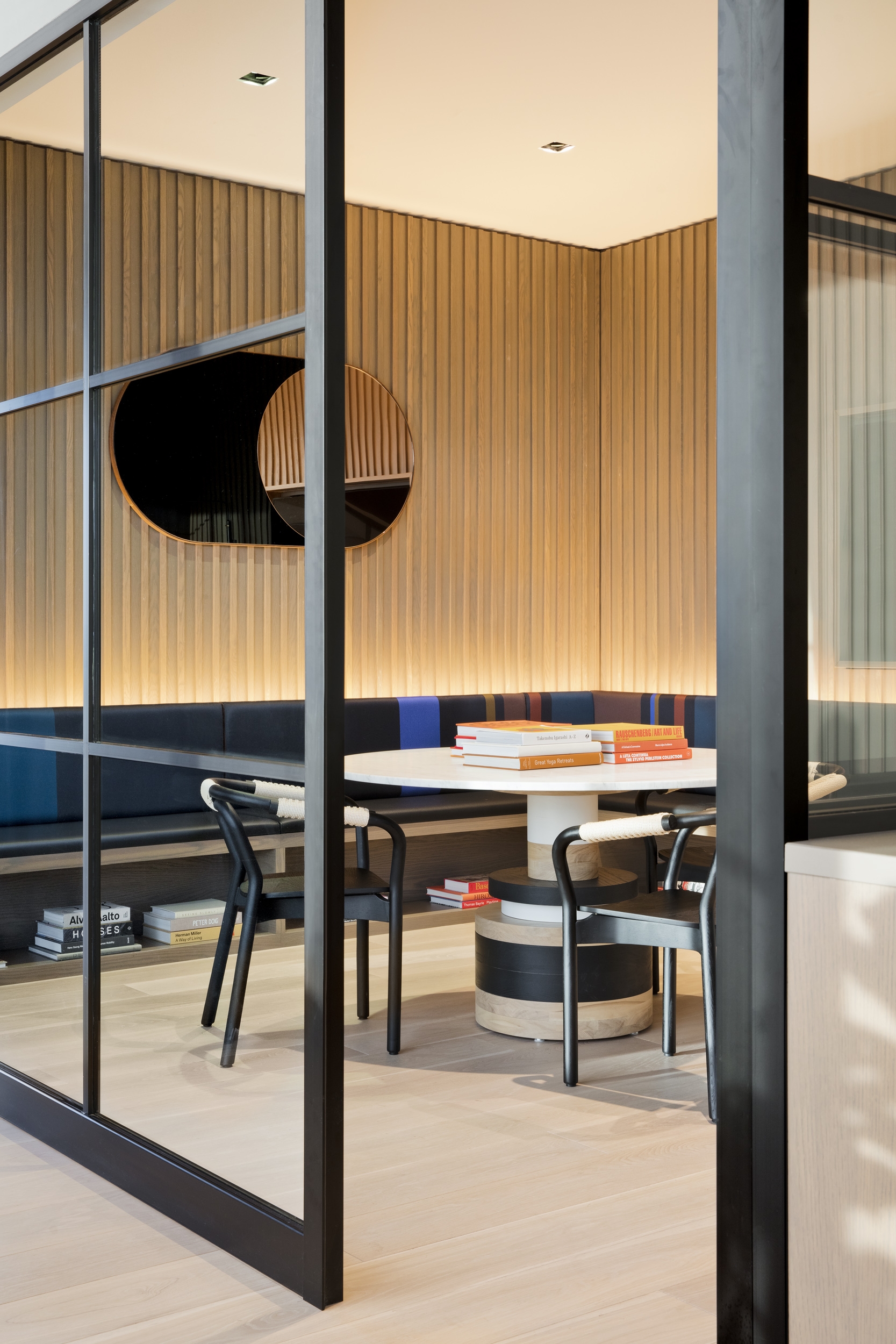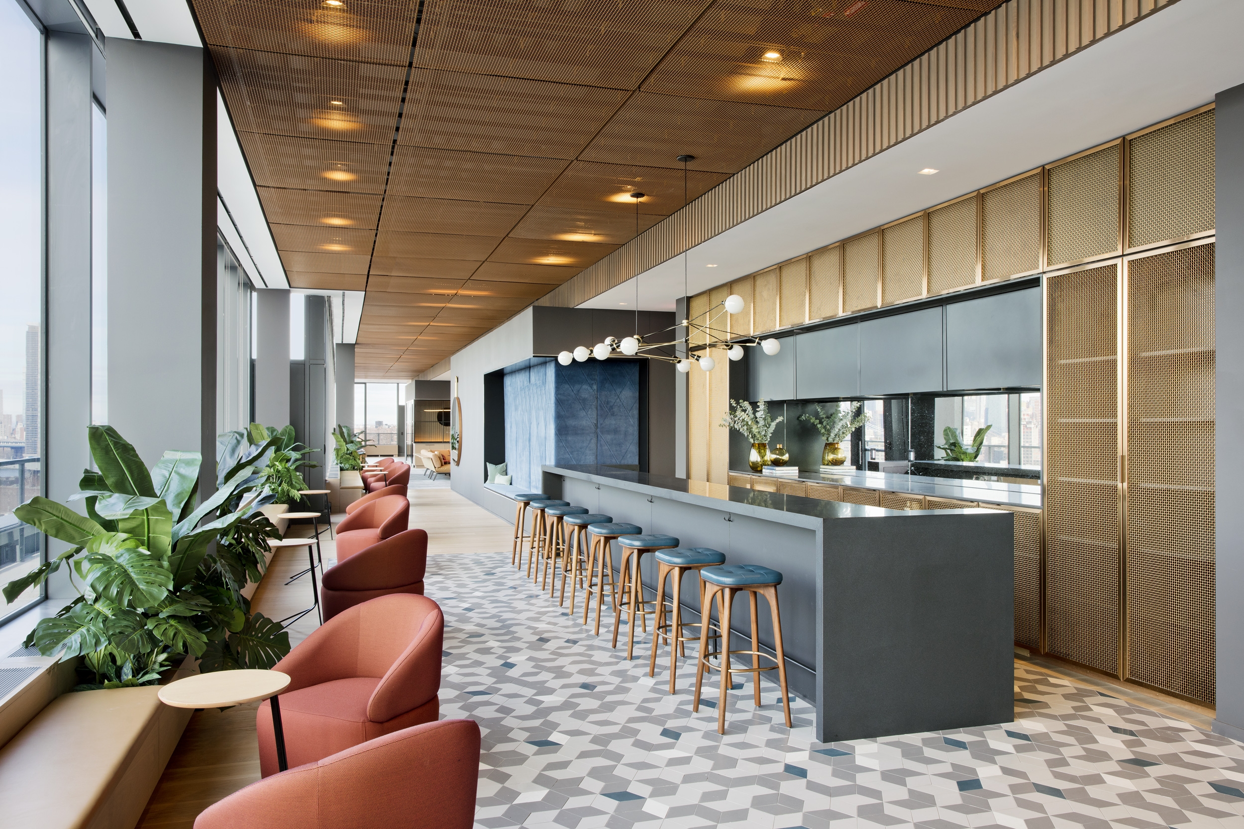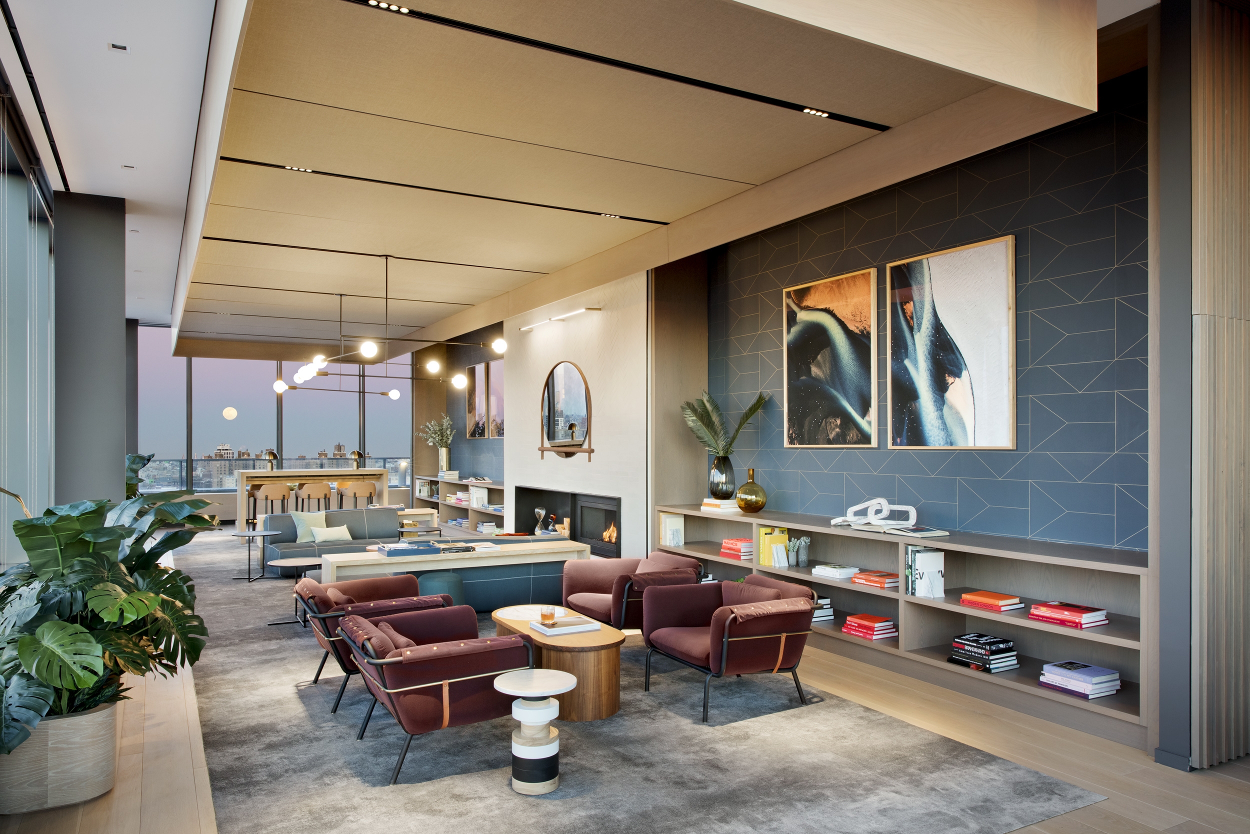 The team provided interior architectural, FF&E, accessory selection, and art curation services for the building’s 35,000 SF of high-end amenity spaces including two bar-and-lounges, a juice bar, spa, gym, café, and a food market.