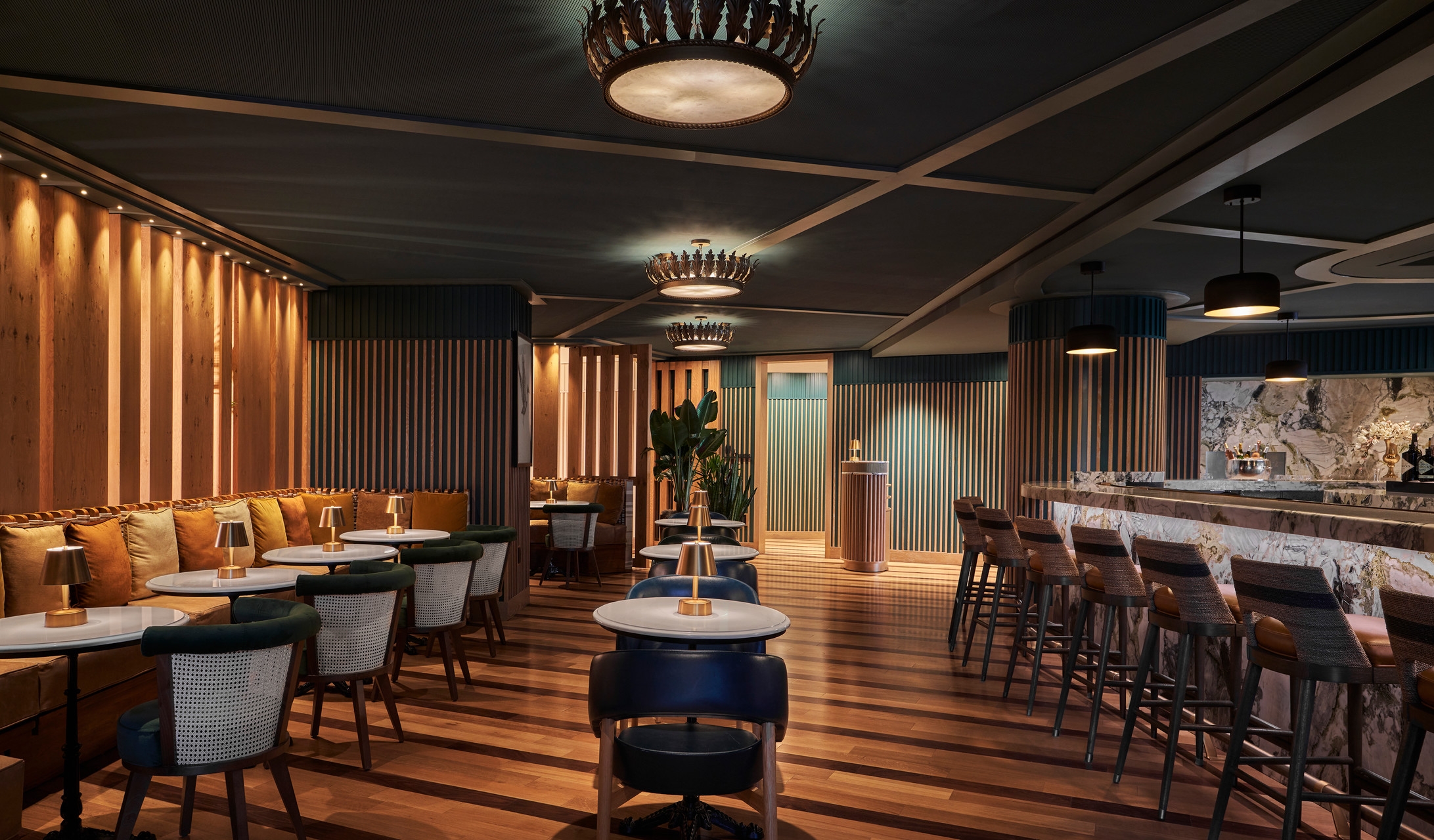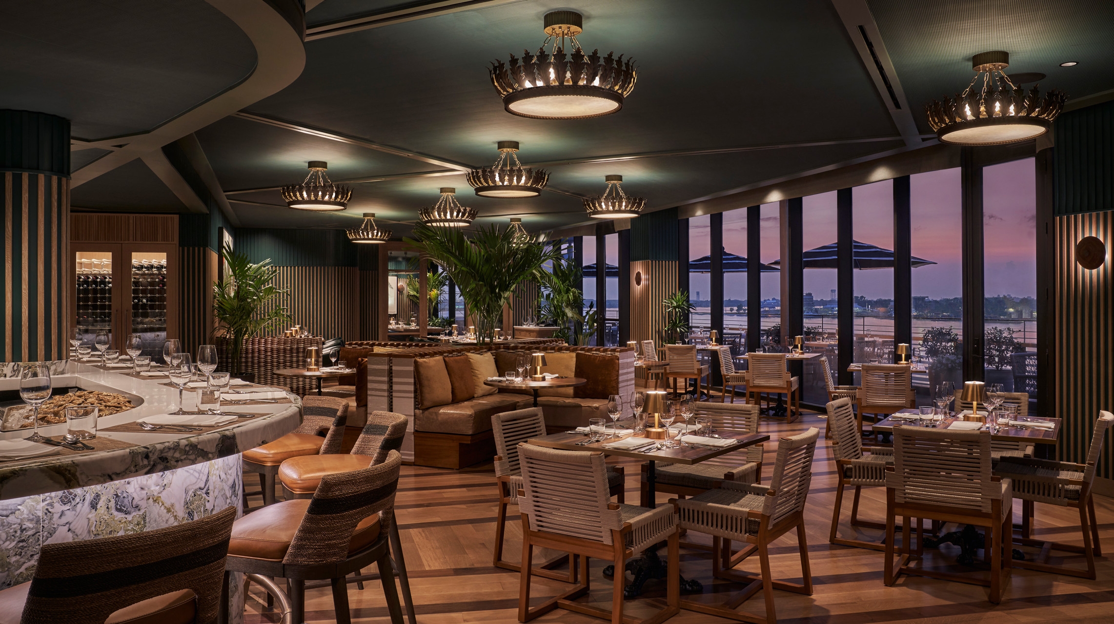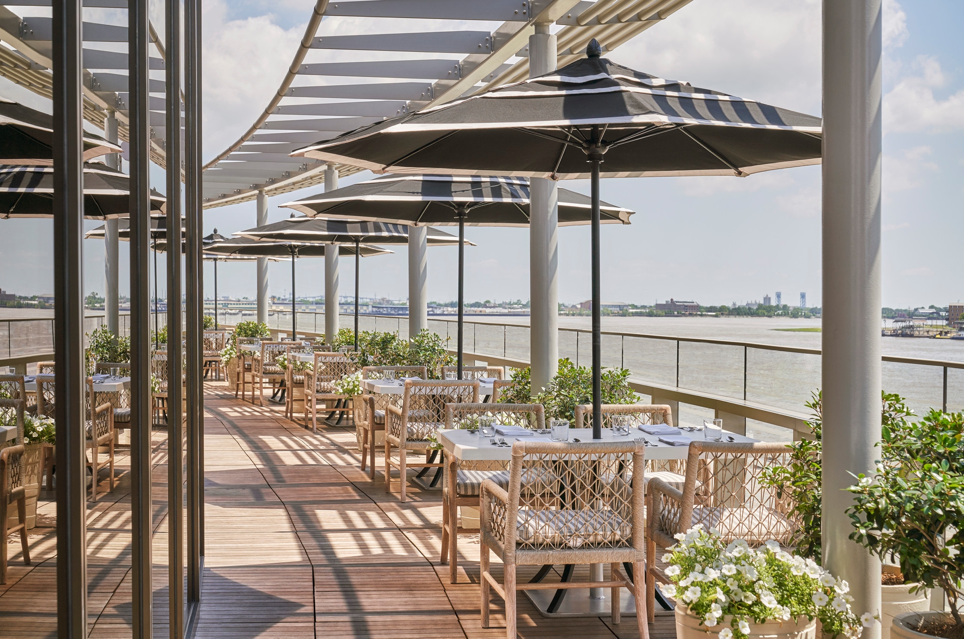 The Mood is deep, darker, and rich. Active all day and deep into the night the space is very transformative with the river at its focus. The space is covered in moody blue/teal green, murky and bright bar stones, oak & walnut striped flooring. The bar is flanked by large raw timbers walls, and striped woven banquette seating. Hints of heritage in the ceiling lighting and art by John Alexander all combined to give the space a uniquely New Orleans mood that transforms all day.