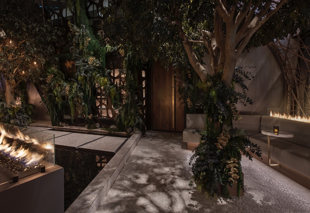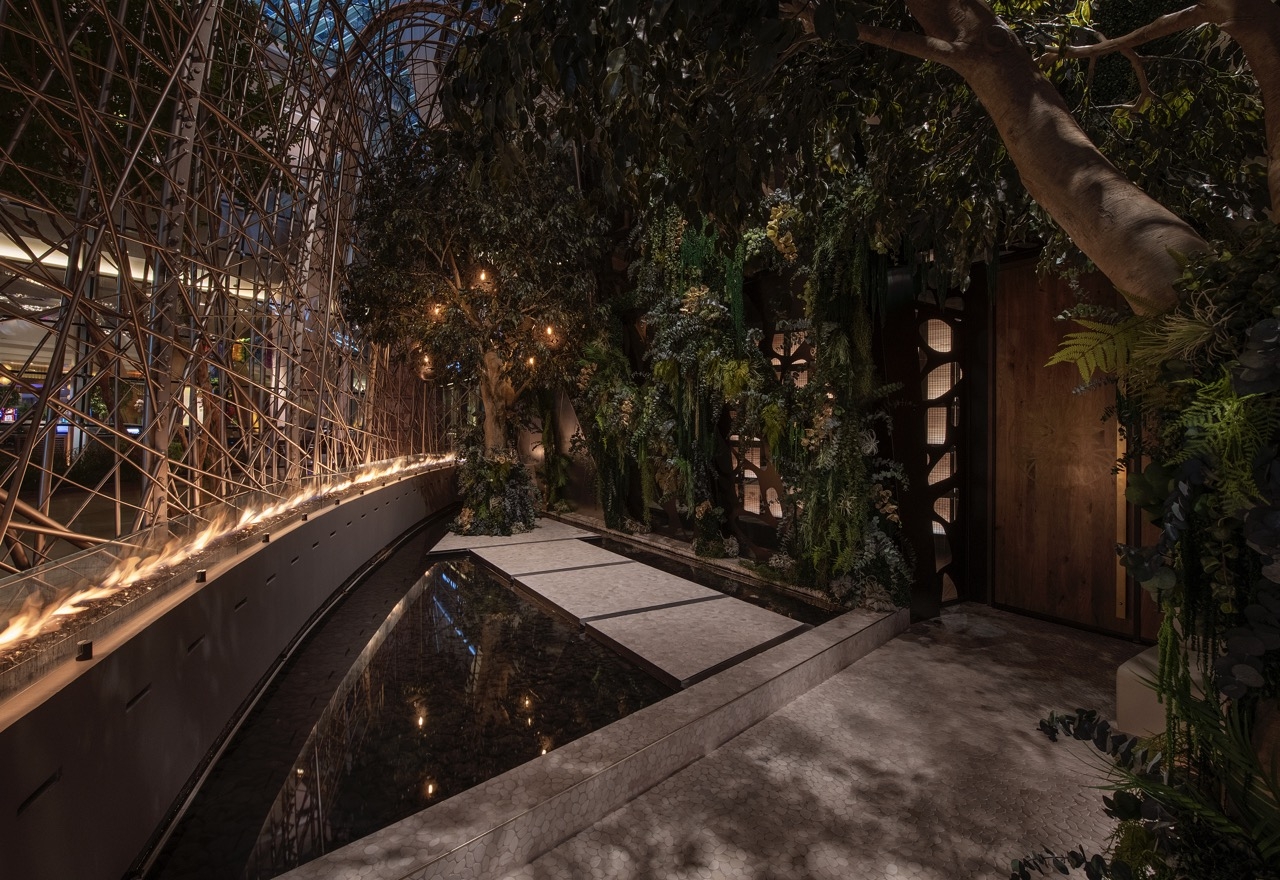 The Bird’s Nest, the restaurant’s grand entry point, invites guests into the intricately woven structure featuring a perimeter of fire accents, rich green plantscape, & a reflecting pond.