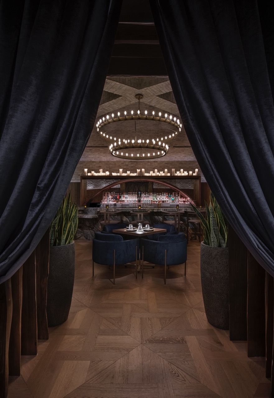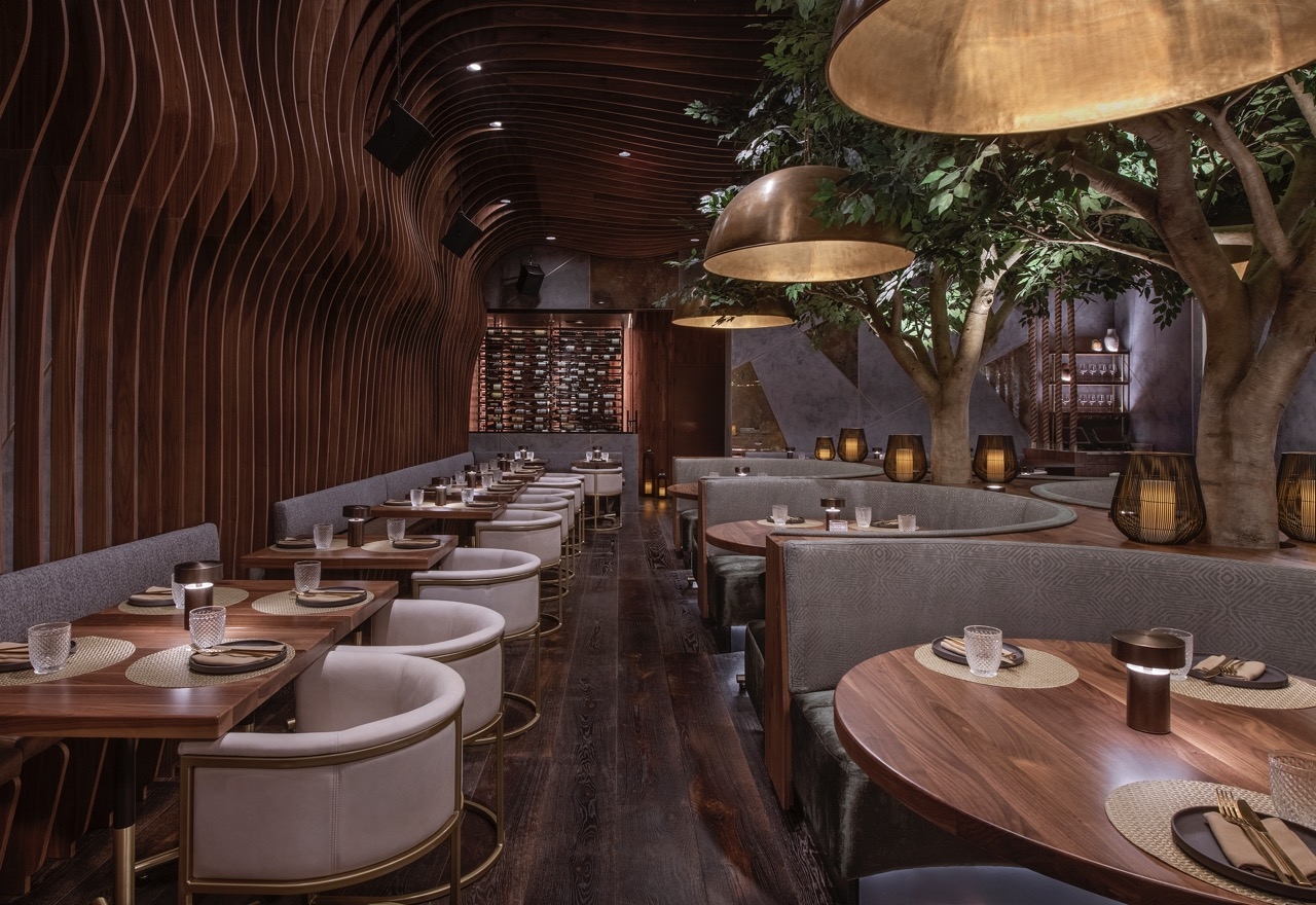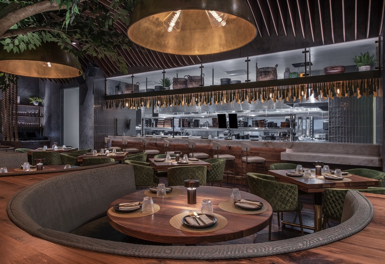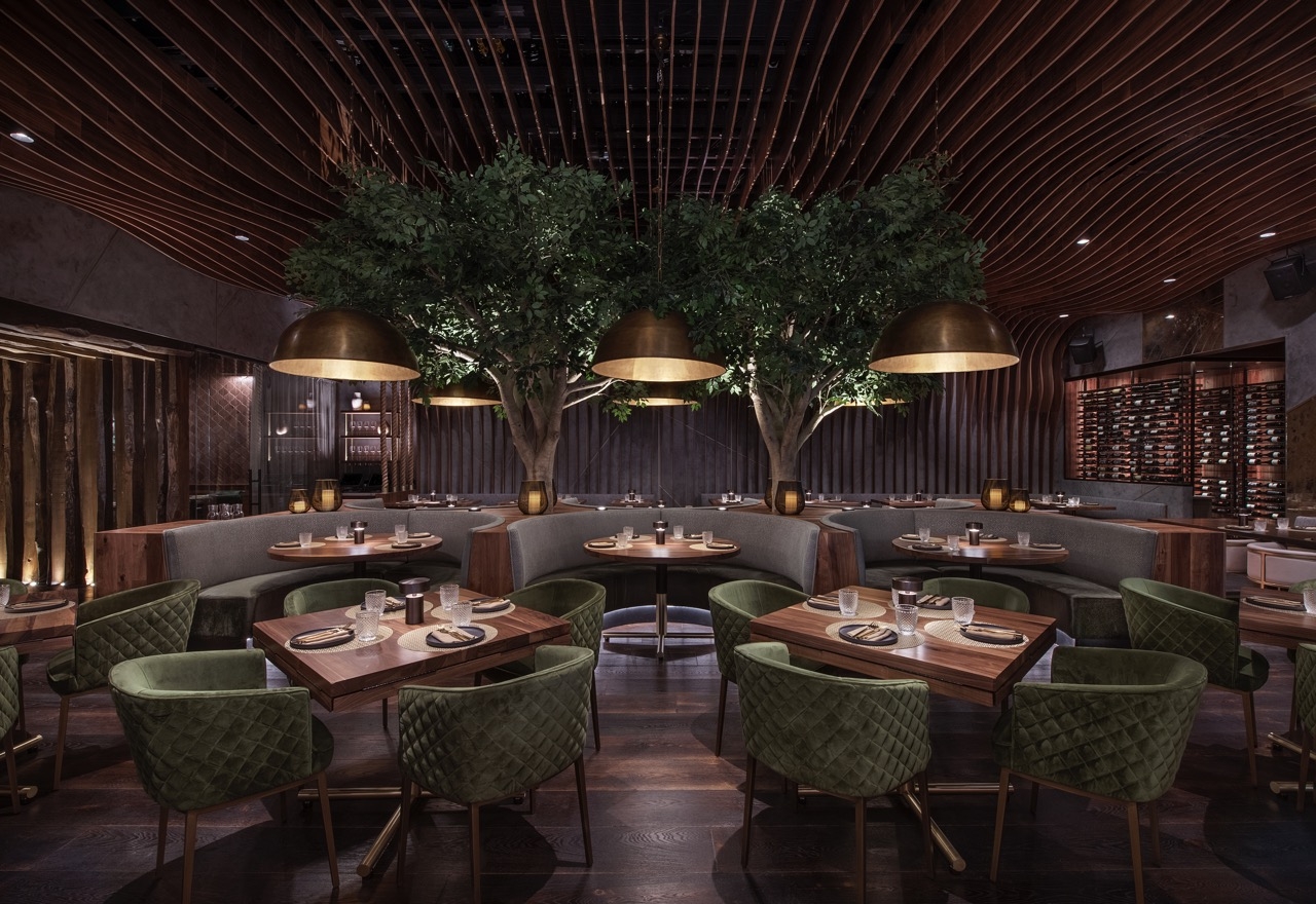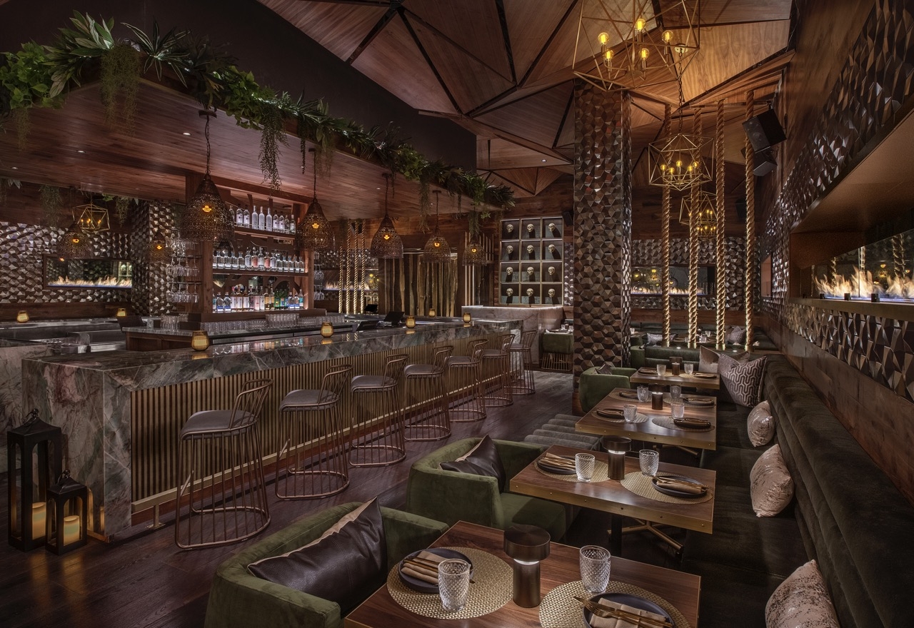 Toca Madera Las Vegas combines bold architectural elements with warm luxe finishes of handcrafted woodwork, plush upholsteries, stunning lighting, biophilic design, and fire elements to create an unmatched multi-sensory dining experience.