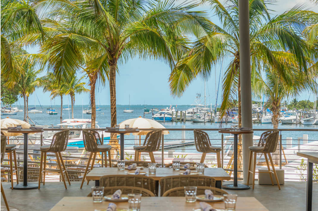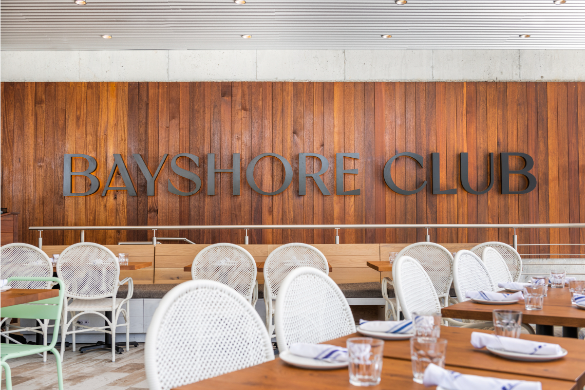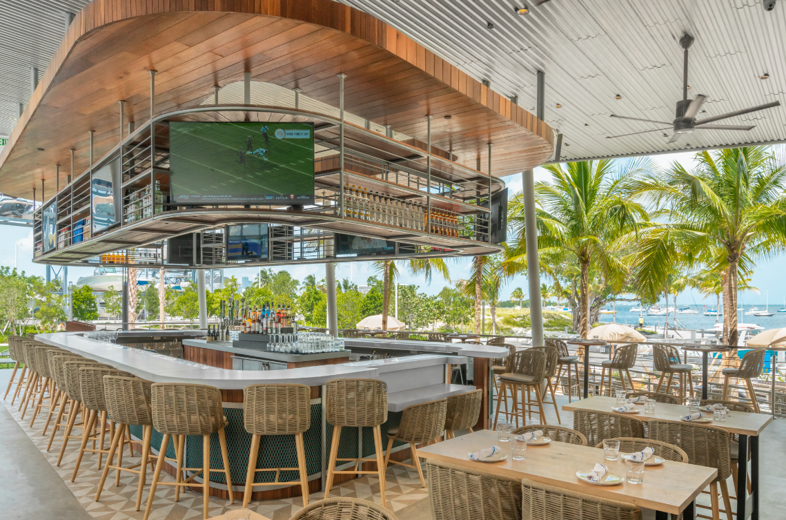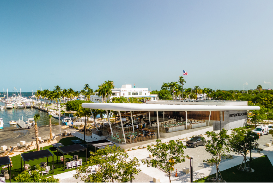 Bayshore Club is an outdoor restaurant located on the 9.5-acre Regatta Harbour, offering more than 200 seats and serving fast-casual eats. Designed to capture the nautical and aeronautical spirit of historic Coconut Grove, the space utilizes materials from the former Pan American Airlines hangar that’s been transformed into modern furniture and large-scale accents.